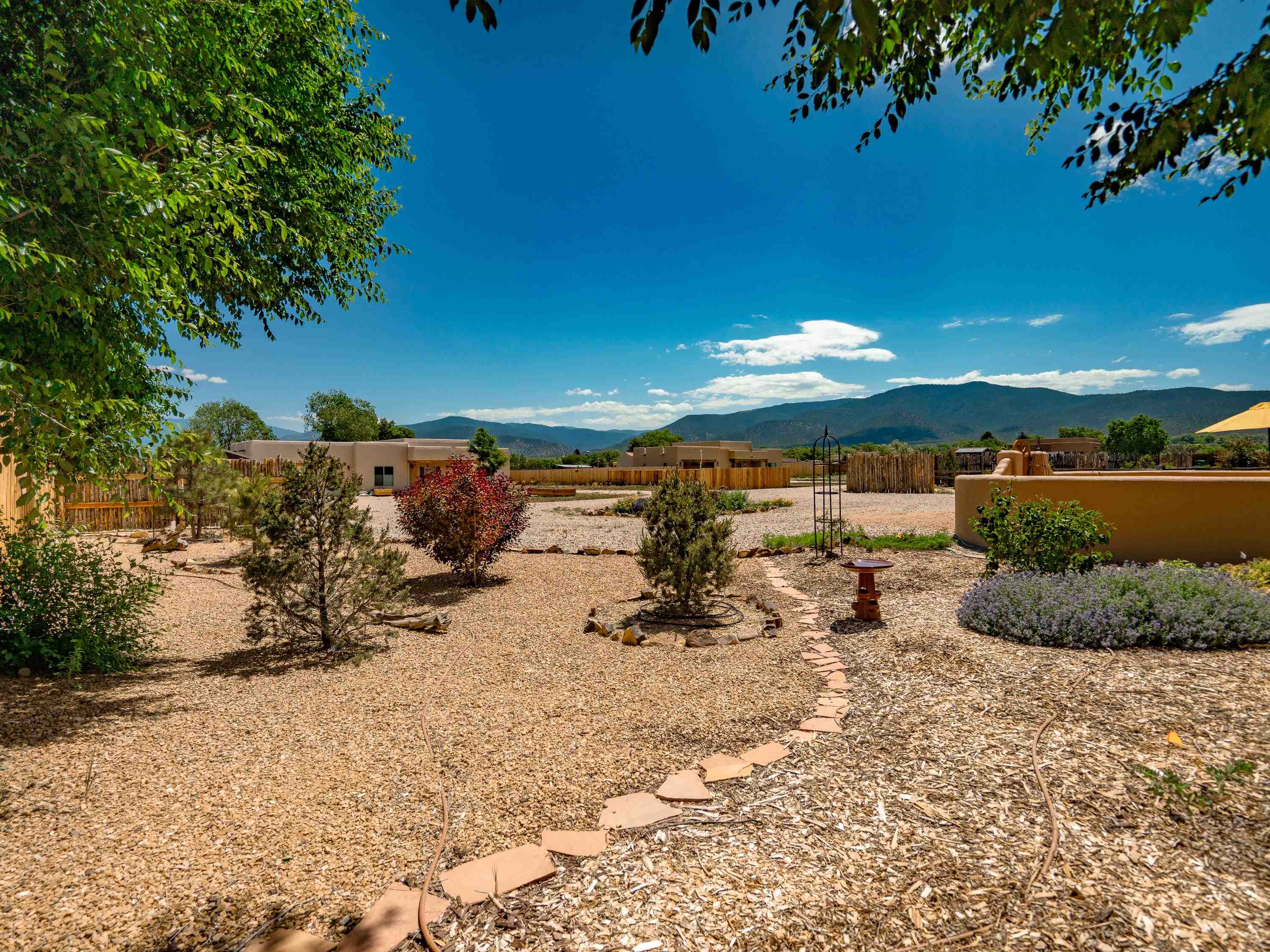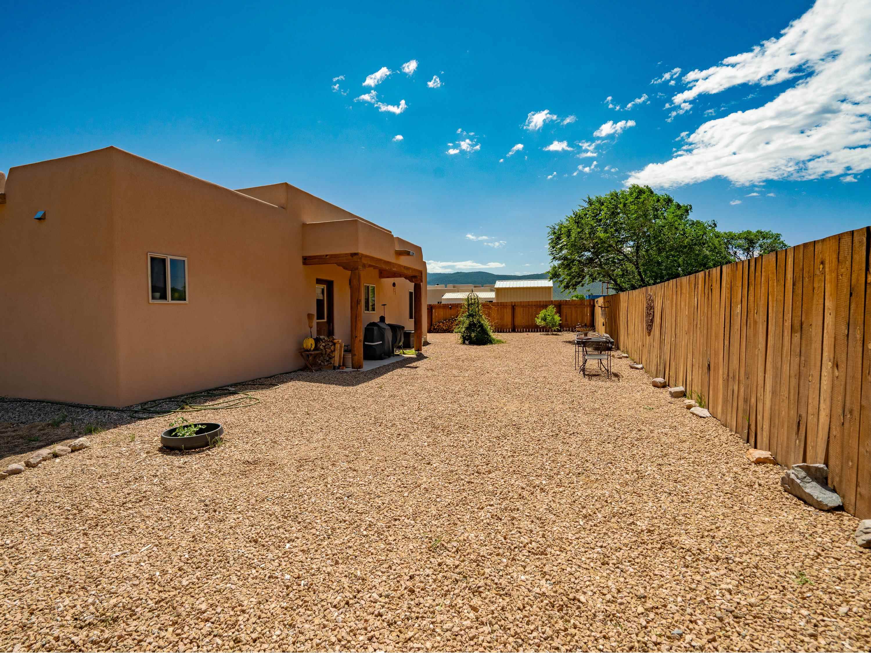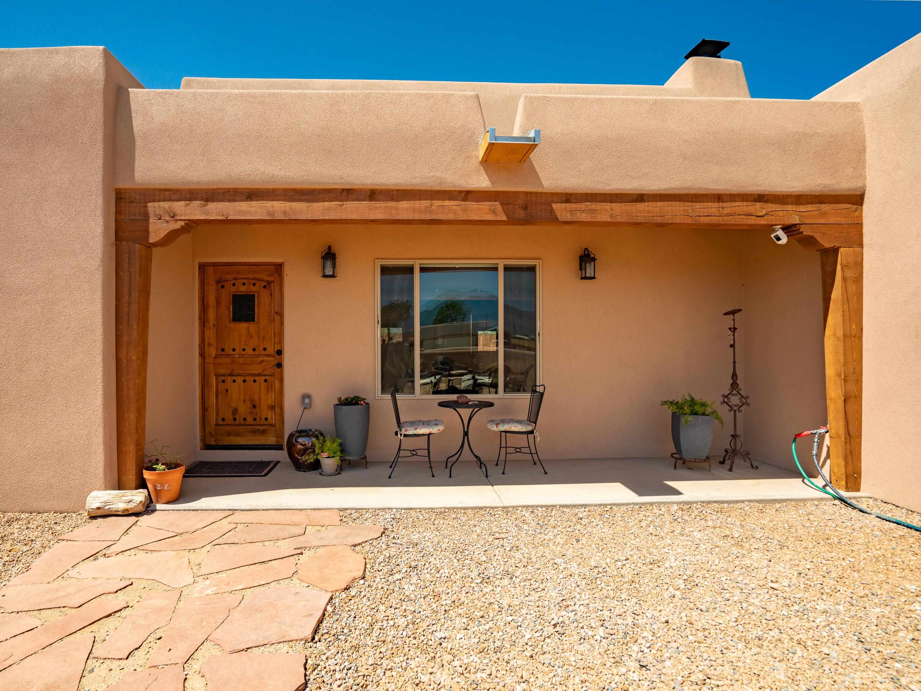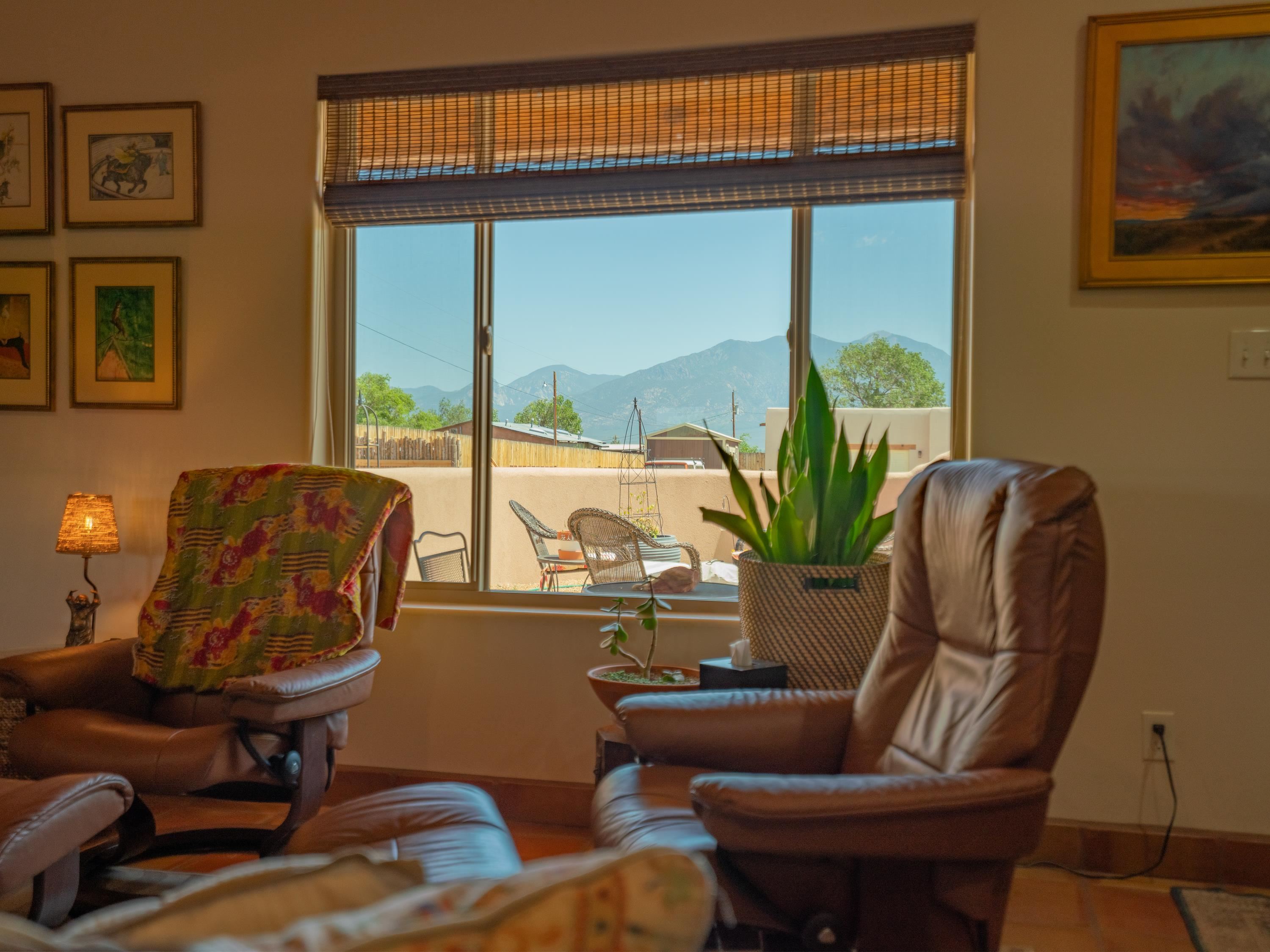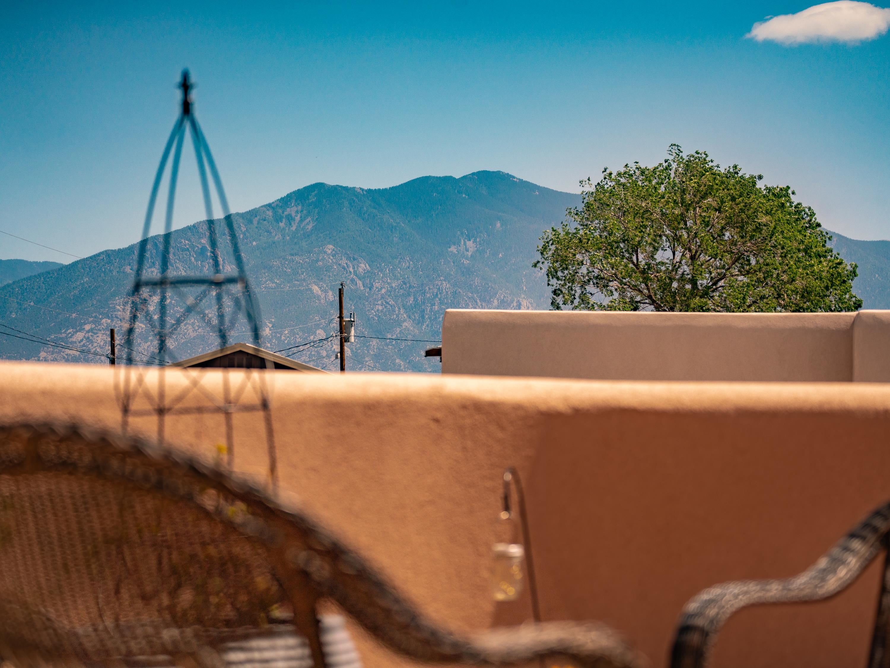 If privacy, comfort, and low maintenance are on your wish list, this is your spot. At the very end of a dead-end road, this home gives you that “away from it all” feeling—without actually being far from anything. No neighbors driving by. Just a well thought out property; start to finish! Inside, the kitchen is ready for serious cooking. We’re talking oversized knotty alder cabinets, granite countertops, a huge breakfast bar, and a large walk-in-style pantry. The living room brings the Taos feel with a real wood-burning kiva fireplace finished with smooth plaster in a contrasting color, and a big window that frames the landscaped courtyard with the mountains behind it. Saltillo tile runs throughout the home; a must have here in Taos. Designed with smart separation in mind, the primary suite is on one side of the home while the two guest bedrooms (or bedroom + office) are on the other. The primary suite is BIG. Room for your king-size bed, dressers, and then some. The en-suite bathroom includes a walk-in shower with frameless glass, double sinks on a granite counter, custom alder cabinets, and even a built-in linen closet. The walk-in closet has room for your stuff AND your significant other. One of the two guest bedrooms is currently used as a home office with high-speed internet and the guest bathroom has all the beautiful finishes the primary has, including a frameless glass door. The whole house (yes, including the garage) is heated with radiant in-floor heat powered by an on-demand natural gas boiler. That same system also handles your hot water. If you ever felt like you needed more living space, the heated garage is an excellent outlet for your creativity. Extras? You’ve got them: natural gas hookup, shared well, water softener, radon mitigation system, and town sewer—so no septic headaches. Outside, you’ll find a circular driveway, xeriscaping, trees, and privacy fencing in all the right places. The front courtyard is wrapped in a beautiful adobe wall with a nice wooden gate to let you out and keep your pets in! Tucked away in the back corner of the property you’ll find a new Tough Shed for all the stuff you don’t want to stuff into your garage. Built in 2022, the house is in great condition and is ready for you to move in, relax, and enjoy the reasons you are moving to Taos for!