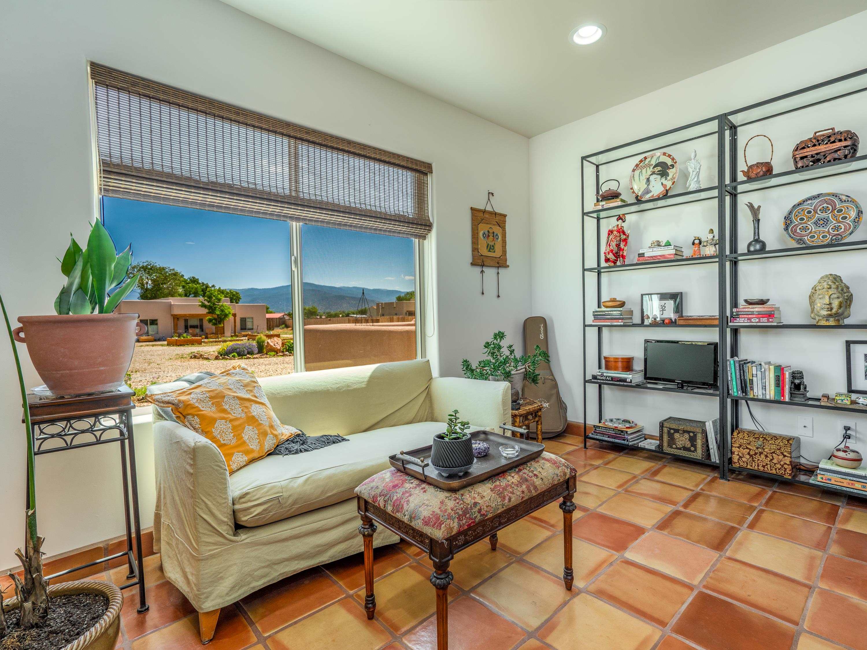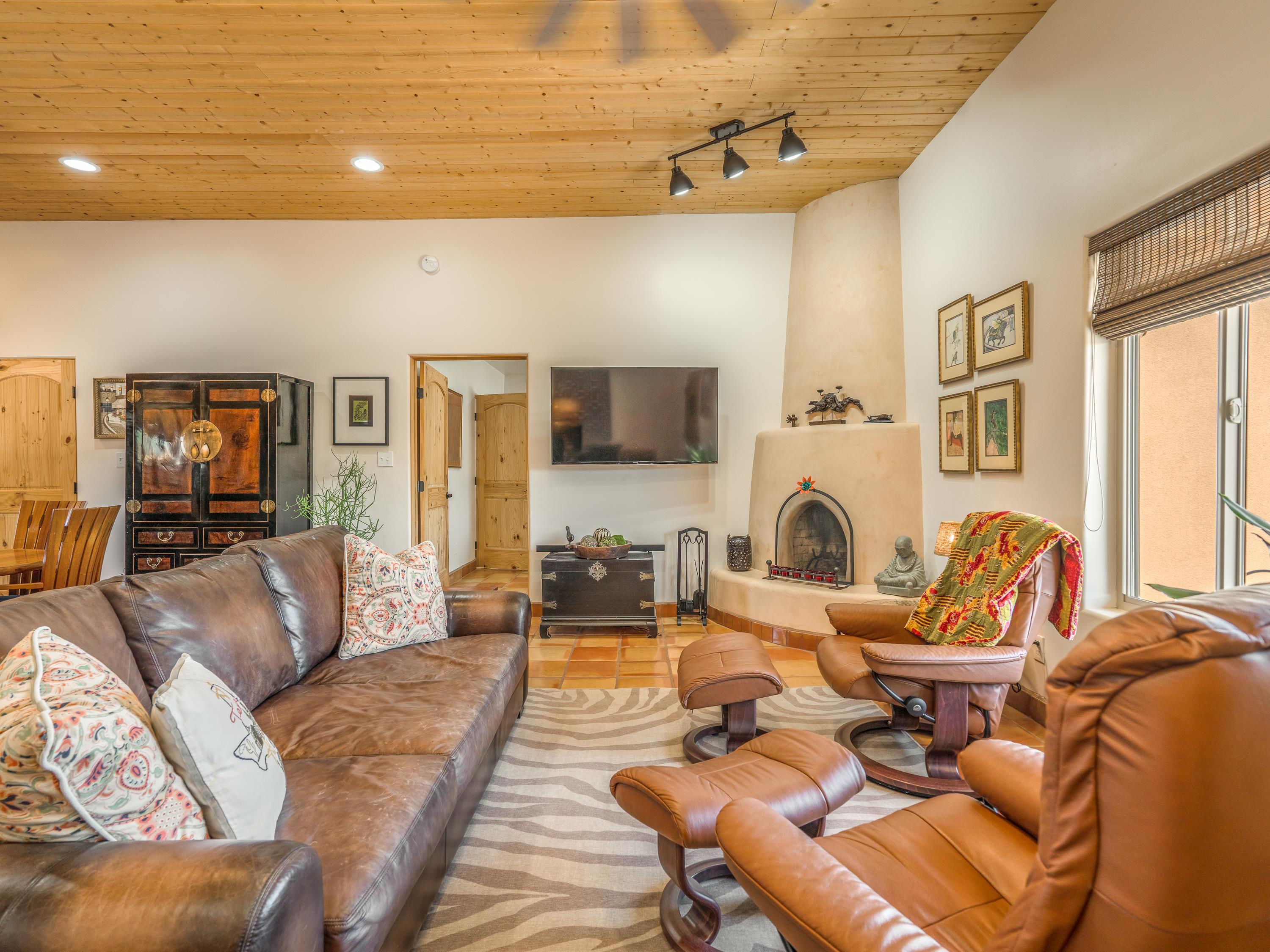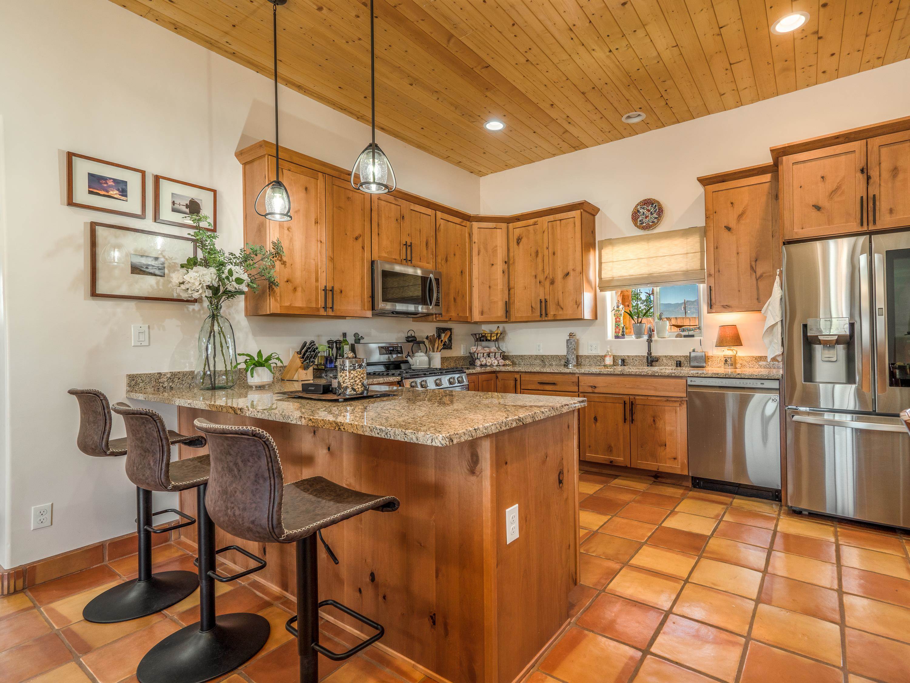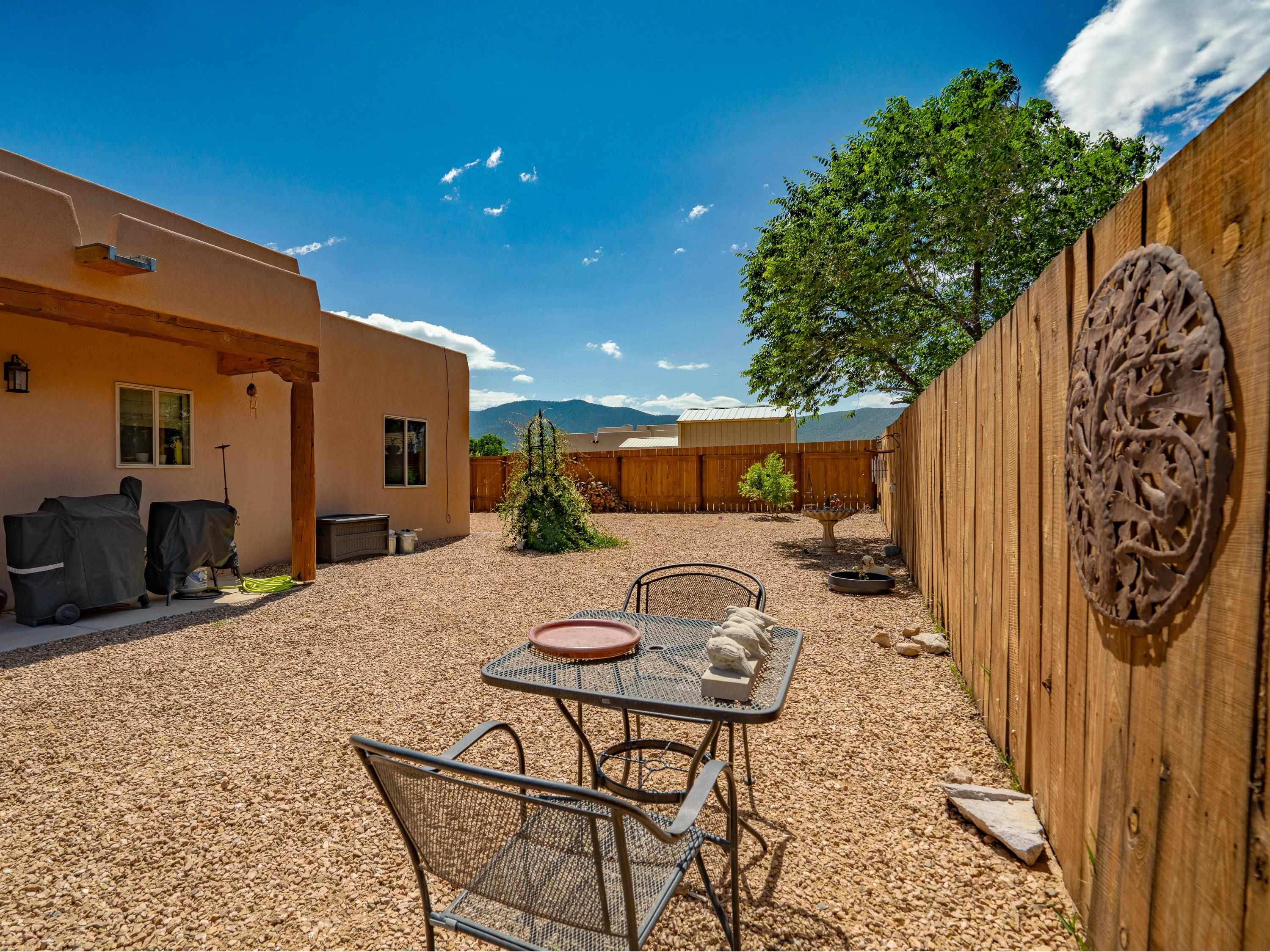 If privacy, comfort, and low maintenance are on your wish list, this is your spot. At the very end of a dead-end road, this home gives you that “away from it all” feeling—without actually being far from anything. No neighbors driving by. Just a well thought out property; start to finish! Inside, the kitchen is ready for serious cooking. We’re talking oversized knotty alder cabinets, granite countertops, a huge breakfast bar, and a large walk-in-style pantry. The living room brings the Taos feel with a real wood-burning kiva fireplace finished with smooth plaster in a contrasting color, and a big window that frames the landscaped courtyard with the mountains behind it. Saltillo tile runs throughout the home; a must have here in Taos. Designed with smart separation in mind, the primary suite is on one side of the home while the two guest bedrooms (or bedroom + office) are on the other. The primary suite is BIG. Room for your king-size bed, dressers, and then some. The en-suite bathroom includes a walk-in shower with frameless glass, double sinks on a granite counter, custom alder cabinets, and even a built-in linen closet. The walk-in closet has room for your stuff AND your significant other. One of the two guest bedrooms is currently used as a home office with high-speed internet and the guest bathroom has all the beautiful finishes the primary has, including a frameless glass door. The whole house (yes, including the garage) is heated with radiant in-floor heat powered by an on-demand natural gas boiler. That same system also handles your hot water. If you ever felt like you needed more living space, the heated garage is an excellent outlet for your creativity. Extras? You’ve got them: natural gas hookup, shared well, water softener, radon mitigation system, and town sewer—so no septic headaches. Outside, you’ll find a circular driveway, xeriscaping, trees, and privacy fencing in all the right places. The front courtyard is wrapped in a beautiful adobe wall with a nice wooden gate to let you out and keep your pets in! Tucked away in the back corner of the property you’ll find a new Tough Shed for all the stuff you don’t want to stuff into your garage. Built in 2022, the house is in great condition and is ready for you to move in, relax, and enjoy the reasons you are moving to Taos for!