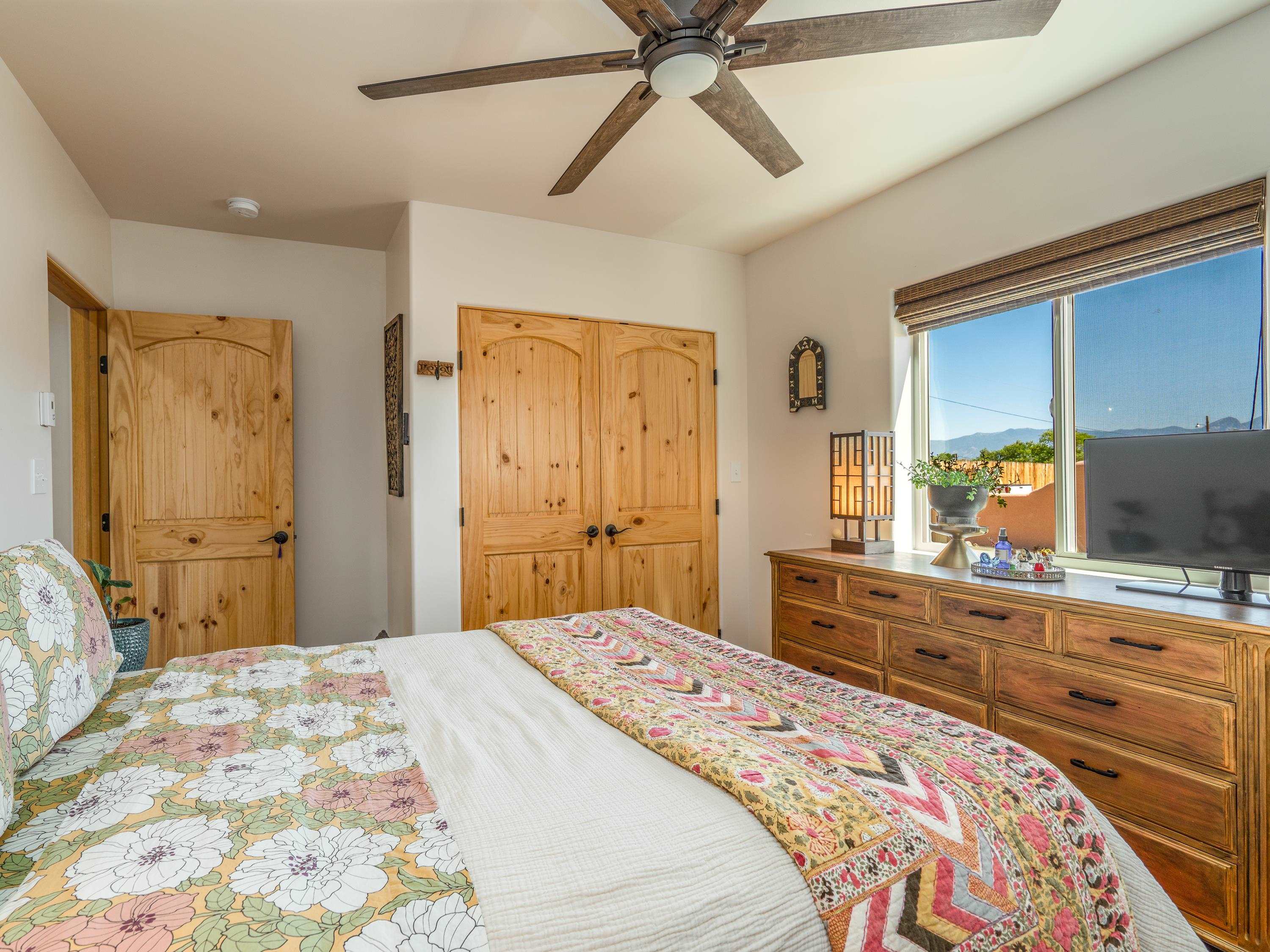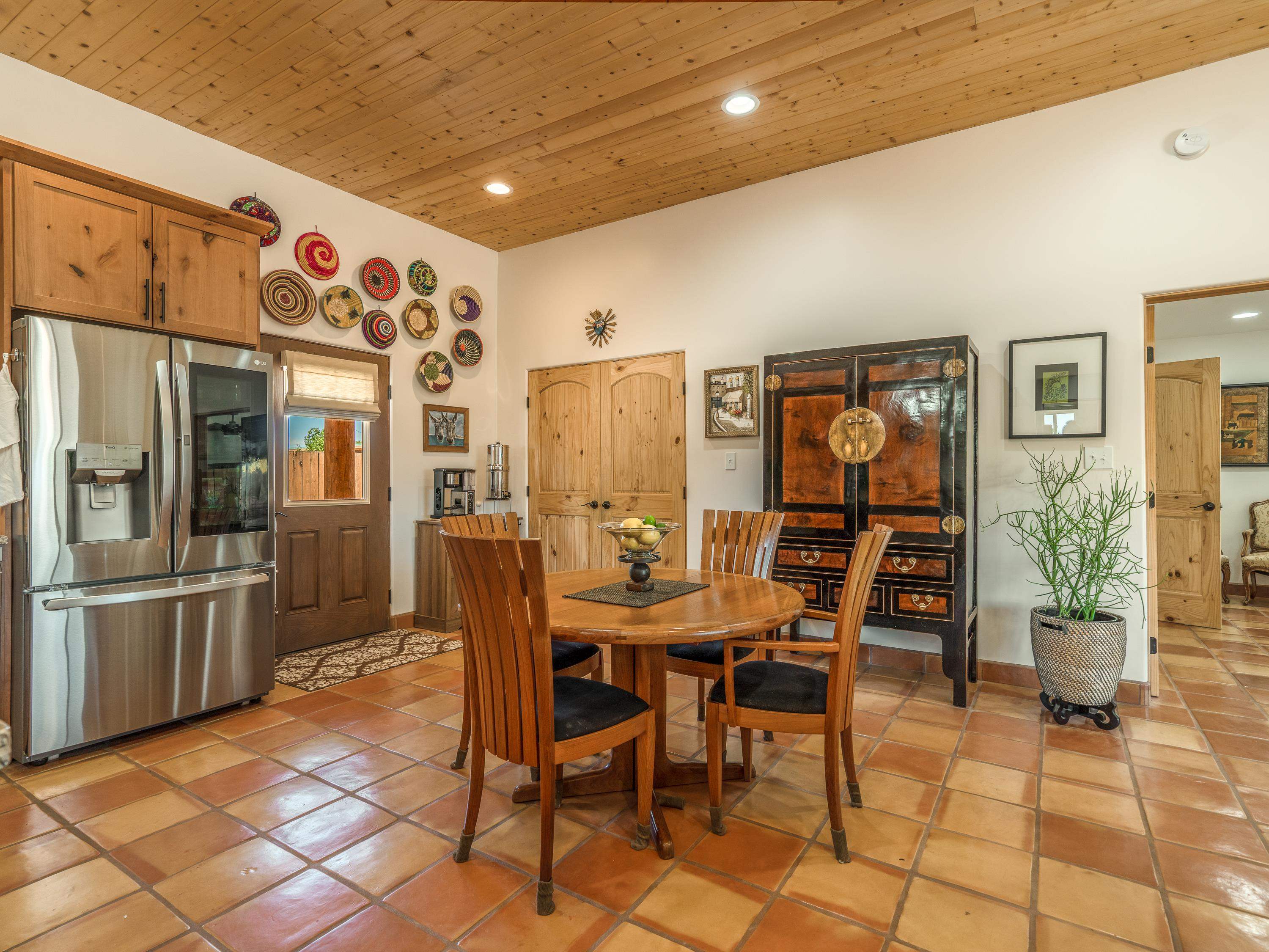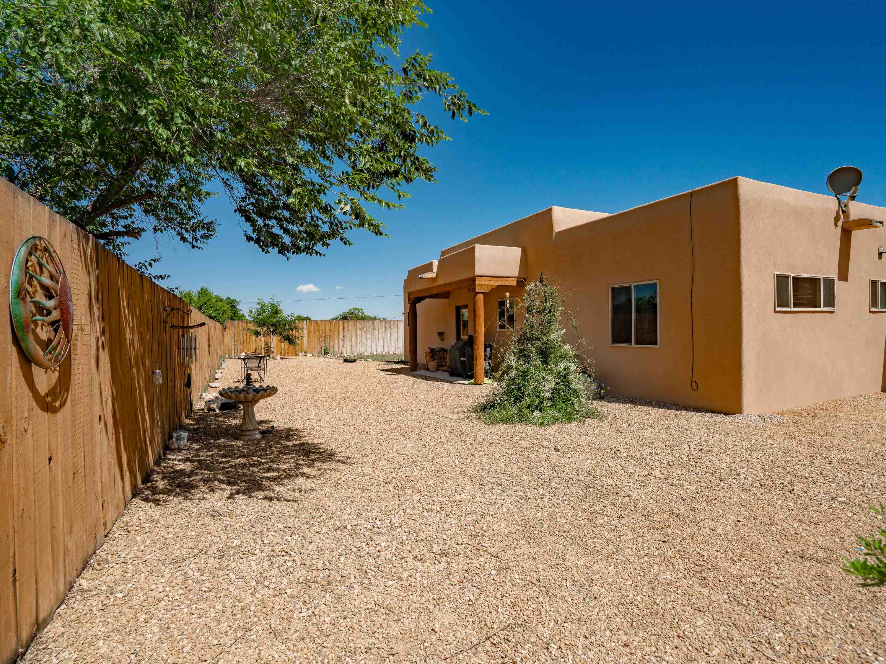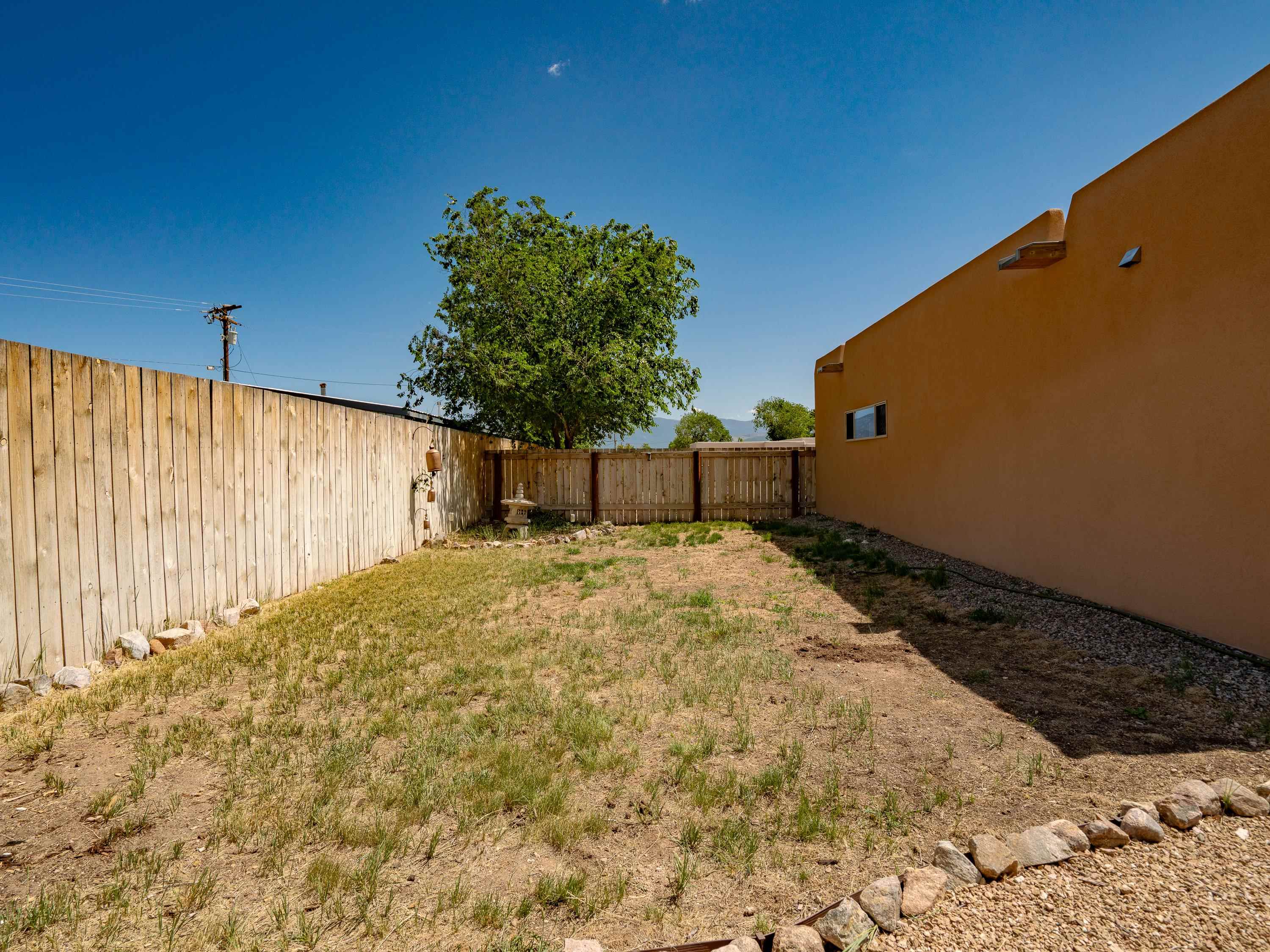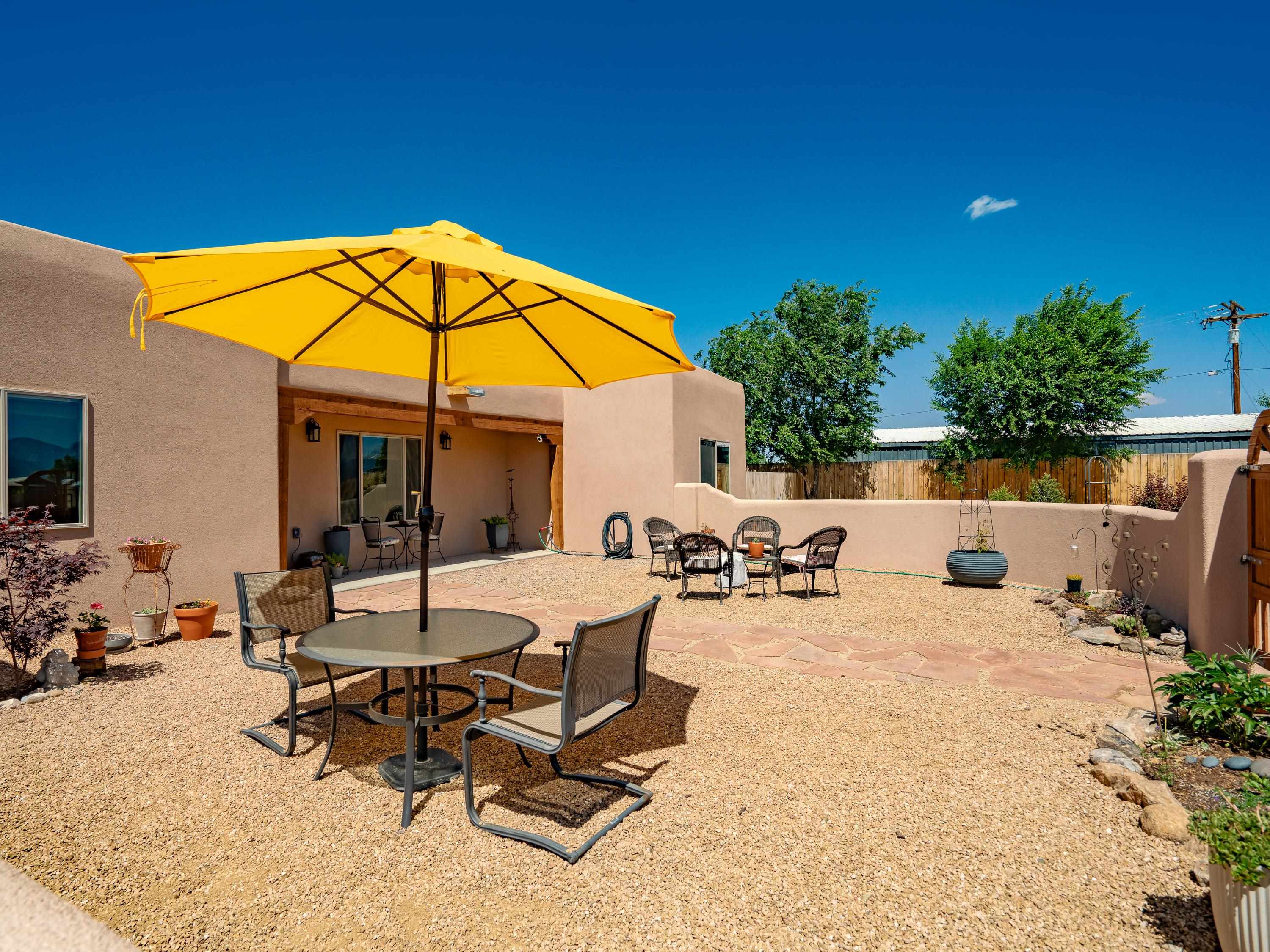 If privacy, comfort, and low maintenance are on your wish list, this is your spot. At the very end of a dead-end road, this home gives you that “away from it all” feeling—without actually being far from anything. No neighbors driving by. Just a well thought out property; start to finish! Inside, the kitchen is ready for serious cooking. We’re talking oversized knotty alder cabinets, granite countertops, a huge breakfast bar, and a large walk-in-style pantry. The living room brings the Taos feel with a real wood-burning kiva fireplace finished with smooth plaster in a contrasting color, and a big window that frames the landscaped courtyard with the mountains behind it. Saltillo tile runs throughout the home; a must have here in Taos. Designed with smart separation in mind, the primary suite is on one side of the home while the two guest bedrooms (or bedroom + office) are on the other. The primary suite is BIG. Room for your king-size bed, dressers, and then some. The en-suite bathroom includes a walk-in shower with frameless glass, double sinks on a granite counter, custom alder cabinets, and even a built-in linen closet. The walk-in closet has room for your stuff AND your significant other. One of the two guest bedrooms is currently used as a home office with high-speed internet and the guest bathroom has all the beautiful finishes the primary has, including a frameless glass door. The whole house (yes, including the garage) is heated with radiant in-floor heat powered by an on-demand natural gas boiler. That same system also handles your hot water. If you ever felt like you needed more living space, the heated garage is an excellent outlet for your creativity. Extras? You’ve got them: natural gas hookup, shared well, water softener, radon mitigation system, and town sewer—so no septic headaches. Outside, you’ll find a circular driveway, xeriscaping, trees, and privacy fencing in all the right places. The front courtyard is wrapped in a beautiful adobe wall with a nice wooden gate to let you out and keep your pets in! Tucked away in the back corner of the property you’ll find a new Tough Shed for all the stuff you don’t want to stuff into your garage. Built in 2022, the house is in great condition and is ready for you to move in, relax, and enjoy the reasons you are moving to Taos for!
