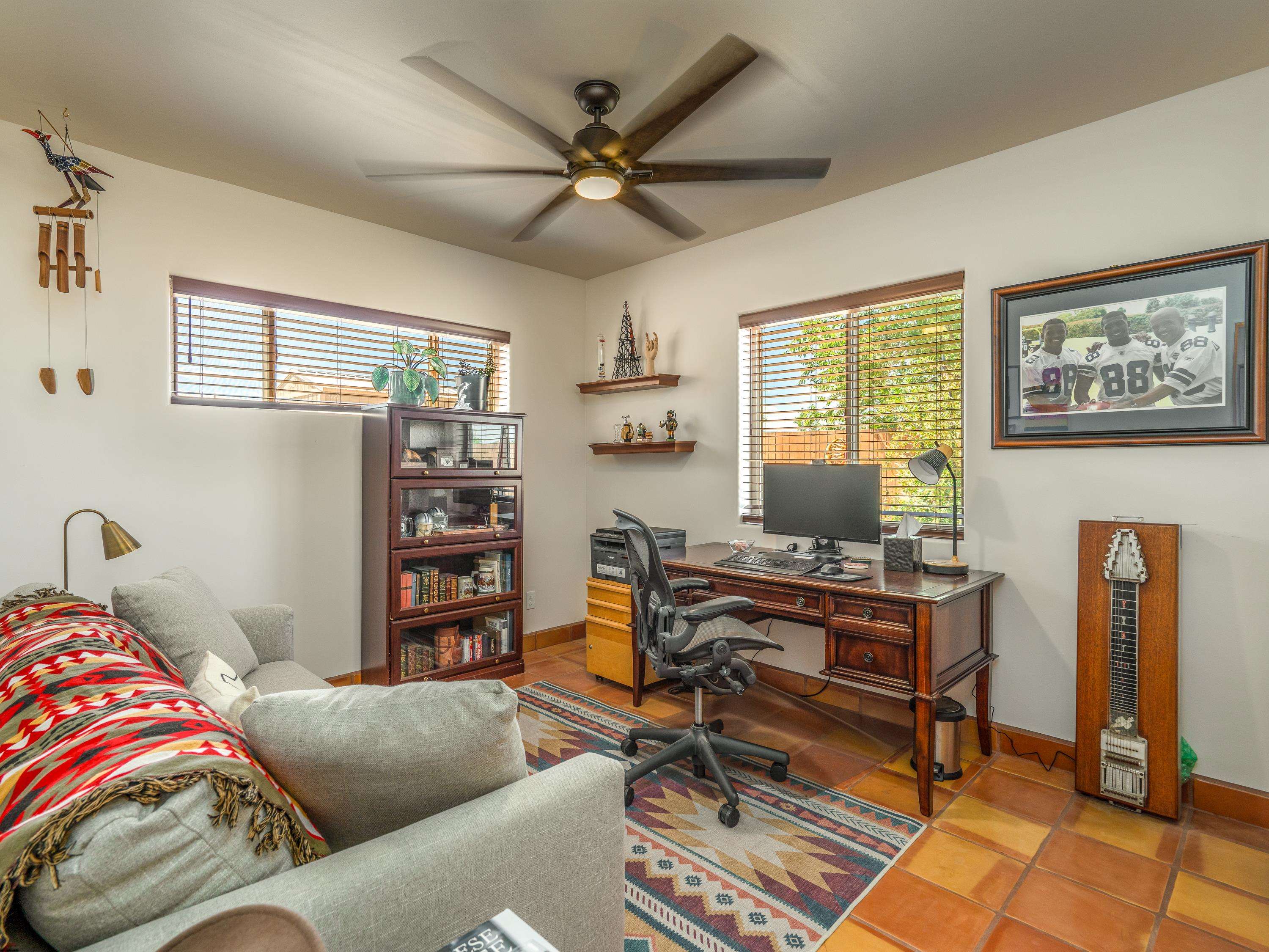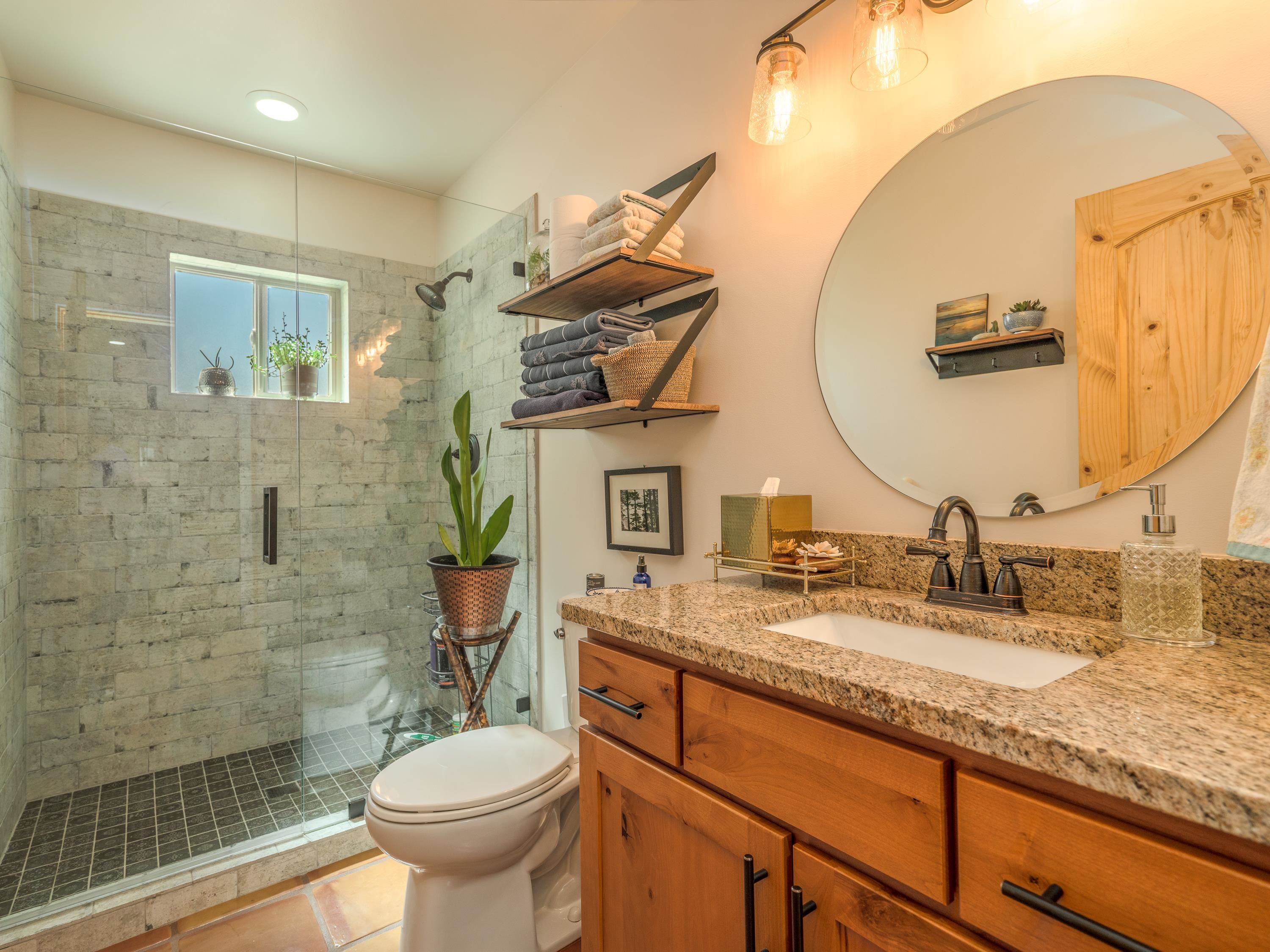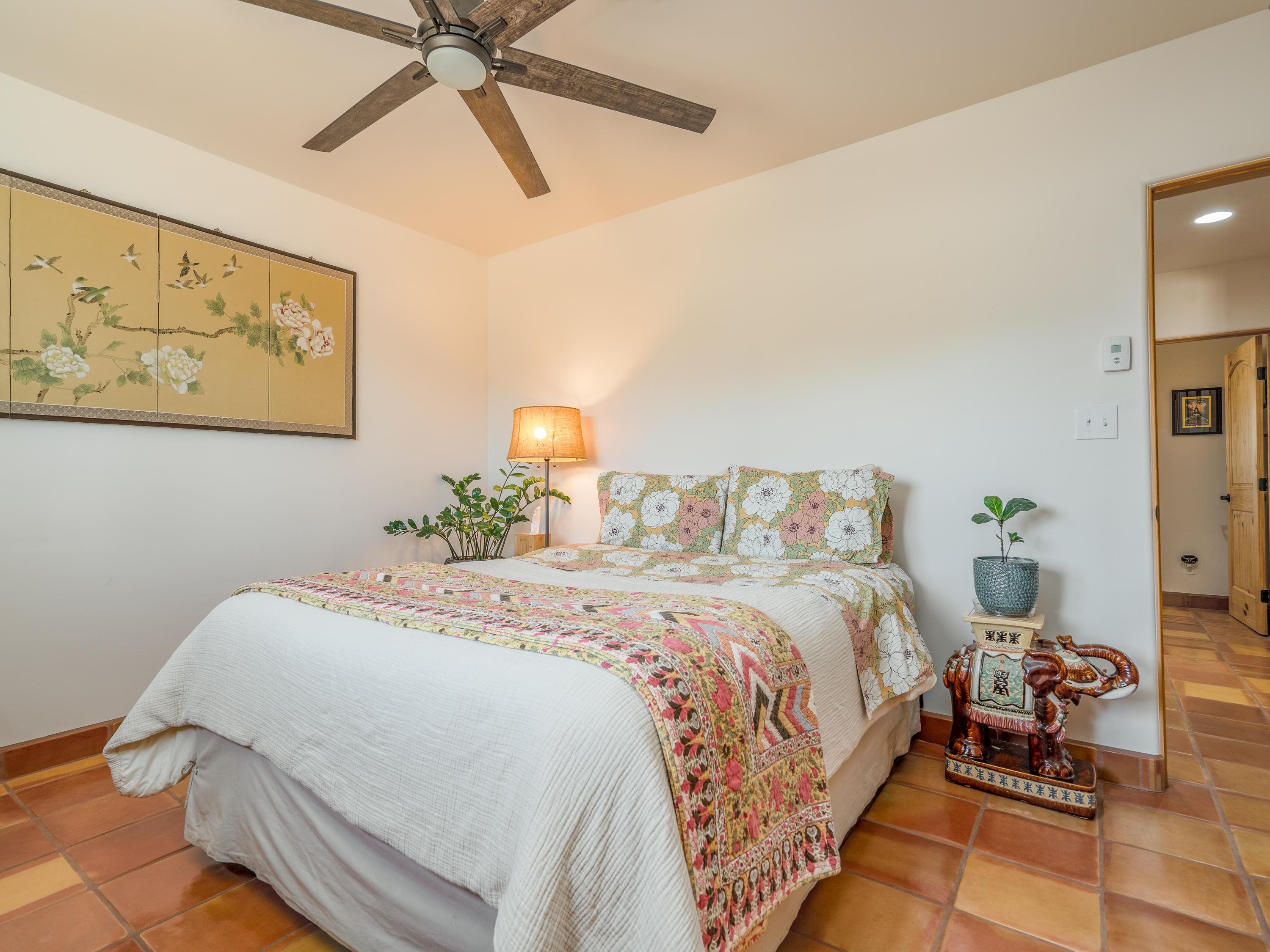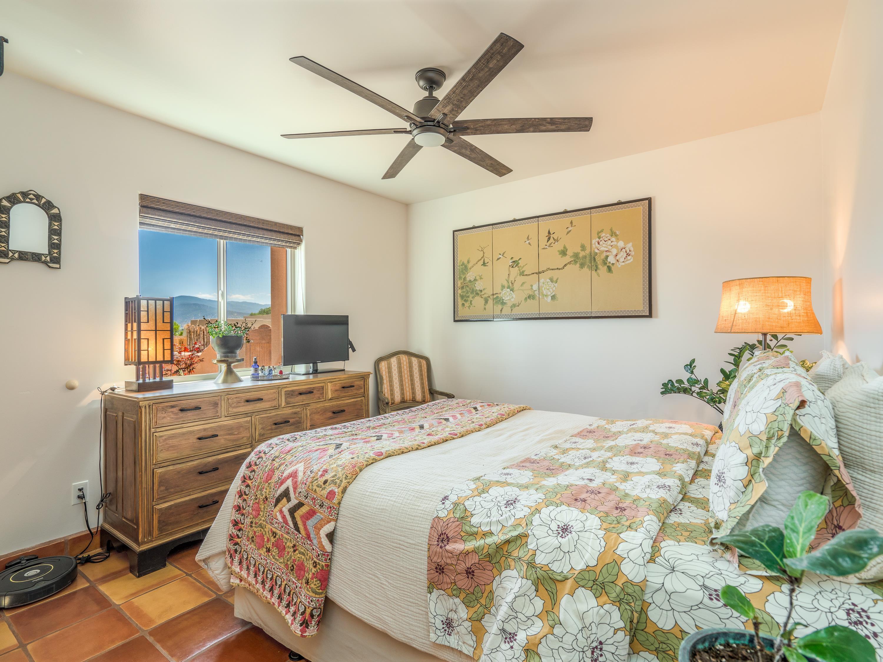 If privacy, comfort, and low maintenance are on your wish list, this is your spot. At the very end of a dead-end road, this home gives you that “away from it all” feeling—without actually being far from anything. No neighbors driving by. Just a well thought out property; start to finish! Inside, the kitchen is ready for serious cooking. We’re talking oversized knotty alder cabinets, granite countertops, a huge breakfast bar, and a large walk-in-style pantry. The living room brings the Taos feel with a real wood-burning kiva fireplace finished with smooth plaster in a contrasting color, and a big window that frames the landscaped courtyard with the mountains behind it. Saltillo tile runs throughout the home; a must have here in Taos. Designed with smart separation in mind, the primary suite is on one side of the home while the two guest bedrooms (or bedroom + office) are on the other. The primary suite is BIG. Room for your king-size bed, dressers, and then some. The en-suite bathroom includes a walk-in shower with frameless glass, double sinks on a granite counter, custom alder cabinets, and even a built-in linen closet. The walk-in closet has room for your stuff AND your significant other. One of the two guest bedrooms is currently used as a home office with high-speed internet and the guest bathroom has all the beautiful finishes the primary has, including a frameless glass door. The whole house (yes, including the garage) is heated with radiant in-floor heat powered by an on-demand natural gas boiler. That same system also handles your hot water. If you ever felt like you needed more living space, the heated garage is an excellent outlet for your creativity. Extras? You’ve got them: natural gas hookup, shared well, water softener, radon mitigation system, and town sewer—so no septic headaches. Outside, you’ll find a circular driveway, xeriscaping, trees, and privacy fencing in all the right places. The front courtyard is wrapped in a beautiful adobe wall with a nice wooden gate to let you out and keep your pets in! Tucked away in the back corner of the property you’ll find a new Tough Shed for all the stuff you don’t want to stuff into your garage. Built in 2022, the house is in great condition and is ready for you to move in, relax, and enjoy the reasons you are moving to Taos for!