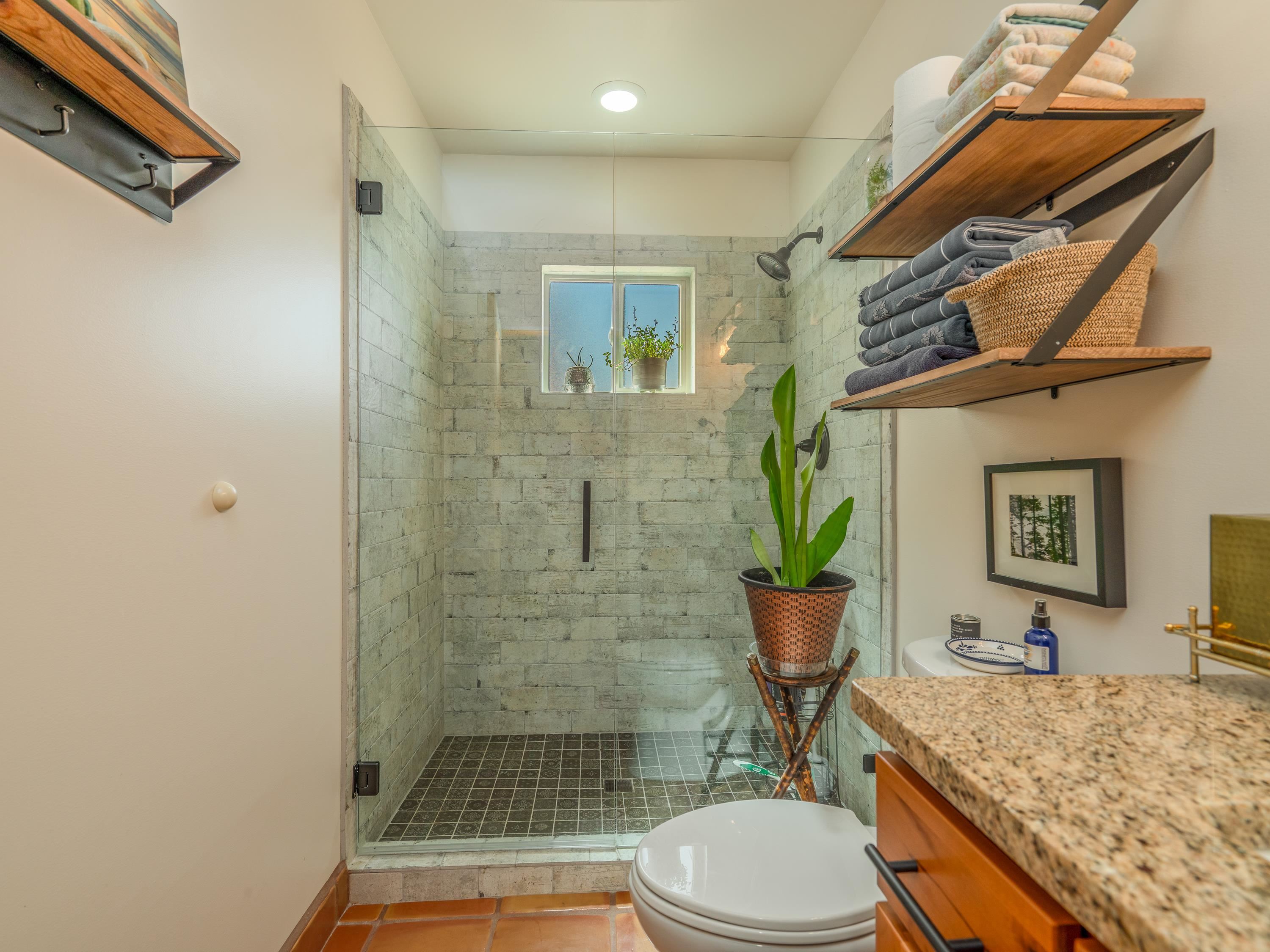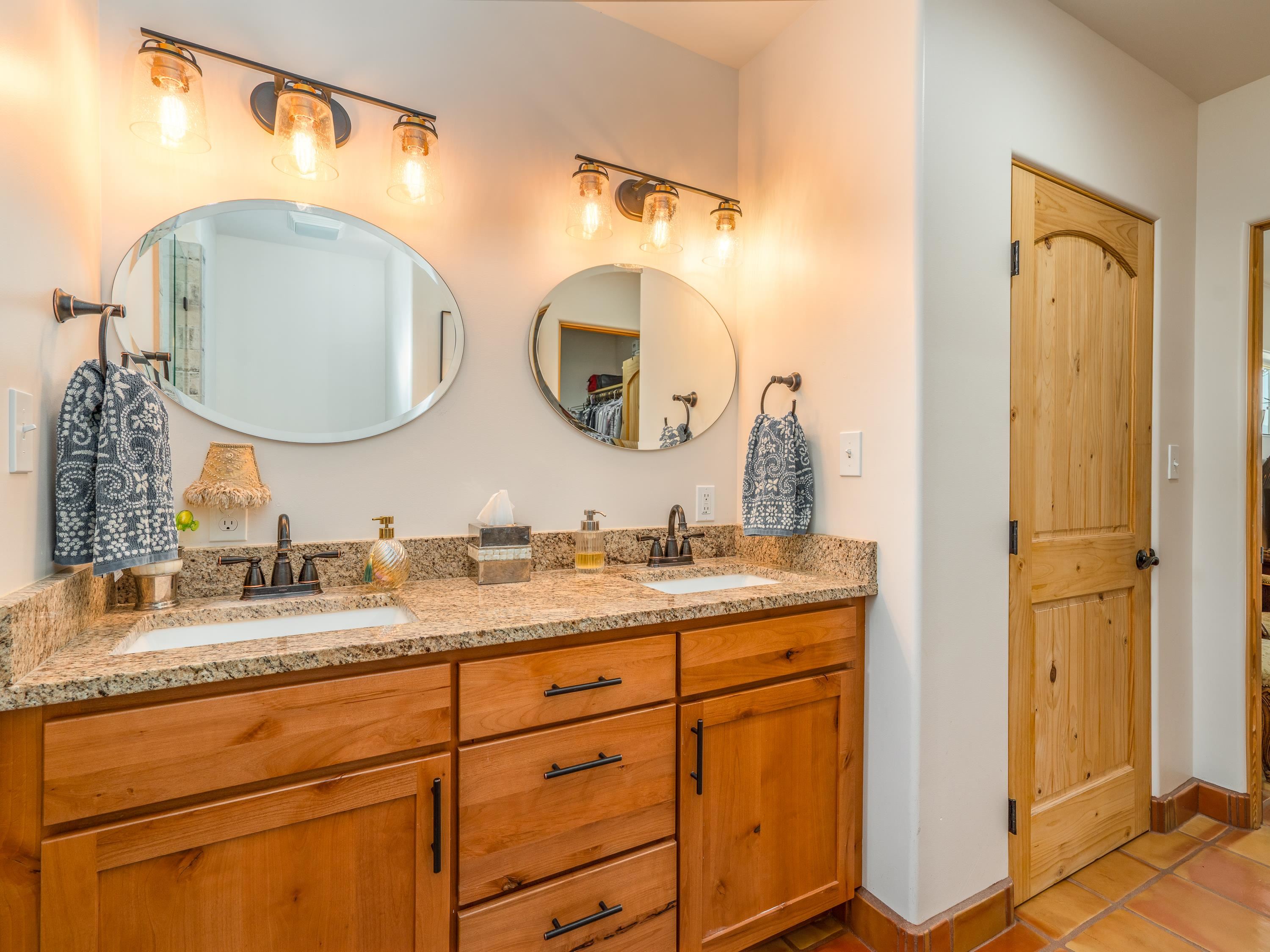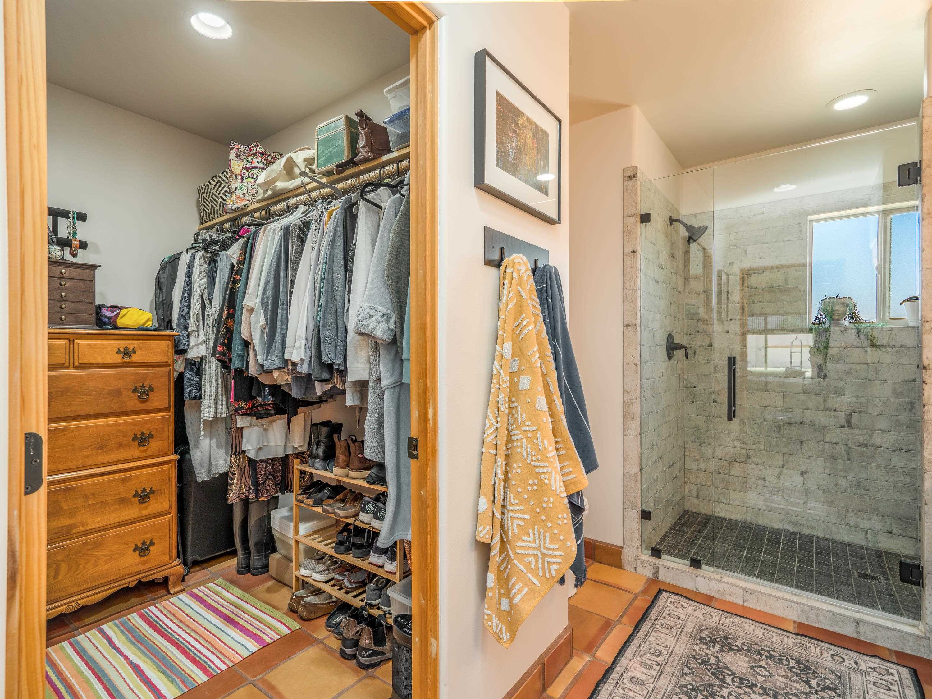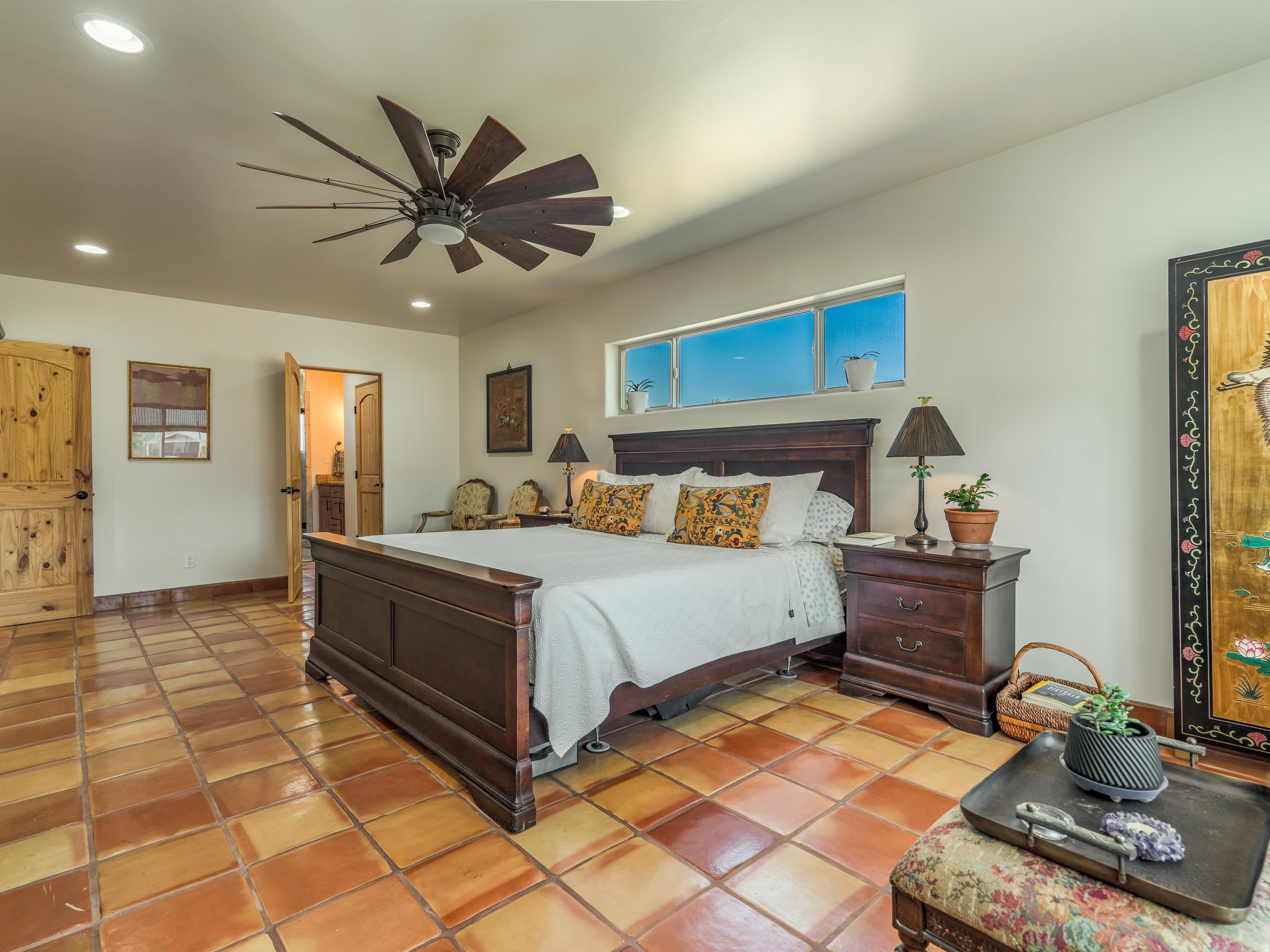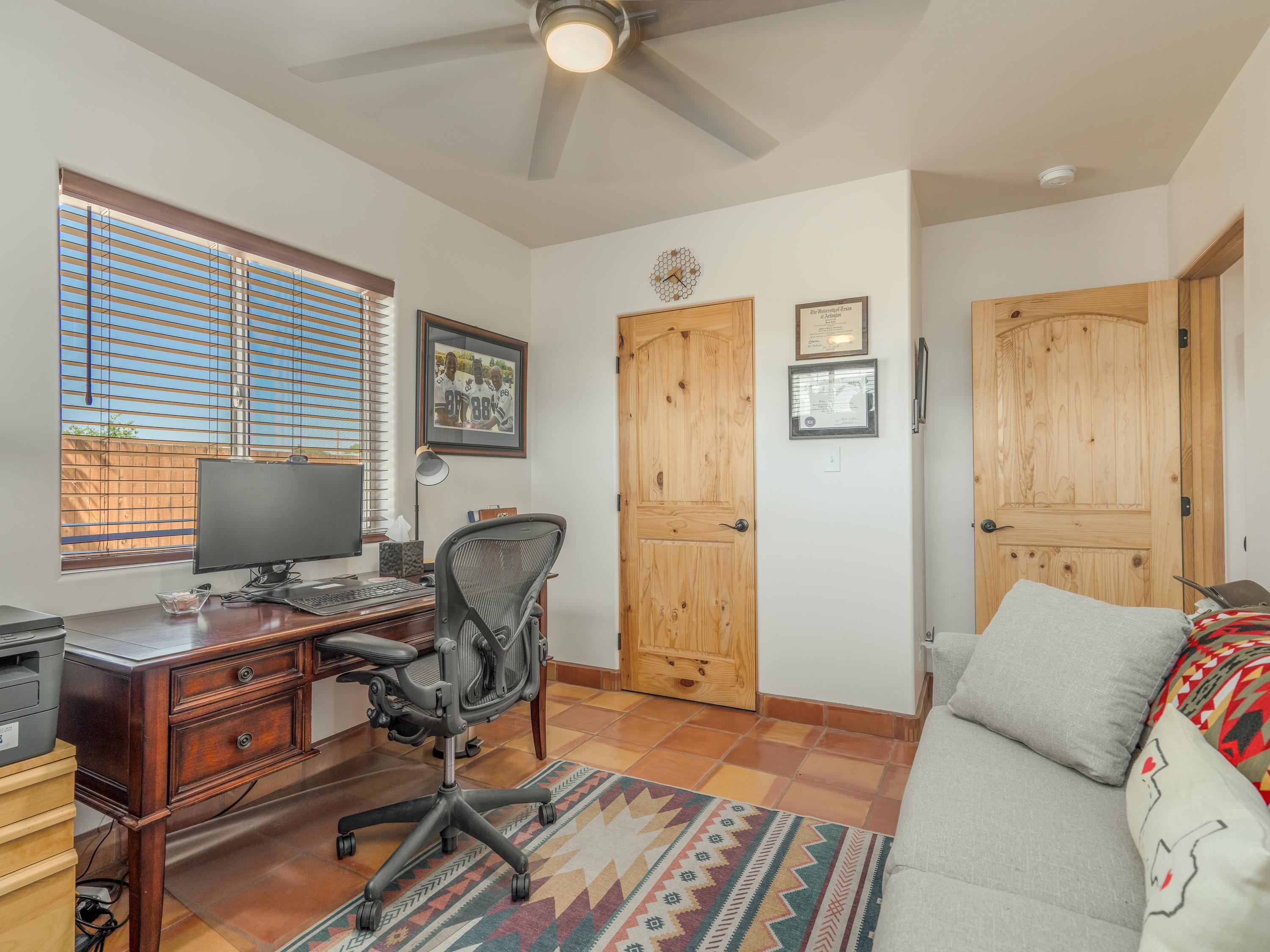 If privacy, comfort, and low maintenance are on your wish list, this is your spot. At the very end of a dead-end road, this home gives you that “away from it all” feeling—without actually being far from anything. No neighbors driving by. Just a well thought out property; start to finish! Inside, the kitchen is ready for serious cooking. We’re talking oversized knotty alder cabinets, granite countertops, a huge breakfast bar, and a large walk-in-style pantry. The living room brings the Taos feel with a real wood-burning kiva fireplace finished with smooth plaster in a contrasting color, and a big window that frames the landscaped courtyard with the mountains behind it. Saltillo tile runs throughout the home; a must have here in Taos. Designed with smart separation in mind, the primary suite is on one side of the home while the two guest bedrooms (or bedroom + office) are on the other. The primary suite is BIG. Room for your king-size bed, dressers, and then some. The en-suite bathroom includes a walk-in shower with frameless glass, double sinks on a granite counter, custom alder cabinets, and even a built-in linen closet. The walk-in closet has room for your stuff AND your significant other. One of the two guest bedrooms is currently used as a home office with high-speed internet and the guest bathroom has all the beautiful finishes the primary has, including a frameless glass door. The whole house (yes, including the garage) is heated with radiant in-floor heat powered by an on-demand natural gas boiler. That same system also handles your hot water. If you ever felt like you needed more living space, the heated garage is an excellent outlet for your creativity. Extras? You’ve got them: natural gas hookup, shared well, water softener, radon mitigation system, and town sewer—so no septic headaches. Outside, you’ll find a circular driveway, xeriscaping, trees, and privacy fencing in all the right places. The front courtyard is wrapped in a beautiful adobe wall with a nice wooden gate to let you out and keep your pets in! Tucked away in the back corner of the property you’ll find a new Tough Shed for all the stuff you don’t want to stuff into your garage. Built in 2022, the house is in great condition and is ready for you to move in, relax, and enjoy the reasons you are moving to Taos for!