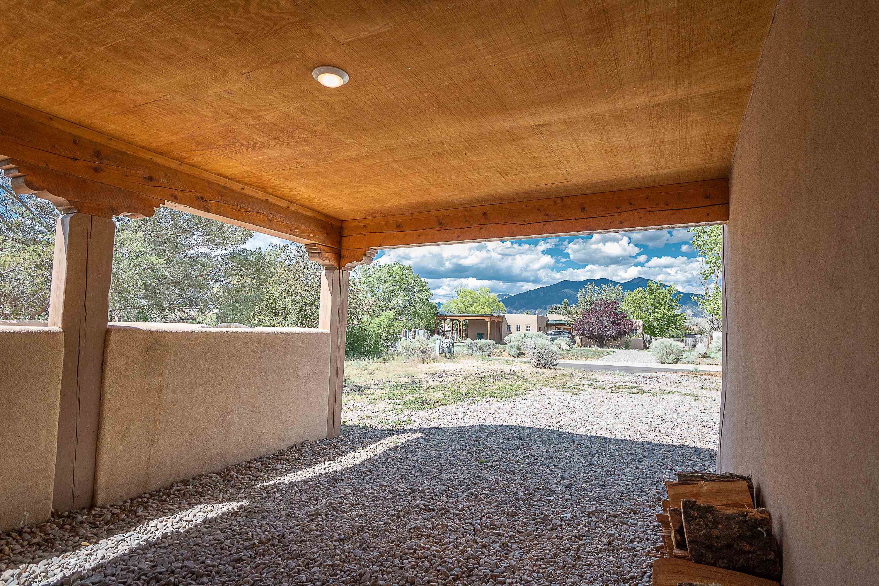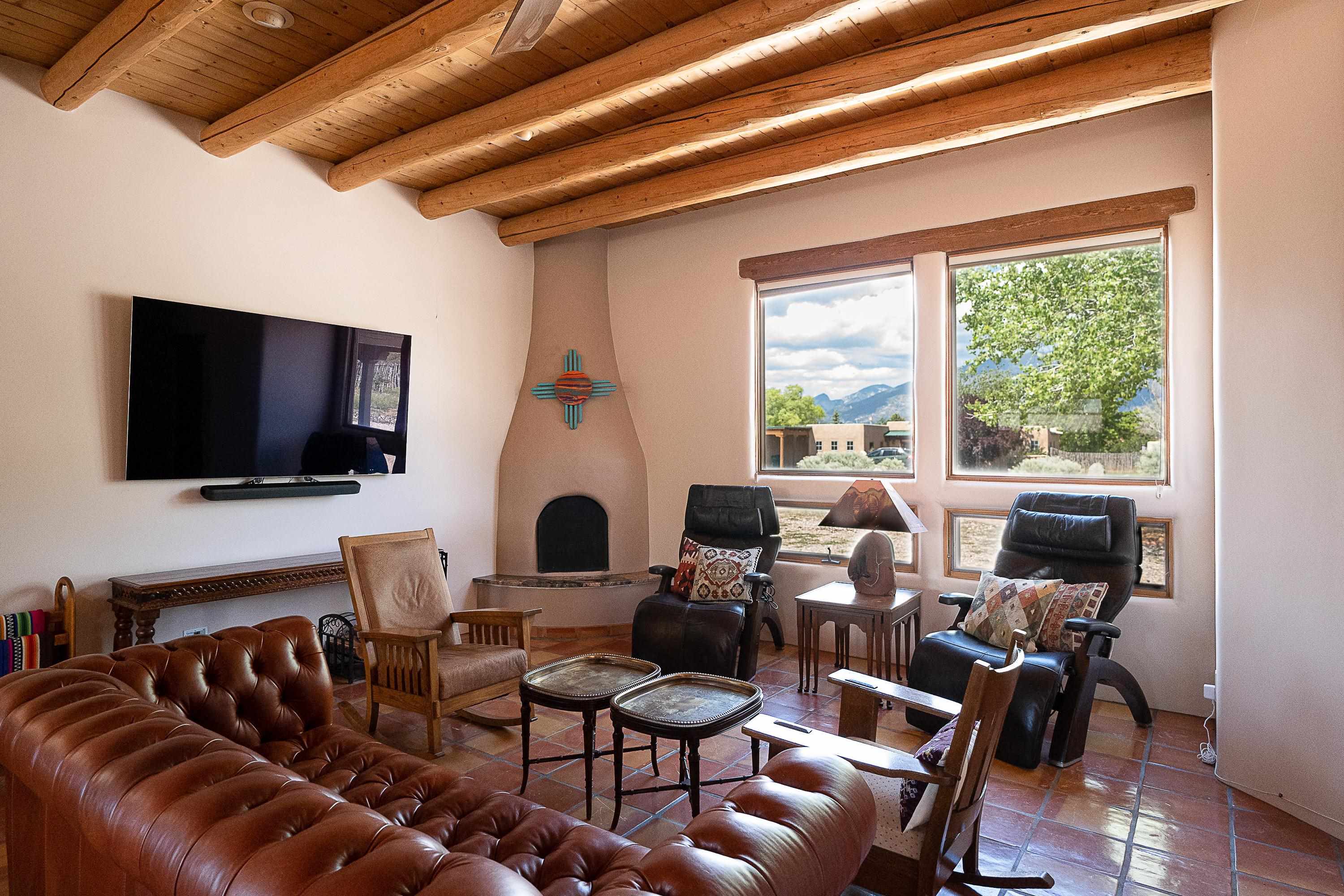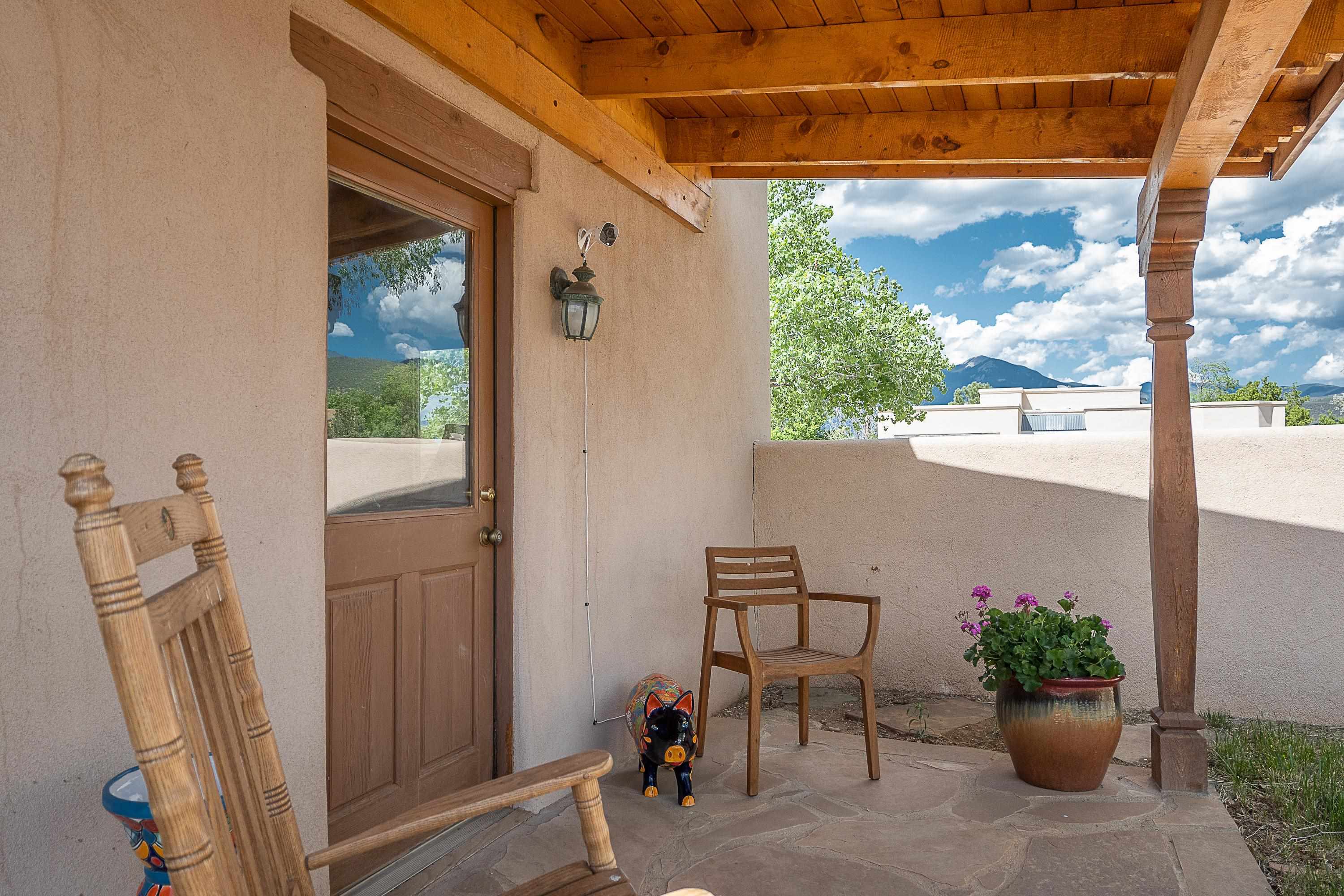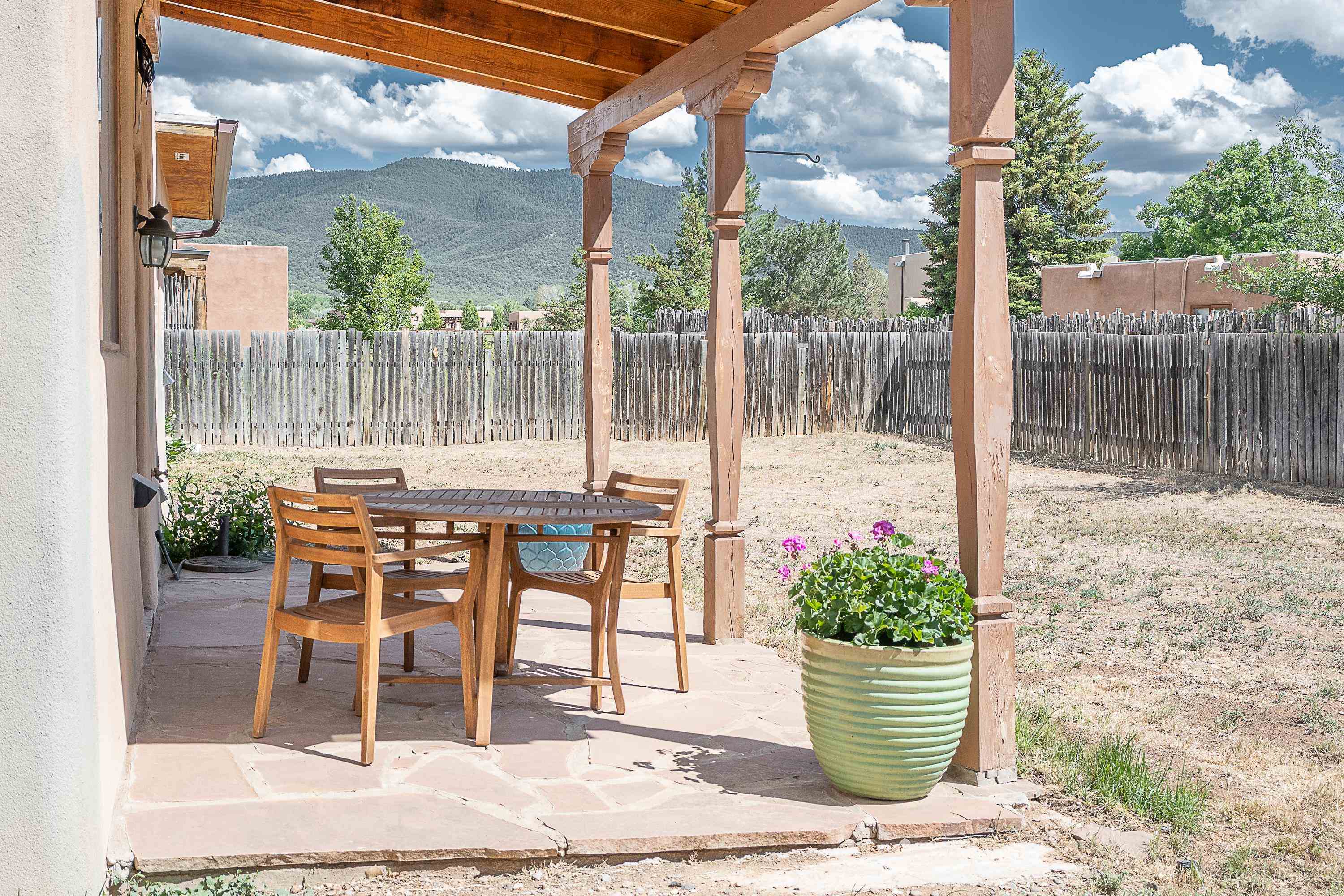 Southwest style in the heart of town! This sweet house has it all. Conveniently located, the house is at the back of a paved U-shaped road in the sought after Vegas de Taos neighborhood. Enter through the covered portal into a large great room with high ceilings graced by 13 vigas and a beautiful corner Southwestern style wood burning fireplace. There is a newly constructed custom kitchen island with loads of storage and a granite countertop. Great space for 4 to hang out comfortably at the island and the cute custom barstools will convey. The island is flanked by a dining room space with windows on two sides and direct access to a covered back patio, perfect for entertaining. Down a hallway, the guest bed and bath are on one side and the primary bedroom is at the end of the hall with an en-suite bath, walk-in closet and a private covered patio. Current Sellers have made numerous upgrades including, but not limited to : fantastic double-headed walk-in shower in the primary bath, new Saltillo tile throughout the home, custom kitchen island with granite countertop, all new high-end stainless appliances, new on-demand hot water heater/boiler combo unit, new door hardware, thermostats and light switch plates throughout, new ceiling fans, new LED-integrated lighted bath mirrors in both bathrooms, new fancy high-tech toilets and interior paint. There is a huge fully fenced backyard with mature trees, a beautiful rose and some state fair-worthy peonies. There is a circular drive in front of the home and a covered, attached carport with direct access to the house and a huge enclosed storage closet. Vigas, lintels, saltillo, corbals, portals- If You Know, You Know- don't miss this one!