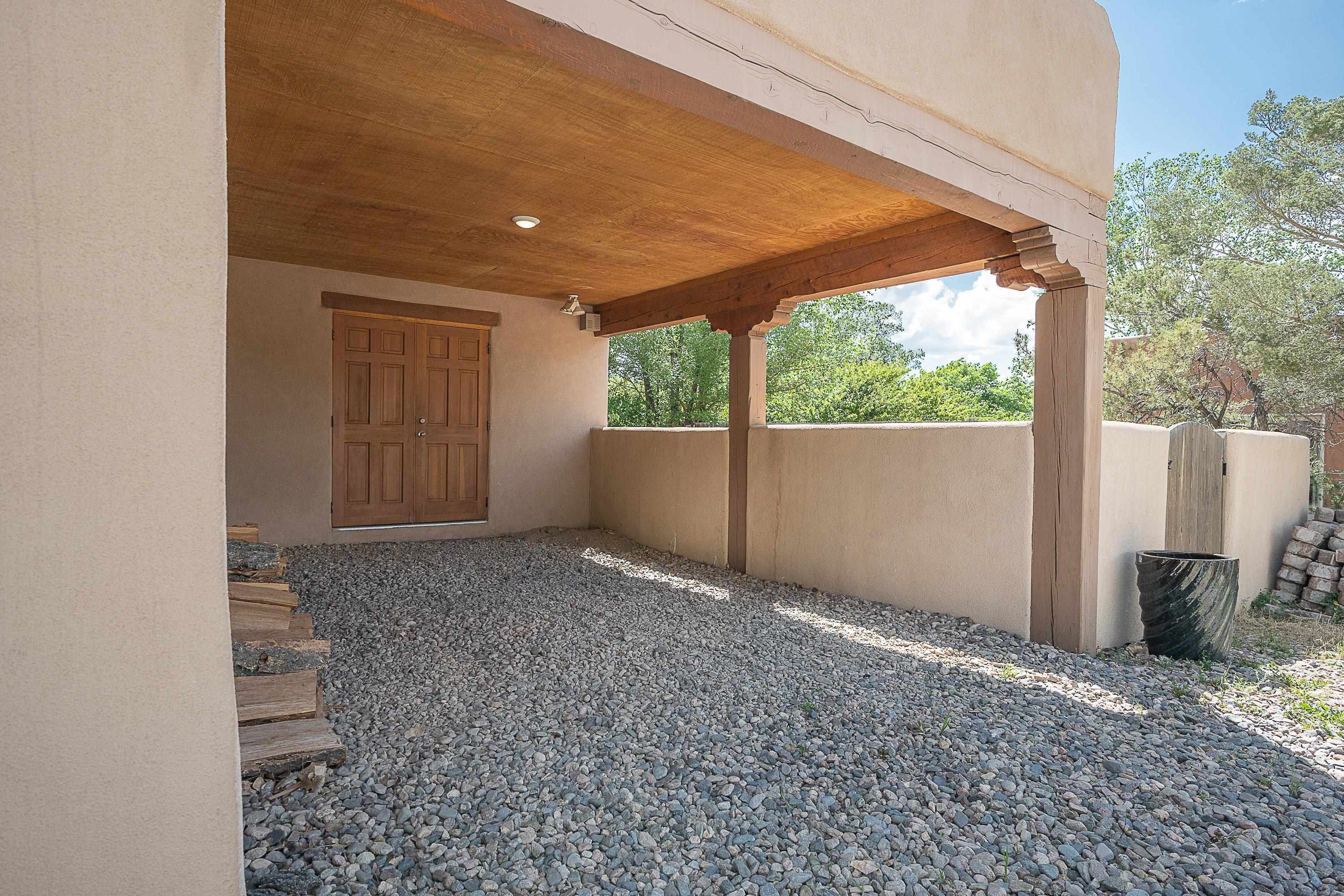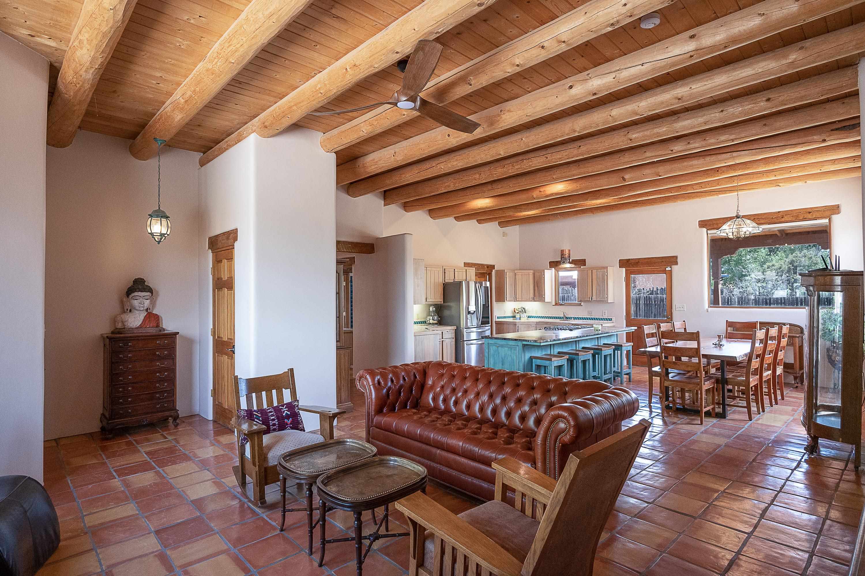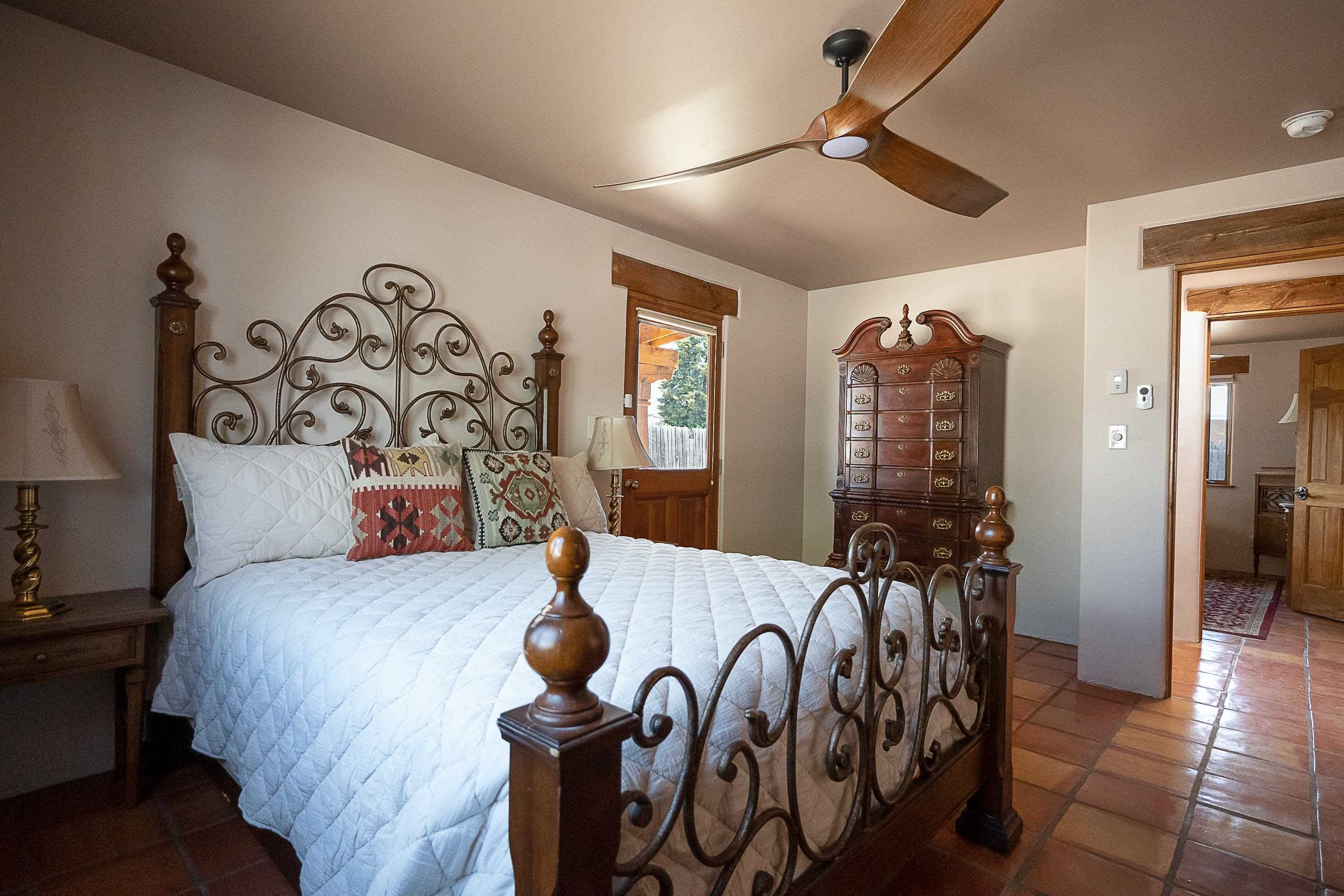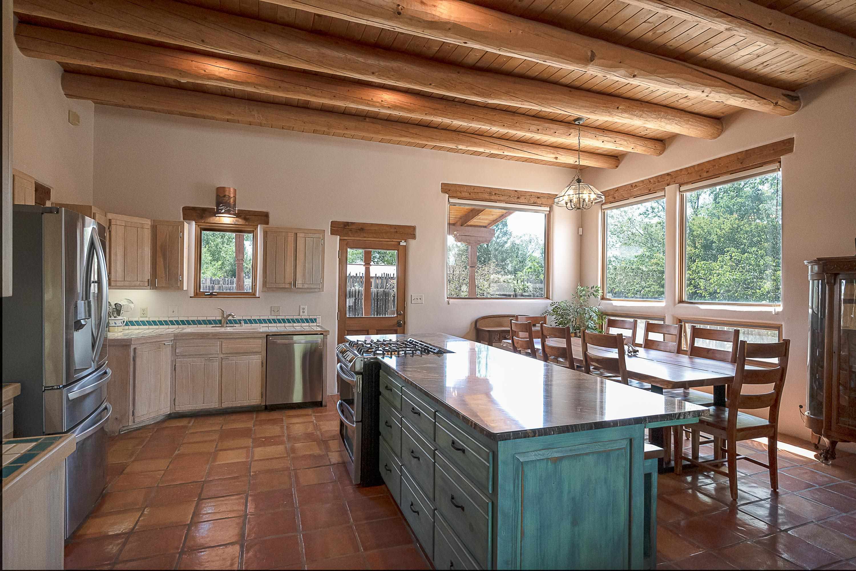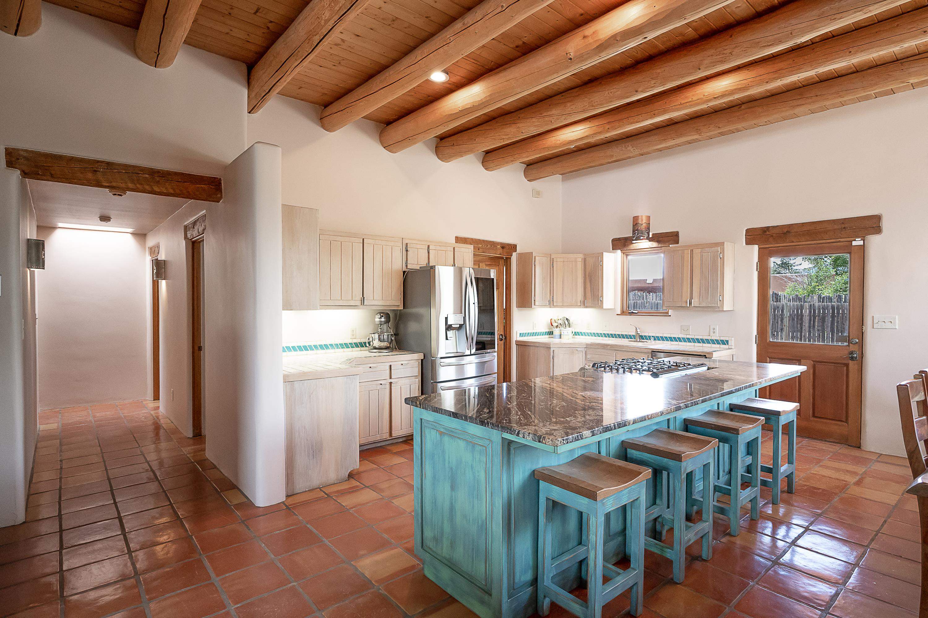 Southwest style in the heart of town! This sweet house has it all. Conveniently located, the house is at the back of a paved U-shaped road in the sought after Vegas de Taos neighborhood. Enter through the covered portal into a large great room with high ceilings graced by 13 vigas and a beautiful corner Southwestern style wood burning fireplace. There is a newly constructed custom kitchen island with loads of storage and a granite countertop. Great space for 4 to hang out comfortably at the island and the cute custom barstools will convey. The island is flanked by a dining room space with windows on two sides and direct access to a covered back patio, perfect for entertaining. Down a hallway, the guest bed and bath are on one side and the primary bedroom is at the end of the hall with an en-suite bath, walk-in closet and a private covered patio. Current Sellers have made numerous upgrades including, but not limited to : fantastic double-headed walk-in shower in the primary bath, new Saltillo tile throughout the home, custom kitchen island with granite countertop, all new high-end stainless appliances, new on-demand hot water heater/boiler combo unit, new door hardware, thermostats and light switch plates throughout, new ceiling fans, new LED-integrated lighted bath mirrors in both bathrooms, new fancy high-tech toilets and interior paint. There is a huge fully fenced backyard with mature trees, a beautiful rose and some state fair-worthy peonies. There is a circular drive in front of the home and a covered, attached carport with direct access to the house and a huge enclosed storage closet. Vigas, lintels, saltillo, corbals, portals- If You Know, You Know- don't miss this one!