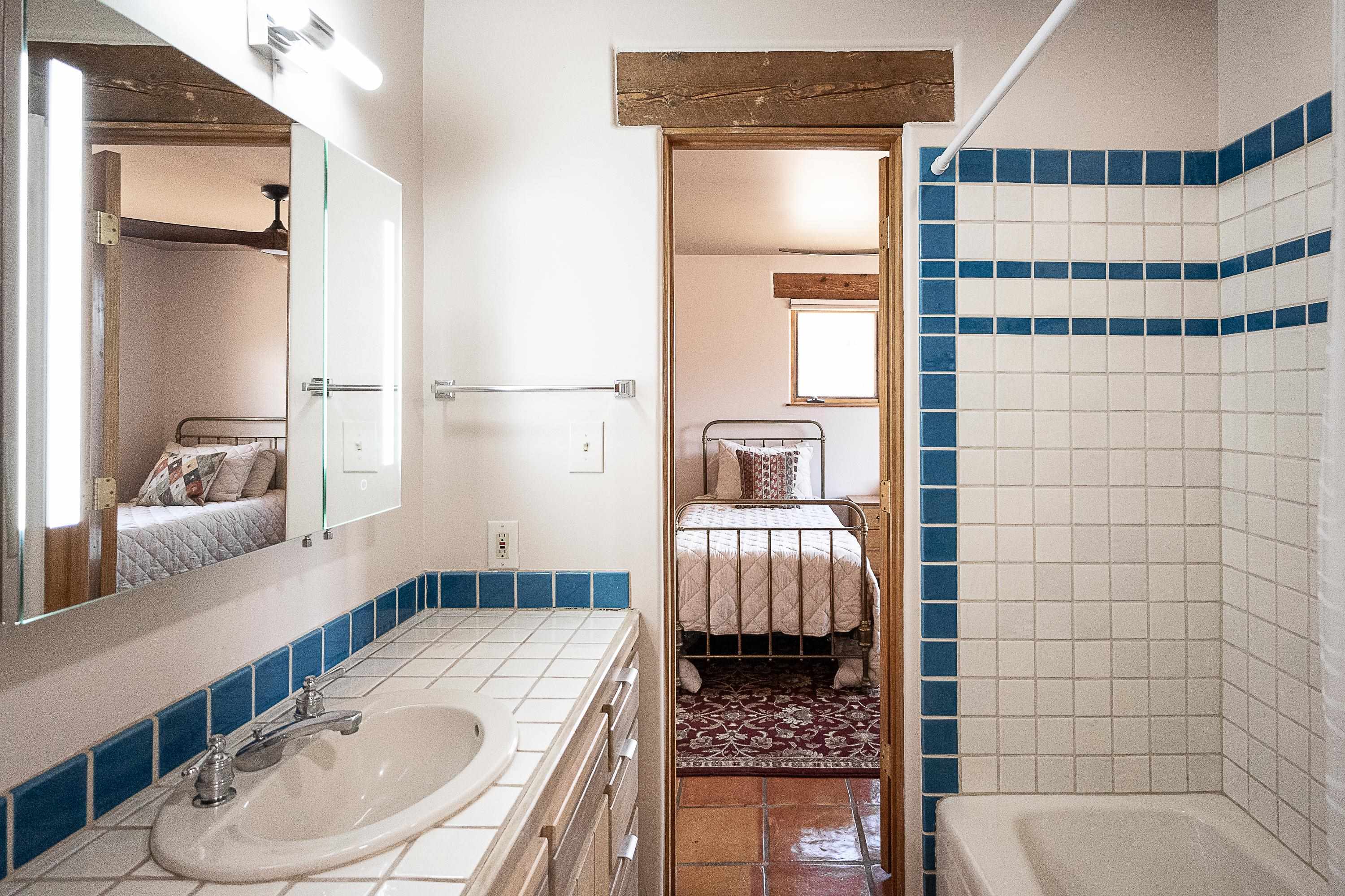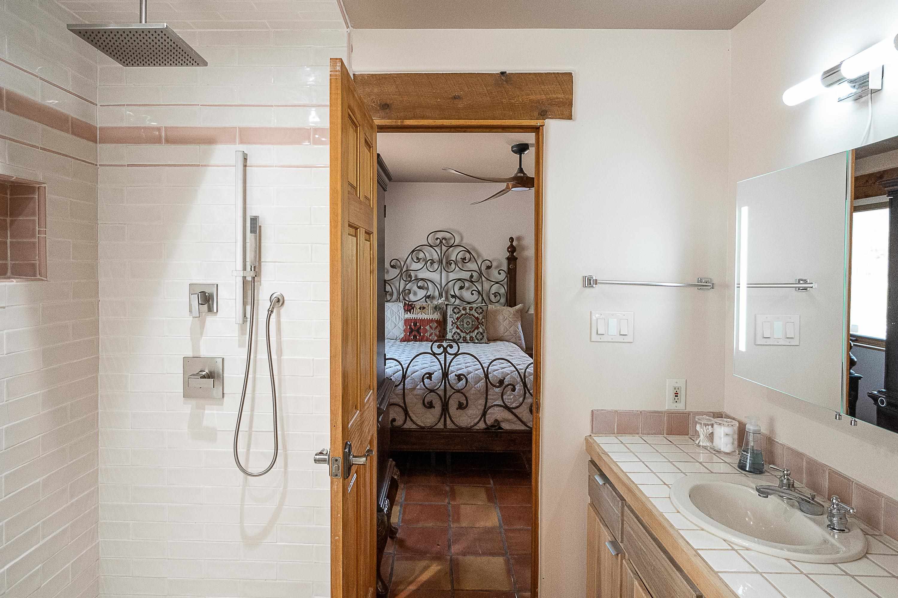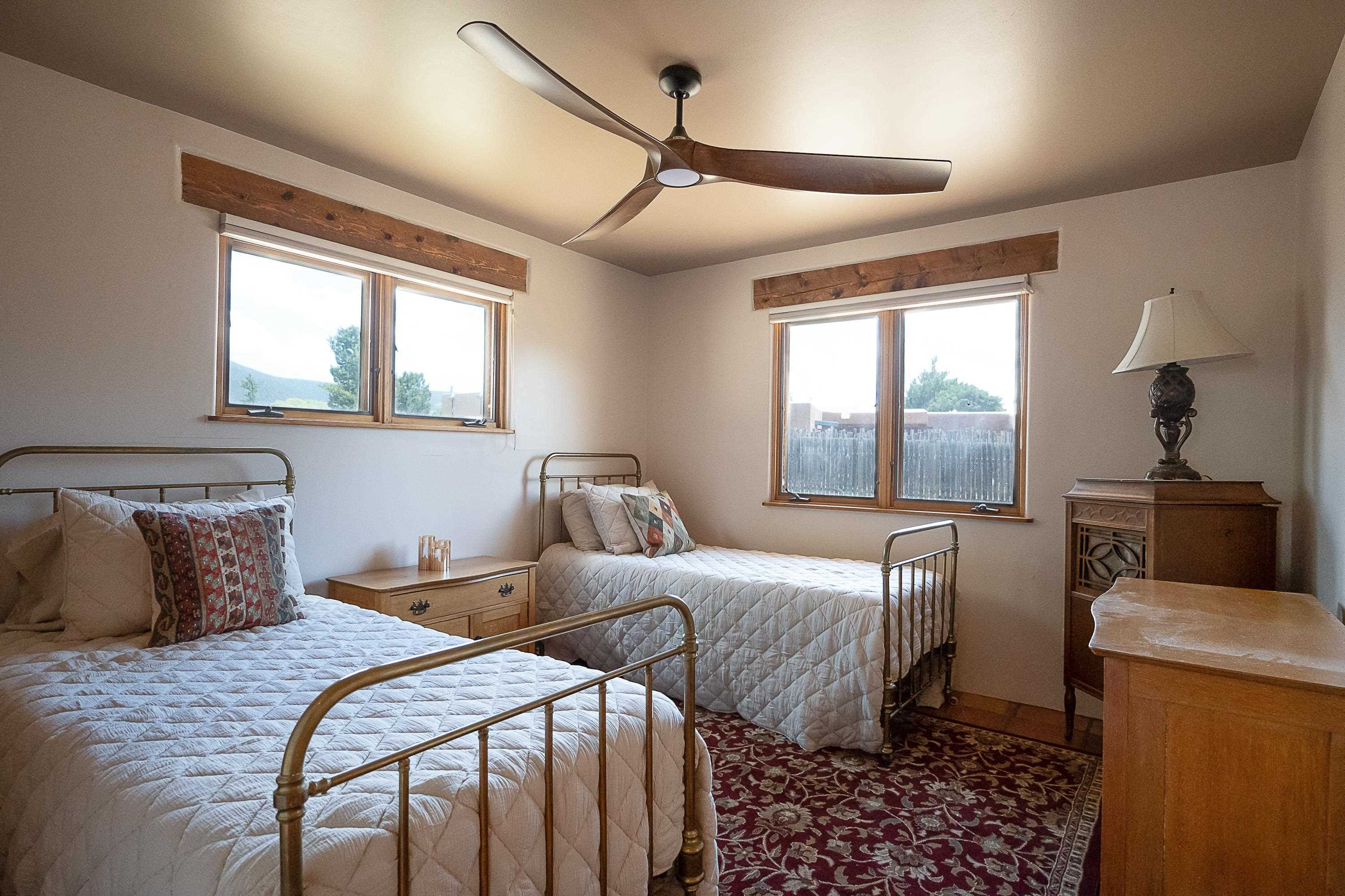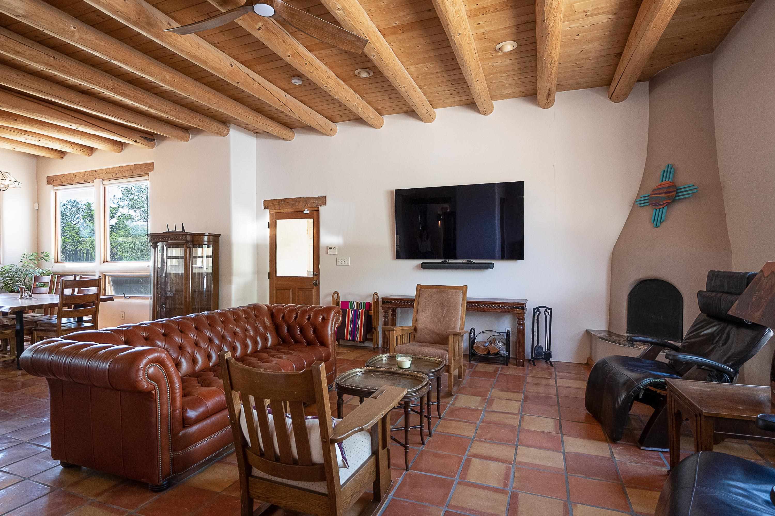 Southwest style in the heart of town! This sweet house has it all. Conveniently located, the house is at the back of a paved U-shaped road in the sought after Vegas de Taos neighborhood. Enter through the covered portal into a large great room with high ceilings graced by 13 vigas and a beautiful corner Southwestern style wood burning fireplace. There is a newly constructed custom kitchen island with loads of storage and a granite countertop. Great space for 4 to hang out comfortably at the island and the cute custom barstools will convey. The island is flanked by a dining room space with windows on two sides and direct access to a covered back patio, perfect for entertaining. Down a hallway, the guest bed and bath are on one side and the primary bedroom is at the end of the hall with an en-suite bath, walk-in closet and a private covered patio. Current Sellers have made numerous upgrades including, but not limited to : fantastic double-headed walk-in shower in the primary bath, new Saltillo tile throughout the home, custom kitchen island with granite countertop, all new high-end stainless appliances, new on-demand hot water heater/boiler combo unit, new door hardware, thermostats and light switch plates throughout, new ceiling fans, new LED-integrated lighted bath mirrors in both bathrooms, new fancy high-tech toilets and interior paint. There is a huge fully fenced backyard with mature trees, a beautiful rose and some state fair-worthy peonies. There is a circular drive in front of the home and a covered, attached carport with direct access to the house and a huge enclosed storage closet. Vigas, lintels, saltillo, corbals, portals- If You Know, You Know- don't miss this one!