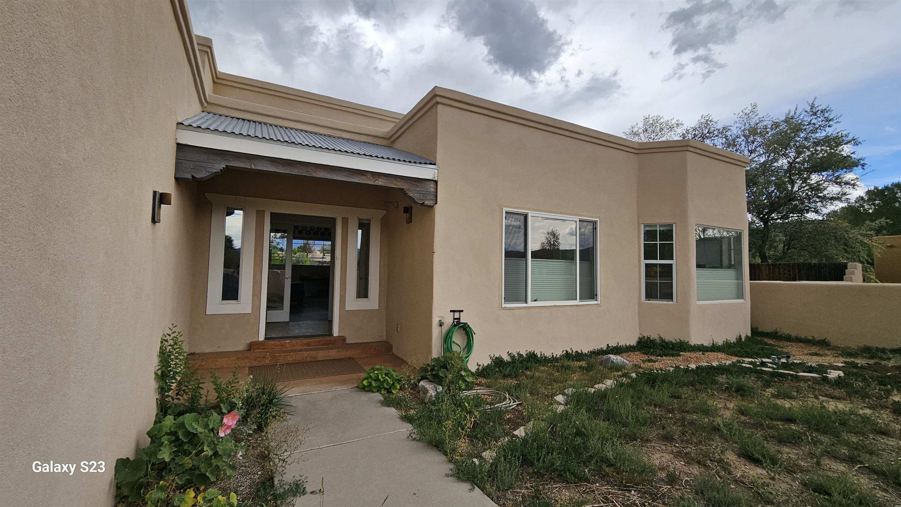 NEW ROOF installed by Collignon. Work completed 12/10/2025. Contemporary pueblo-style home in desirable Vegas de Taos. Abundant natural light and high viga ceilings in the living and dining area create comfortable and welcoming ambiance. The living room features doors to a covered patio and a large picture window which frame Taos Mountain views bringing the outdoors in. Quiet and private 3 bedroom and 2 bath 2,066 square foot home plus attached 2 car garage. The two bathrooms and kitchen have been recently updated. Walled courtyards, on .34 acre with unobstructed views. Tranquil location convenient to all amenities!