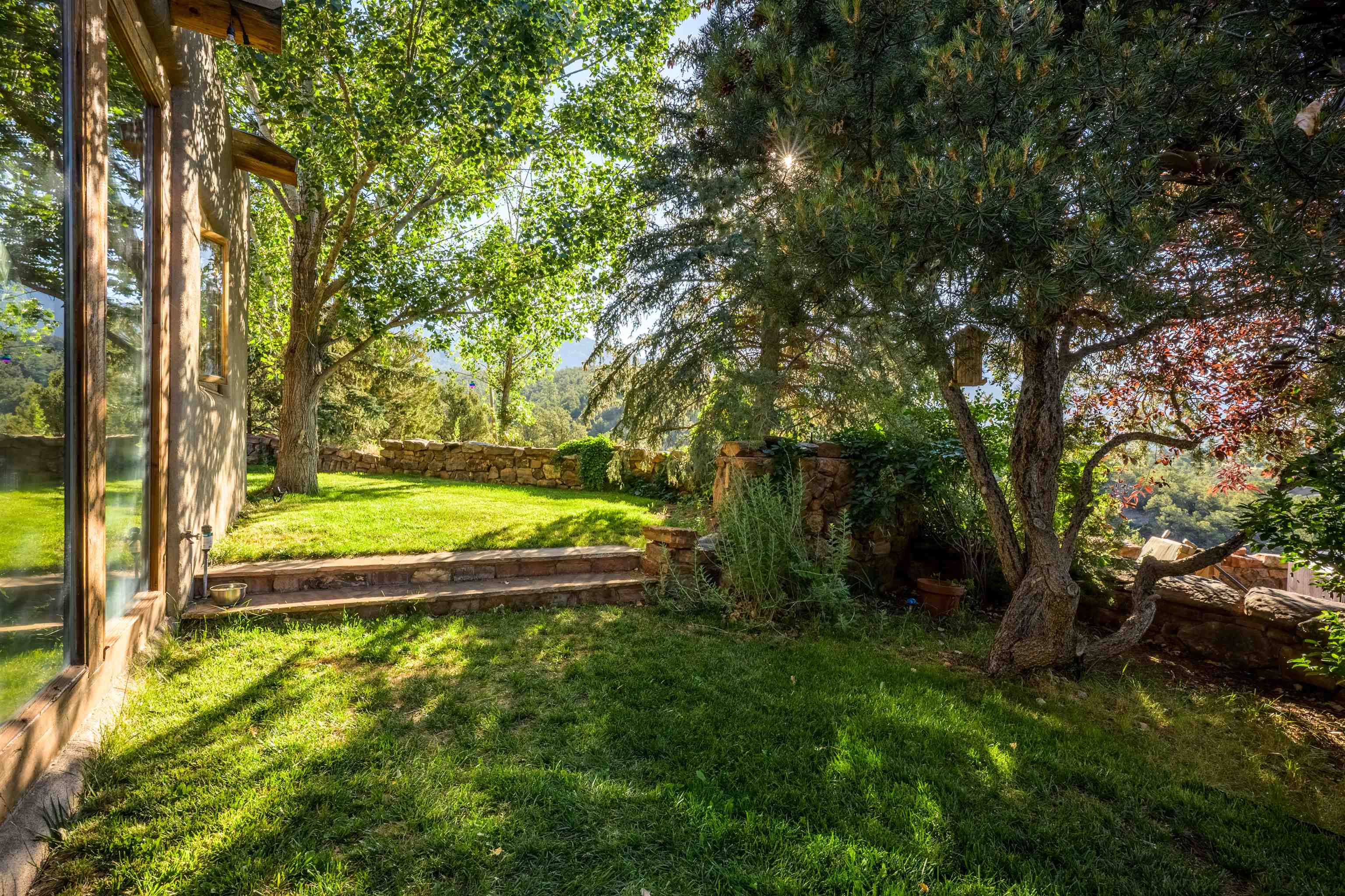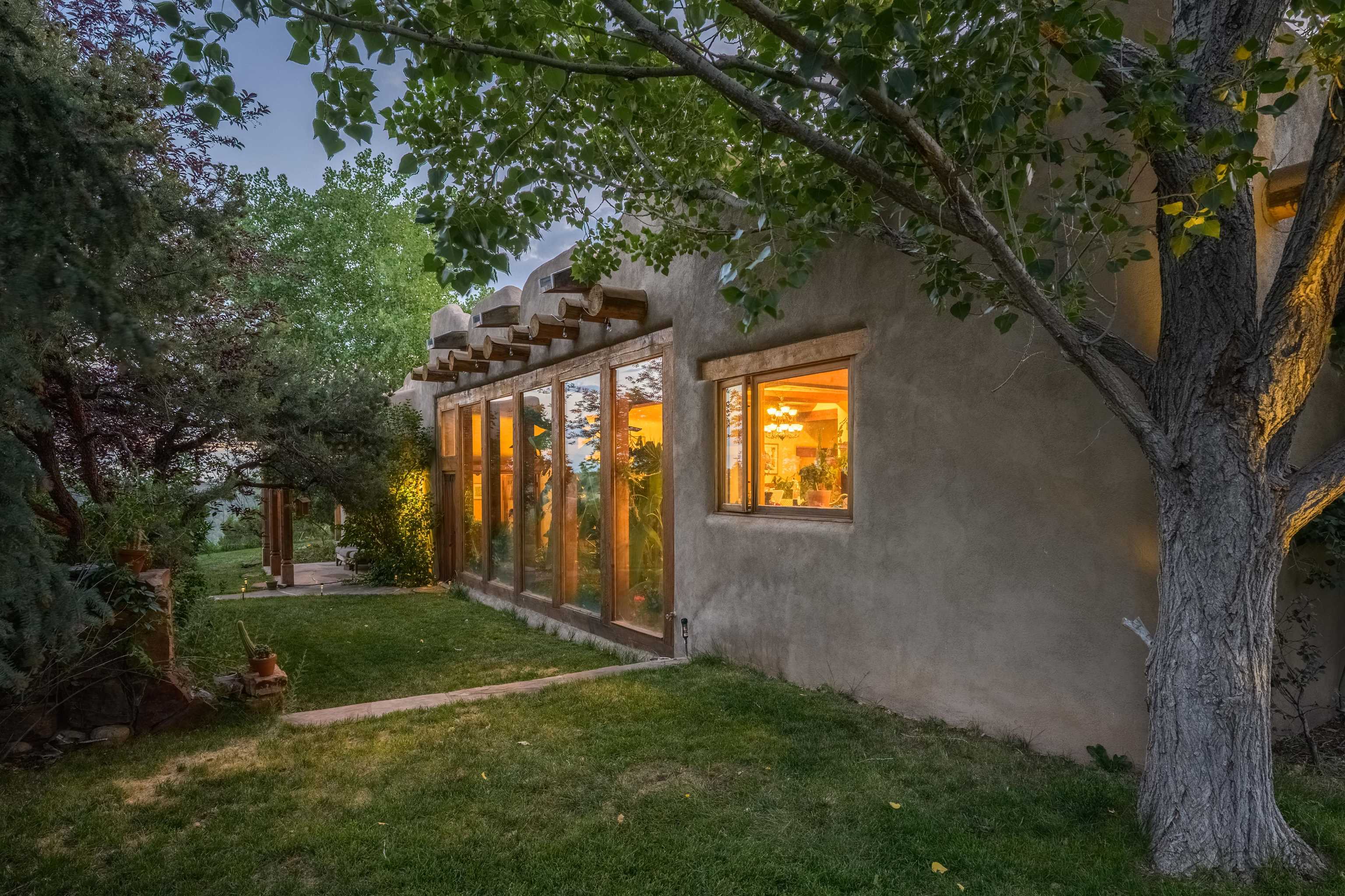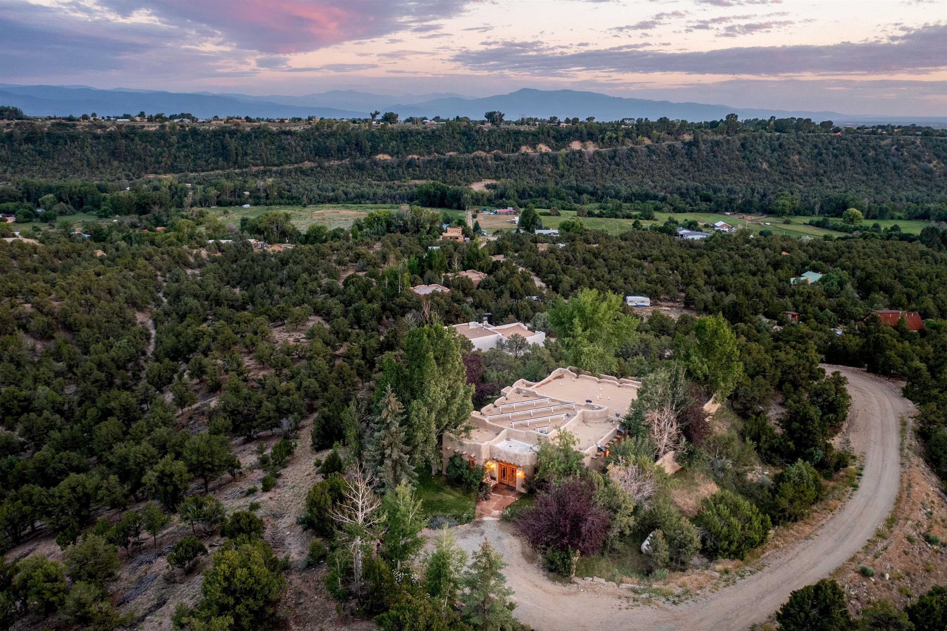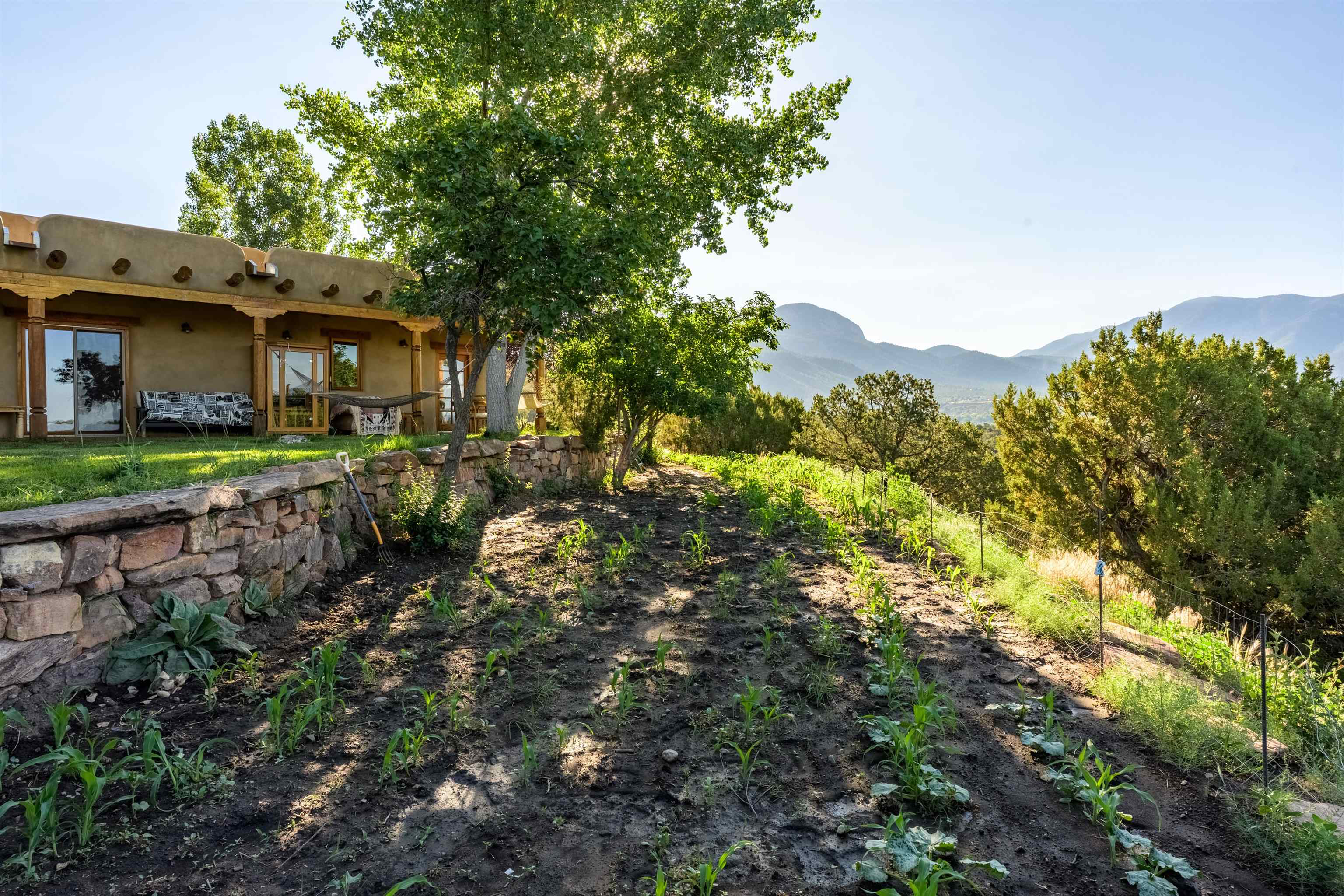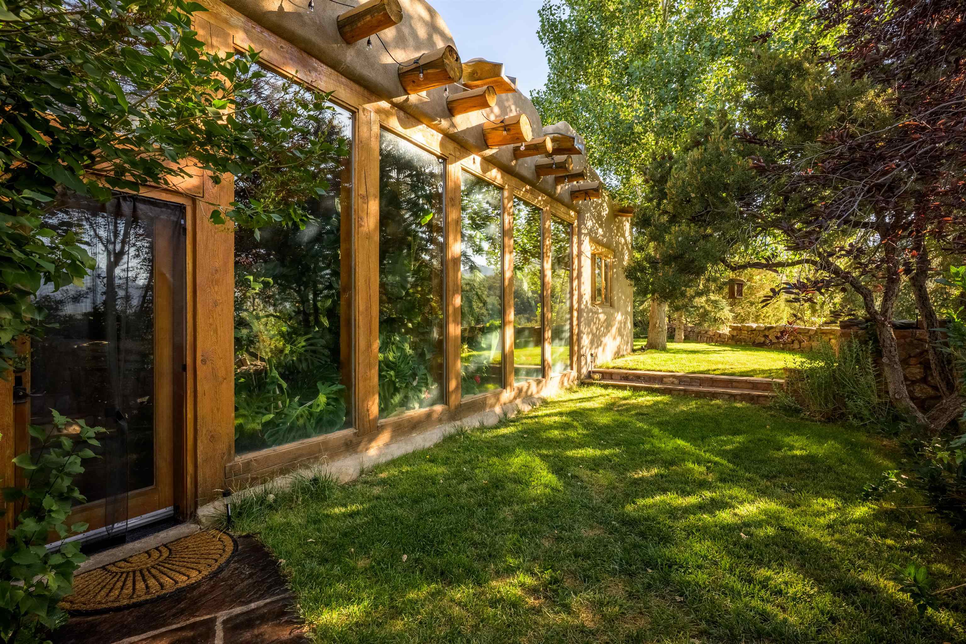 Luxurious & Sustainable High Desert Castle on the Valdez Hillside ~ Welcome to Winsor Castle, 3,300 sqft of pure magnificence pleasantly situated near Taos Ski Valley, just a short distance to Central Taos, with some of the most remarkable views in New Mexico. This exquisite and overbuilt residence inspired by the Mabel Dodge Luhan House is set on over one acre of lush piñon & juniper forest. To put it bluntly, the entire residence was overbuilt by the current and only owner, to his personal taste. Upon stepping into the solar passive residence powered by a net-metered solar system, you will encounter endless meticulousness amongst several hand-crafted and traditional custom features. High ceilings with impressive 10x10 Douglas fir vigas and tongue-and-groove accents that create an open, airy, and well lit atmosphere, complemented by recessed lighting. Special 6-sided Mexican Saltillo tile floors above radiant heated floors throughout the home, and travertine tile archways evoke a special Southwest feeling. Extending from the kitchen and living room into the primary bedroom you will encounter perhaps the home's most notable feature; a spectacular tropical greenhouse with 16' ceilings, surrounded by hand harvested quartzite grey stone walls. The primary ensuite is a true sanctuary, offering mountain views directly from the soaking tub through the banana trees in the greenhouse. With 4 spacious bedrooms, 2 bathrooms, and generous living areas, this residence offers a unique blend of comfort and eco-consciousness. Emser travertine tile and white marble floors grace the primary bathroom with a steam shower. At the heart of the home is a chef's kitchen with a Viking gas range, featuring stunning 2" teak and marble countertops, a New Orleans brick backsplash and a Tuscany-inspired mosaic behind the flame. As for the impressive R-Value of the home, these 16'' poured pumice-crete walls and double-studded interior walls, ensure complete climate control, along with no sound interruptions room-to-room. Furthermore, the 4'ft thick roof, insulated with blown cellulose bales, significantly enhances energy efficiency, and incredibly low utility bills. Outside, the property is an oasis. Terraced organic vegetable and flower gardens, and a variety of fruit and shade trees like apple and apricot, seasonal perennials such as echinacea, daisies, and sunflowers, all of which create a vibrant landscape, perfectly maintained by an 8-zone Rainbird irrigation system. Classic brick and flagstone portals around the home offer unbelievable views of the Valdez Valley, El Salto cliffs & majestic Taos Mountain, and especially so from the infrared or sauna during evening soaks in the hot tub overlooking these majestic vistas. Beyond the home's many special features, the location and convenience is equally impressive as it provides easy access to outdoor adventures, including hiking, biking, and trout fishing in the Arroyo Hondo River. The quaint village of Arroyo Seco is a mere 3 miles away, and offers delightful restaurants, shops, and entertainment. This luxurious, overbuilt, and truly special residence offers a unique and sustainable lifestyle amidst the unparalleled beauty of Northern New Mexico.