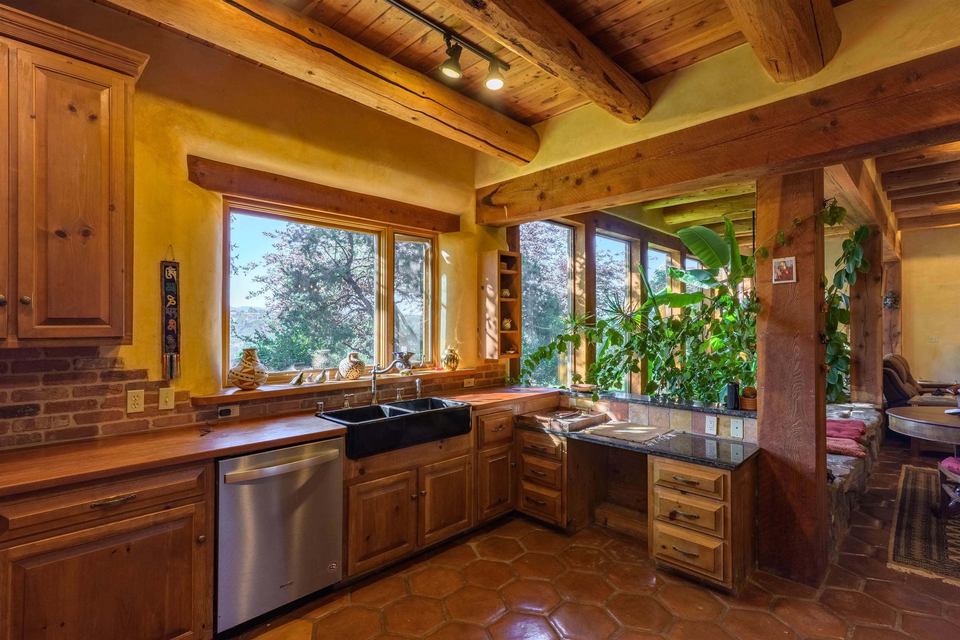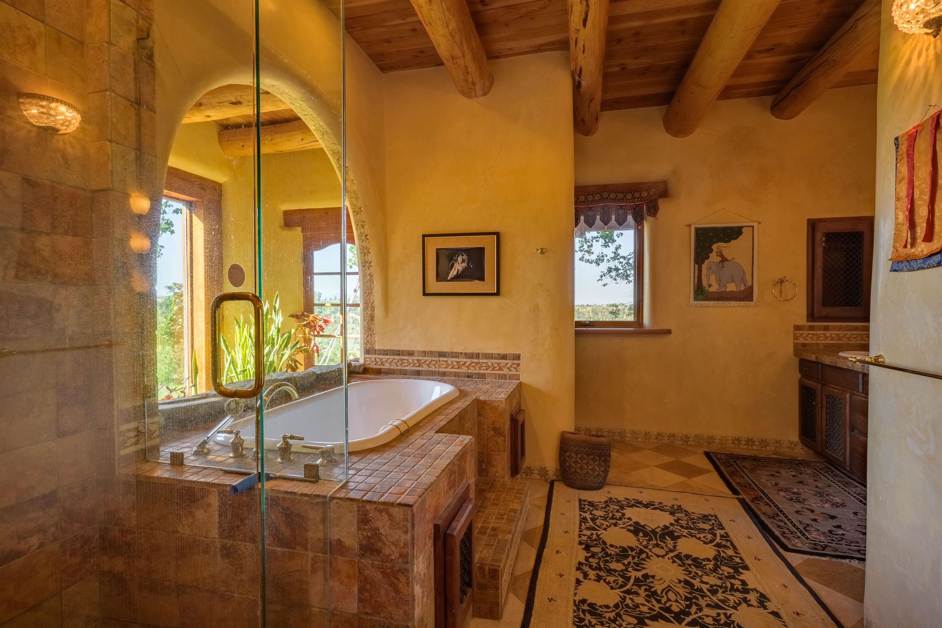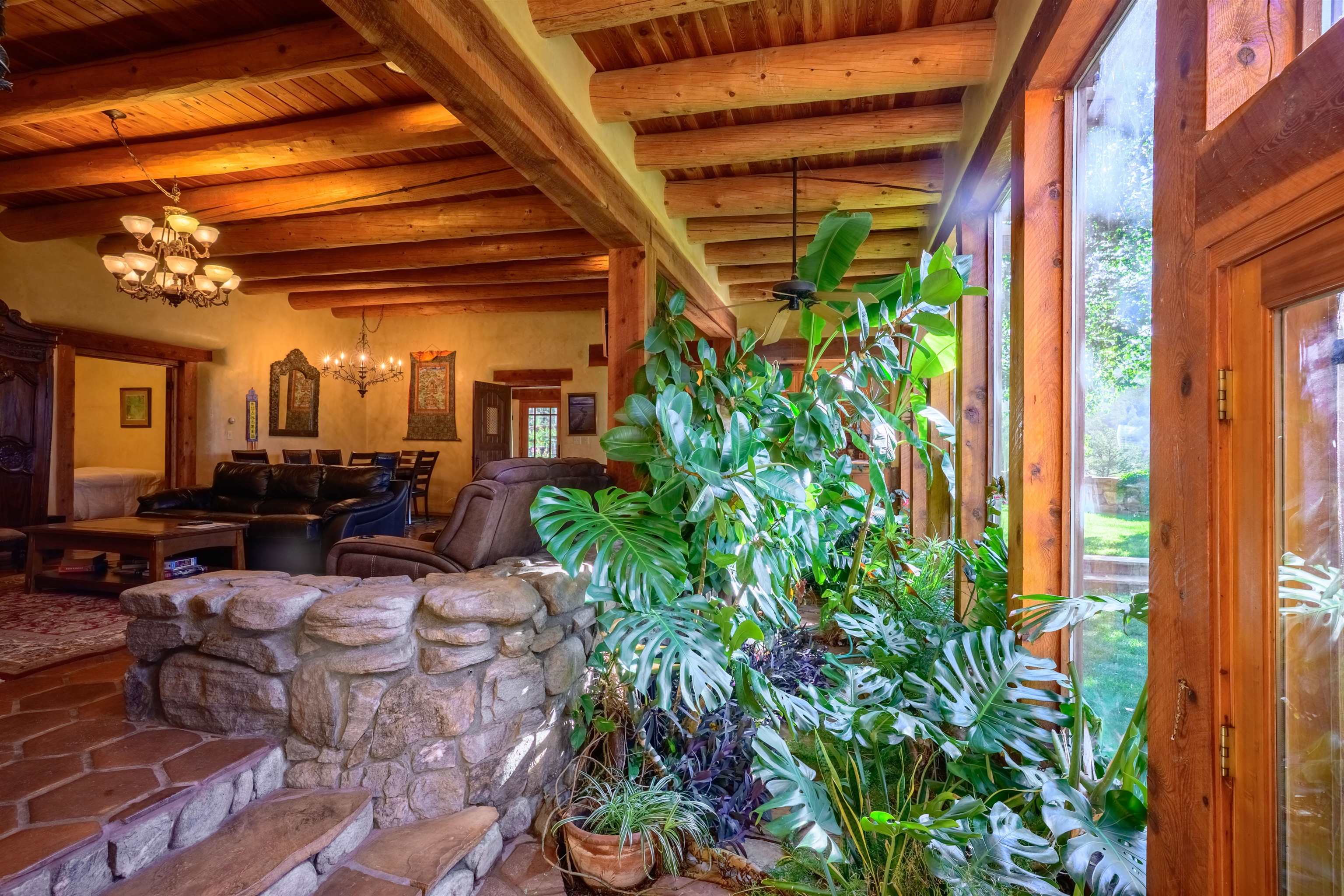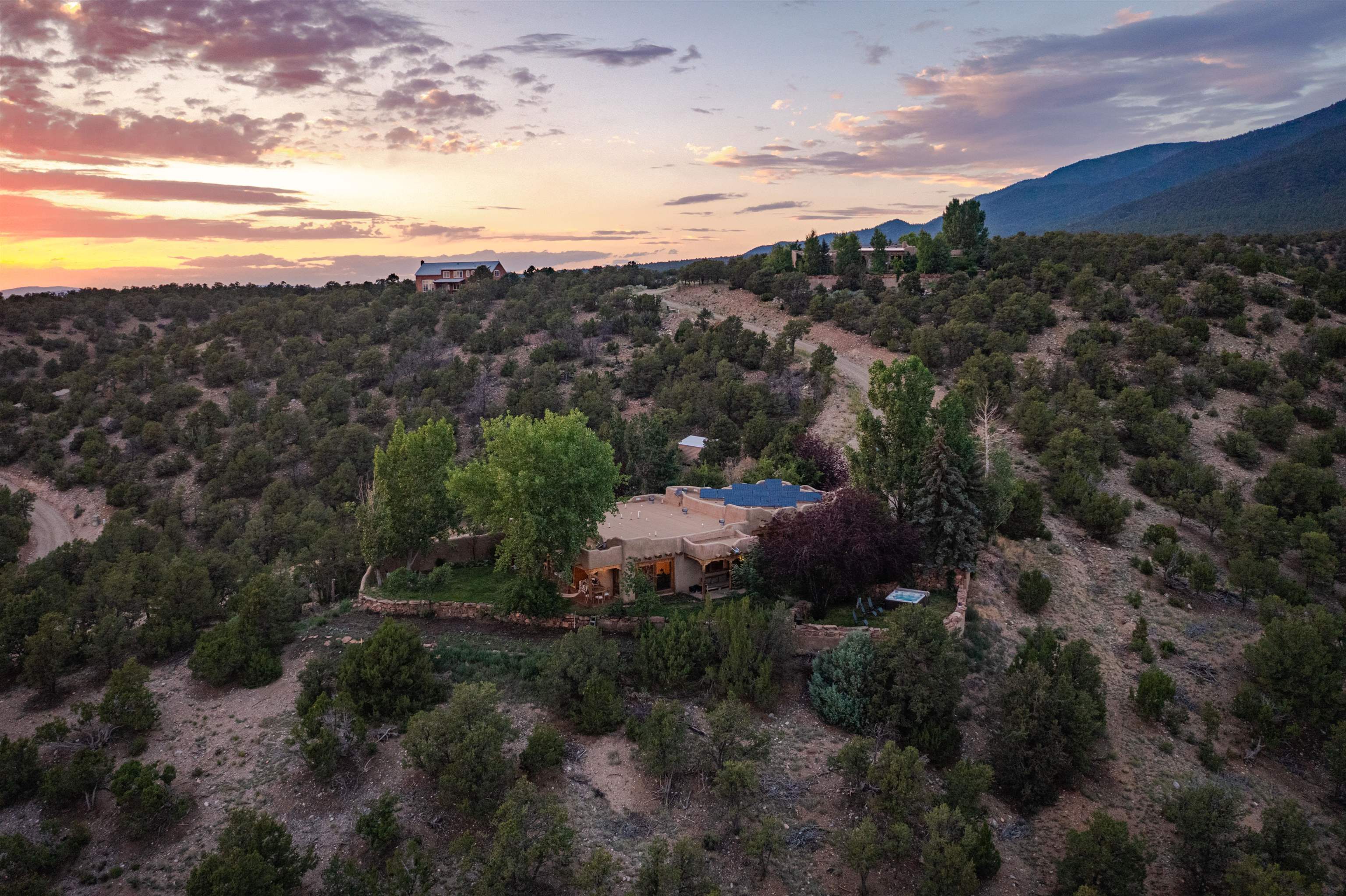 Luxurious & Sustainable High Desert Castle on the Valdez Hillside ~ Welcome to Winsor Castle, 3,300 sqft of pure magnificence pleasantly situated near Taos Ski Valley, just a short distance to Central Taos, with some of the most remarkable views in New Mexico. This exquisite and overbuilt residence inspired by the Mabel Dodge Luhan House is set on over one acre of lush piñon & juniper forest. To put it bluntly, the entire residence was overbuilt by the current and only owner, to his personal taste. Upon stepping into the solar passive residence powered by a net-metered solar system, you will encounter endless meticulousness amongst several hand-crafted and traditional custom features. High ceilings with impressive 10x10 Douglas fir vigas and tongue-and-groove accents that create an open, airy, and well lit atmosphere, complemented by recessed lighting. Special 6-sided Mexican Saltillo tile floors above radiant heated floors throughout the home, and travertine tile archways evoke a special Southwest feeling. Extending from the kitchen and living room into the primary bedroom you will encounter perhaps the home's most notable feature; a spectacular tropical greenhouse with 16' ceilings, surrounded by hand harvested quartzite grey stone walls. The primary ensuite is a true sanctuary, offering mountain views directly from the soaking tub through the banana trees in the greenhouse. With 4 spacious bedrooms, 2 bathrooms, and generous living areas, this residence offers a unique blend of comfort and eco-consciousness. Emser travertine tile and white marble floors grace the primary bathroom with a steam shower. At the heart of the home is a chef's kitchen with a Viking gas range, featuring stunning 2" teak and marble countertops, a New Orleans brick backsplash and a Tuscany-inspired mosaic behind the flame. As for the impressive R-Value of the home, these 16'' poured pumice-crete walls and double-studded interior walls, ensure complete climate control, along with no sound interruptions room-to-room. Furthermore, the 4'ft thick roof, insulated with blown cellulose bales, significantly enhances energy efficiency, and incredibly low utility bills. Outside, the property is an oasis. Terraced organic vegetable and flower gardens, and a variety of fruit and shade trees like apple and apricot, seasonal perennials such as echinacea, daisies, and sunflowers, all of which create a vibrant landscape, perfectly maintained by an 8-zone Rainbird irrigation system. Classic brick and flagstone portals around the home offer unbelievable views of the Valdez Valley, El Salto cliffs & majestic Taos Mountain, and especially so from the infrared or sauna during evening soaks in the hot tub overlooking these majestic vistas. Beyond the home's many special features, the location and convenience is equally impressive as it provides easy access to outdoor adventures, including hiking, biking, and trout fishing in the Arroyo Hondo River. The quaint village of Arroyo Seco is a mere 3 miles away, and offers delightful restaurants, shops, and entertainment. This luxurious, overbuilt, and truly special residence offers a unique and sustainable lifestyle amidst the unparalleled beauty of Northern New Mexico.