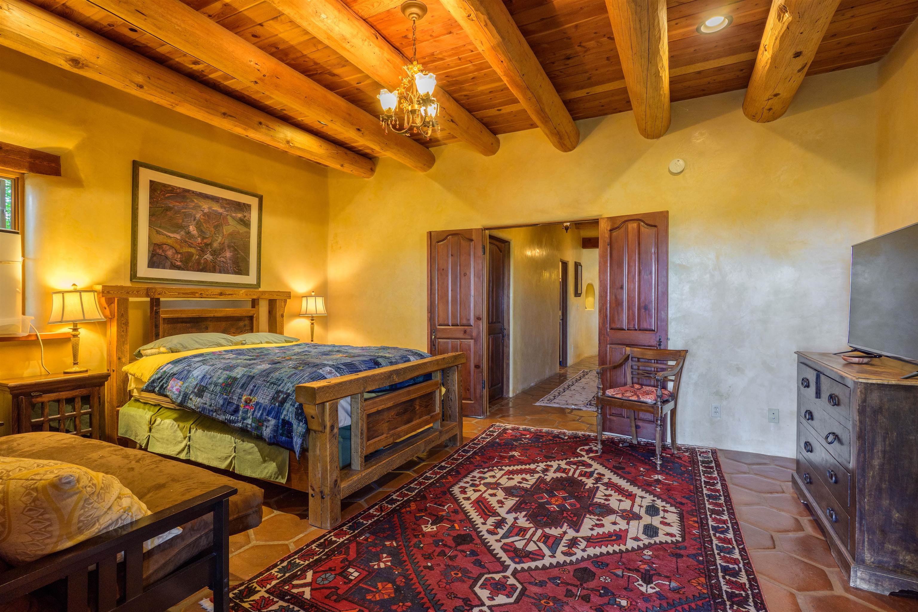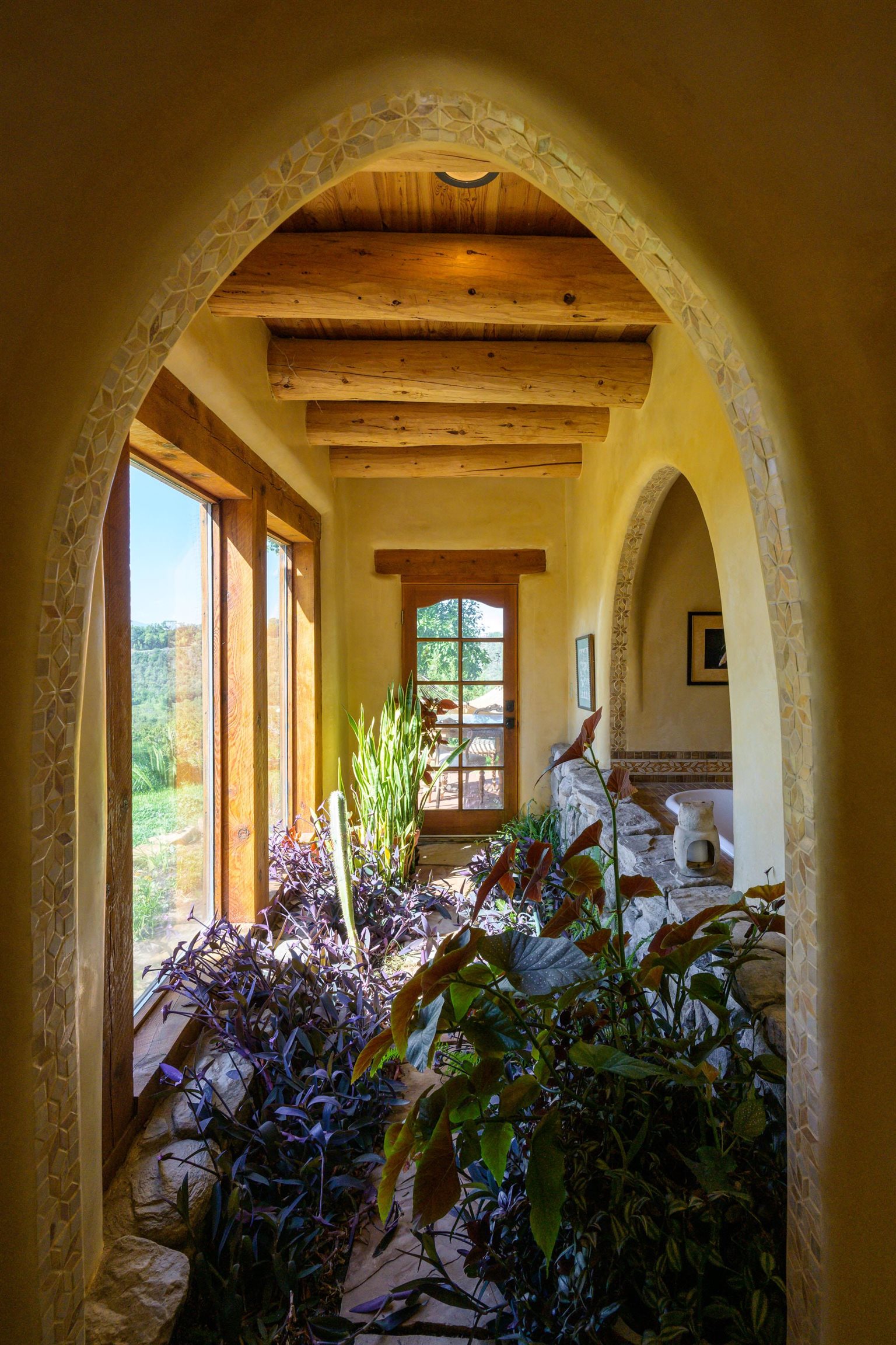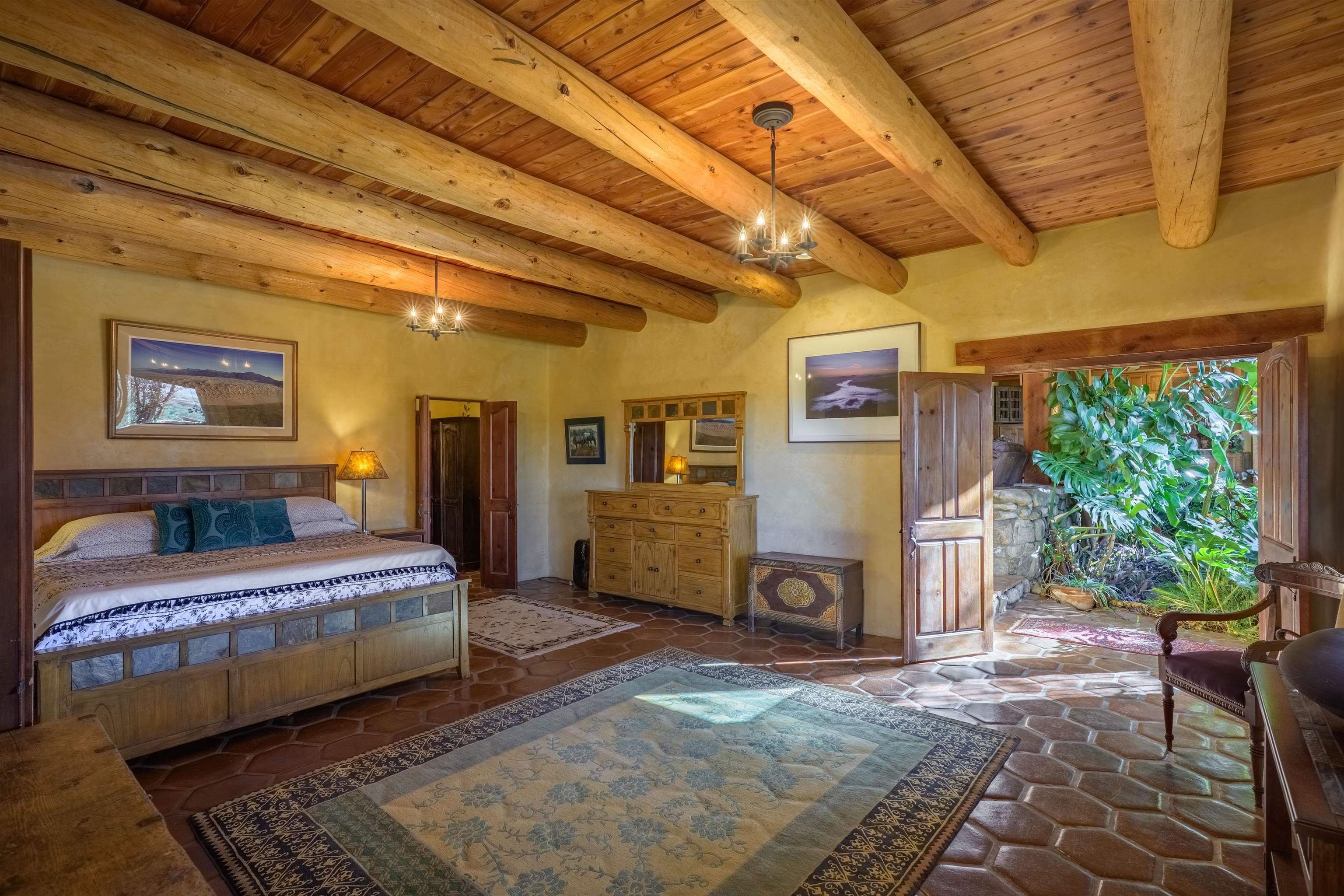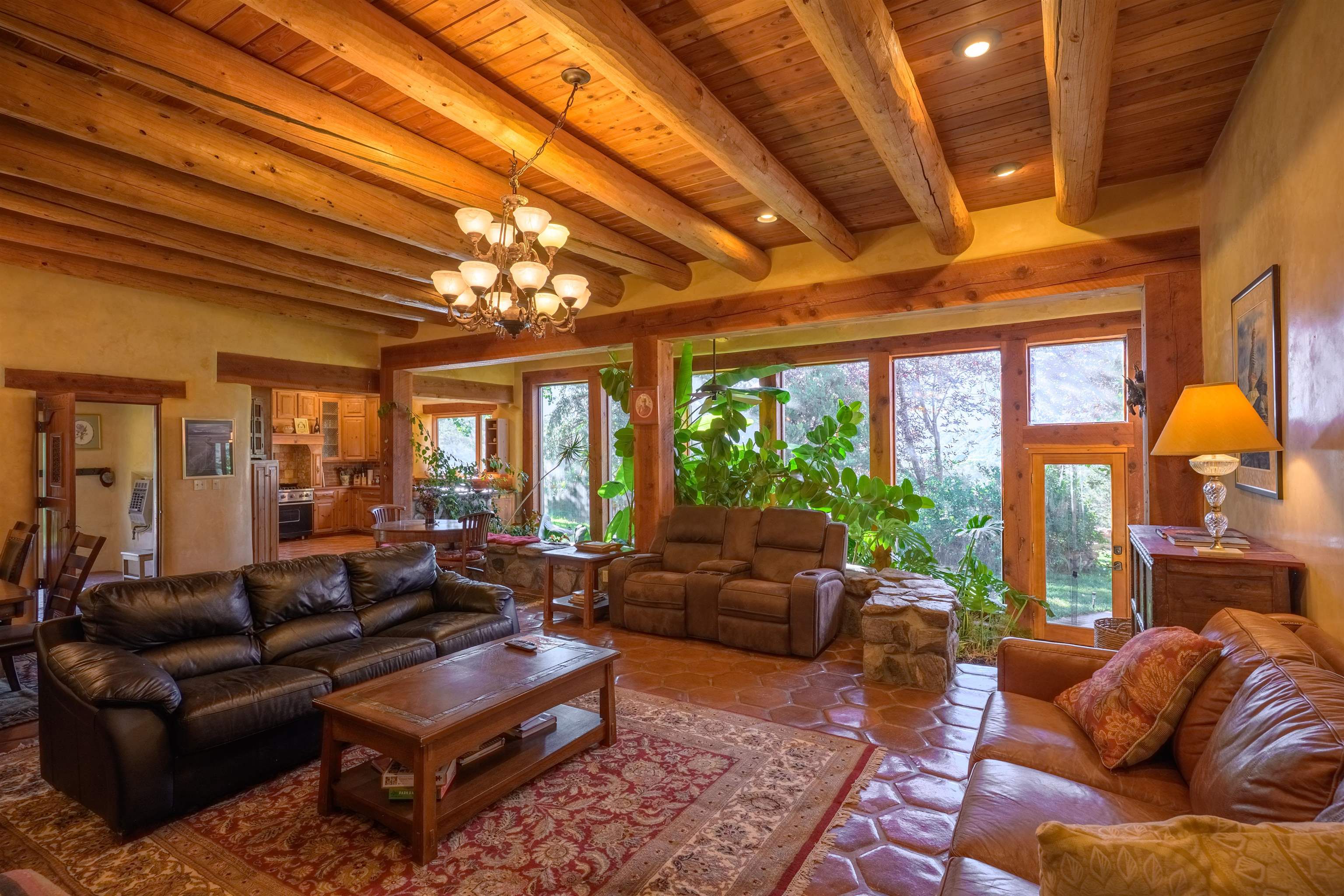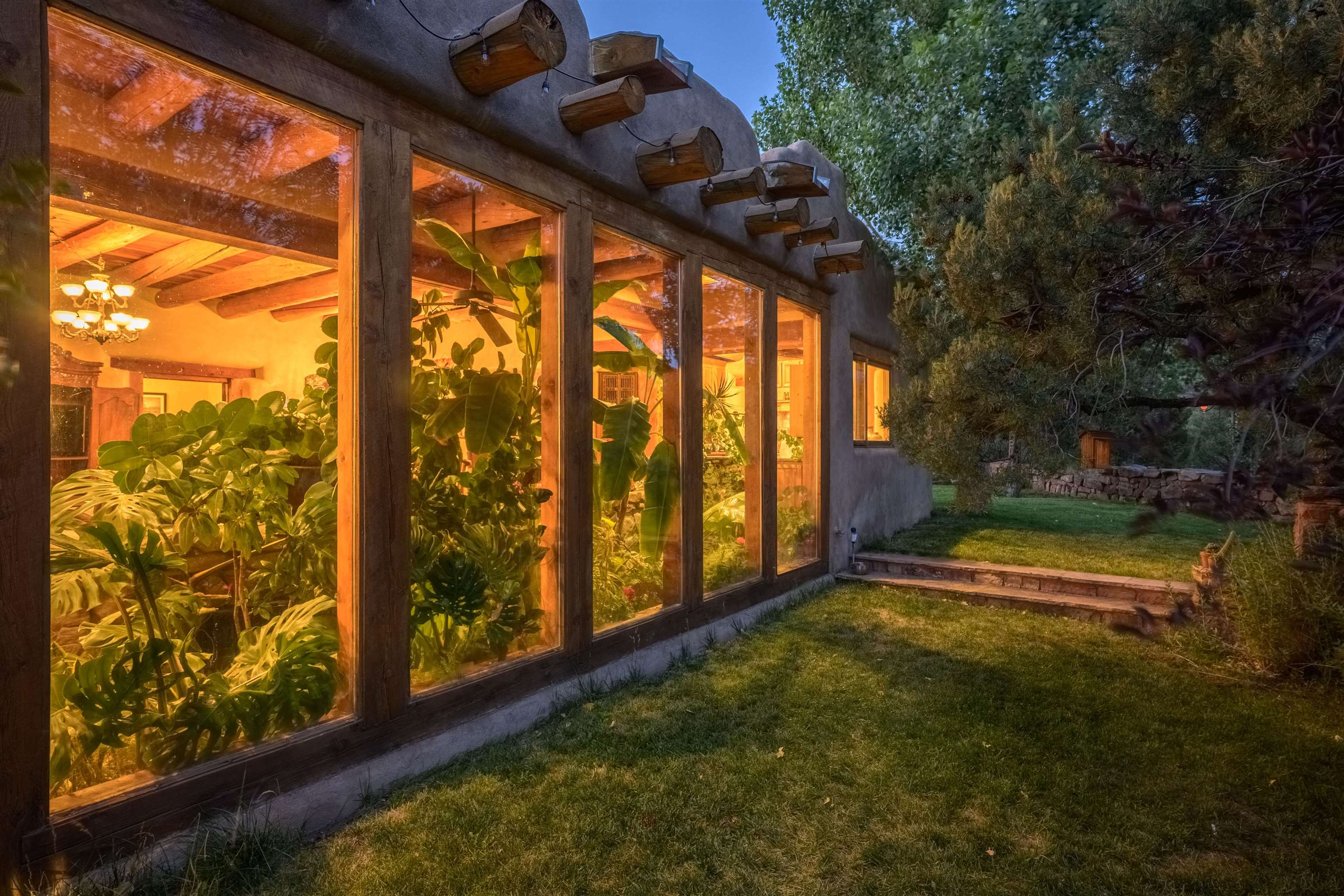 Luxurious & Sustainable High Desert Castle on the Valdez Hillside ~ Welcome to Winsor Castle, 3,300 sqft of pure magnificence pleasantly situated near Taos Ski Valley, just a short distance to Central Taos, with some of the most remarkable views in New Mexico. This exquisite and overbuilt residence inspired by the Mabel Dodge Luhan House is set on over one acre of lush piñon & juniper forest. To put it bluntly, the entire residence was overbuilt by the current and only owner, to his personal taste. Upon stepping into the solar passive residence powered by a net-metered solar system, you will encounter endless meticulousness amongst several hand-crafted and traditional custom features. High ceilings with impressive 10x10 Douglas fir vigas and tongue-and-groove accents that create an open, airy, and well lit atmosphere, complemented by recessed lighting. Special 6-sided Mexican Saltillo tile floors above radiant heated floors throughout the home, and travertine tile archways evoke a special Southwest feeling. Extending from the kitchen and living room into the primary bedroom you will encounter perhaps the home's most notable feature; a spectacular tropical greenhouse with 16' ceilings, surrounded by hand harvested quartzite grey stone walls. The primary ensuite is a true sanctuary, offering mountain views directly from the soaking tub through the banana trees in the greenhouse. With 4 spacious bedrooms, 2 bathrooms, and generous living areas, this residence offers a unique blend of comfort and eco-consciousness. Emser travertine tile and white marble floors grace the primary bathroom with a steam shower. At the heart of the home is a chef's kitchen with a Viking gas range, featuring stunning 2" teak and marble countertops, a New Orleans brick backsplash and a Tuscany-inspired mosaic behind the flame. As for the impressive R-Value of the home, these 16'' poured pumice-crete walls and double-studded interior walls, ensure complete climate control, along with no sound interruptions room-to-room. Furthermore, the 4'ft thick roof, insulated with blown cellulose bales, significantly enhances energy efficiency, and incredibly low utility bills. Outside, the property is an oasis. Terraced organic vegetable and flower gardens, and a variety of fruit and shade trees like apple and apricot, seasonal perennials such as echinacea, daisies, and sunflowers, all of which create a vibrant landscape, perfectly maintained by an 8-zone Rainbird irrigation system. Classic brick and flagstone portals around the home offer unbelievable views of the Valdez Valley, El Salto cliffs & majestic Taos Mountain, and especially so from the infrared or sauna during evening soaks in the hot tub overlooking these majestic vistas. Beyond the home's many special features, the location and convenience is equally impressive as it provides easy access to outdoor adventures, including hiking, biking, and trout fishing in the Arroyo Hondo River. The quaint village of Arroyo Seco is a mere 3 miles away, and offers delightful restaurants, shops, and entertainment. This luxurious, overbuilt, and truly special residence offers a unique and sustainable lifestyle amidst the unparalleled beauty of Northern New Mexico.