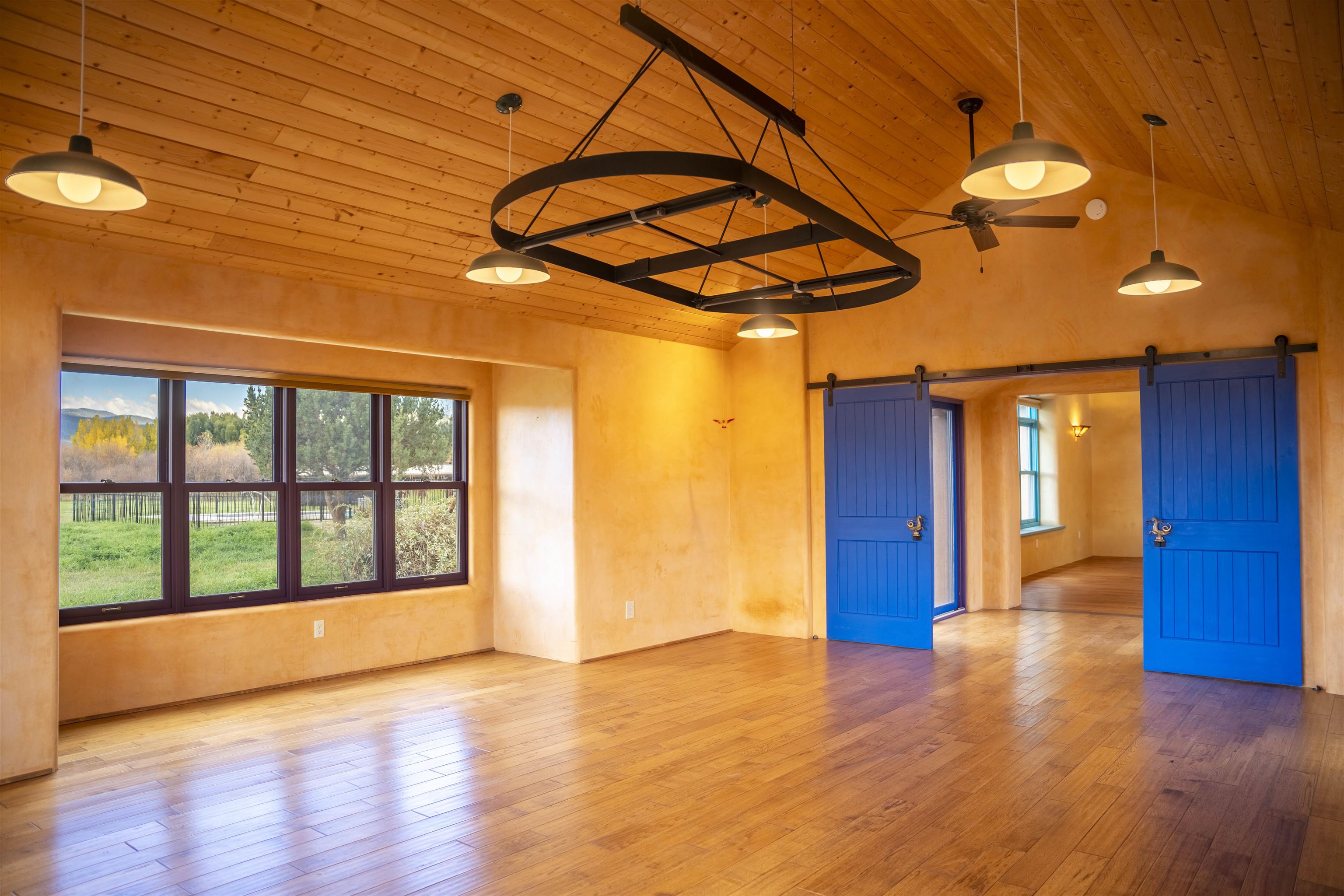 A river runs through it! Just 8 minutes from Taos Plaza, this rare 27+ acre property is both a horse haven and a thriving wildlife sanctuary. The main straw-bale home offers natural comfort year-round, while the guest house provides private space for family or caretakers. The expansive irrigated pastures and wetlands create an unmatched sense of peace and privacy. Equestrian facilities include a 4-horse barn, multiple loafing sheds, and ample grazing areas. When it's time to unwind, swim year-round in the heated lap pool surrounded by nature and mountain views. Protected by a conservation trust in part, this property offers sustainable living, abundant wildlife, and proximity to everything Taos has to offer — a true New Mexico treasure.