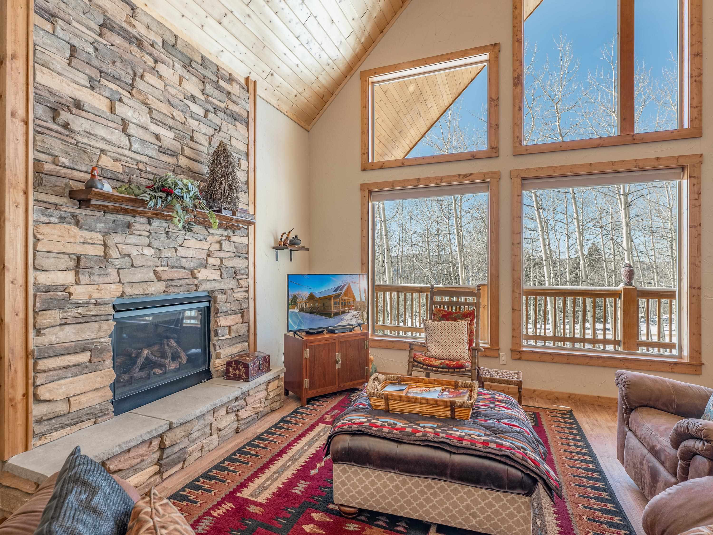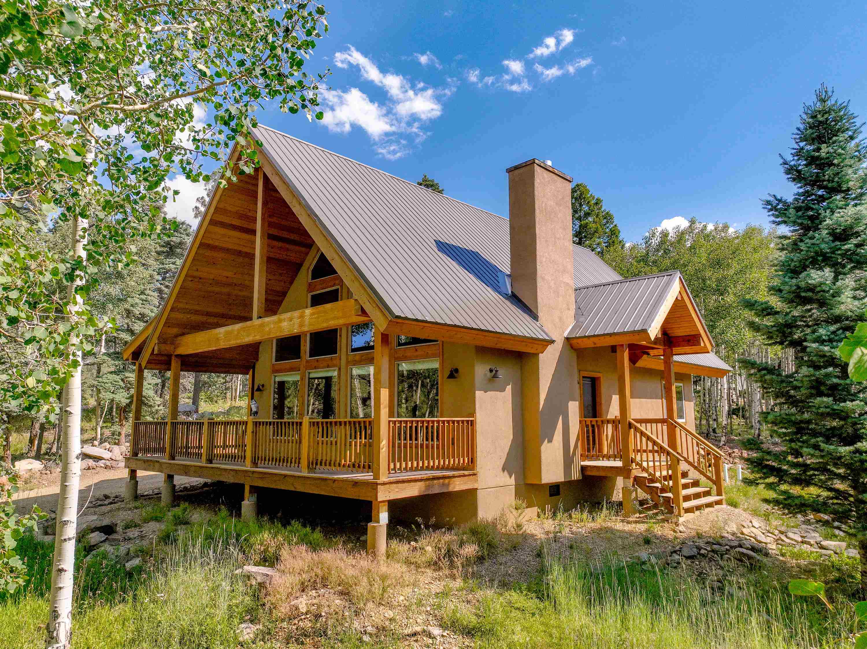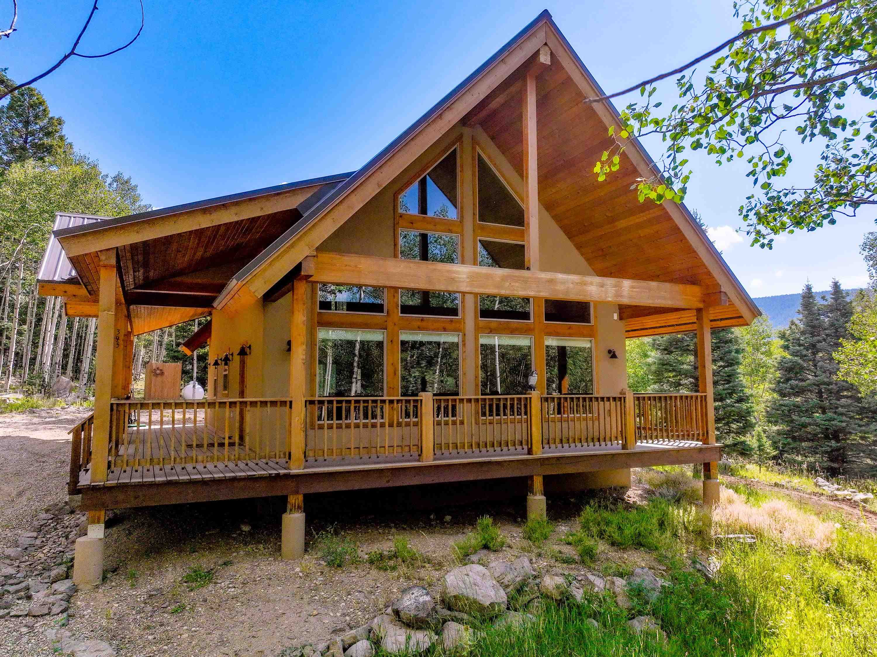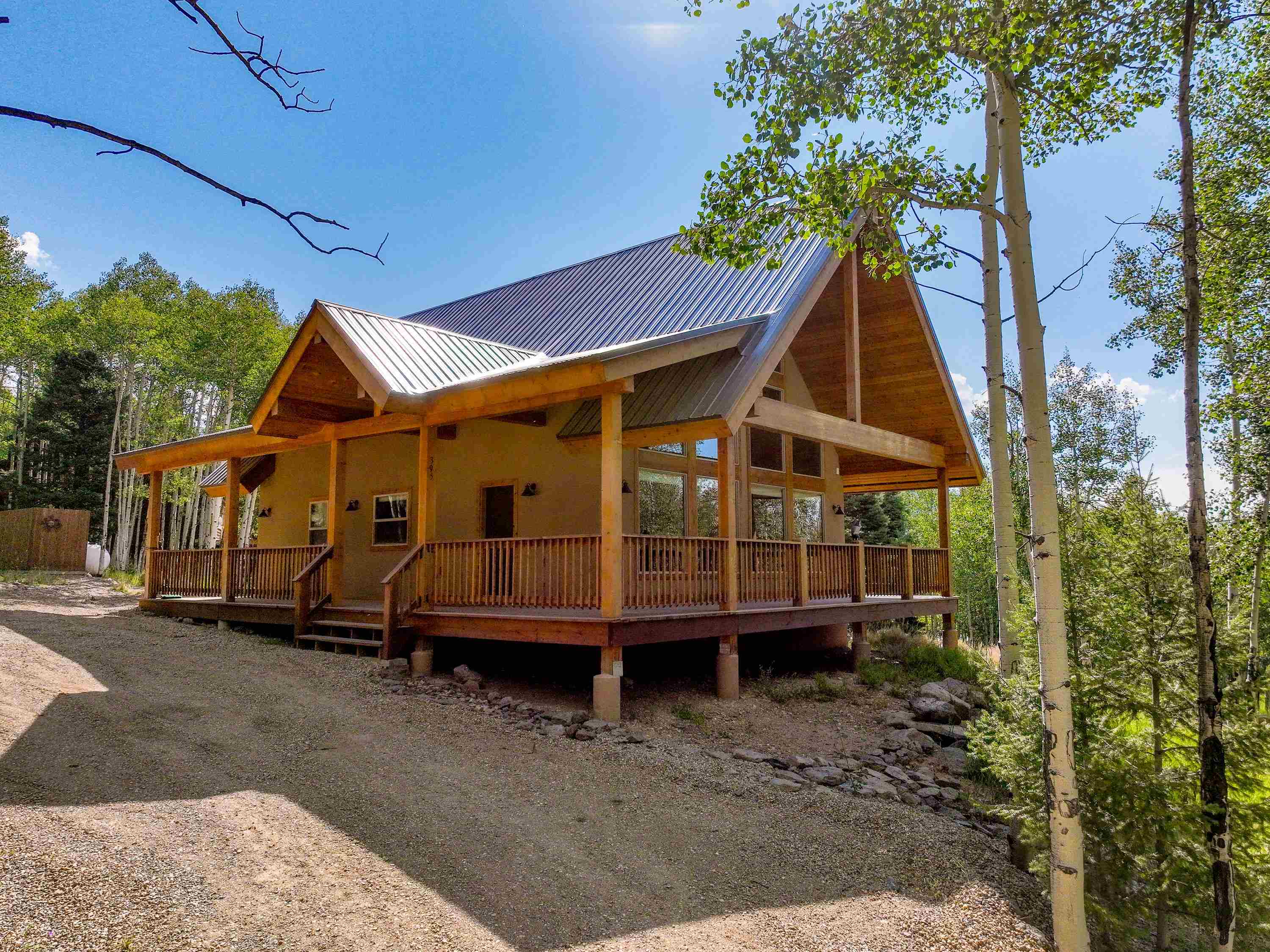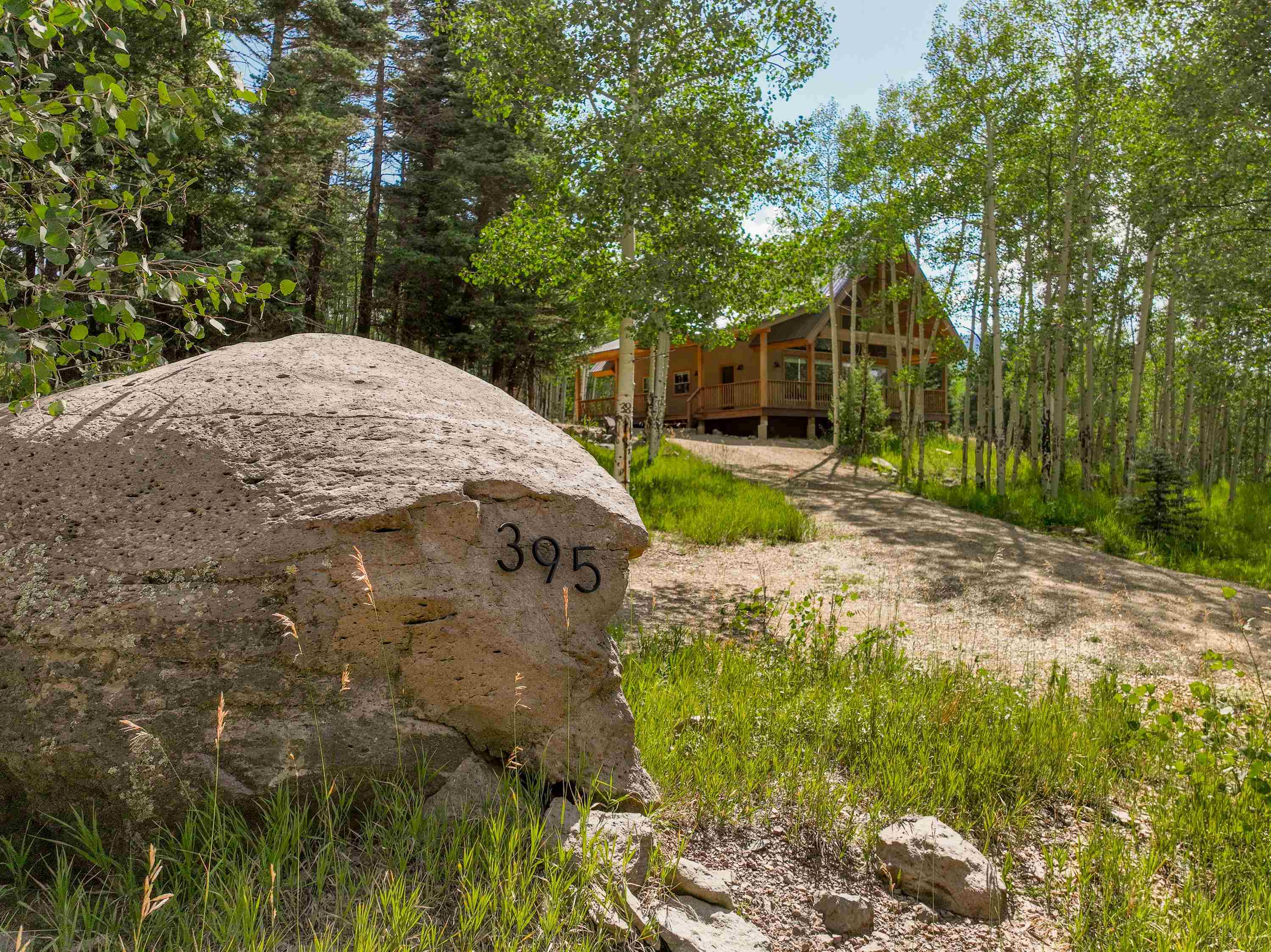 Nestled among a grove of quaking aspens, this charming home is ready to be your haven of tranquility. Built for effortless living, thisrecently completed retreat offers a serene and stylish escape with modern comforts throughout. Be wowed by breathtaking viewsthrough the expansive window wall from the moment you step inside, and let your worries melt away in the inviting atmosphere of thevaulted ceiling and spacious, open layout. Cozy up by the low-maintenance propane fireplace, prepare meals in the well-appointedkitchen—featuring premium, space-conscious appliances designed for smart and efficient living—while friends and family gather aroundthe large dining table. The main-floor primary suite features a lovely walk-in shower and a rustic vanity in the ensuite bathroom. If youseek a bit more privacy, the second bedroom is tucked above the living area, offering its own full bathroom and a cozy lofted sitting areaoverlooking the great room and stunning window wall. A roomy laundry area and a convenient half-bath complete the home’s thoughtfulinterior. Enjoy cool summer nights and sunny winter days from the expansive covered deck, and experience mountain adventures just ashort, scenic drive away at Angel Fire Resort. Leave your troubles behind and embrace mountain living at 395 El Camino Real in AngelFire, NM.