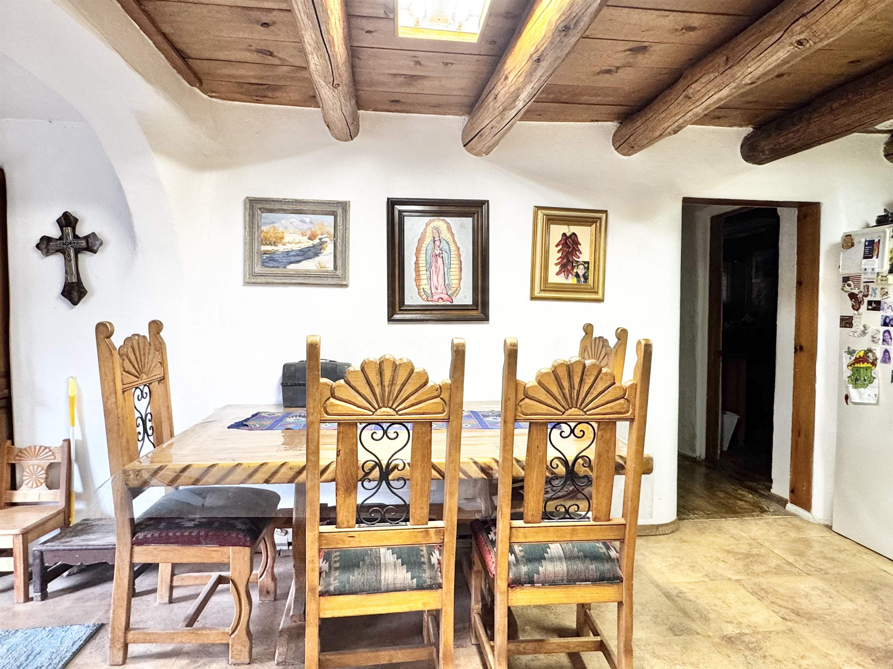 Captivate yourself into the rich history of the Ranchos De Taos and Talpa community. Nestled amidst the expansive ranchlands and abundant farmlands at the foot of Talpa Ridge and the majestic Sange de Cristo Mountain Range, this verdant 1.05-acre property presents an abundance of untapped potential. Conveniently built upon this property is a charming home constructed approximately in 1955, boasting a spacious 2,473-square-foot layout. The lower level, comprising a 598-square-foot, three-bonus room unit, offers a cozy retreat, while the upper level, spanning 1,875 square feet and featuring two bedrooms, provides a more expansive living experience. The home is equipped with two full bathrooms and a well-appointed kitchen, complemented by two inviting living rooms. Throughout the house, a decorative blend of carpet, wood, and laminate tile flooring adds a touch of cozy ambiance. Outside the residence, an outdoor covered patio currently as a space to bbq and entertain. You will discover a substantial four-bay garage and workshop, conveniently integrated with an attached studio that includes a bathroom, living space, and compact kitchenette. At the northern end of the workshop, a spacious one-car carport further enhances the property’s functionality. This property possesses immense potential for the discerning owner who seeks to create a truly viable living experience. Invite yourself to explore the allure of this property and discover the captivating possibilities that await you.