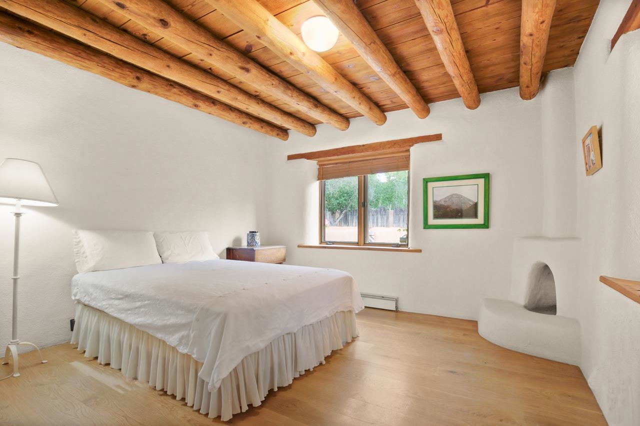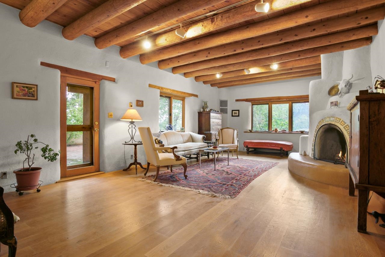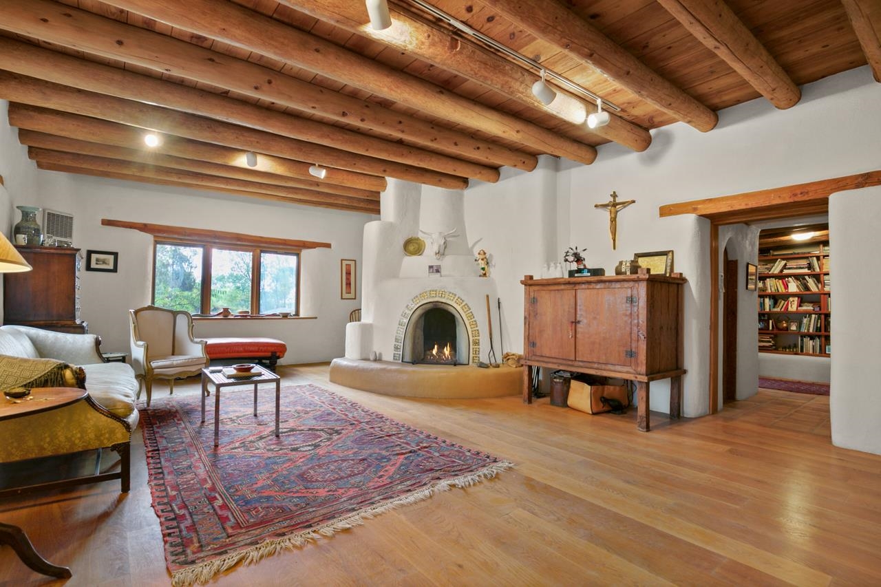 Privately set on 5.33 irrigated acres at the south end of Taos, this rare over-100-year-old, double-thick adobe estate offers enduring craftsmanship, warmth, and authenticity that cannot be replicated. Originally built in 1928, the substantial adobe walls provide exceptional insulation, quiet, and structural presence—hallmarks of true historic Taos construction. The home features seven traditional kiva fireplaces, creating warmth, character, and ambiance throughout multiple living spaces. A gracious central hallway serves as a gallery-style entrance, ideal for art display, and connects spacious rooms that flow naturally for both everyday living and entertaining. The kitchen, breakfast nook, formal dining room, library, and office provide a flexible and functional layout with room to gather or retreat. With four bedrooms, three with ensuite baths, the home offers comfort and privacy for residents and guests. An attached art studio with a two-car carport adds versatility and presents an excellent opportunity for conversion into a guest casita, creative studio, or private retreat. The expansive acreage and irrigated land create a true compound setting, offering ample room for future improvements such as additional guest structures, gardens, or recreational spaces (subject to approvals). Rich in history, substance, and potential, this distinctive adobe property represents a rare opportunity to own an authentic Taos estate with room to grow.