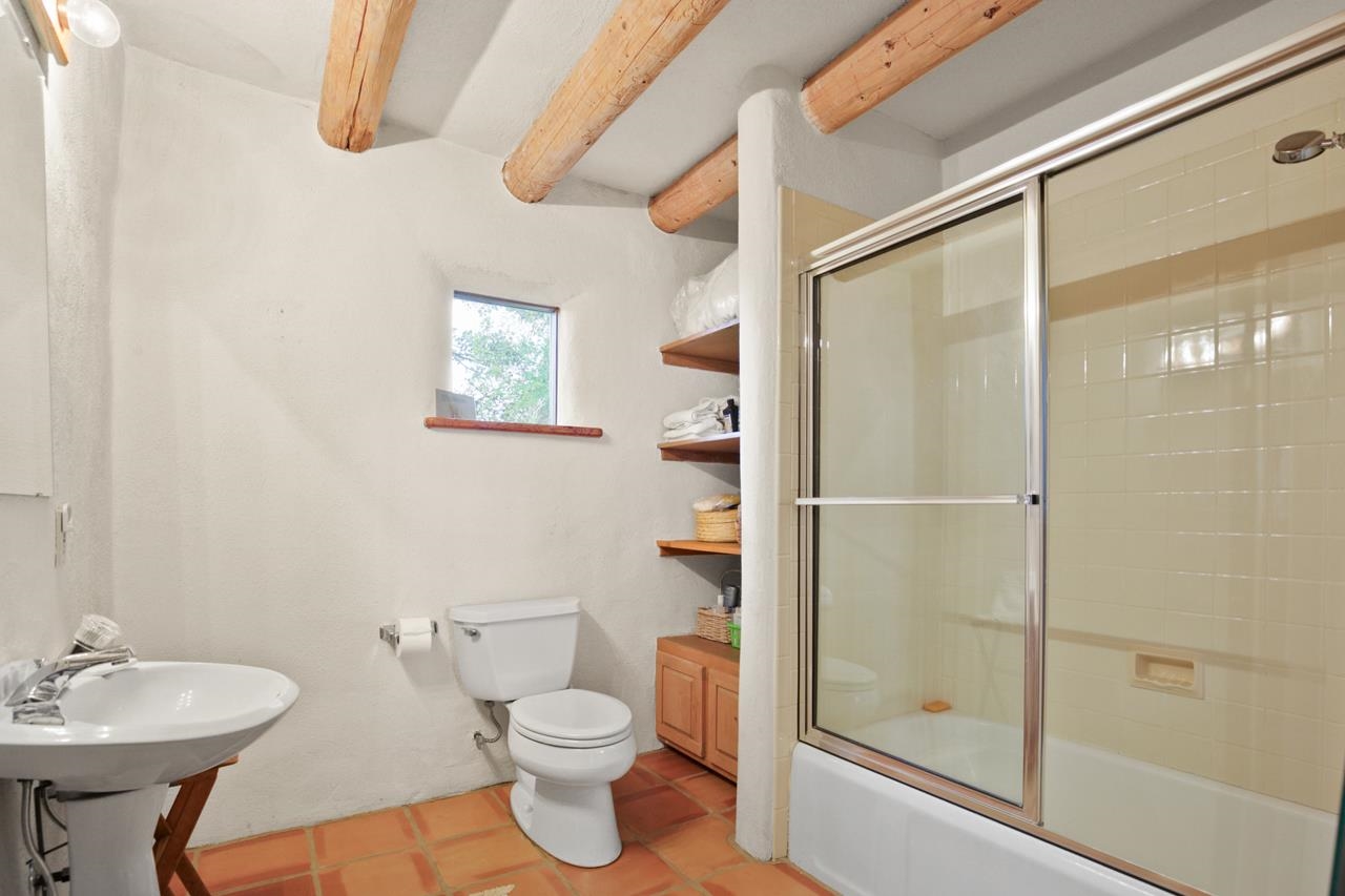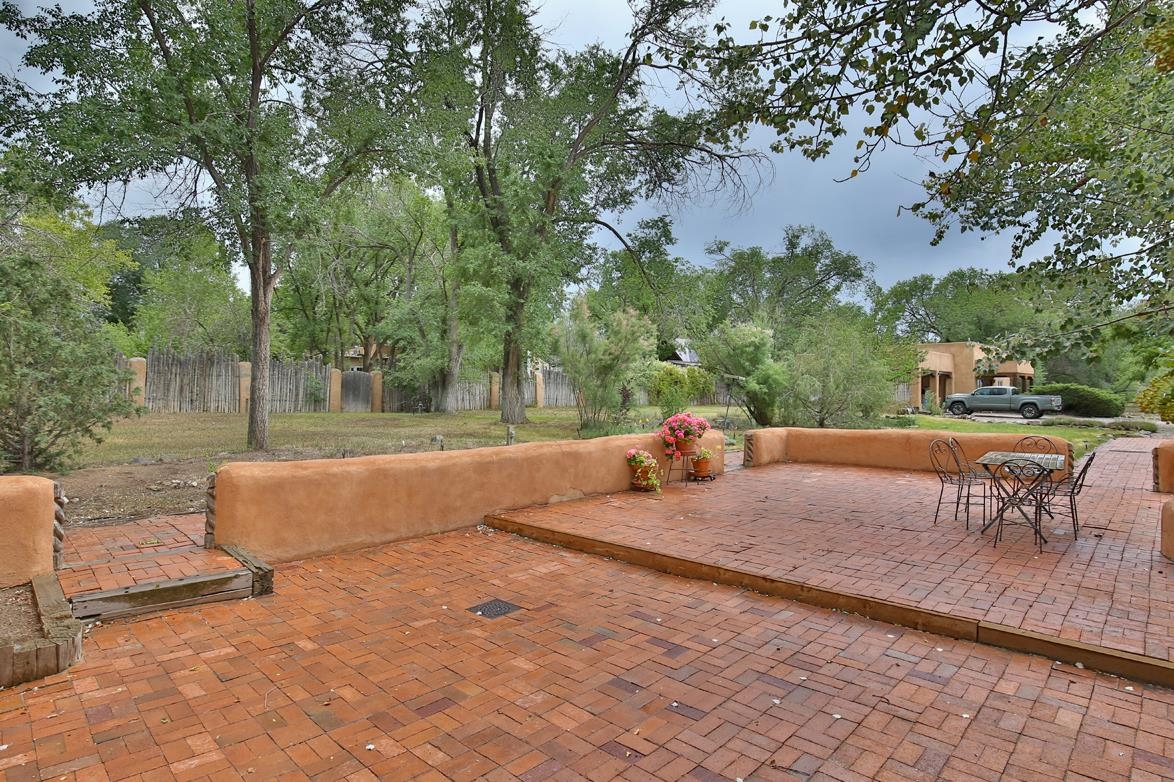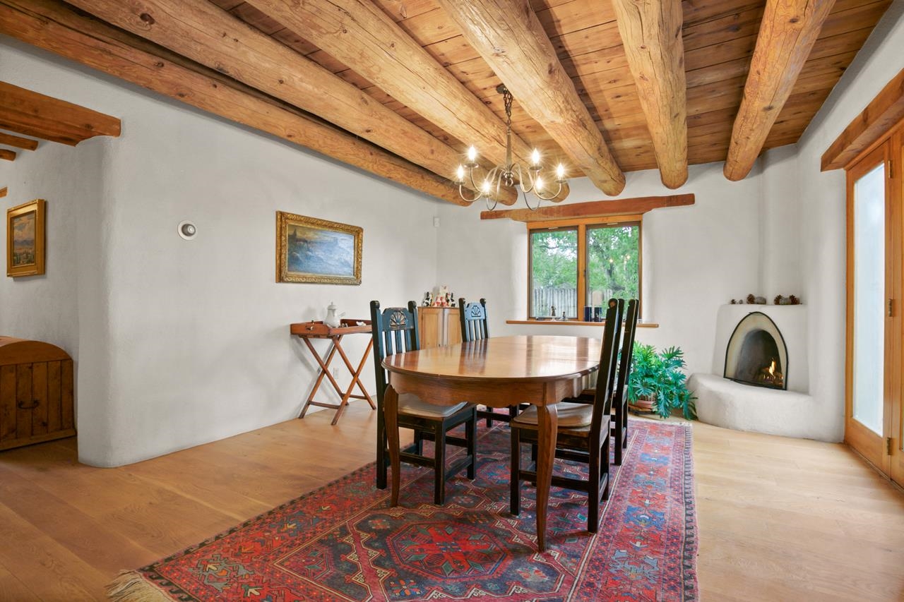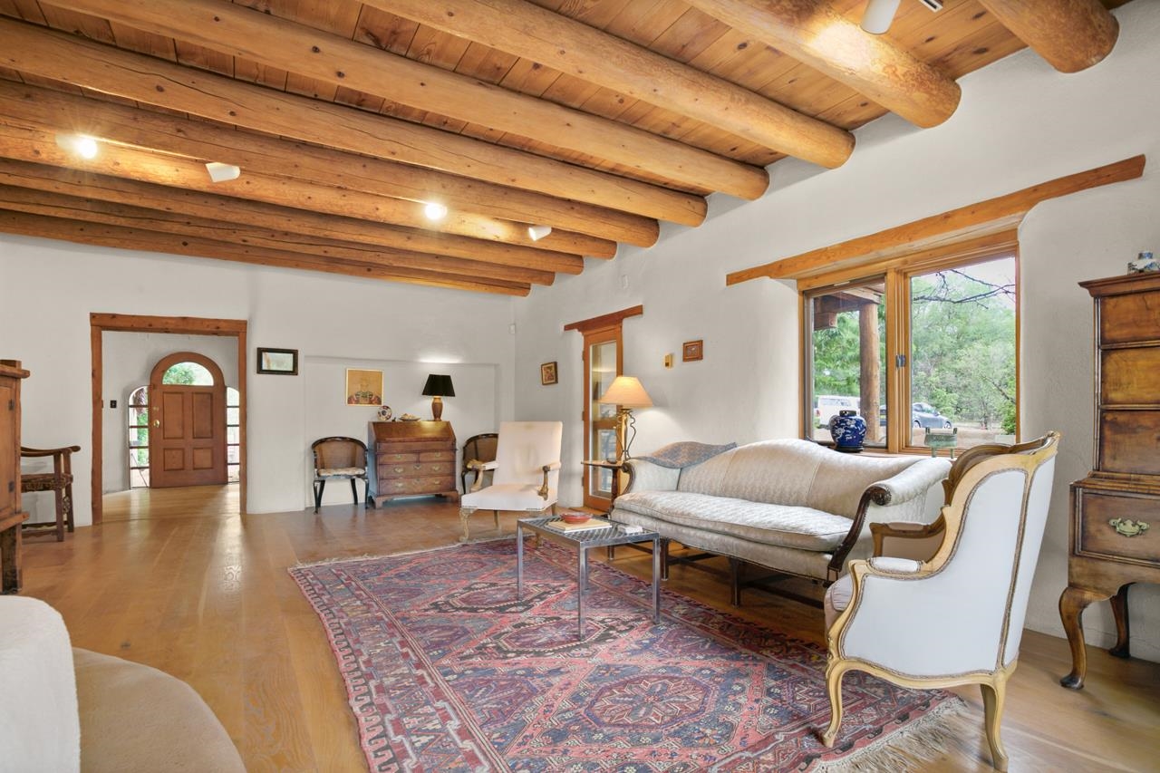 Privately set on 5.33 irrigated acres at the south end of Taos, this rare over-100-year-old, double-thick adobe estate offers enduring craftsmanship, warmth, and authenticity that cannot be replicated. Originally built in 1928, the substantial adobe walls provide exceptional insulation, quiet, and structural presence—hallmarks of true historic Taos construction. The home features seven traditional kiva fireplaces, creating warmth, character, and ambiance throughout multiple living spaces. A gracious central hallway serves as a gallery-style entrance, ideal for art display, and connects spacious rooms that flow naturally for both everyday living and entertaining. The kitchen, breakfast nook, formal dining room, library, and office provide a flexible and functional layout with room to gather or retreat. With four bedrooms, three with ensuite baths, the home offers comfort and privacy for residents and guests. An attached art studio with a two-car carport adds versatility and presents an excellent opportunity for conversion into a guest casita, creative studio, or private retreat. The expansive acreage and irrigated land create a true compound setting, offering ample room for future improvements such as additional guest structures, gardens, or recreational spaces (subject to approvals). Rich in history, substance, and potential, this distinctive adobe property represents a rare opportunity to own an authentic Taos estate with room to grow.
