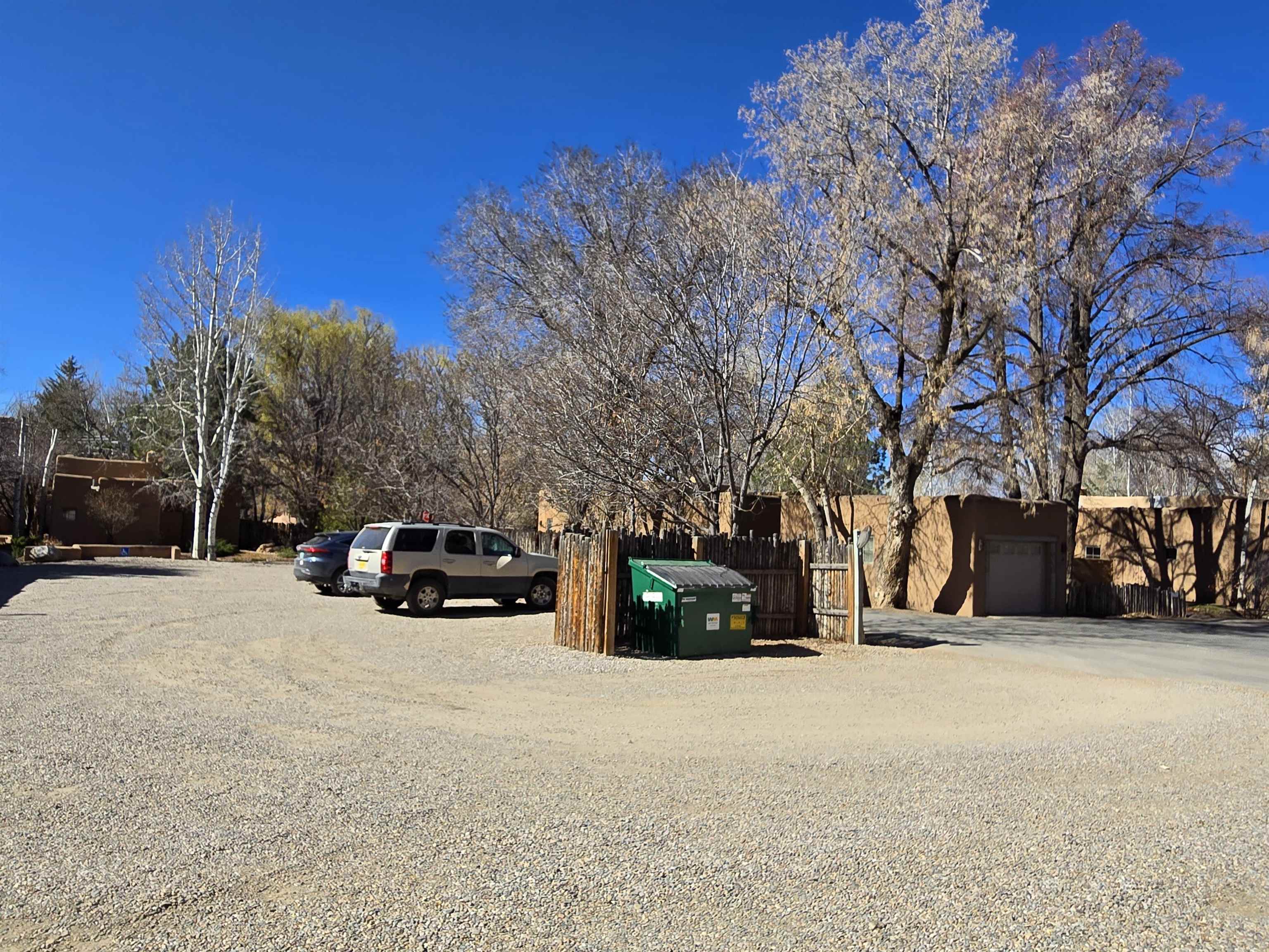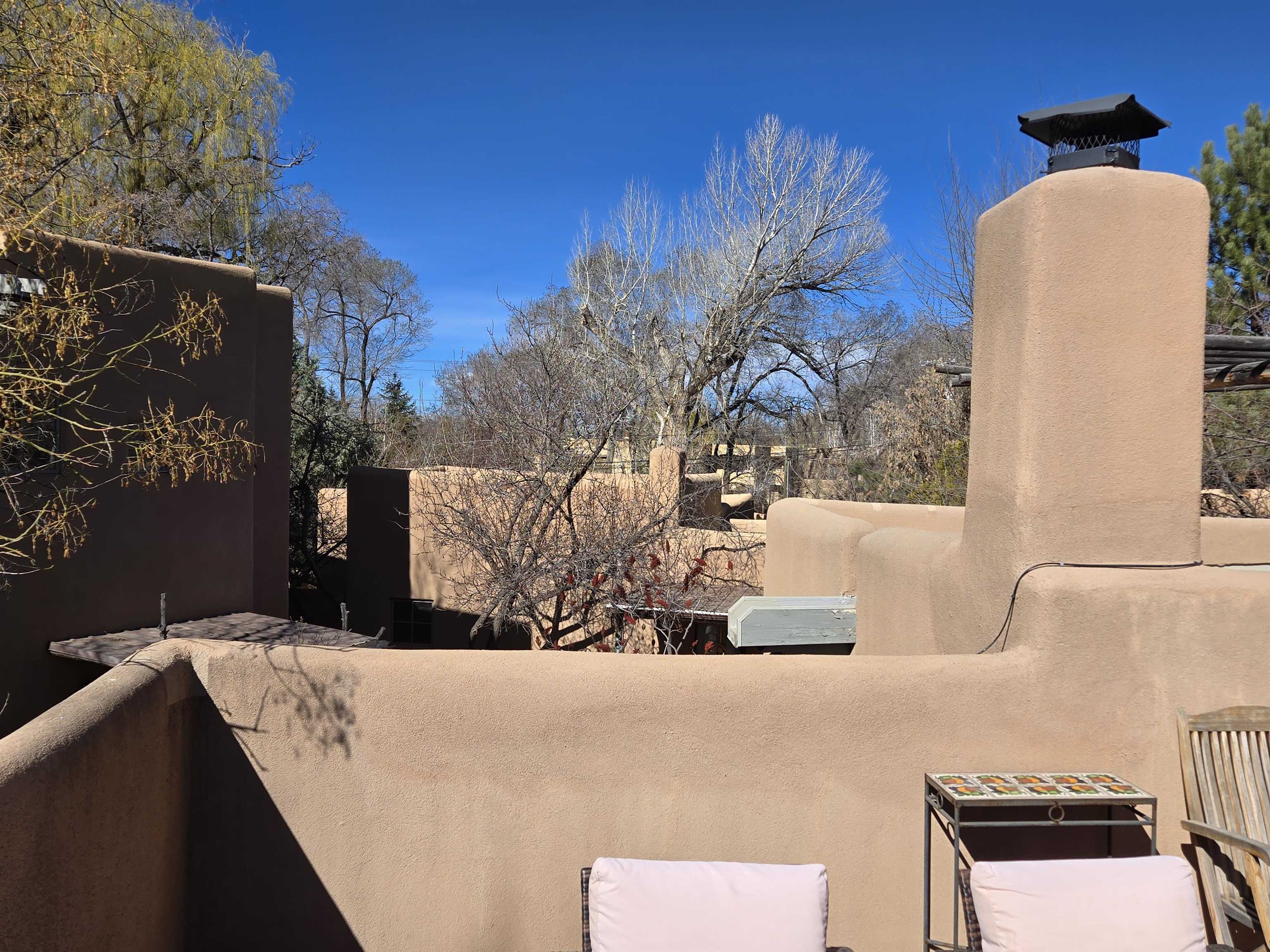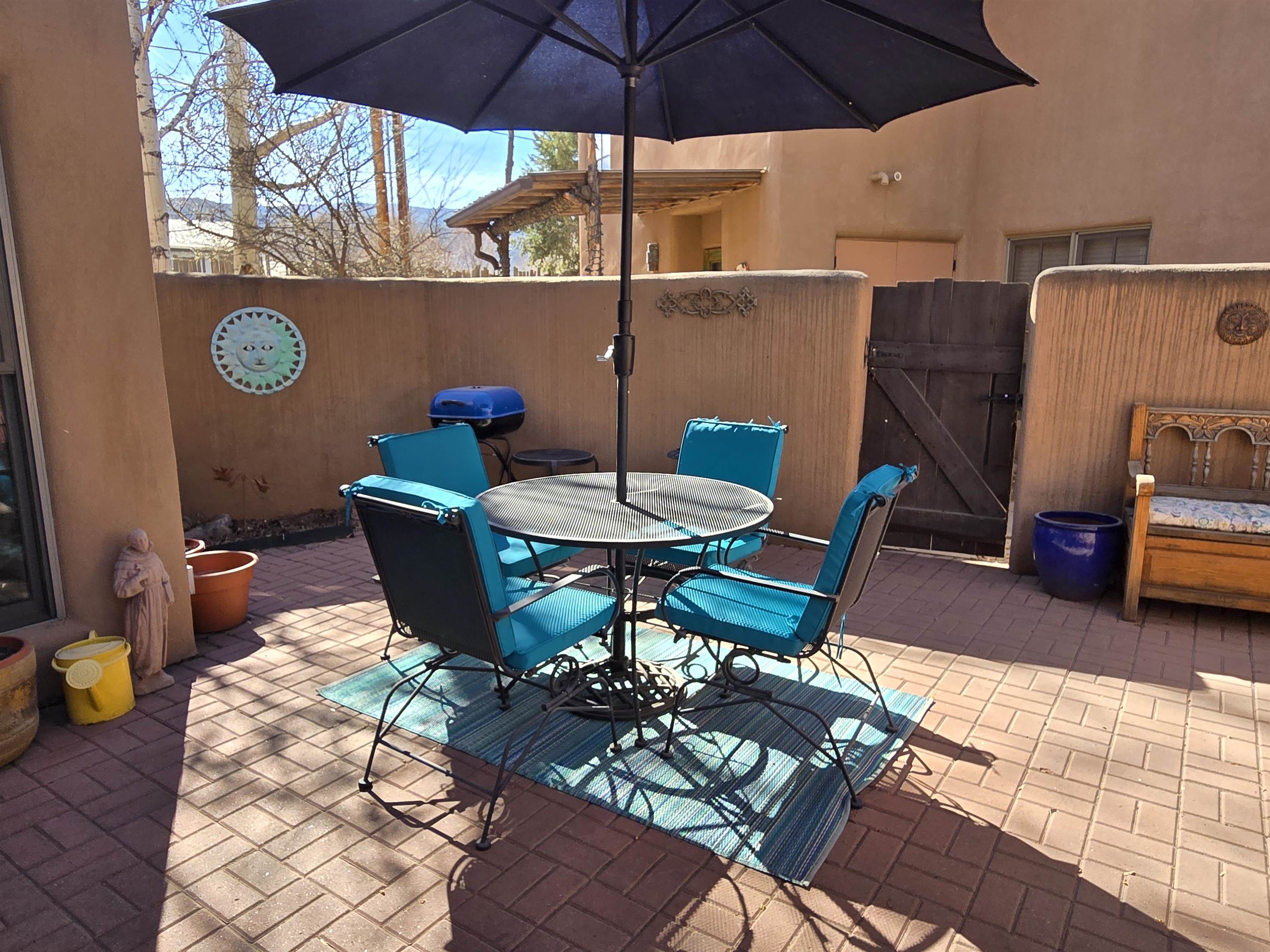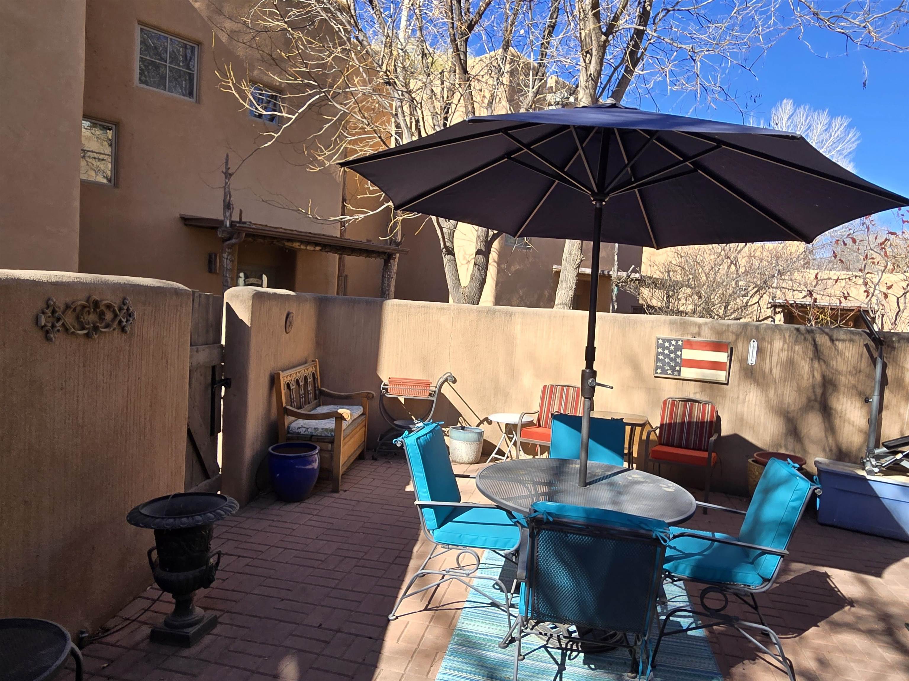 This Kit Carson Road two bedroom two and a half bath condominium location is the place you need to be, within walking distance of dining, shopping, music and galleries downtown in Taos. This quiet compound is home to just nineteen units on a shady street. The two-story condominium has a lovely open floorplan that expands out onto a private courtyard where your potted flowers will glow. Remodeled in 2022, this unit saw top quality upgrades of cabinetry, stainless appliances, new Saltillo tile flooring throughout the ground floor and an on demand water heater for endless showers! Granite countertops sparkle under the two-story skylight. The kitchen supplies ample storage in the rich wood cabinets and island. The owners love to entertain, and the space worked beautifully for many functions throughout the seasons. The large LIVING ROOM is so cozy with handsome vigas, the Pueblo-style gas fireplace and wood frame windows. The warmth of wood flows through the home with pretty raised panel wood doors. Ceiling fans circulate fresh air in handsome fashion. The quality Hunter blinds work seamlessly, opening from top or bottom to control the streaming sunlight or privacy. Large sliding patio doors open out to the private courtyard from the dining room. The main floor also features a BEDROOM / OFFICE with ensuite bath, large closet, a powder room with laundry closet and large under staircase storage area. Upstairs a LARGE PRIMARY BEDROOM is spacious enough to share an art studio area. It features a lovely bath with a large tub, linen cabinets and sunny glass block corner to spread the sky light around. The upper level has its own deck with space for seating overlooking a sunny southern exposure and fresh mountain air. These units do not stay on the market long, so call to request a showing today.