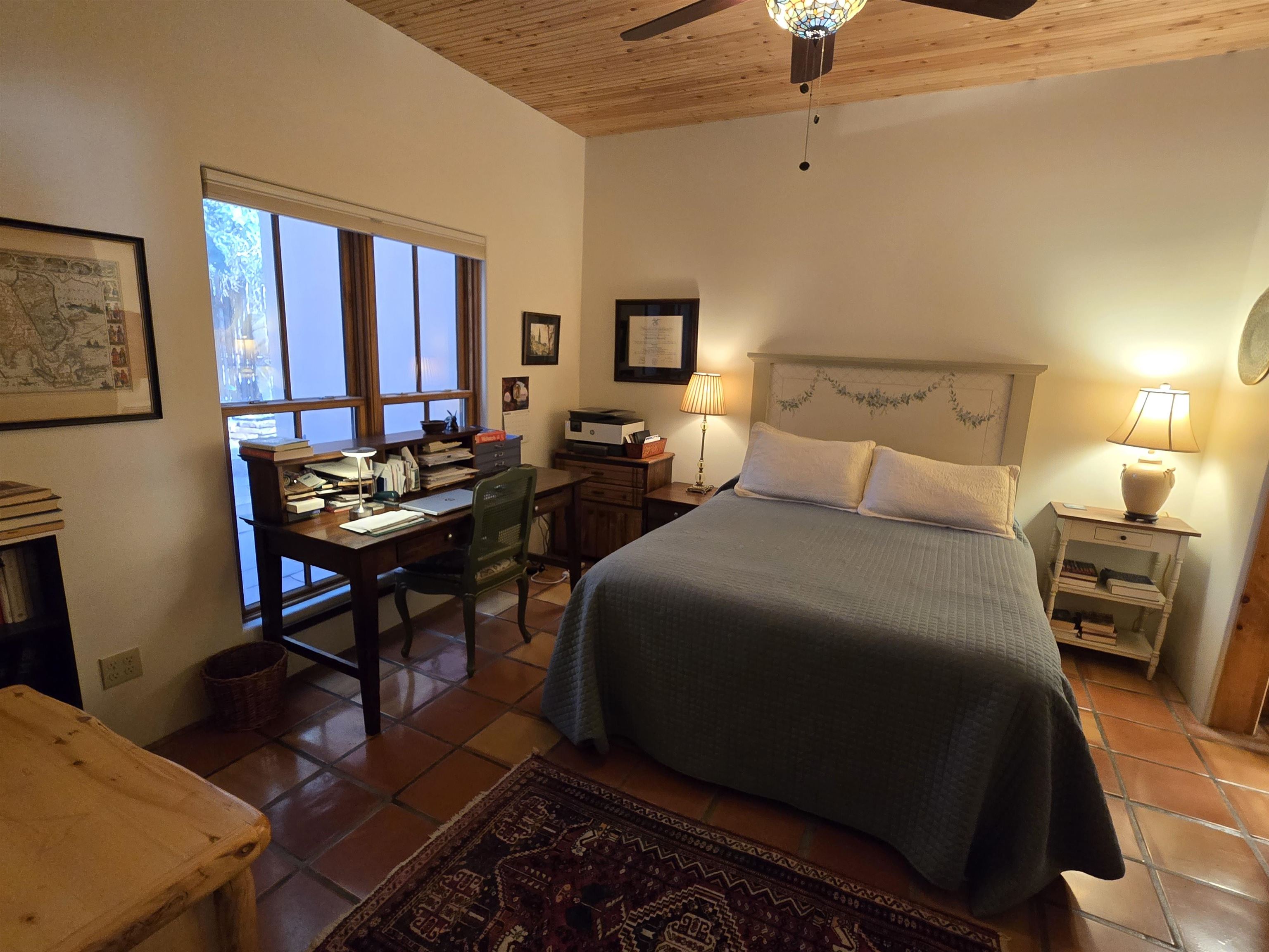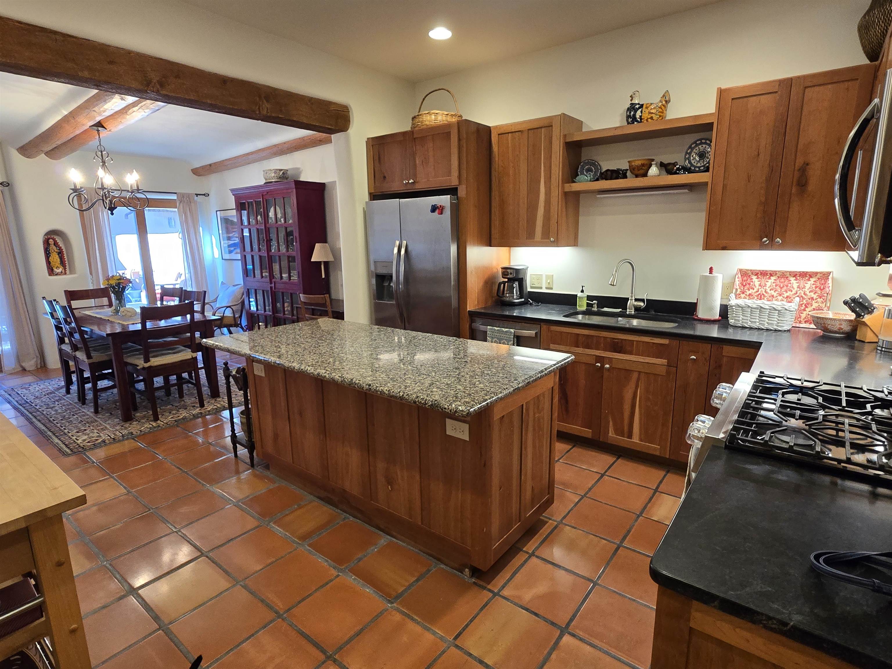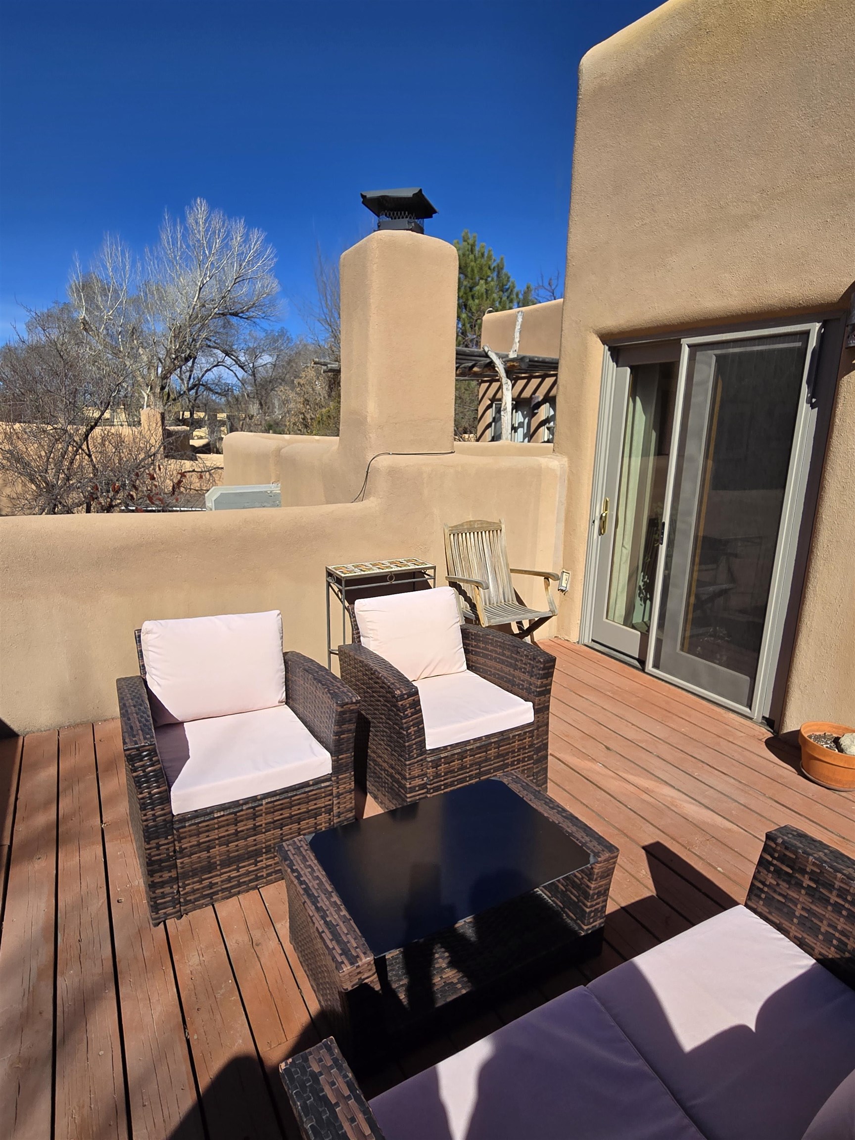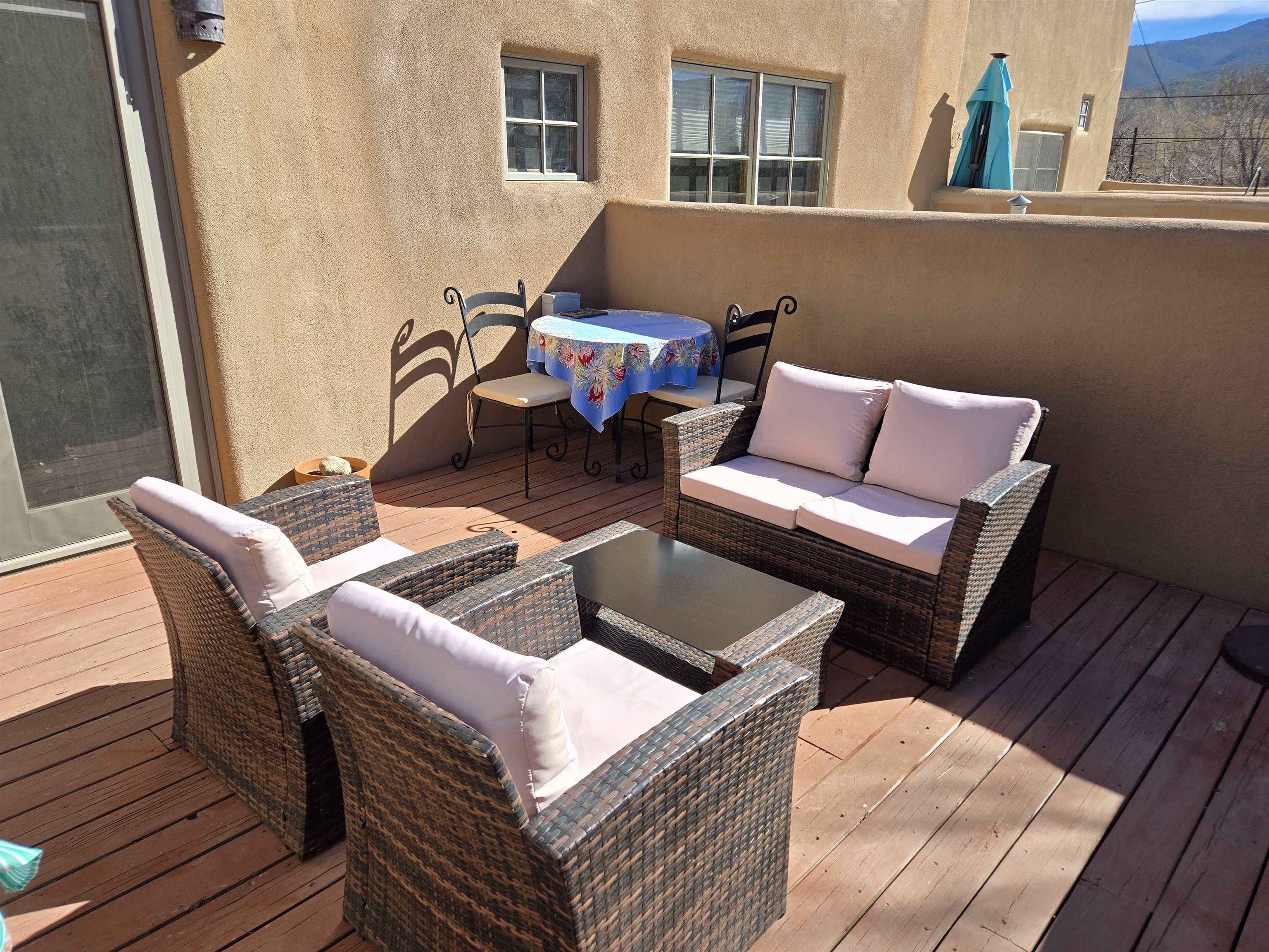 This Kit Carson Road two bedroom two and a half bath condominium location is the place you need to be, within walking distance of dining, shopping, music and galleries downtown in Taos. This quiet compound is home to just nineteen units on a shady street. The two-story condominium has a lovely open floorplan that expands out onto a private courtyard where your potted flowers will glow. Remodeled in 2022, this unit saw top quality upgrades of cabinetry, stainless appliances, new Saltillo tile flooring throughout the ground floor and an on demand water heater for endless showers! Granite countertops sparkle under the two-story skylight. The kitchen supplies ample storage in the rich wood cabinets and island. The owners love to entertain, and the space worked beautifully for many functions throughout the seasons. The large LIVING ROOM is so cozy with handsome vigas, the Pueblo-style gas fireplace and wood frame windows. The warmth of wood flows through the home with pretty raised panel wood doors. Ceiling fans circulate fresh air in handsome fashion. The quality Hunter blinds work seamlessly, opening from top or bottom to control the streaming sunlight or privacy. Large sliding patio doors open out to the private courtyard from the dining room. The main floor also features a BEDROOM / OFFICE with ensuite bath, large closet, a powder room with laundry closet and large under staircase storage area. Upstairs a LARGE PRIMARY BEDROOM is spacious enough to share an art studio area. It features a lovely bath with a large tub, linen cabinets and sunny glass block corner to spread the sky light around. The upper level has its own deck with space for seating overlooking a sunny southern exposure and fresh mountain air. These units do not stay on the market long, so call to request a showing today.