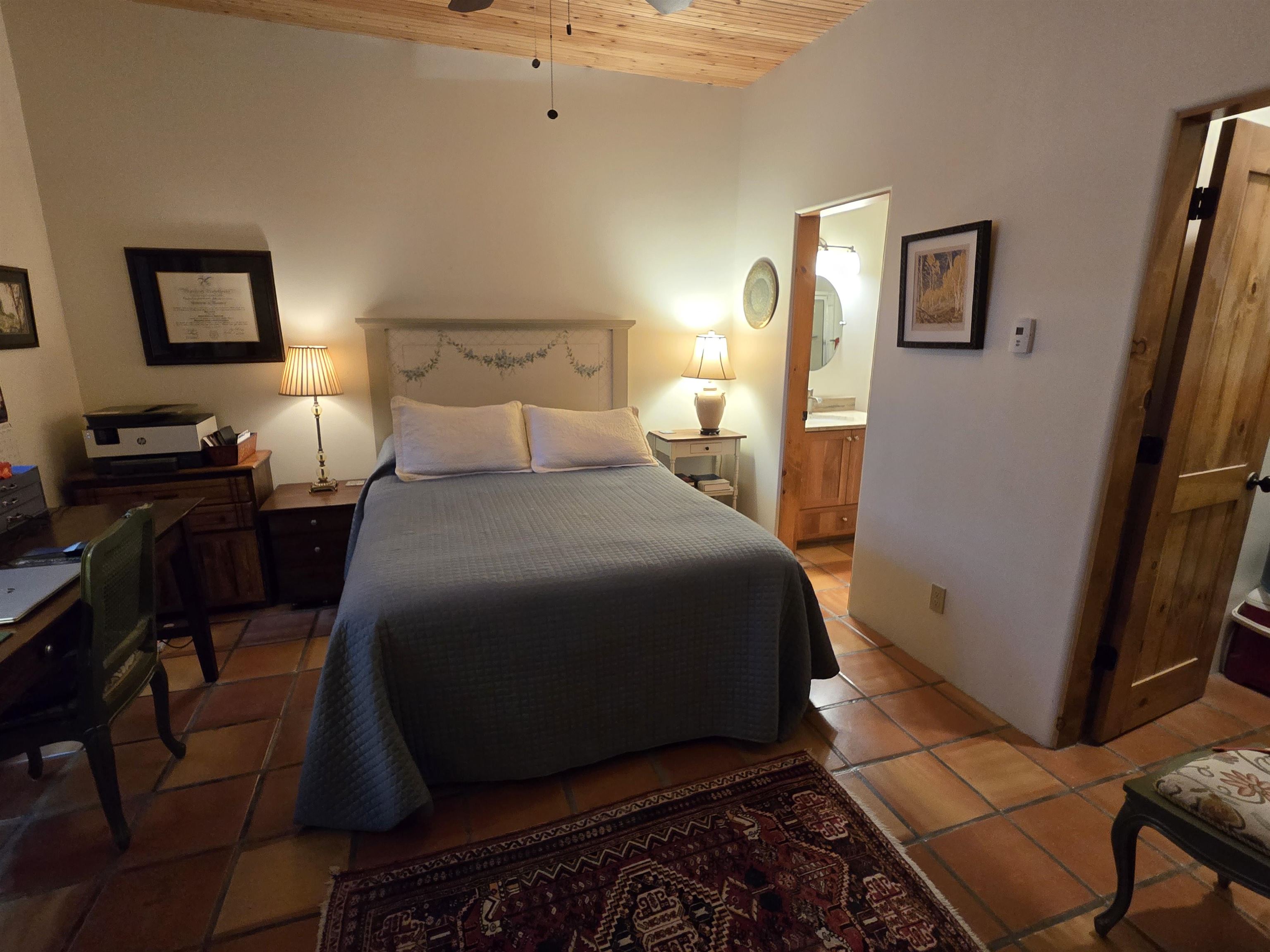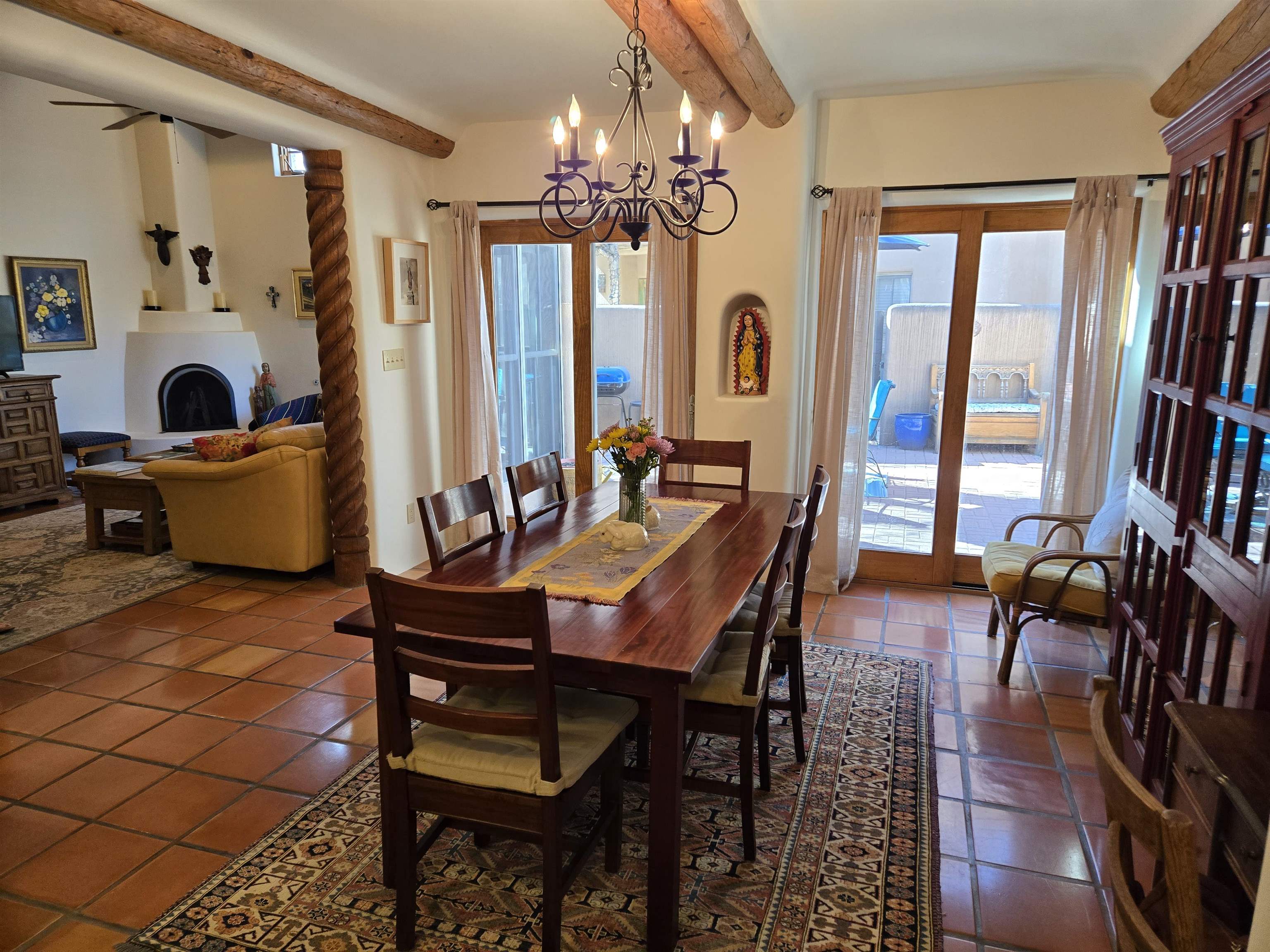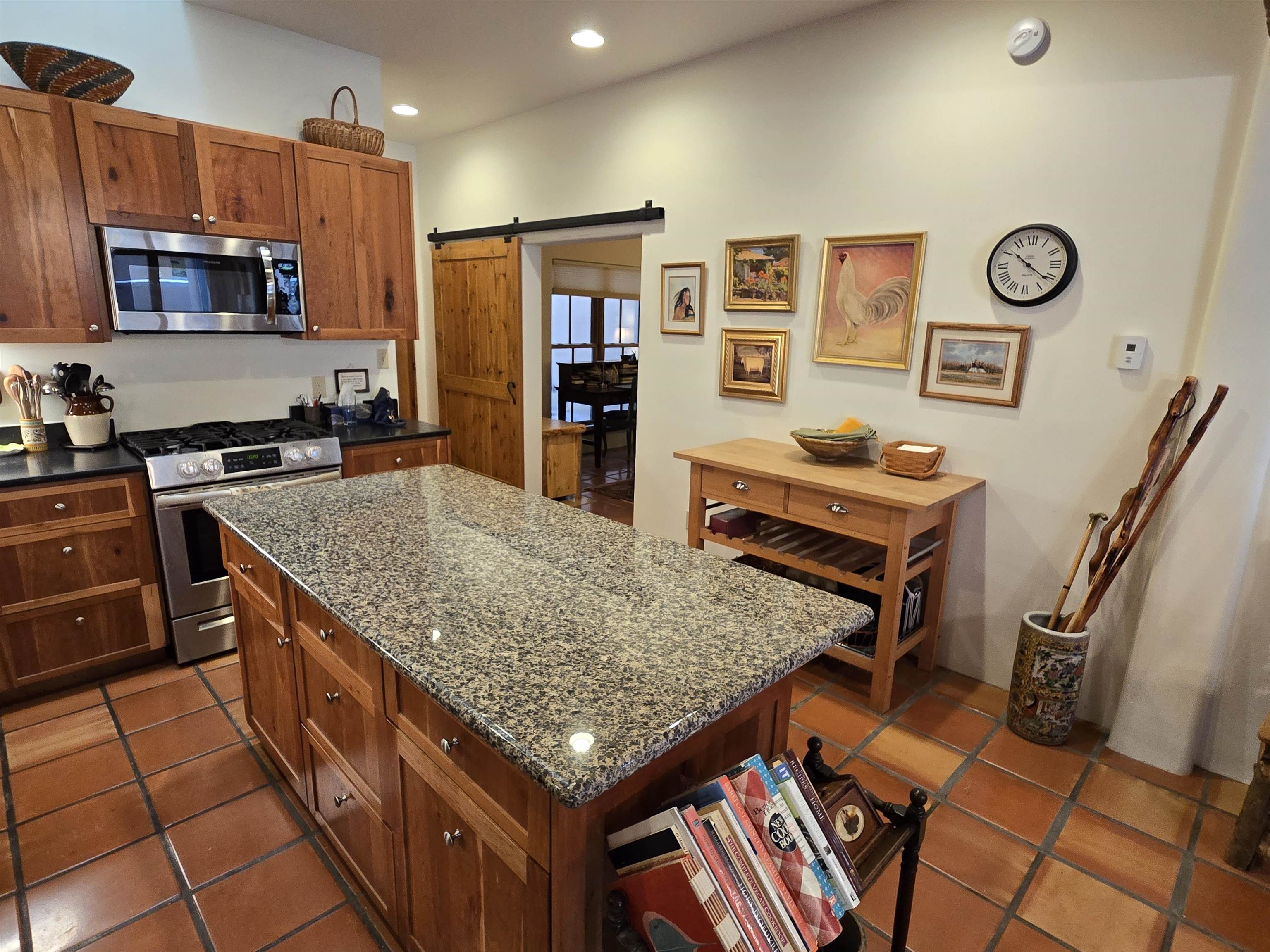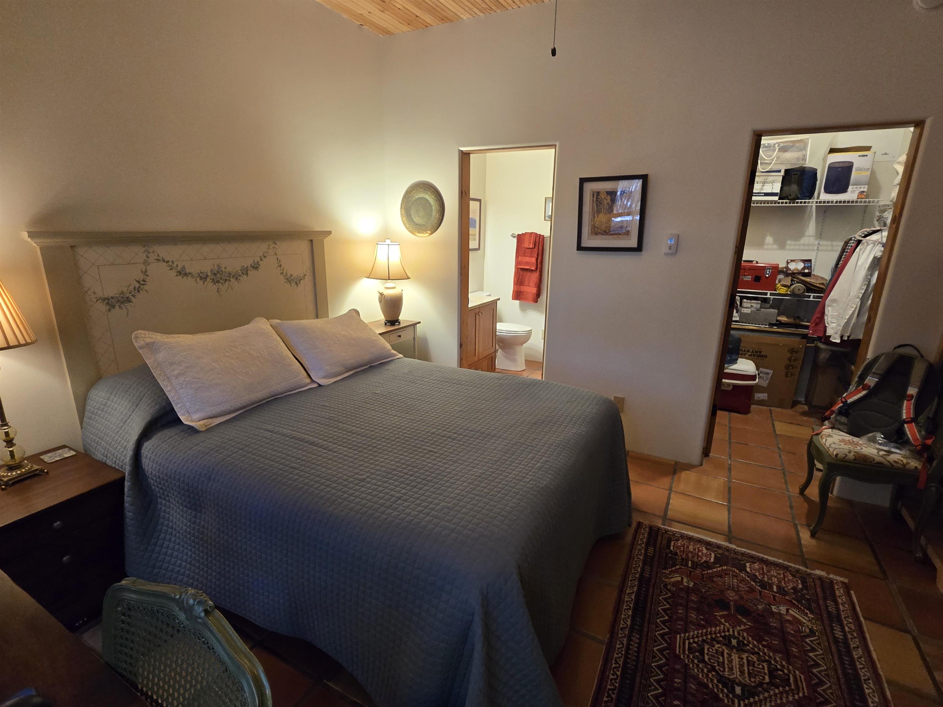 This Kit Carson Road two bedroom two and a half bath condominium location is the place you need to be, within walking distance of dining, shopping, music and galleries downtown in Taos. This quiet compound is home to just nineteen units on a shady street. The two-story condominium has a lovely open floorplan that expands out onto a private courtyard where your potted flowers will glow. Remodeled in 2022, this unit saw top quality upgrades of cabinetry, stainless appliances, new Saltillo tile flooring throughout the ground floor and an on demand water heater for endless showers! Granite countertops sparkle under the two-story skylight. The kitchen supplies ample storage in the rich wood cabinets and island. The owners love to entertain, and the space worked beautifully for many functions throughout the seasons. The large LIVING ROOM is so cozy with handsome vigas, the Pueblo-style gas fireplace and wood frame windows. The warmth of wood flows through the home with pretty raised panel wood doors. Ceiling fans circulate fresh air in handsome fashion. The quality Hunter blinds work seamlessly, opening from top or bottom to control the streaming sunlight or privacy. Large sliding patio doors open out to the private courtyard from the dining room. The main floor also features a BEDROOM / OFFICE with ensuite bath, large closet, a powder room with laundry closet and large under staircase storage area. Upstairs a LARGE PRIMARY BEDROOM is spacious enough to share an art studio area. It features a lovely bath with a large tub, linen cabinets and sunny glass block corner to spread the sky light around. The upper level has its own deck with space for seating overlooking a sunny southern exposure and fresh mountain air. These units do not stay on the market long, so call to request a showing today.