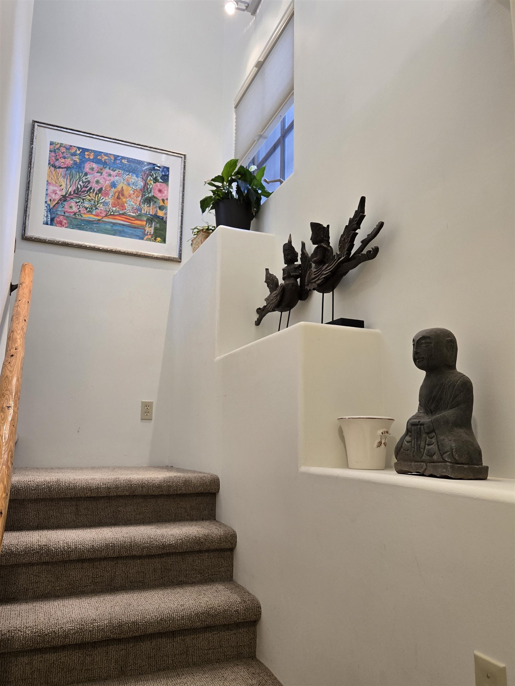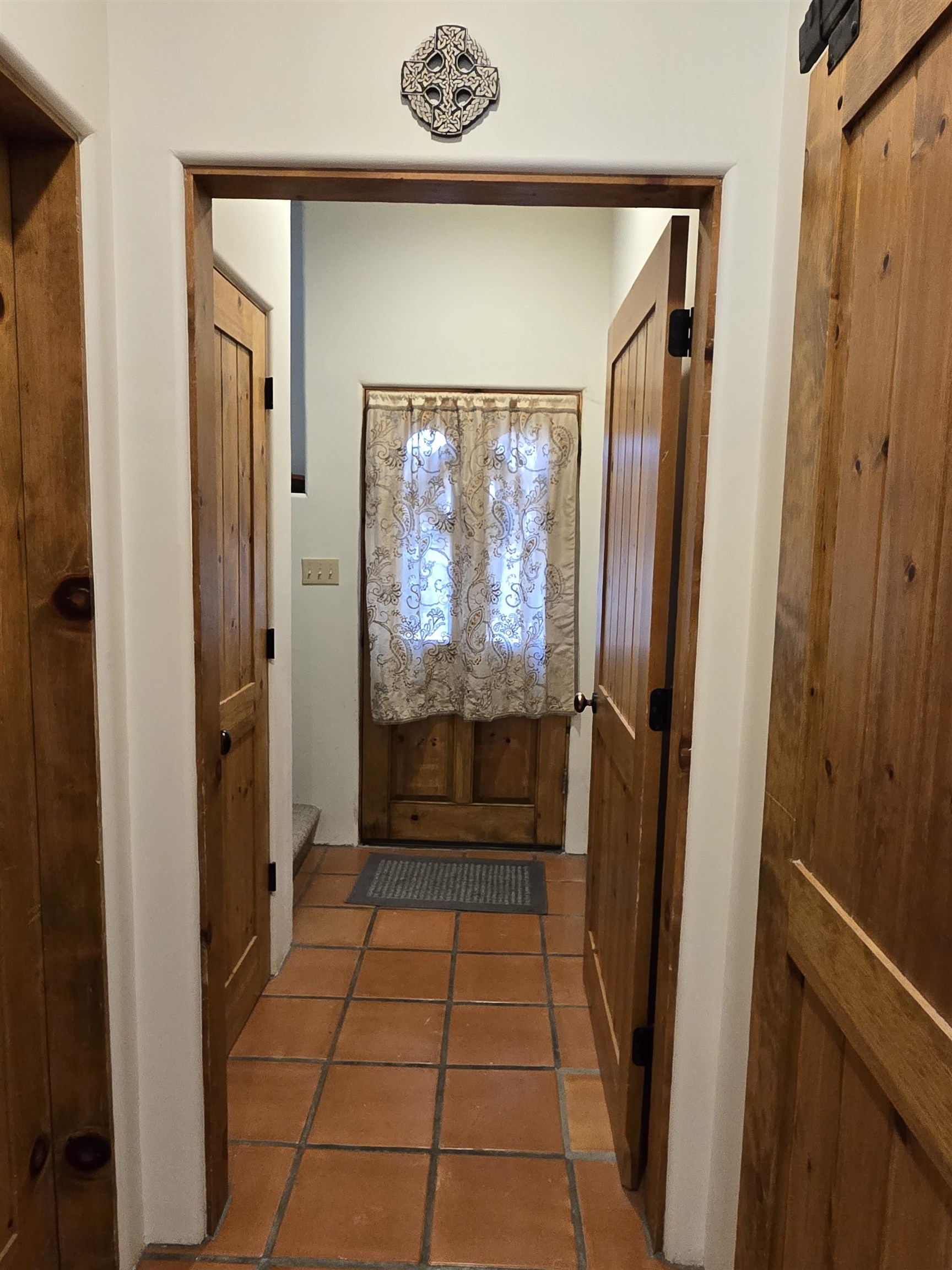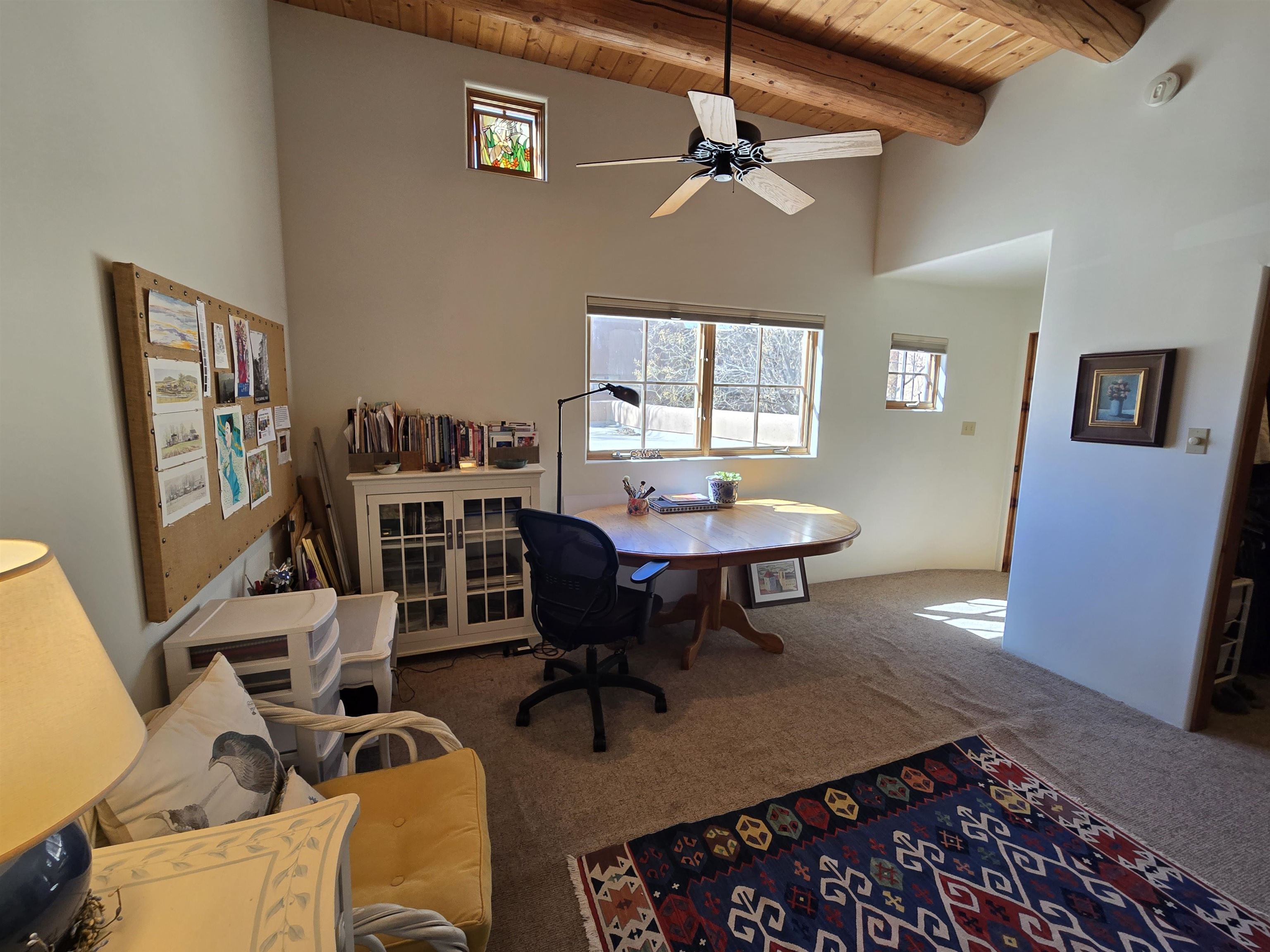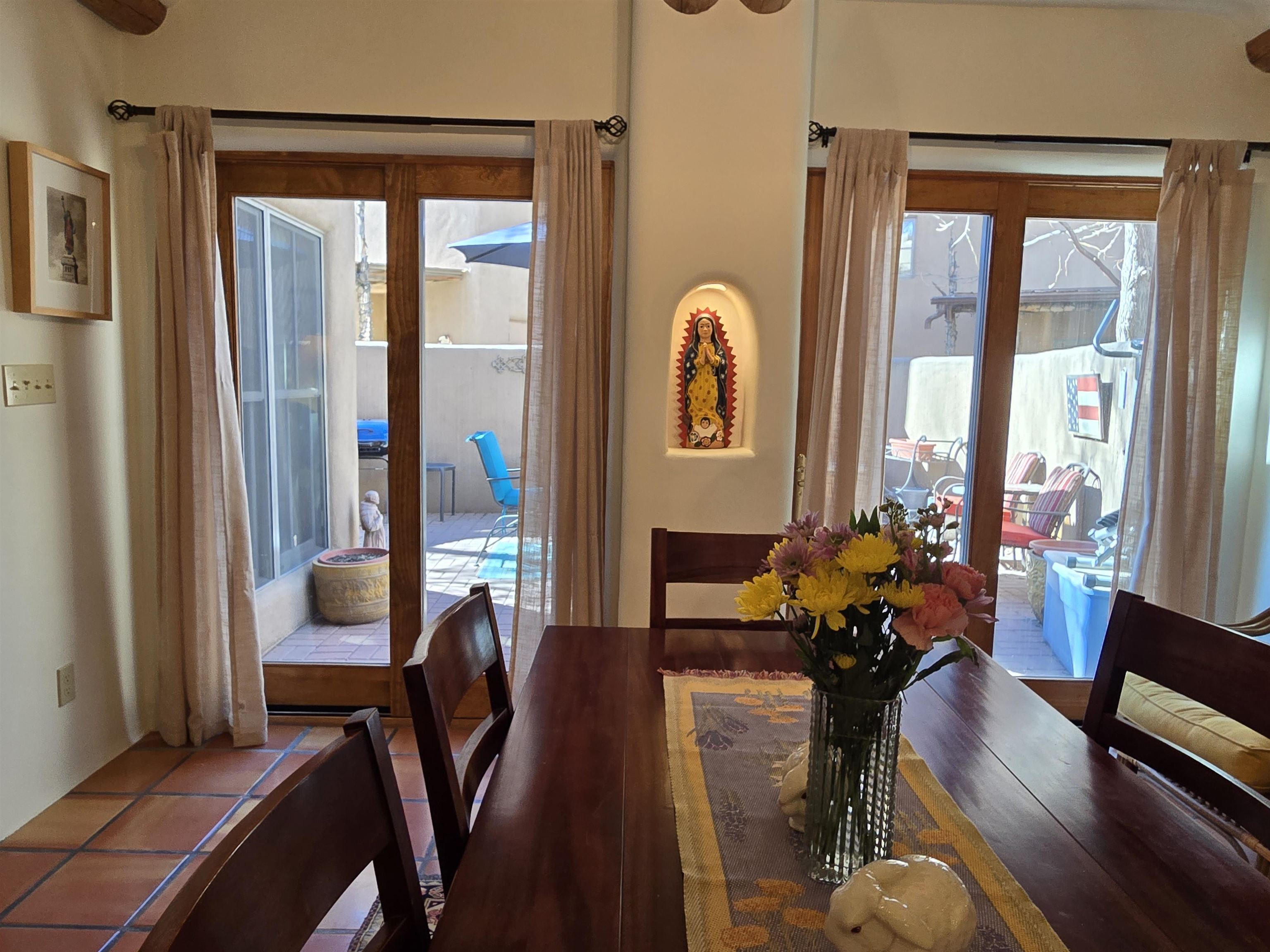 This Kit Carson Road two bedroom two and a half bath condominium location is the place you need to be, within walking distance of dining, shopping, music and galleries downtown in Taos. This quiet compound is home to just nineteen units on a shady street. The two-story condominium has a lovely open floorplan that expands out onto a private courtyard where your potted flowers will glow. Remodeled in 2022, this unit saw top quality upgrades of cabinetry, stainless appliances, new Saltillo tile flooring throughout the ground floor and an on demand water heater for endless showers! Granite countertops sparkle under the two-story skylight. The kitchen supplies ample storage in the rich wood cabinets and island. The owners love to entertain, and the space worked beautifully for many functions throughout the seasons. The large LIVING ROOM is so cozy with handsome vigas, the Pueblo-style gas fireplace and wood frame windows. The warmth of wood flows through the home with pretty raised panel wood doors. Ceiling fans circulate fresh air in handsome fashion. The quality Hunter blinds work seamlessly, opening from top or bottom to control the streaming sunlight or privacy. Large sliding patio doors open out to the private courtyard from the dining room. The main floor also features a BEDROOM / OFFICE with ensuite bath, large closet, a powder room with laundry closet and large under staircase storage area. Upstairs a LARGE PRIMARY BEDROOM is spacious enough to share an art studio area. It features a lovely bath with a large tub, linen cabinets and sunny glass block corner to spread the sky light around. The upper level has its own deck with space for seating overlooking a sunny southern exposure and fresh mountain air. These units do not stay on the market long, so call to request a showing today.