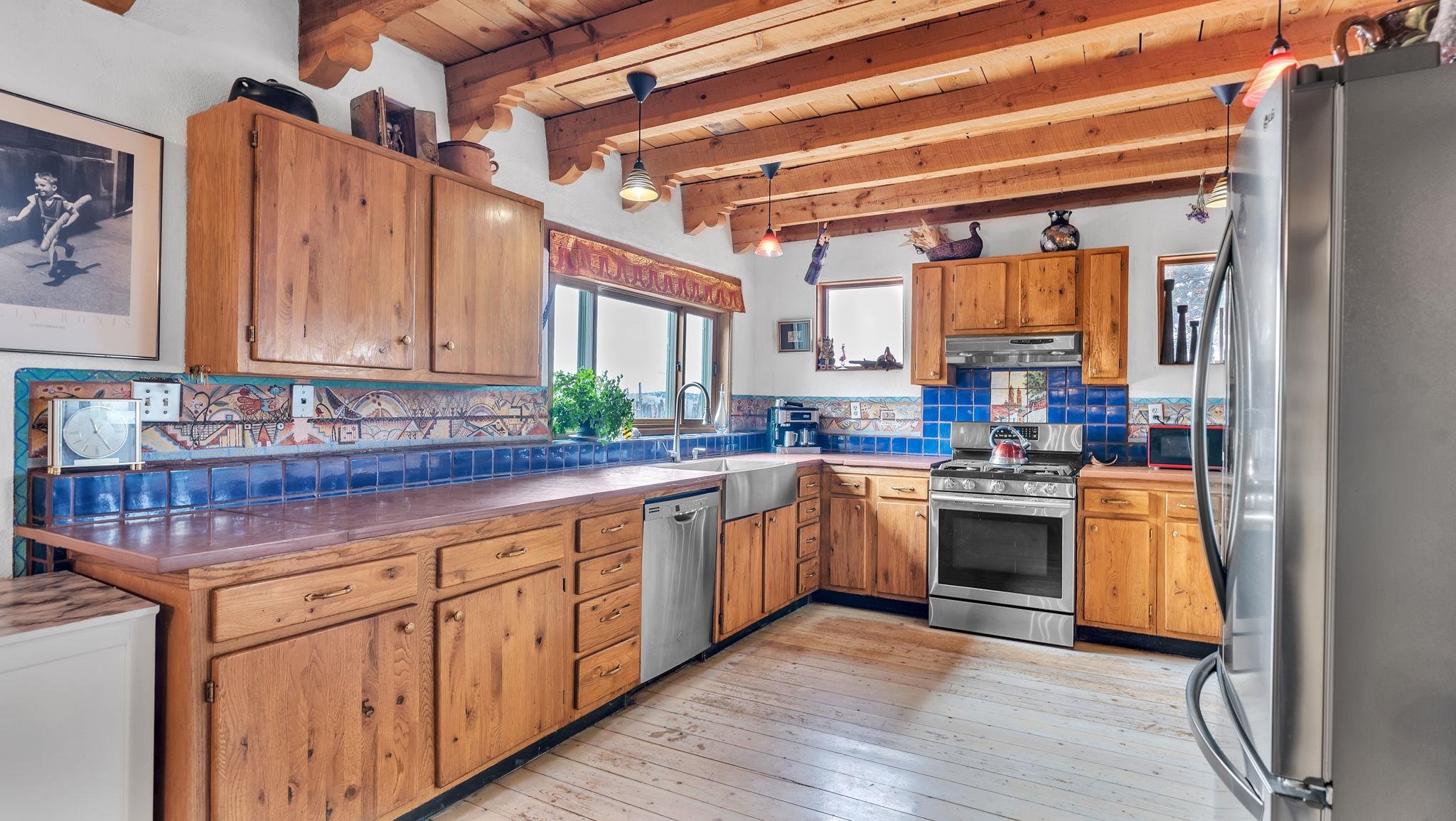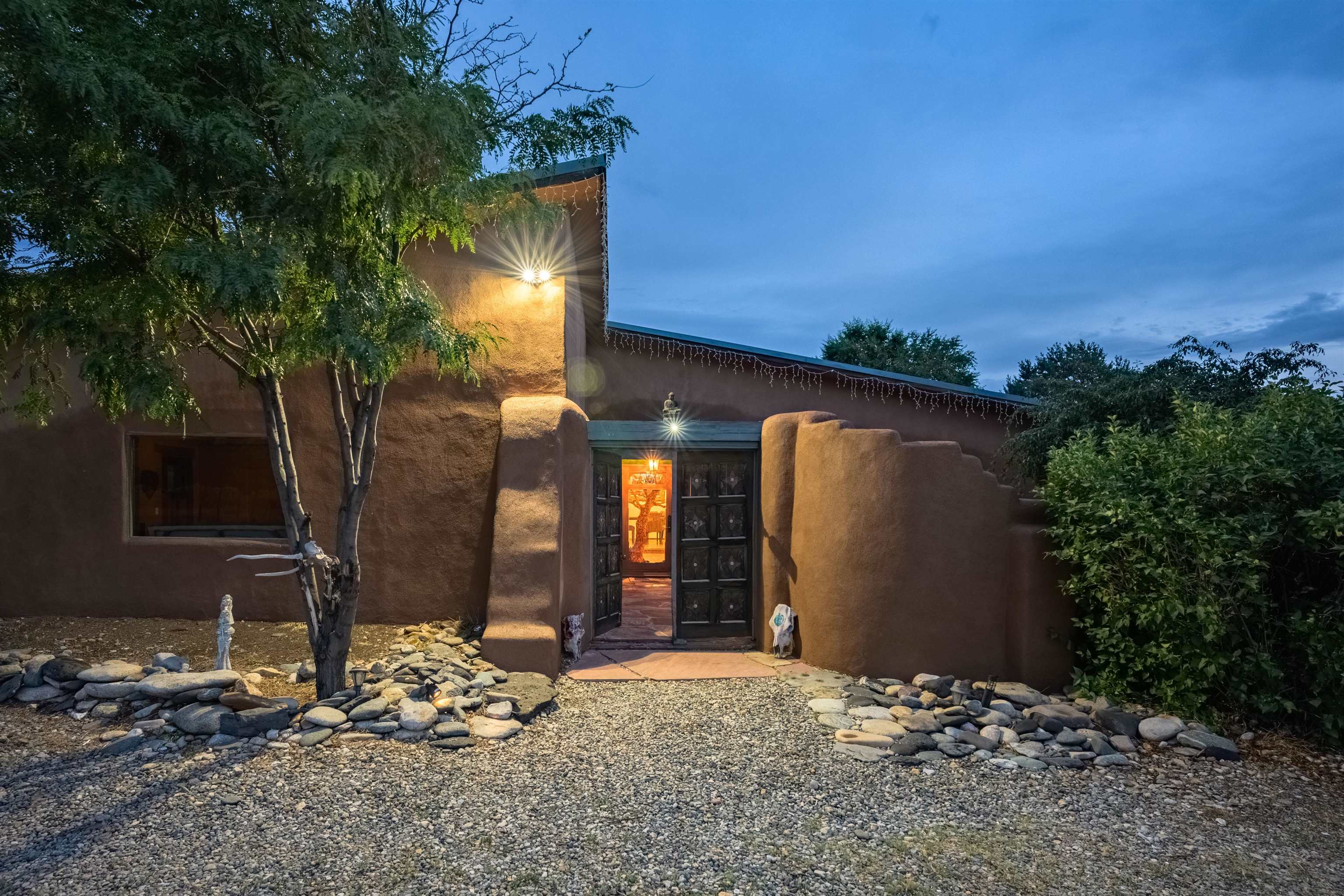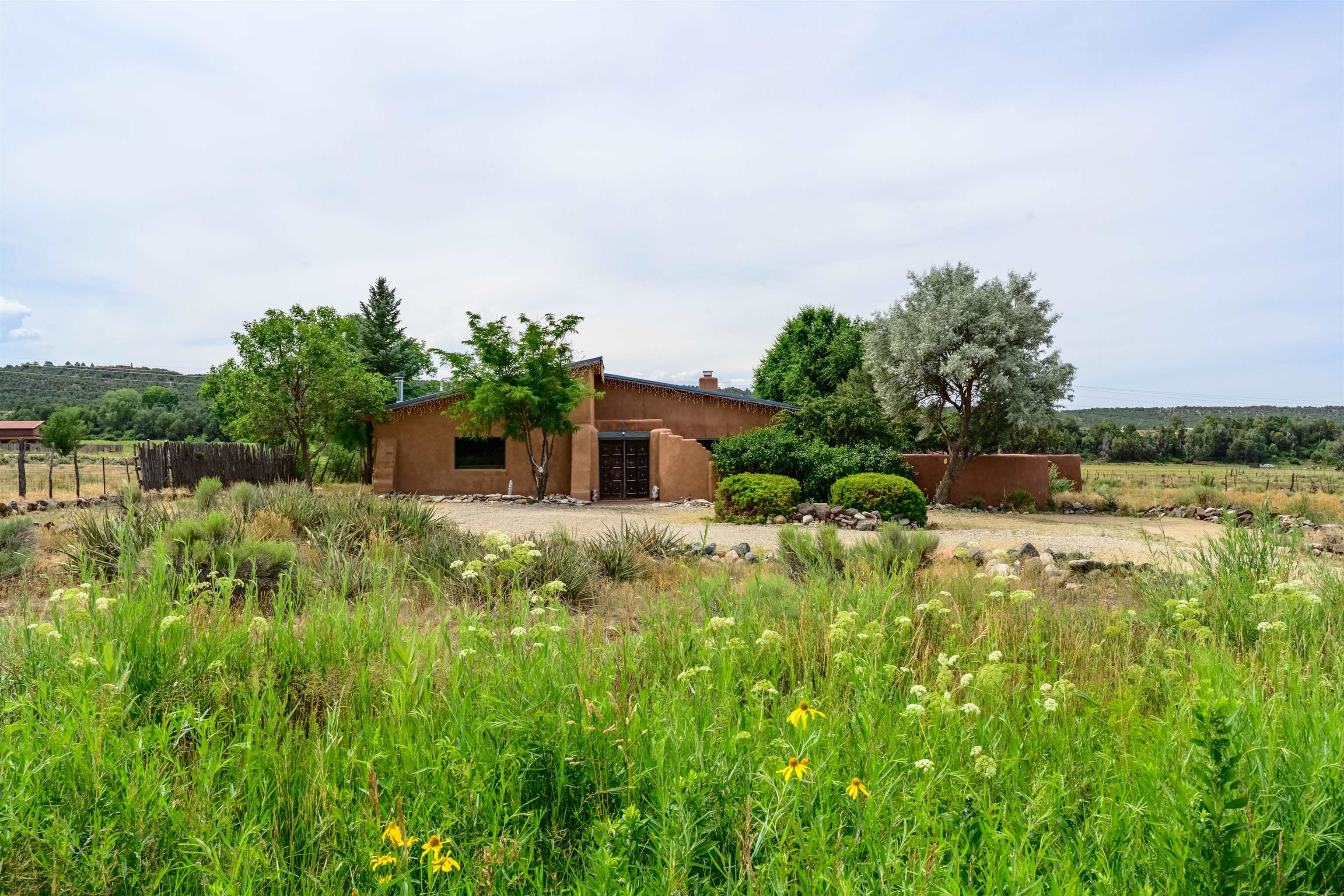 Rare Ranchette with an Adobe Residence, Guest Home & Water Rights in Magical Arroyo Hondo ~ Everything you've ever dreamed of exists right here. This rare property features a flowing acequia, an elegant, tastefully updated Adobe residence, and an income-producing guest home currently generating $2,000 monthly with potential for even more. Perfectly positioned for the outdoor enthusiast, you can play in the waters of the Rio Grande just minutes to the west, or head east through charming Arroyo Seco to experience the world-class slopes of Taos Ski Valley. Spanning just under three lush acres off a well-maintained, paved Hondo Seco Road, this private oasis offers supreme tranquility and some of the absolute best views in the Southwest. An unforgettable first impression awaits as you step through the enclosed flagstone patio and a breathtaking masterpiece sea glass door. Inside, an immediate sense of vibrant warmth fills the space, where abundant natural light highlights classy fixtures and endless Southwestern character. Stunning architectural details are everywhere, from the viga and beam ceilings down to the hardwood and Saltillo tile floors, beautifully complemented by a traditional fireplace, bancitos, corbels, and step-down walls perfect for displaying your art collection. The sunken den offers a welcoming gathering spot to cozy up by the fire, while a versatile back bonus room serves perfectly as a home office, studio, theater, or extra sleeping space. The home provides three spacious bedrooms and two comfortable bathrooms, highlighted by a large primary ensuite tucked quietly at the back of the home with beautiful light, a highly functional bathroom, and private access to the yard. At the heart of the home, the open-concept dining room and kitchen—complete with a second egress to the back deck—provide the ideal setting for morning routines and entertaining dinner guests. Step outside to the enclosed, beautifully landscaped backyard to find a tranquil pond and fountain, creating a magical setting where you will love tending the garden, relaxing, and unwinding under a starry New Mexico sky.