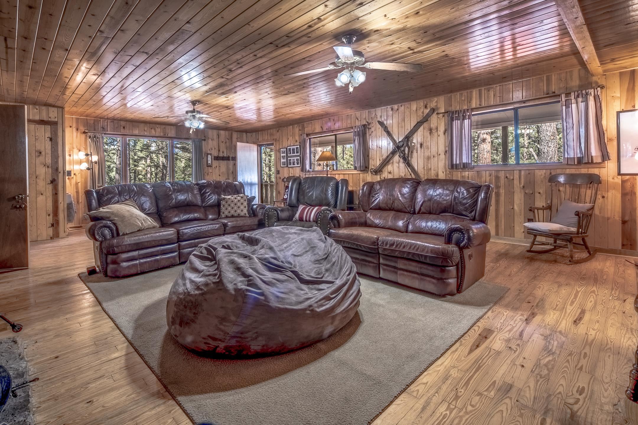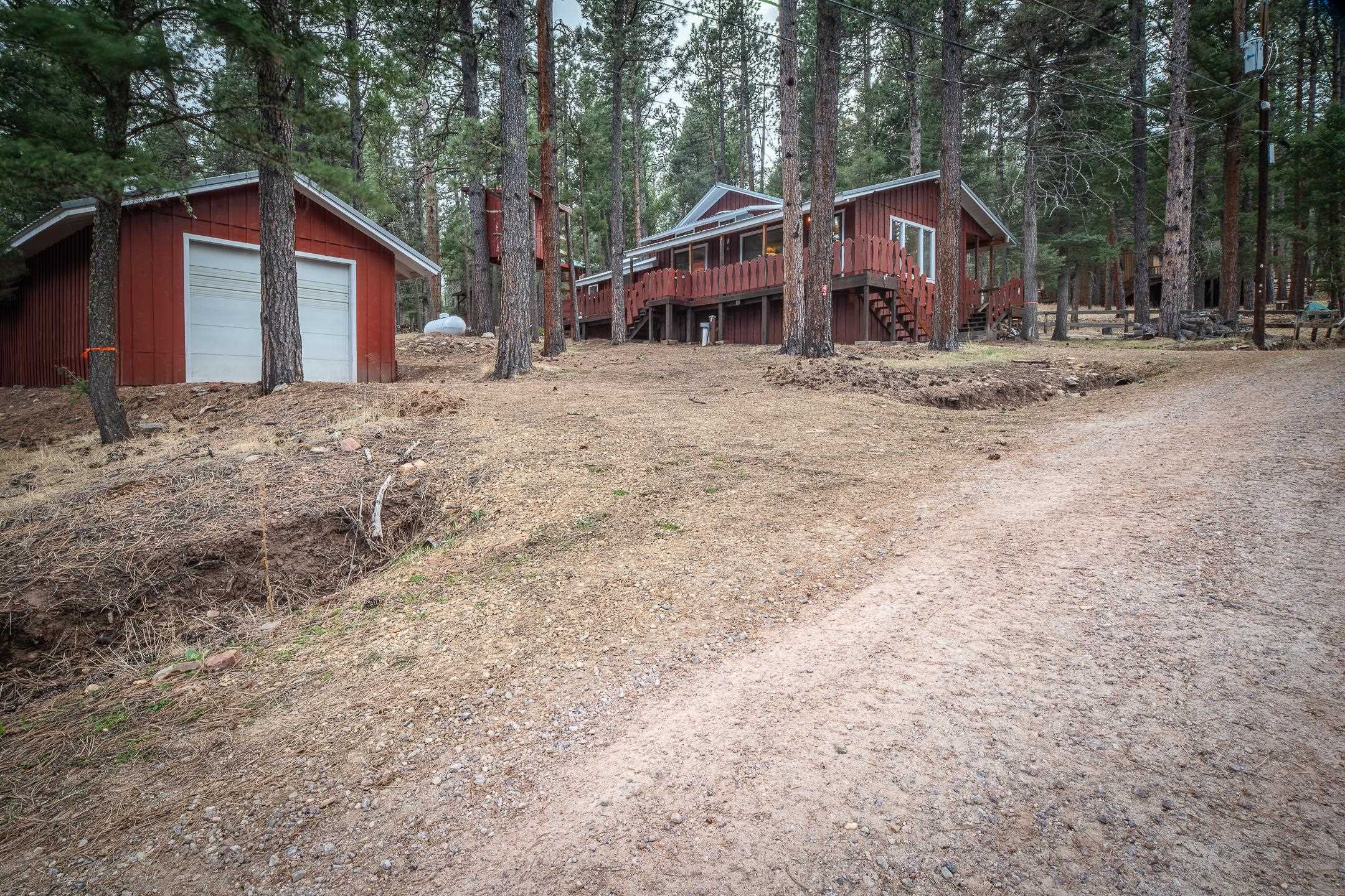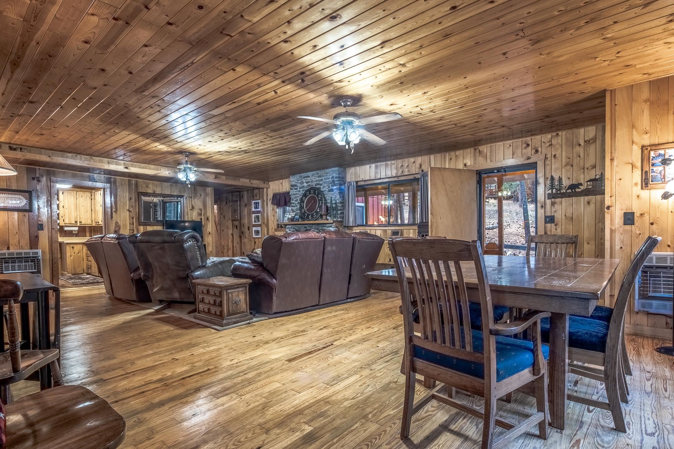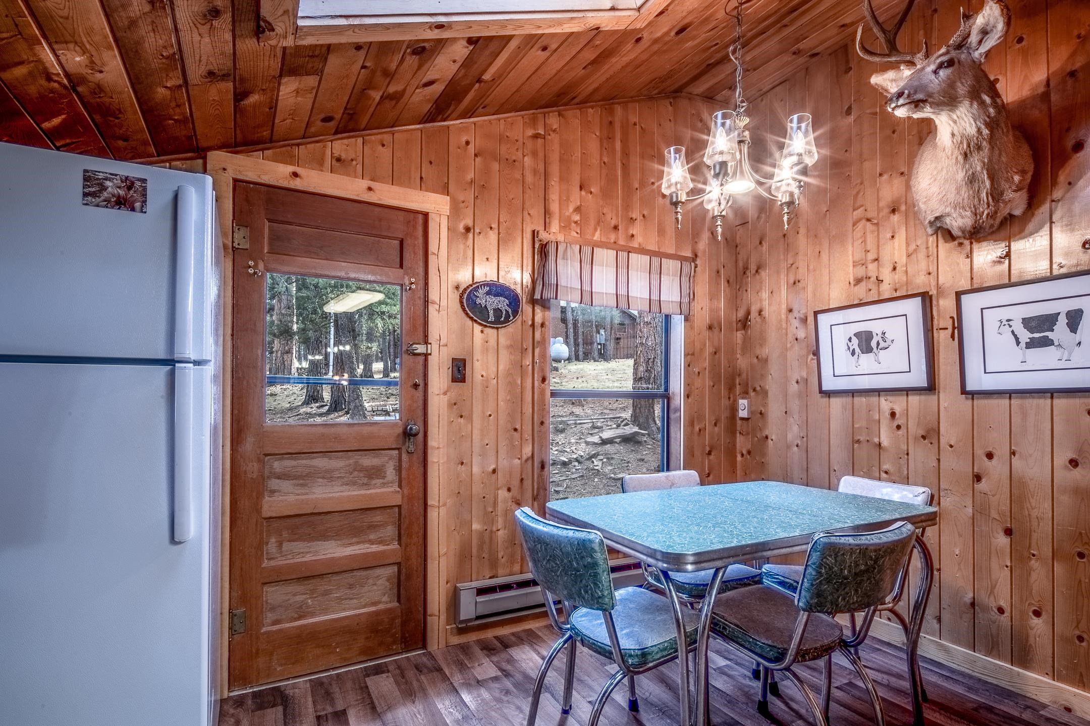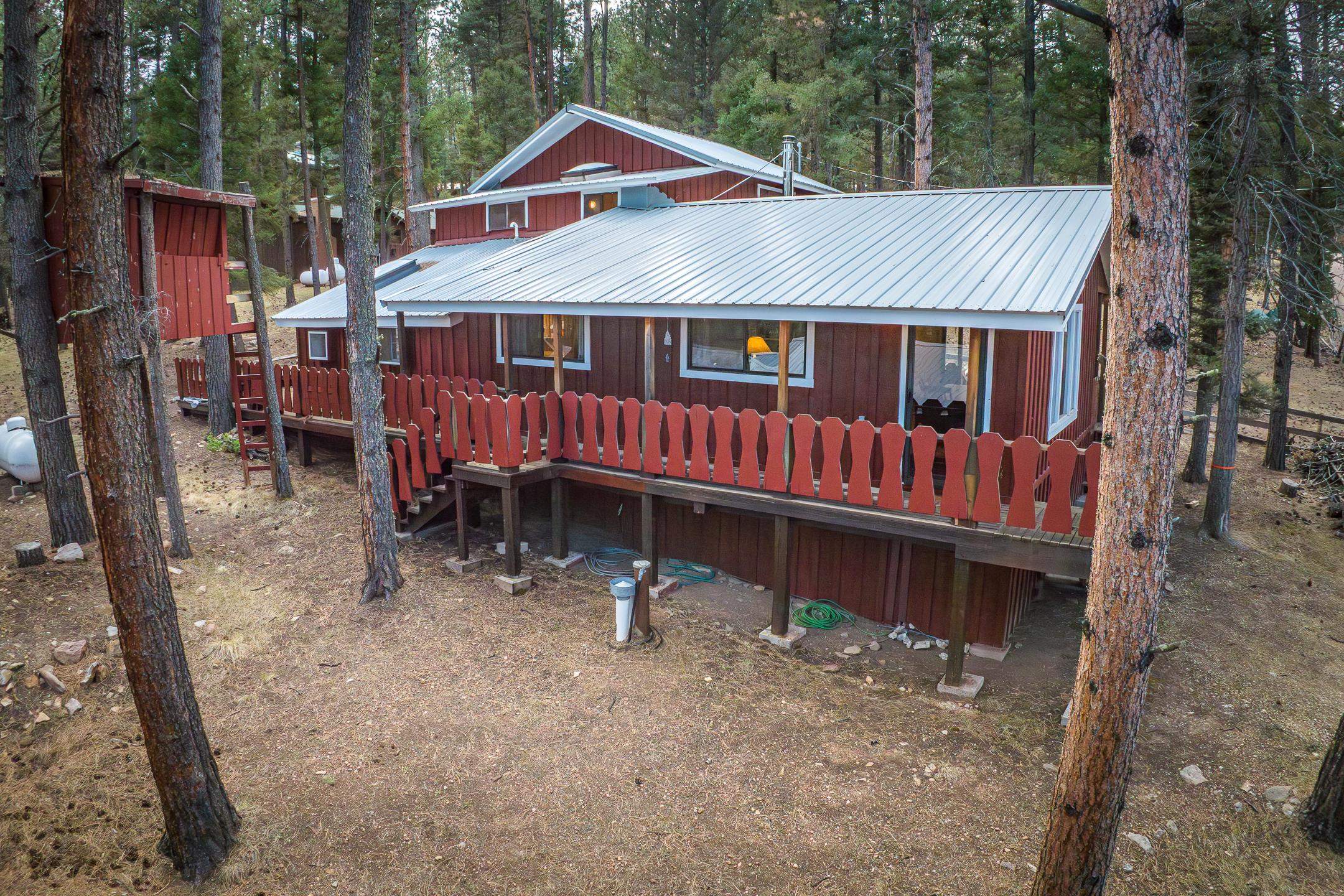 Secluded mountain retreat in the hidden community of Idlewild, just minutes from Eagle Nest Lake, Red River, and Angel Fire. This charming two-bedroom, two-bath cabin also features a versatile bunk room, offering ample space for family and guests. The spacious living room is designed for gathering, complete with a wood-burning stove installed in a beautiful rock fireplace that provides an efficient and cozy heat source. The kitchen offers functional space with warm wooden cabinetry and a quaint dining area. Wood floors and walls enhance the inviting cabin atmosphere. Multiple sleeping options are available in each room, making it ideal for hosting larger groups. Enjoy the outdoors from the covered deck or the additional uncovered patio space, perfect for taking in the surrounding mountain setting. Please note: four-wheel drive is recommended, and winter access is weather-dependent.