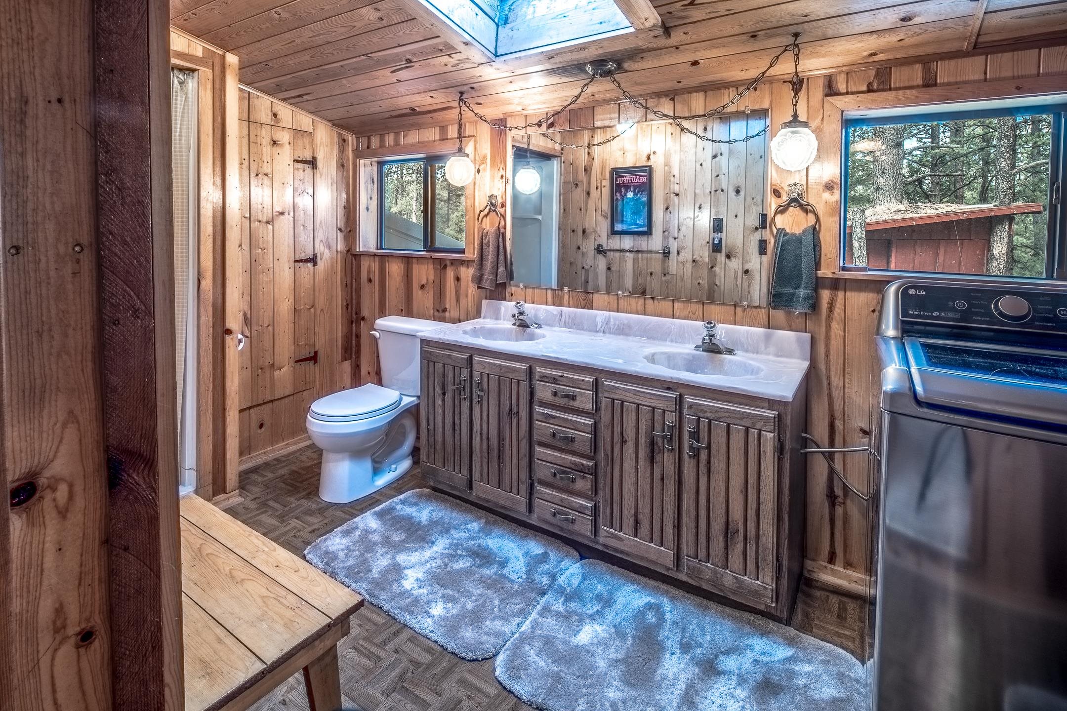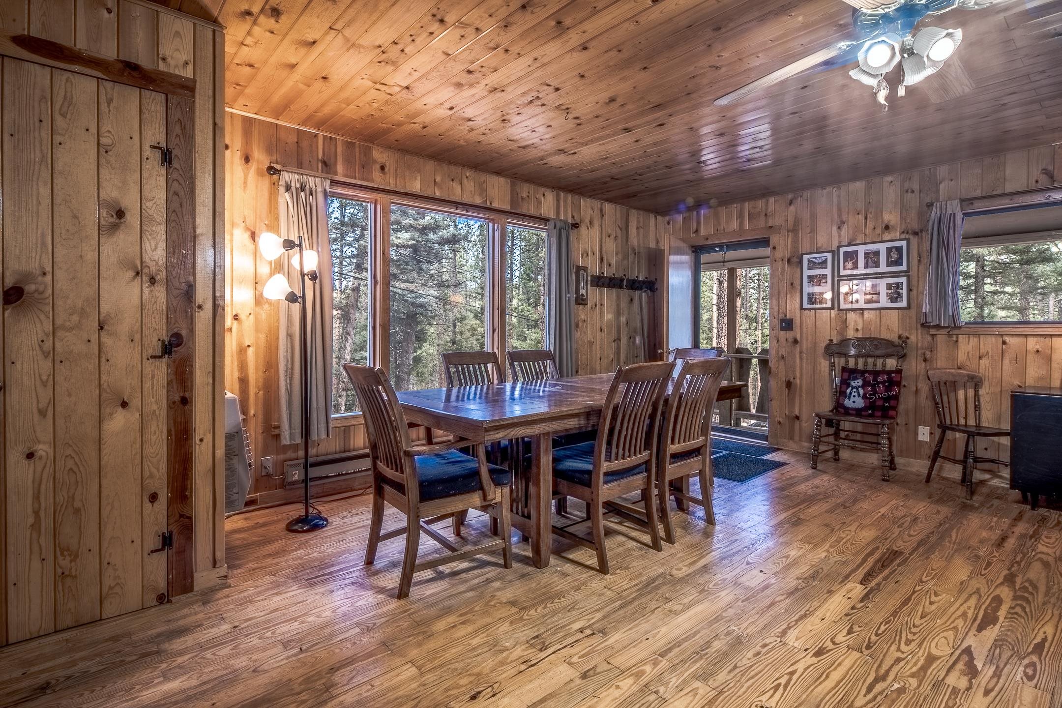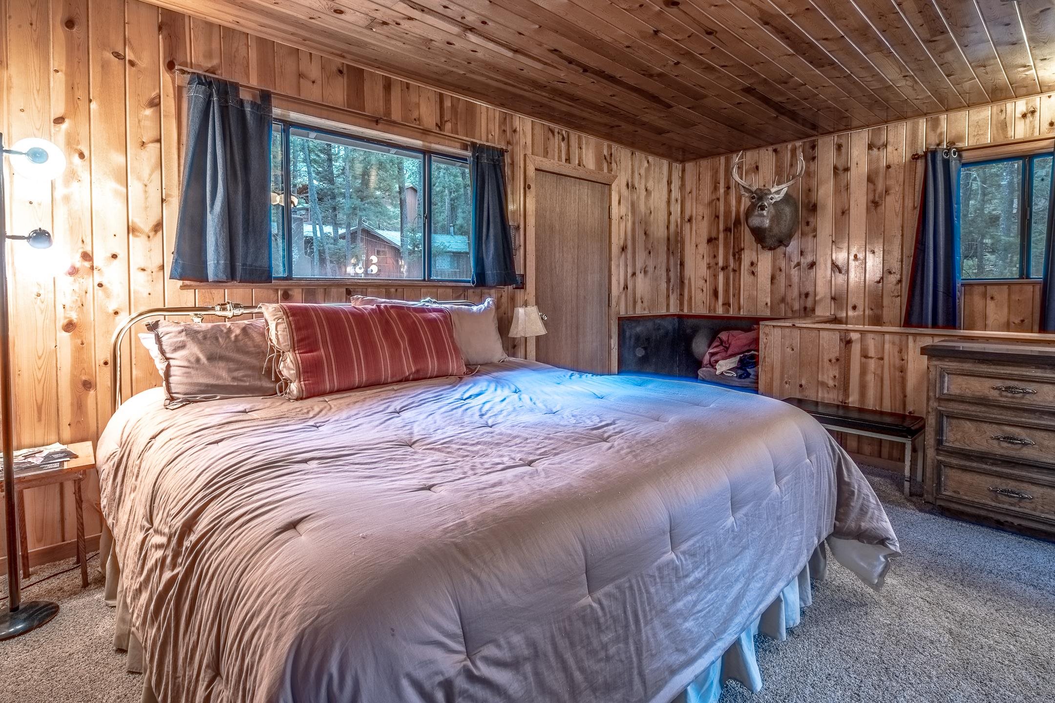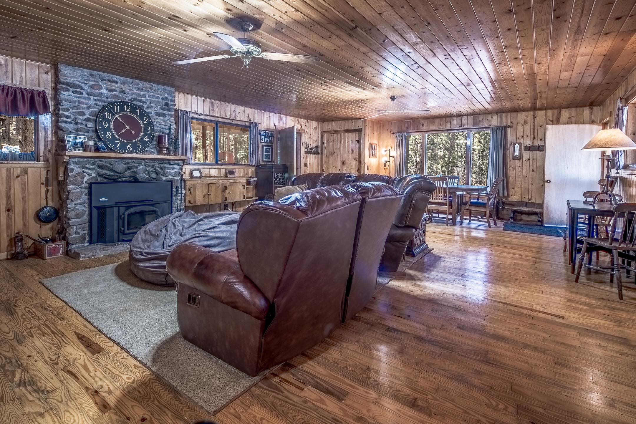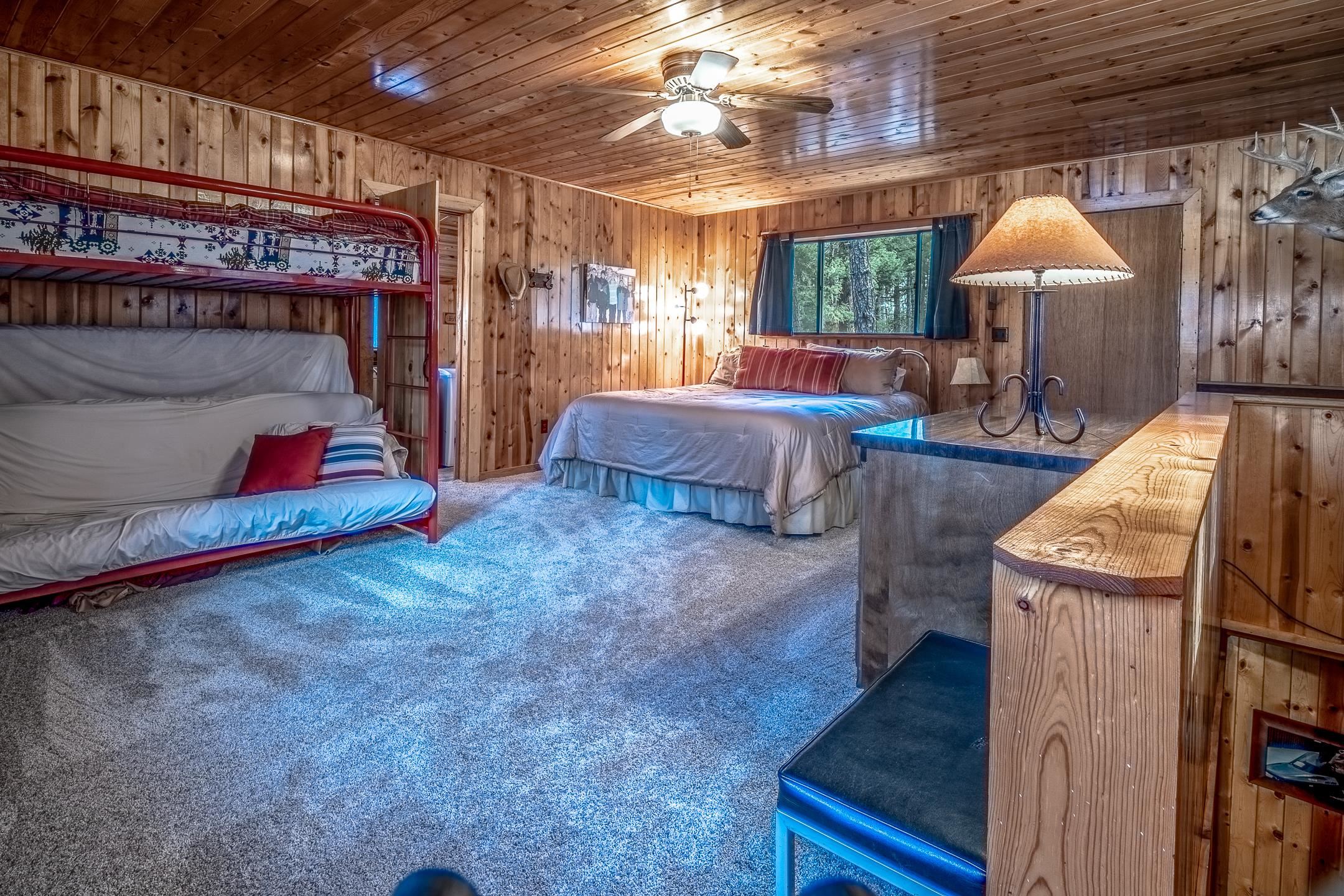 Secluded mountain retreat in the hidden community of Idlewild, just minutes from Eagle Nest Lake, Red River, and Angel Fire. This charming two-bedroom, two-bath cabin also features a versatile bunk room, offering ample space for family and guests. The spacious living room is designed for gathering, complete with a wood-burning stove installed in a beautiful rock fireplace that provides an efficient and cozy heat source. The kitchen offers functional space with warm wooden cabinetry and a quaint dining area. Wood floors and walls enhance the inviting cabin atmosphere. Multiple sleeping options are available in each room, making it ideal for hosting larger groups. Enjoy the outdoors from the covered deck or the additional uncovered patio space, perfect for taking in the surrounding mountain setting. Please note: four-wheel drive is recommended, and winter access is weather-dependent.