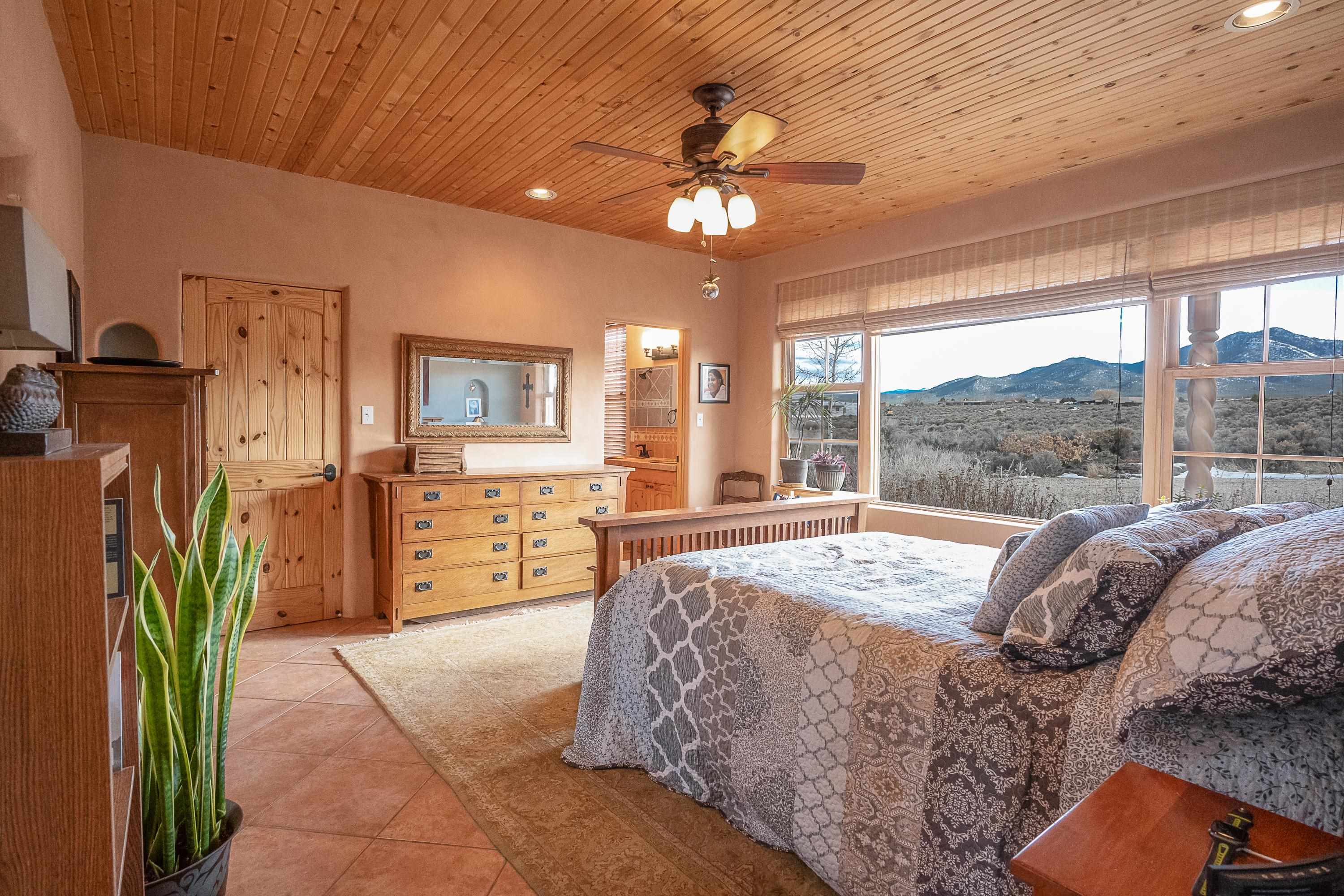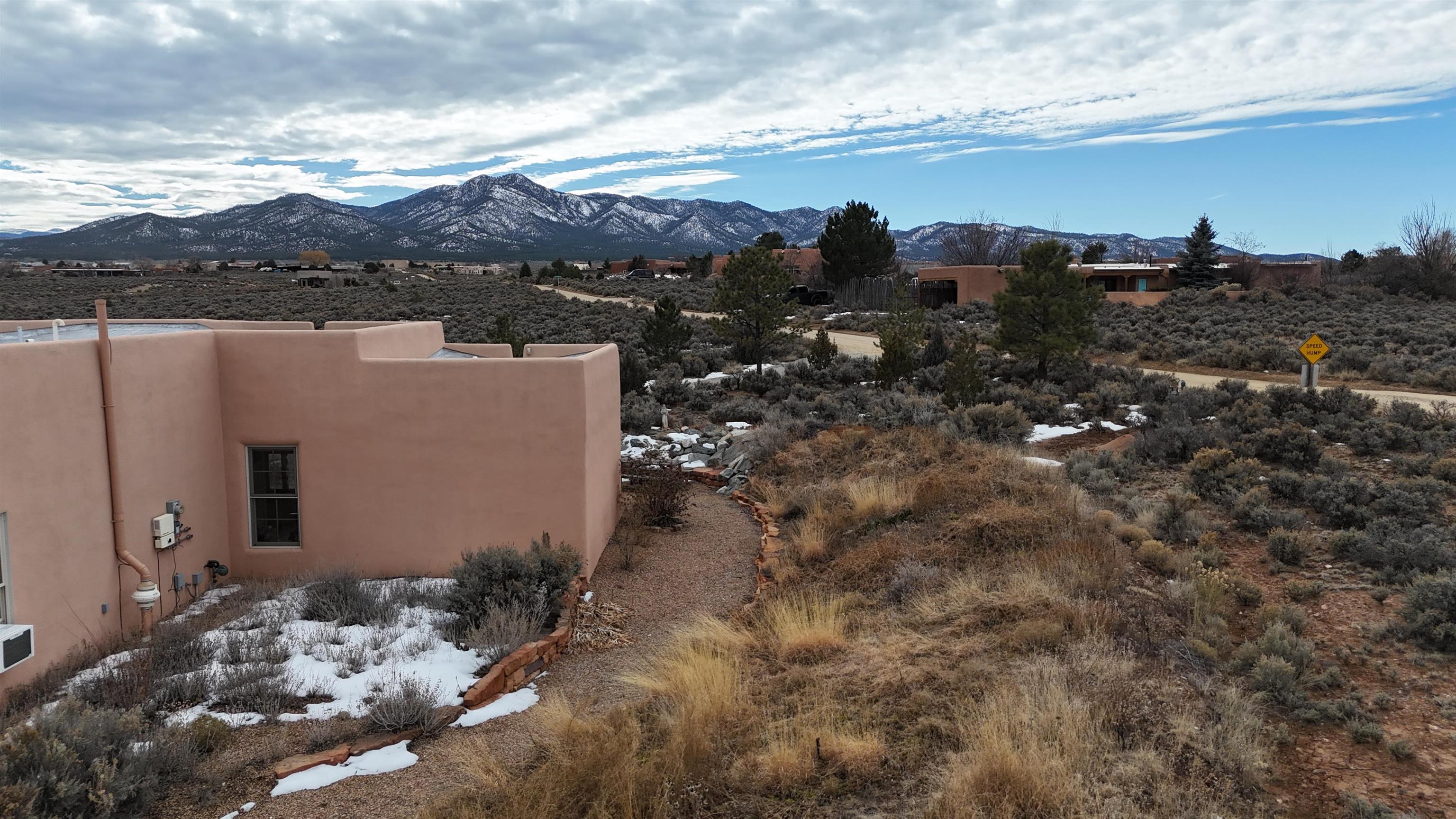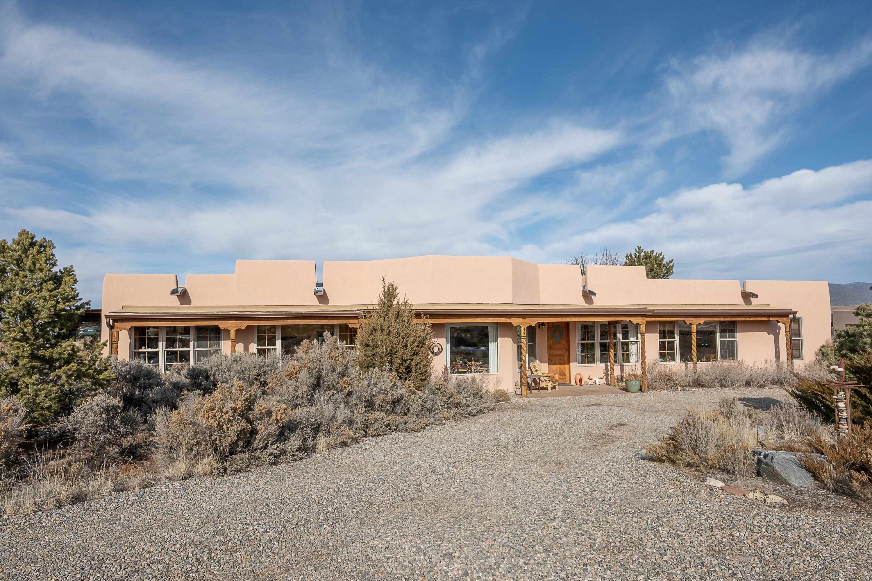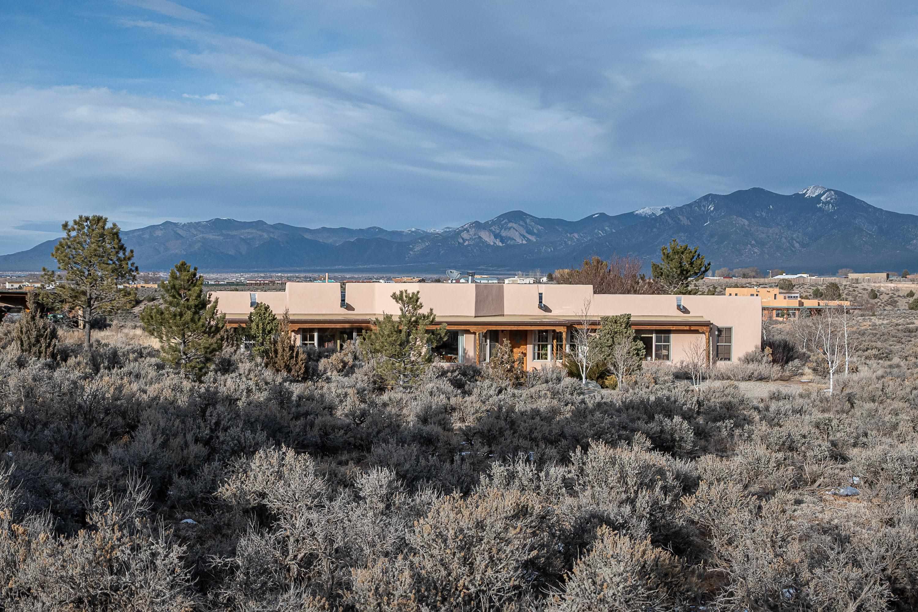 SUNNY, SERENE AND TOTALLY SOUTHWEST! Classic Southwest design meets thoughtful living in this artistically crafted, solar-oriented 3 bedroom, 2 bath home in the desirable Vista Linda Subdivision — just minutes from town and near the Taos Country Club. Built by Ecobuilders using sustainable materials, this residence embraces true Northern New Mexico style with hand-troweled natural tinted plaster walls, traditional vigas and tongue-and-groove ceilings, and warm earth-toned tile floors that glow in the natural light. The open floor plan flows effortlessly between the spacious living room, kitchen, and dining area-- ideal for dinner parties, holiday tamale-making, or simply admiring your excellent taste. The beautiful wood-burning fireplace anchors the living space with timeless Southwest character. The radial vigas over the dining room add a subtle drama that whispers "yes-- I'm fabulous." The kitchen is well-equipped with gas oven, gas range, dishwasher, refrigerator, generous panty and separate laundry room. The primary suite is full of light and luxury, with copper sinks, jumbo walk-in closet and direct access to the backyard and hot tub. (Morning coffee soak? Late-night stargazing? Both feel appropriate.) Two additional bedrooms and full bath sit off a sunny hallway-- perfect for guests, studio space or a home office you'll pretend you're very disciplined about. Beyond the kitchen is a large north-facing family room with its own sink offering endless flexibilty-- art studio, wet bar, media lounge, creative lab, yoga space... you choose. Soft light, big views, no bad angles. Step outside to a covered portal designed for lingering. Room to dine, room to lounge, room to exhale. Perennial gardens, mature trees, and established landscaping on drip irrigation surrounds the home and softens the natural high-desert setting, creating a peaceful outdoor retreat framed by stunning mountain views. There's even a hot tub for soaking in the views or the star-filled Taos skies-- because sometimes you just need to float and contemplate life choices. Ample parking for entertaining and a detached carport with storage means there's room for guests, gear and outdoor toys. Behind the beauty? Smart design. Passive solar, electric solar panels, pumice exterior wall construction (north, east & west), a private well and a rainwater catchment system with cistern for irrigation reflect forward-thinking, energy-efficient living. Sustainable never looked so good. Located near the Taos Country Club, Slide + Rift hiking + biking trails, and offering convenient access to Pilar and the Rio Grande for rafting, kayaking, and world-class fishing — this home is the perfect balance of Southwest detail, sustainability, and access to the wild beauty that makes Taos.... Taos.
