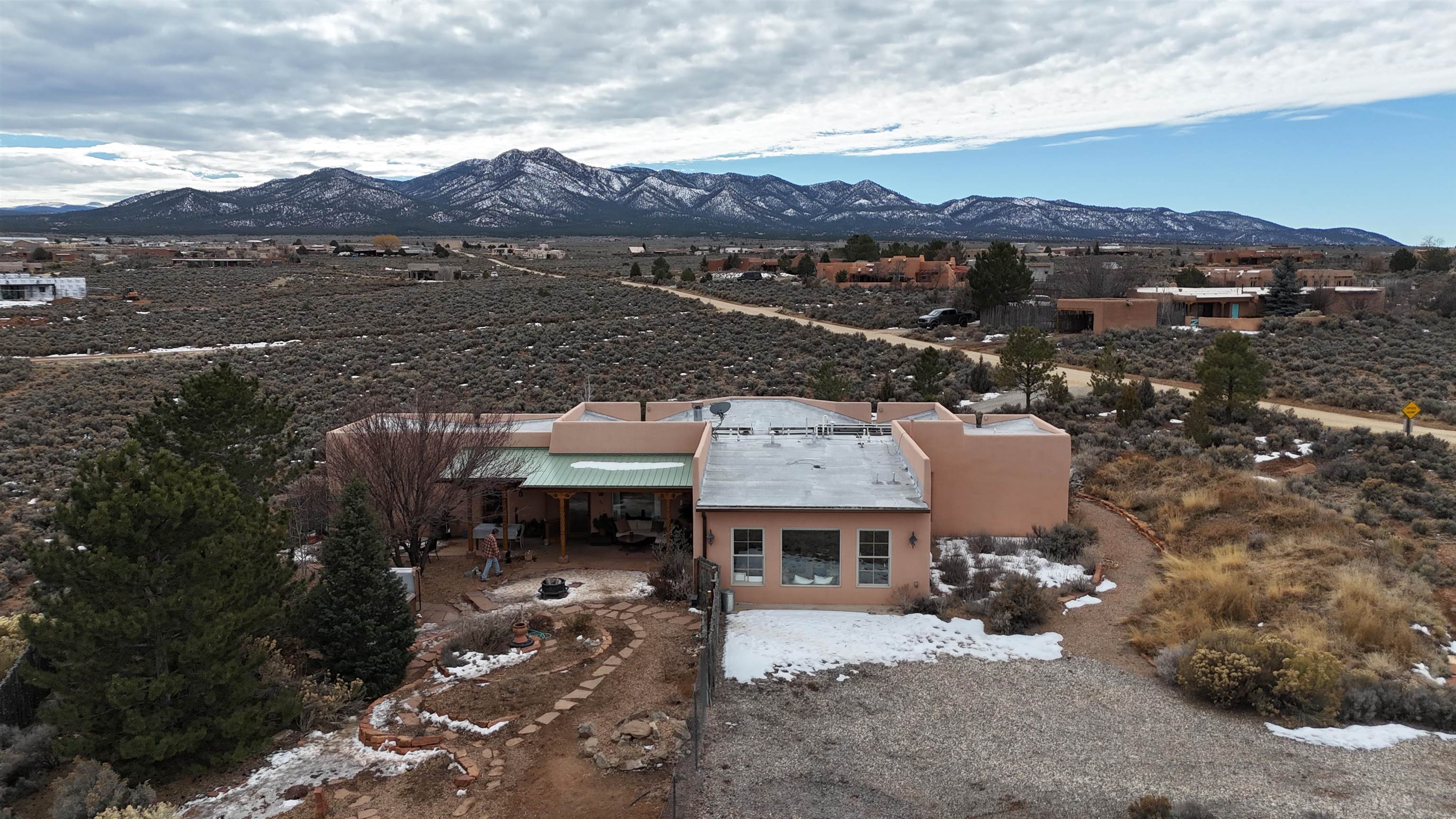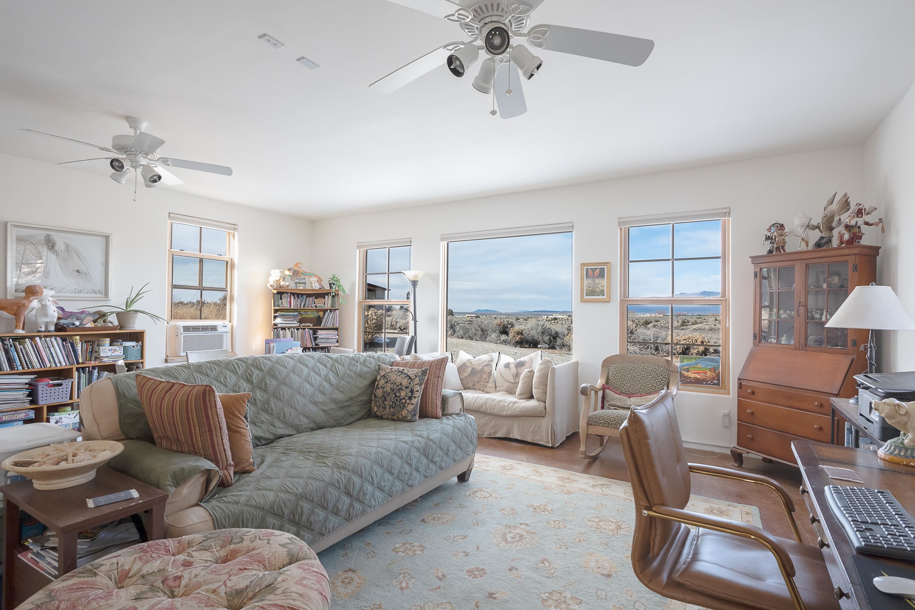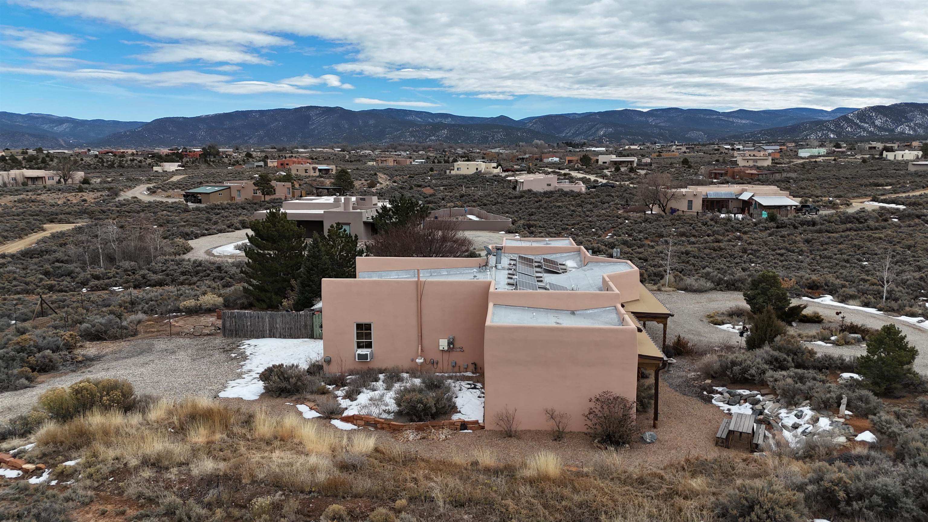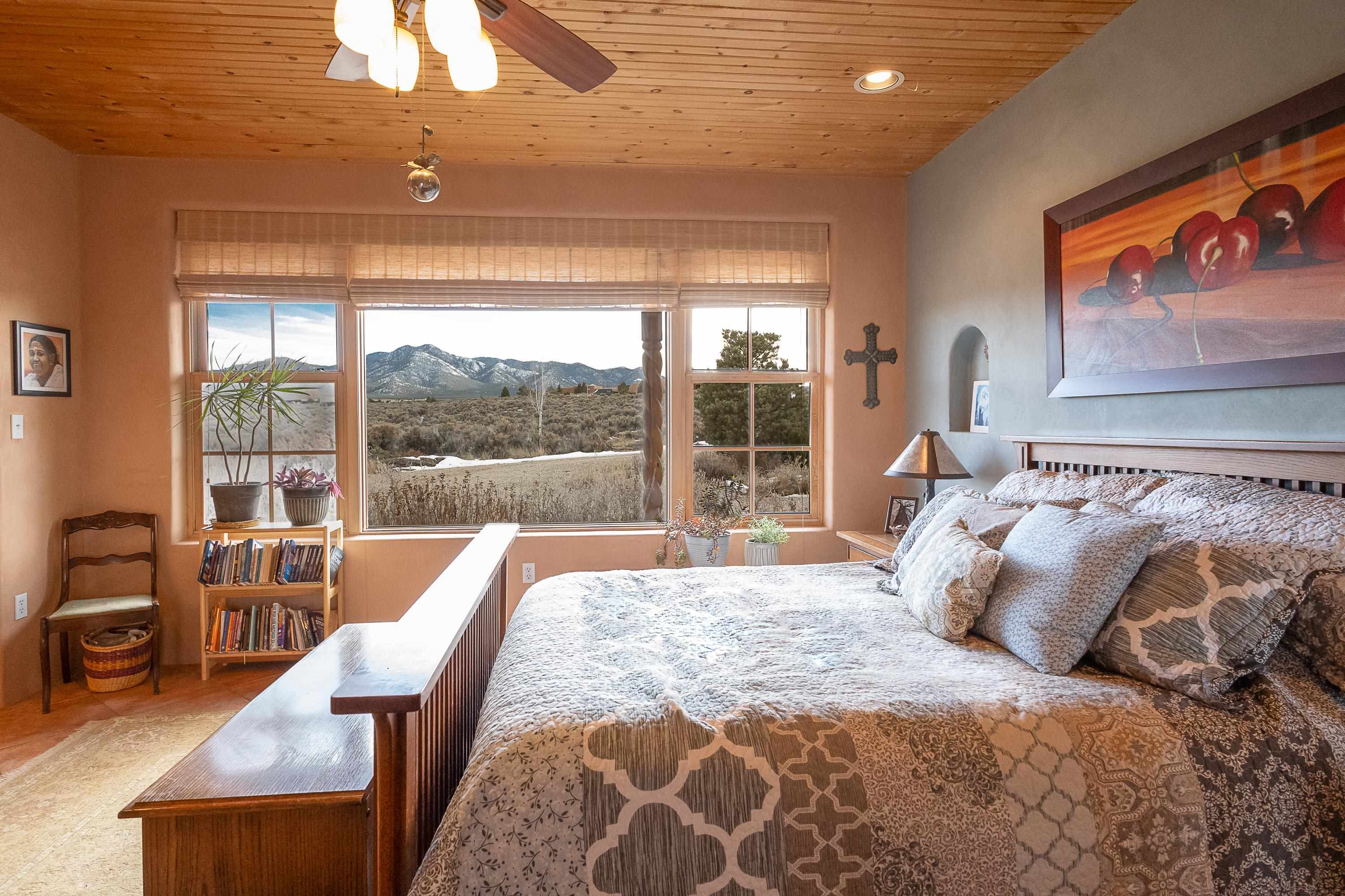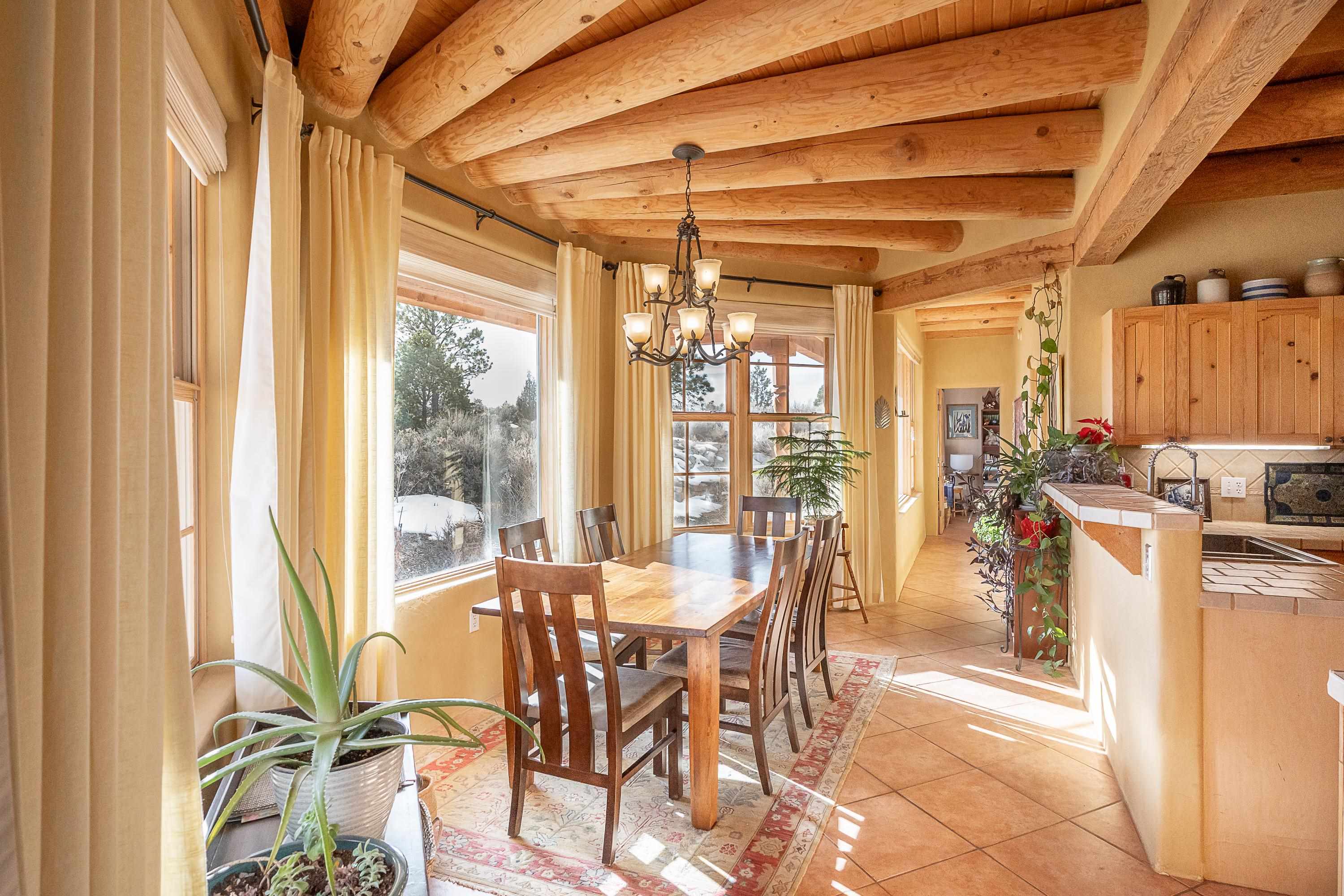 SUNNY, SERENE AND TOTALLY SOUTHWEST! Classic Southwest design meets thoughtful living in this artistically crafted, solar-oriented 3 bedroom, 2 bath home in the desirable Vista Linda Subdivision — just minutes from town and near the Taos Country Club. Built by Ecobuilders using sustainable materials, this residence embraces true Northern New Mexico style with hand-troweled natural tinted plaster walls, traditional vigas and tongue-and-groove ceilings, and warm earth-toned tile floors that glow in the natural light. The open floor plan flows effortlessly between the spacious living room, kitchen, and dining area-- ideal for dinner parties, holiday tamale-making, or simply admiring your excellent taste. The beautiful wood-burning fireplace anchors the living space with timeless Southwest character. The radial vigas over the dining room add a subtle drama that whispers "yes-- I'm fabulous." The kitchen is well-equipped with gas oven, gas range, dishwasher, refrigerator, generous panty and separate laundry room. The primary suite is full of light and luxury, with copper sinks, jumbo walk-in closet and direct access to the backyard and hot tub. (Morning coffee soak? Late-night stargazing? Both feel appropriate.) Two additional bedrooms and full bath sit off a sunny hallway-- perfect for guests, studio space or a home office you'll pretend you're very disciplined about. Beyond the kitchen is a large north-facing family room with its own sink offering endless flexibilty-- art studio, wet bar, media lounge, creative lab, yoga space... you choose. Soft light, big views, no bad angles. Step outside to a covered portal designed for lingering. Room to dine, room to lounge, room to exhale. Perennial gardens, mature trees, and established landscaping on drip irrigation surrounds the home and softens the natural high-desert setting, creating a peaceful outdoor retreat framed by stunning mountain views. There's even a hot tub for soaking in the views or the star-filled Taos skies-- because sometimes you just need to float and contemplate life choices. Ample parking for entertaining and a detached carport with storage means there's room for guests, gear and outdoor toys. Behind the beauty? Smart design. Passive solar, electric solar panels, pumice exterior wall construction (north, east & west), a private well and a rainwater catchment system with cistern for irrigation reflect forward-thinking, energy-efficient living. Sustainable never looked so good. Located near the Taos Country Club, Slide + Rift hiking + biking trails, and offering convenient access to Pilar and the Rio Grande for rafting, kayaking, and world-class fishing — this home is the perfect balance of Southwest detail, sustainability, and access to the wild beauty that makes Taos.... Taos.