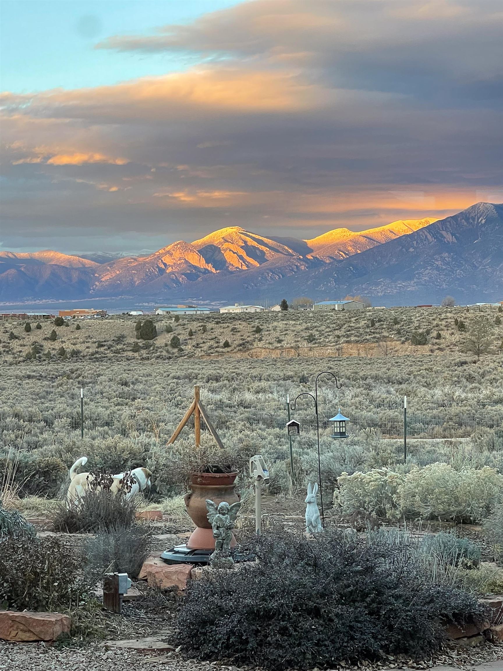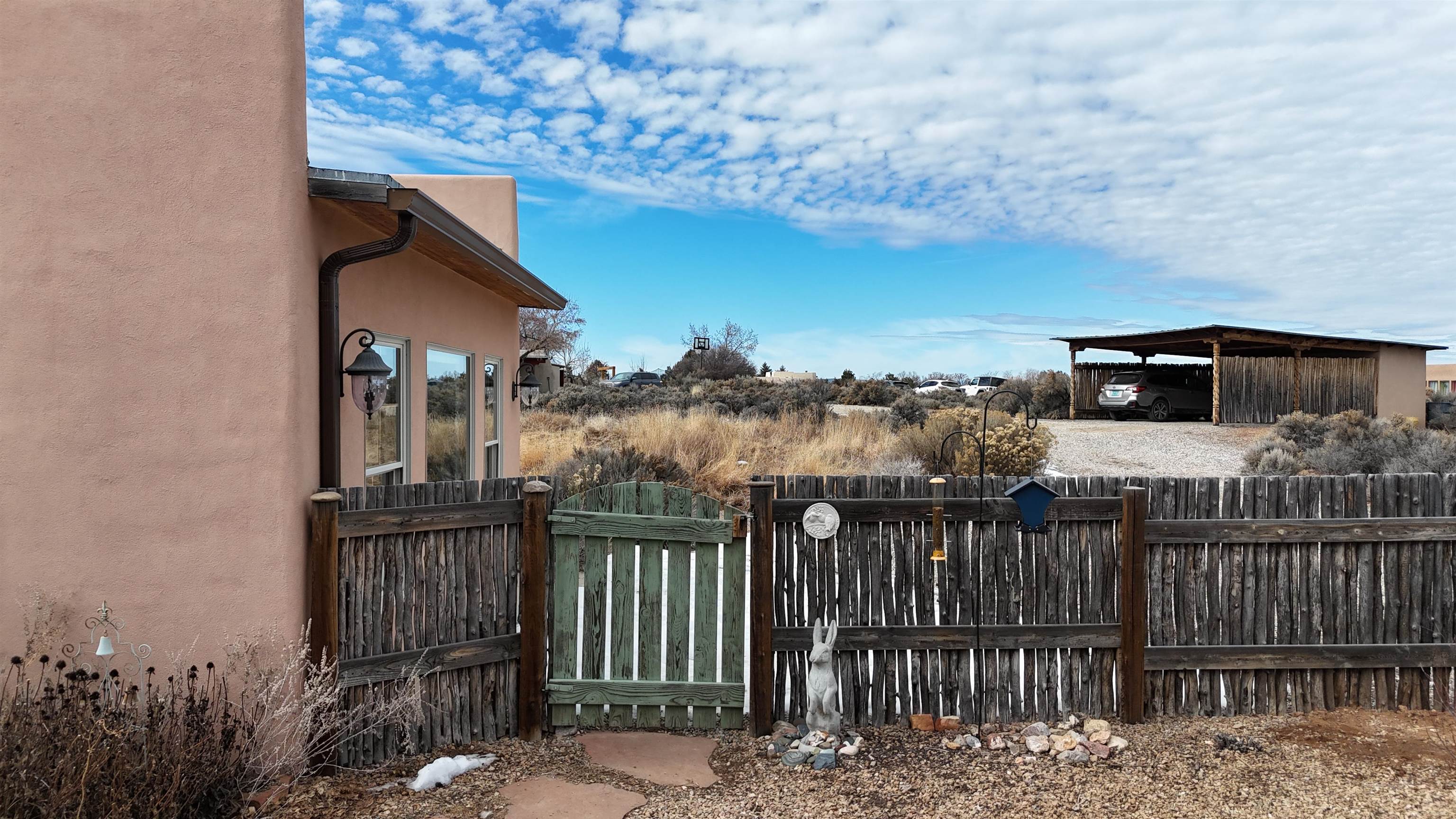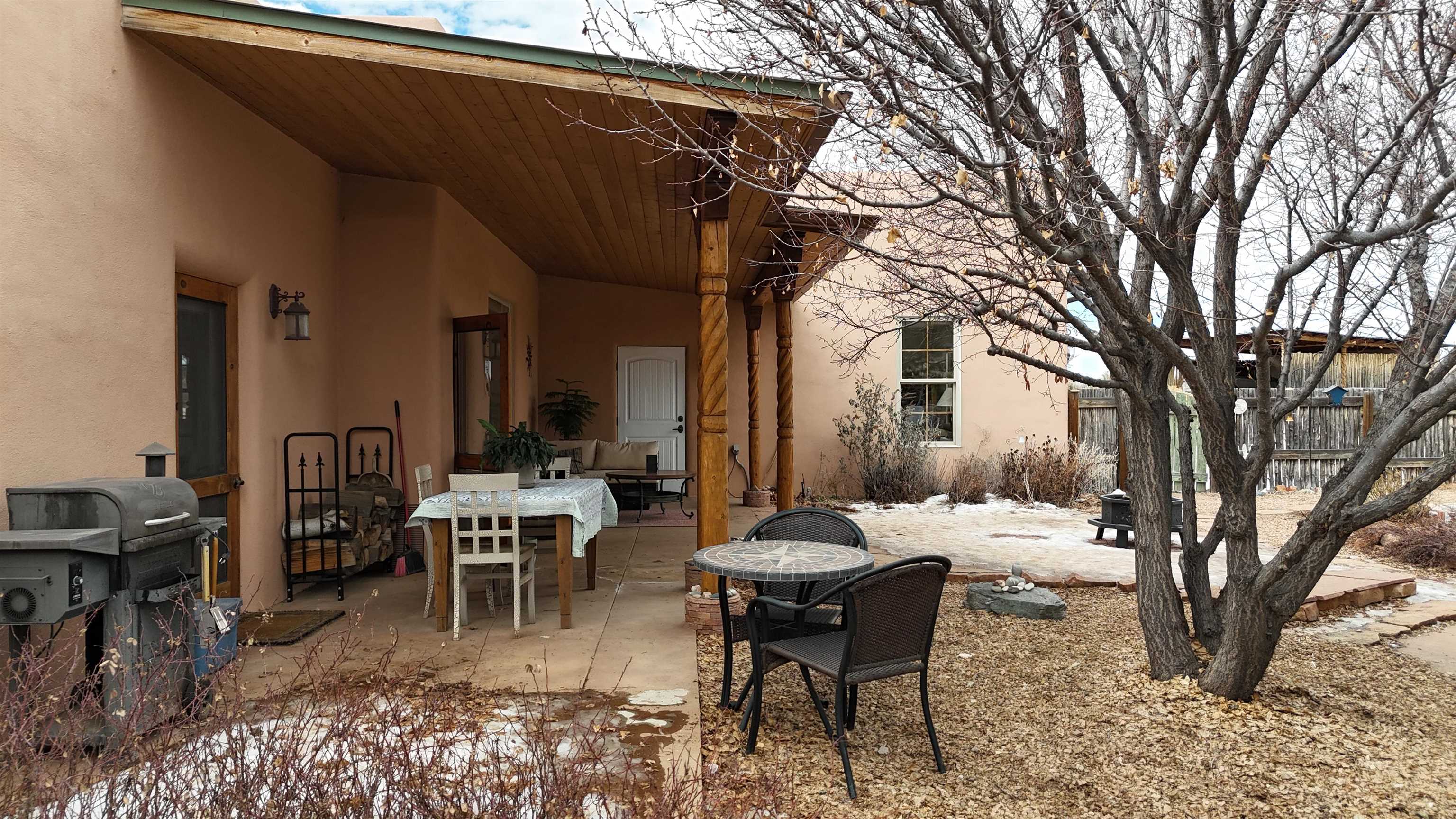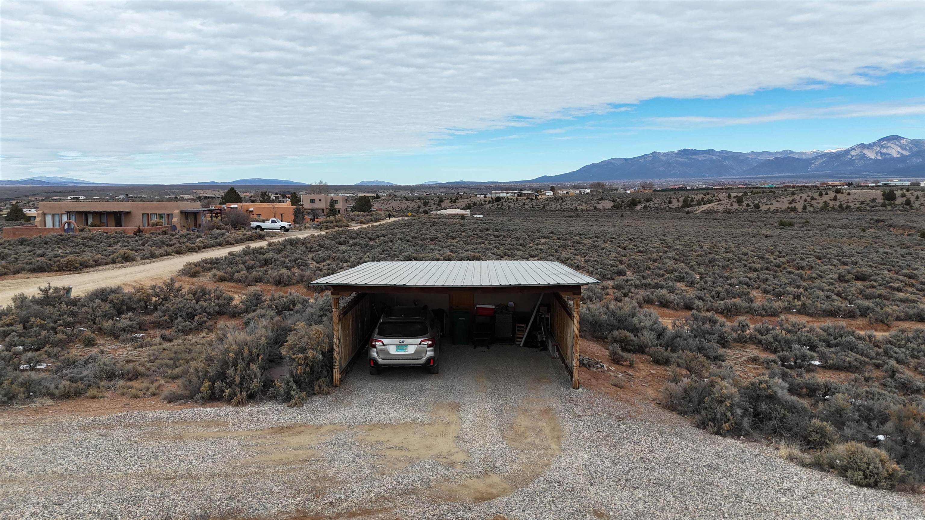 SUNNY, SERENE AND TOTALLY SOUTHWEST! Classic Southwest design meets thoughtful living in this artistically crafted, solar-oriented 3 bedroom, 2 bath home in the desirable Vista Linda Subdivision — just minutes from town and near the Taos Country Club. Built by Ecobuilders using sustainable materials, this residence embraces true Northern New Mexico style with hand-troweled natural tinted plaster walls, traditional vigas and tongue-and-groove ceilings, and warm earth-toned tile floors that glow in the natural light. The open floor plan flows effortlessly between the spacious living room, kitchen, and dining area-- ideal for dinner parties, holiday tamale-making, or simply admiring your excellent taste. The beautiful wood-burning fireplace anchors the living space with timeless Southwest character. The radial vigas over the dining room add a subtle drama that whispers "yes-- I'm fabulous." The kitchen is well-equipped with gas oven, gas range, dishwasher, refrigerator, generous panty and separate laundry room. The primary suite is full of light and luxury, with copper sinks, jumbo walk-in closet and direct access to the backyard and hot tub. (Morning coffee soak? Late-night stargazing? Both feel appropriate.) Two additional bedrooms and full bath sit off a sunny hallway-- perfect for guests, studio space or a home office you'll pretend you're very disciplined about. Beyond the kitchen is a large north-facing family room with its own sink offering endless flexibilty-- art studio, wet bar, media lounge, creative lab, yoga space... you choose. Soft light, big views, no bad angles. Step outside to a covered portal designed for lingering. Room to dine, room to lounge, room to exhale. Perennial gardens, mature trees, and established landscaping on drip irrigation surrounds the home and softens the natural high-desert setting, creating a peaceful outdoor retreat framed by stunning mountain views. There's even a hot tub for soaking in the views or the star-filled Taos skies-- because sometimes you just need to float and contemplate life choices. Ample parking for entertaining and a detached carport with storage means there's room for guests, gear and outdoor toys. Behind the beauty? Smart design. Passive solar, electric solar panels, pumice exterior wall construction (north, east & west), a private well and a rainwater catchment system with cistern for irrigation reflect forward-thinking, energy-efficient living. Sustainable never looked so good. Located near the Taos Country Club, Slide + Rift hiking + biking trails, and offering convenient access to Pilar and the Rio Grande for rafting, kayaking, and world-class fishing — this home is the perfect balance of Southwest detail, sustainability, and access to the wild beauty that makes Taos.... Taos.
