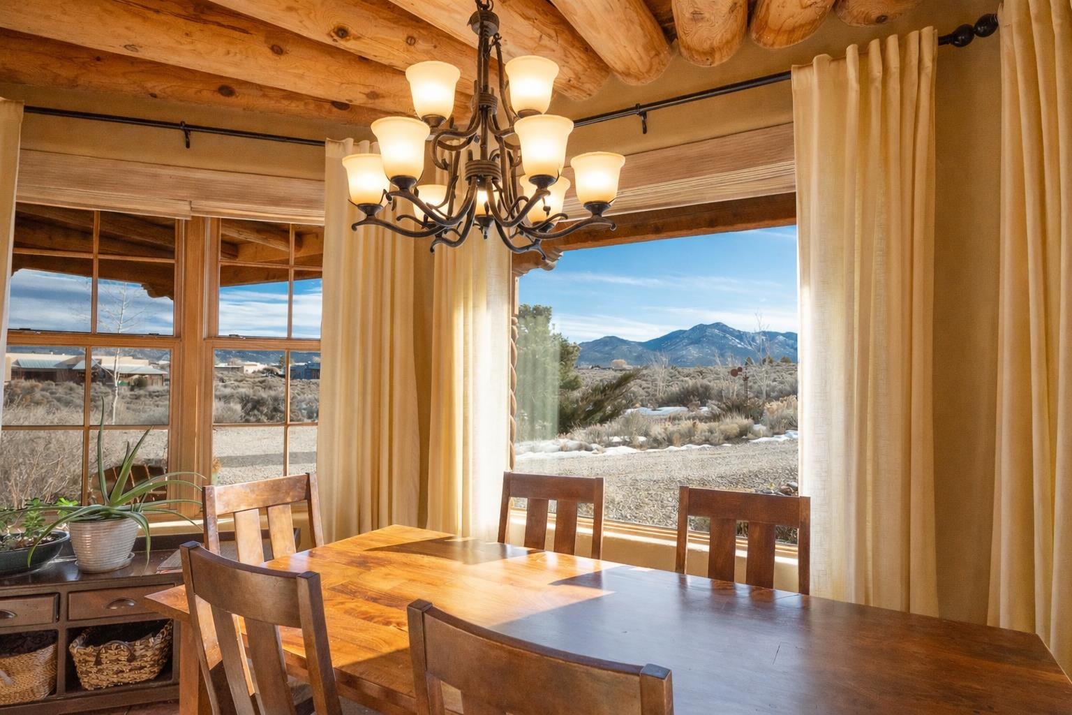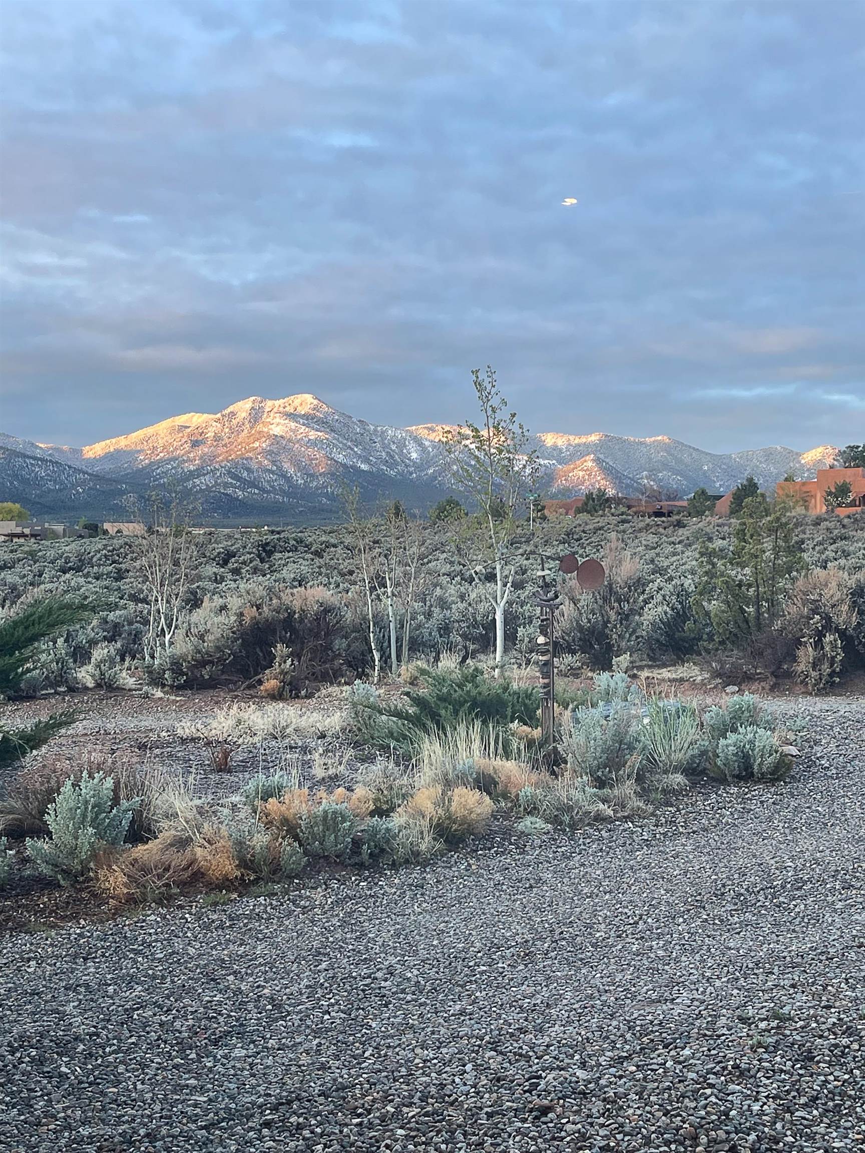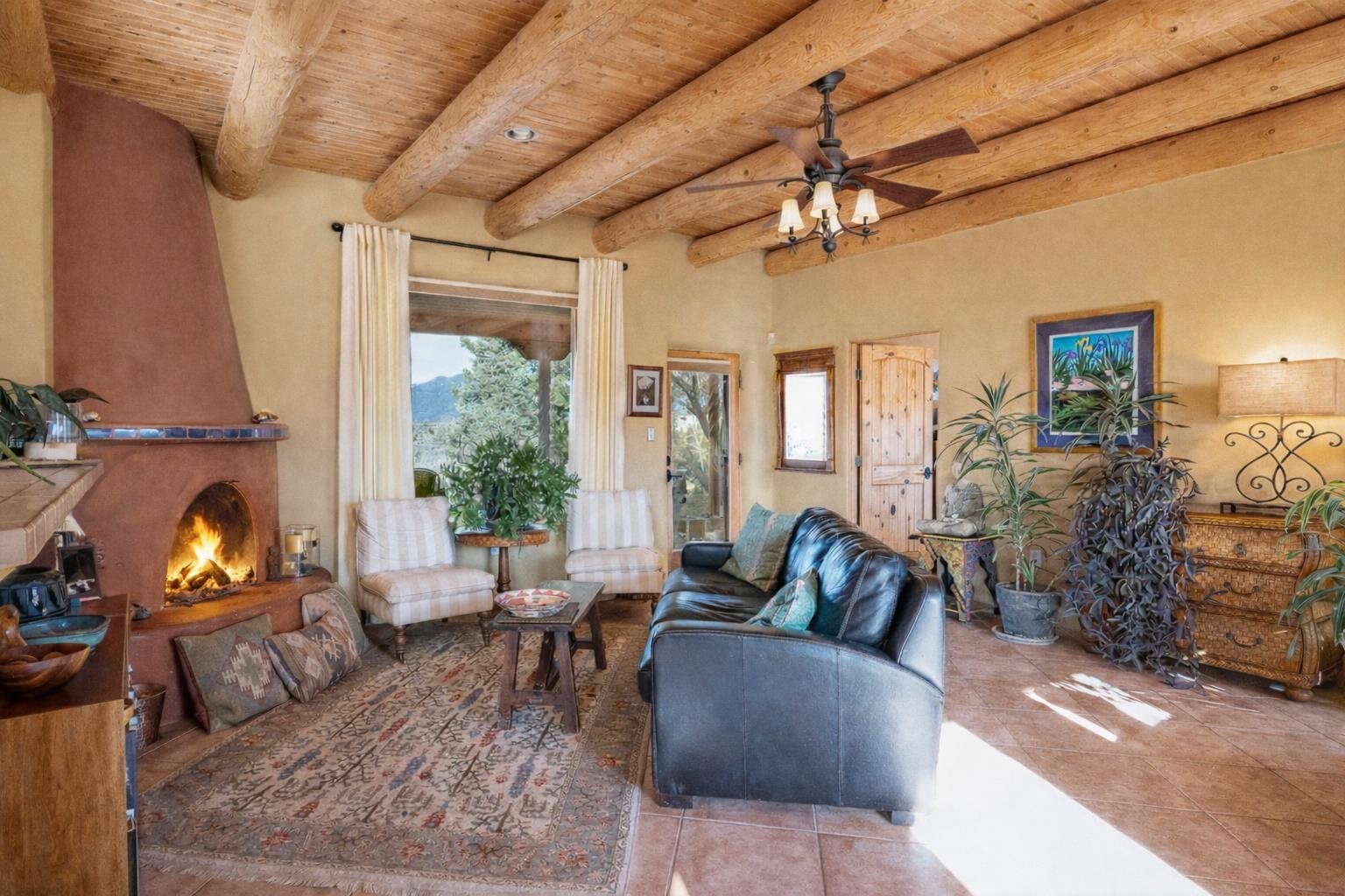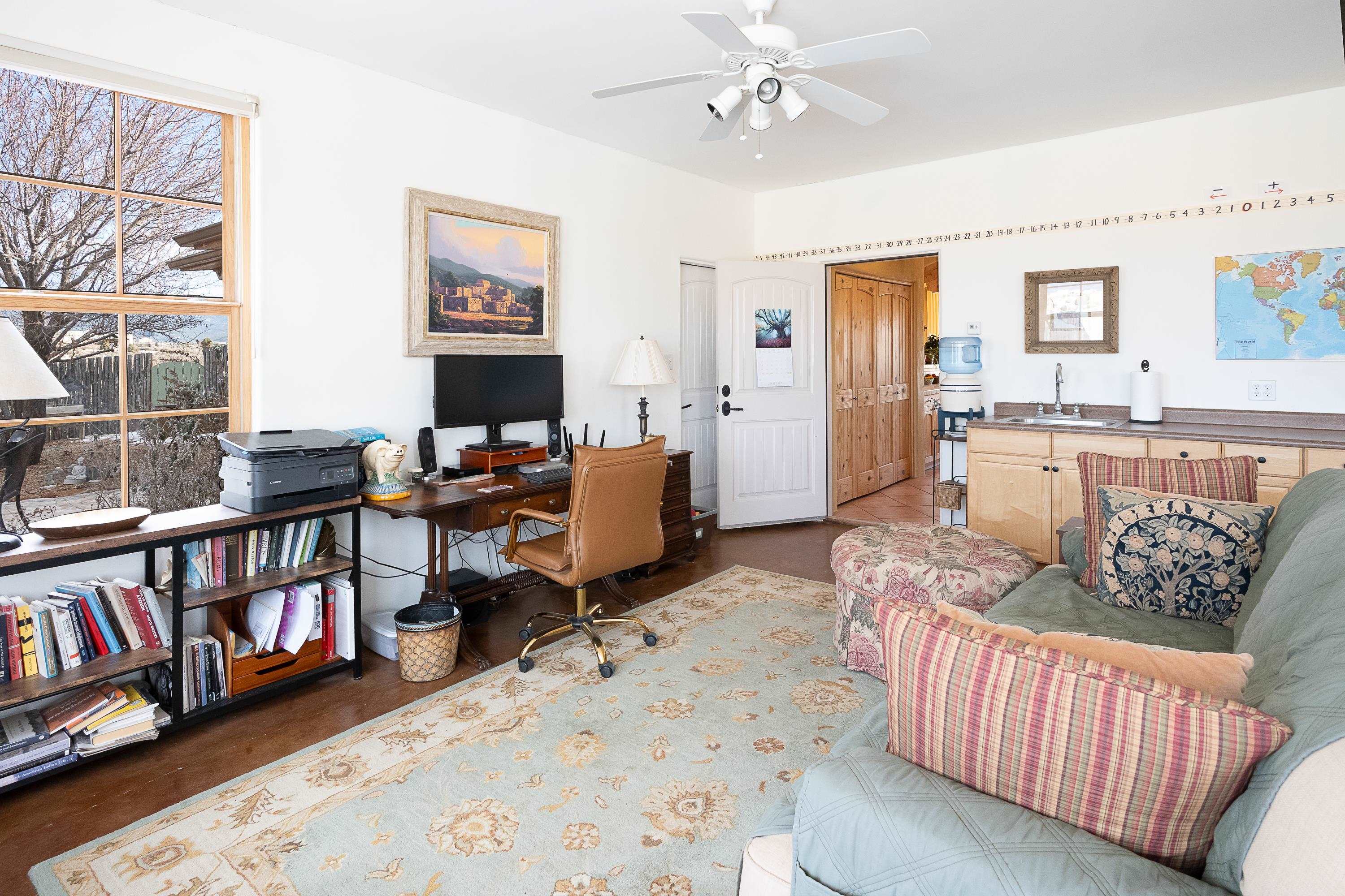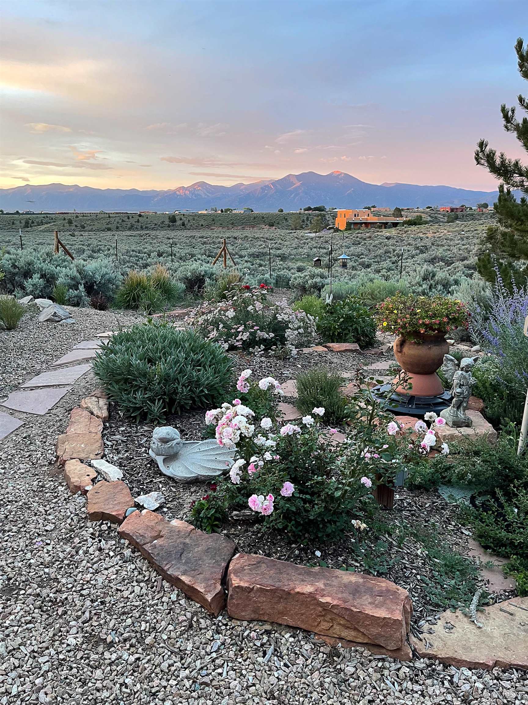 SUNNY, SERENE AND TOTALLY SOUTHWEST! Classic Southwest design meets thoughtful living in this artistically crafted, solar-oriented 3 bedroom, 2 bath home in the desirable Vista Linda Subdivision — just minutes from town and near the Taos Country Club. Built by Ecobuilders using sustainable materials, this residence embraces true Northern New Mexico style with hand-troweled natural tinted plaster walls, traditional vigas and tongue-and-groove ceilings, and warm earth-toned tile floors that glow in the natural light. The open floor plan flows effortlessly between the spacious living room, kitchen, and dining area-- ideal for dinner parties, holiday tamale-making, or simply admiring your excellent taste. The beautiful wood-burning fireplace anchors the living space with timeless Southwest character. The radial vigas over the dining room add a subtle drama that whispers "yes-- I'm fabulous." The kitchen is well-equipped with gas oven, gas range, dishwasher, refrigerator, generous panty and separate laundry room. The primary suite is full of light and luxury, with copper sinks, jumbo walk-in closet and direct access to the backyard and hot tub. (Morning coffee soak? Late-night stargazing? Both feel appropriate.) Two additional bedrooms and full bath sit off a sunny hallway-- perfect for guests, studio space or a home office you'll pretend you're very disciplined about. Beyond the kitchen is a large north-facing family room with its own sink offering endless flexibilty-- art studio, wet bar, media lounge, creative lab, yoga space... you choose. Soft light, big views, no bad angles. Step outside to a covered portal designed for lingering. Room to dine, room to lounge, room to exhale. Perennial gardens, mature trees, and established landscaping on drip irrigation surrounds the home and softens the natural high-desert setting, creating a peaceful outdoor retreat framed by stunning mountain views. There's even a hot tub for soaking in the views or the star-filled Taos skies-- because sometimes you just need to float and contemplate life choices. Ample parking for entertaining and a detached carport with storage means there's room for guests, gear and outdoor toys. Behind the beauty? Smart design. Passive solar, electric solar panels, pumice exterior wall construction (north, east & west), a private well and a rainwater catchment system with cistern for irrigation reflect forward-thinking, energy-efficient living. Sustainable never looked so good. Located near the Taos Country Club, Slide + Rift hiking + biking trails, and offering convenient access to Pilar and the Rio Grande for rafting, kayaking, and world-class fishing — this home is the perfect balance of Southwest detail, sustainability, and access to the wild beauty that makes Taos.... Taos.
