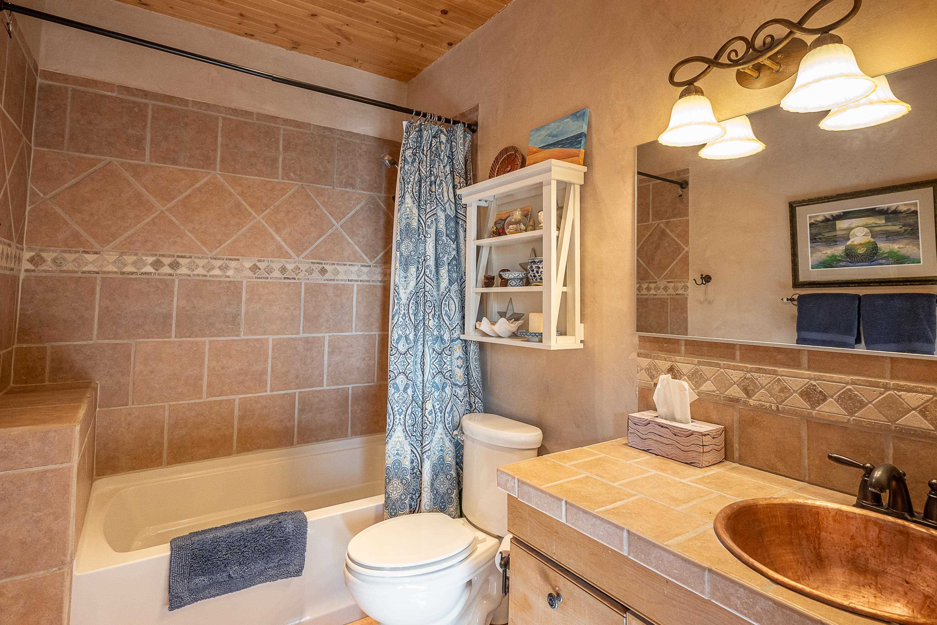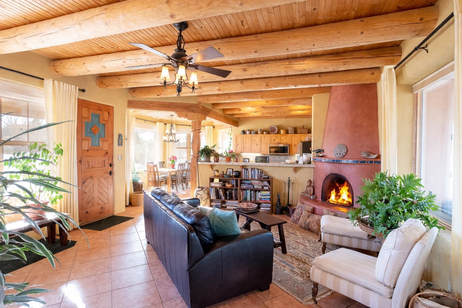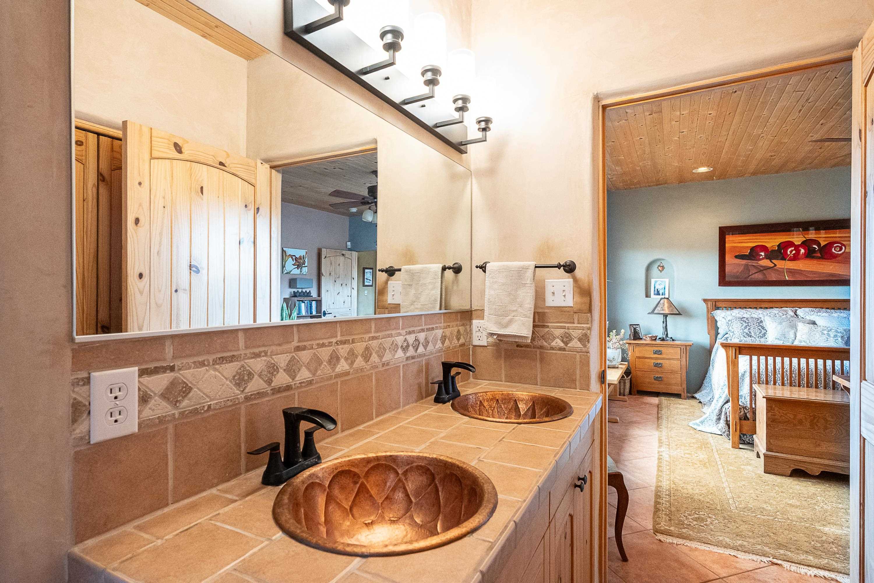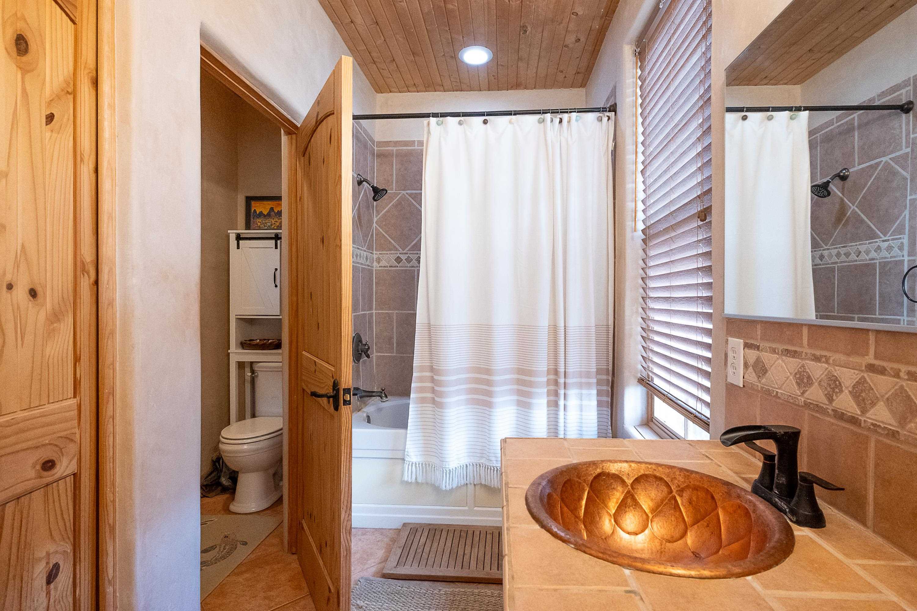 SUNNY, SERENE AND TOTALLY SOUTHWEST! Classic Southwest design meets thoughtful living in this artistically crafted, solar-oriented 3 bedroom, 2 bath home in the desirable Vista Linda Subdivision — just minutes from town and near the Taos Country Club. Built by Ecobuilders using sustainable materials, this residence embraces true Northern New Mexico style with hand-troweled natural tinted plaster walls, traditional vigas and tongue-and-groove ceilings, and warm earth-toned tile floors that glow in the natural light. The open floor plan flows effortlessly between the spacious living room, kitchen, and dining area-- ideal for dinner parties, holiday tamale-making, or simply admiring your excellent taste. The beautiful wood-burning fireplace anchors the living space with timeless Southwest character. The radial vigas over the dining room add a subtle drama that whispers "yes-- I'm fabulous." The kitchen is well-equipped with gas oven, gas range, dishwasher, refrigerator, generous panty and separate laundry room. The primary suite is full of light and luxury, with copper sinks, jumbo walk-in closet and direct access to the backyard and hot tub. (Morning coffee soak? Late-night stargazing? Both feel appropriate.) Two additional bedrooms and full bath sit off a sunny hallway-- perfect for guests, studio space or a home office you'll pretend you're very disciplined about. Beyond the kitchen is a large north-facing family room with its own sink offering endless flexibilty-- art studio, wet bar, media lounge, creative lab, yoga space... you choose. Soft light, big views, no bad angles. Step outside to a covered portal designed for lingering. Room to dine, room to lounge, room to exhale. Perennial gardens, mature trees, and established landscaping on drip irrigation surrounds the home and softens the natural high-desert setting, creating a peaceful outdoor retreat framed by stunning mountain views. There's even a hot tub for soaking in the views or the star-filled Taos skies-- because sometimes you just need to float and contemplate life choices. Ample parking for entertaining and a detached carport with storage means there's room for guests, gear and outdoor toys. Behind the beauty? Smart design. Passive solar, electric solar panels, pumice exterior wall construction (north, east & west), a private well and a rainwater catchment system with cistern for irrigation reflect forward-thinking, energy-efficient living. Sustainable never looked so good. Located near the Taos Country Club, Slide + Rift hiking + biking trails, and offering convenient access to Pilar and the Rio Grande for rafting, kayaking, and world-class fishing — this home is the perfect balance of Southwest detail, sustainability, and access to the wild beauty that makes Taos.... Taos.