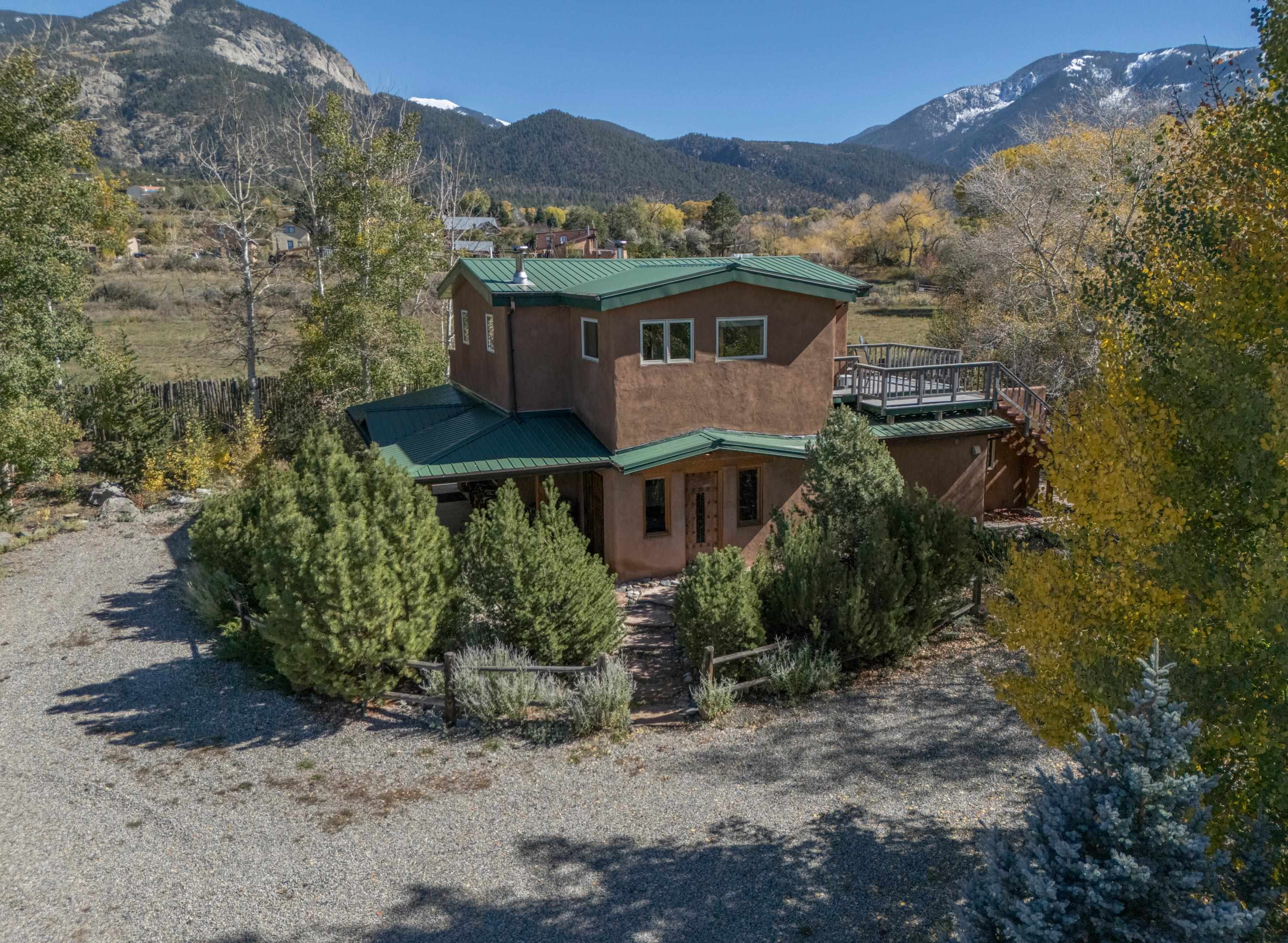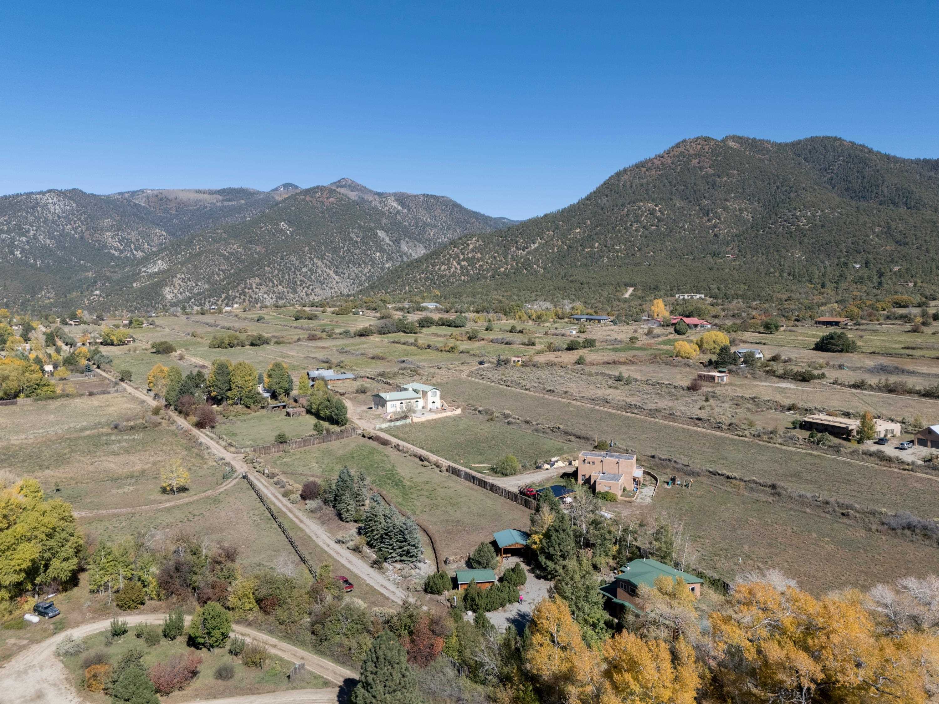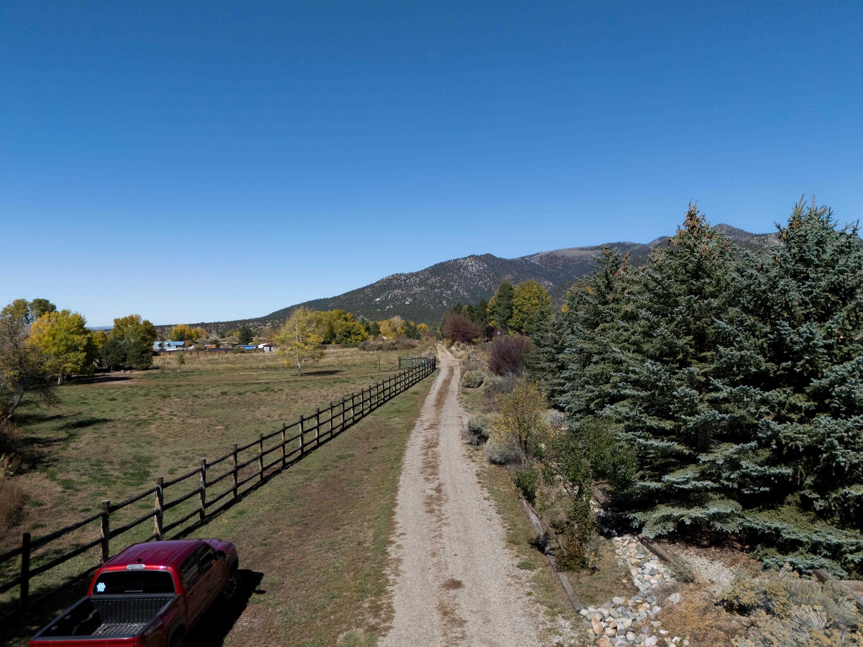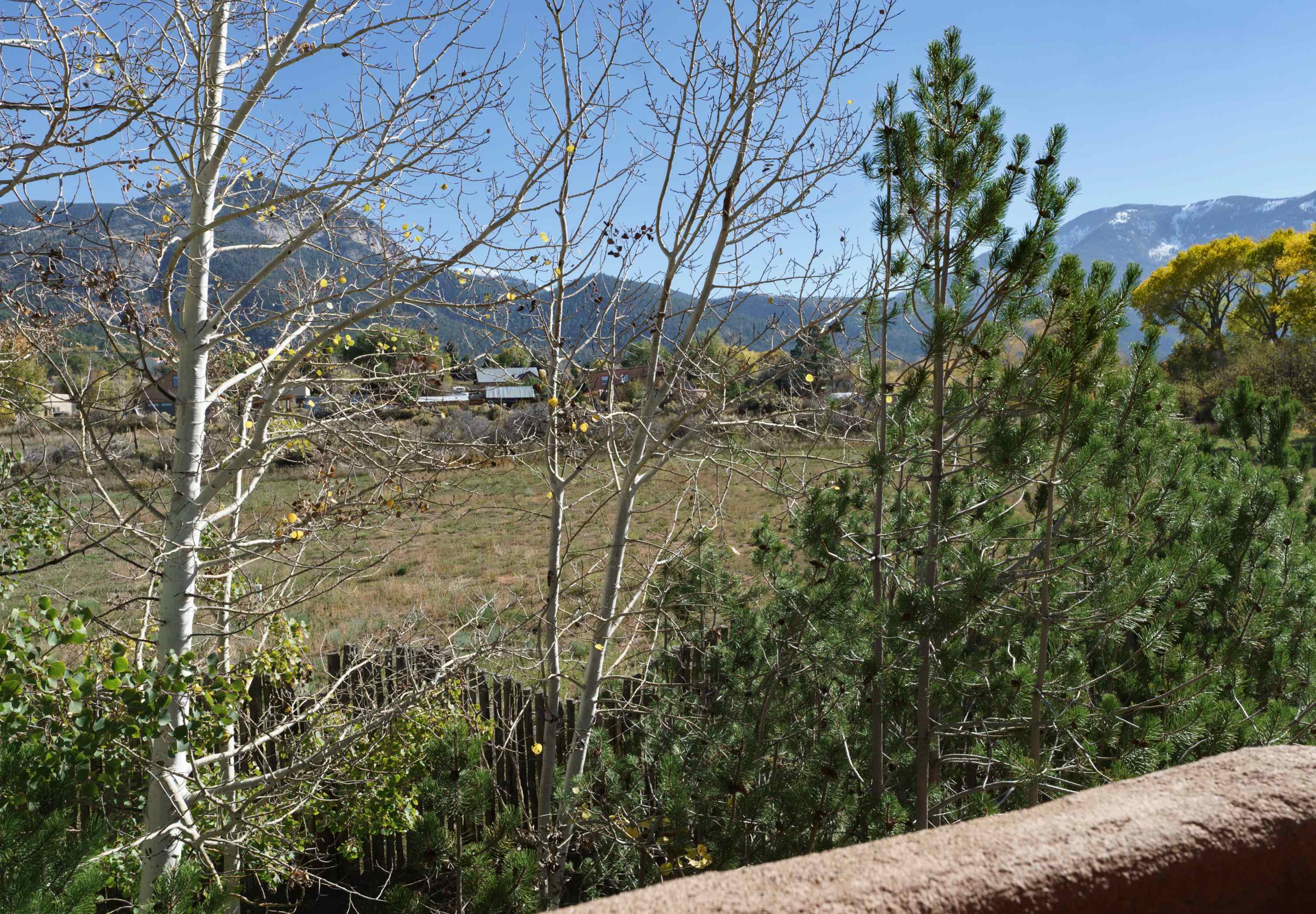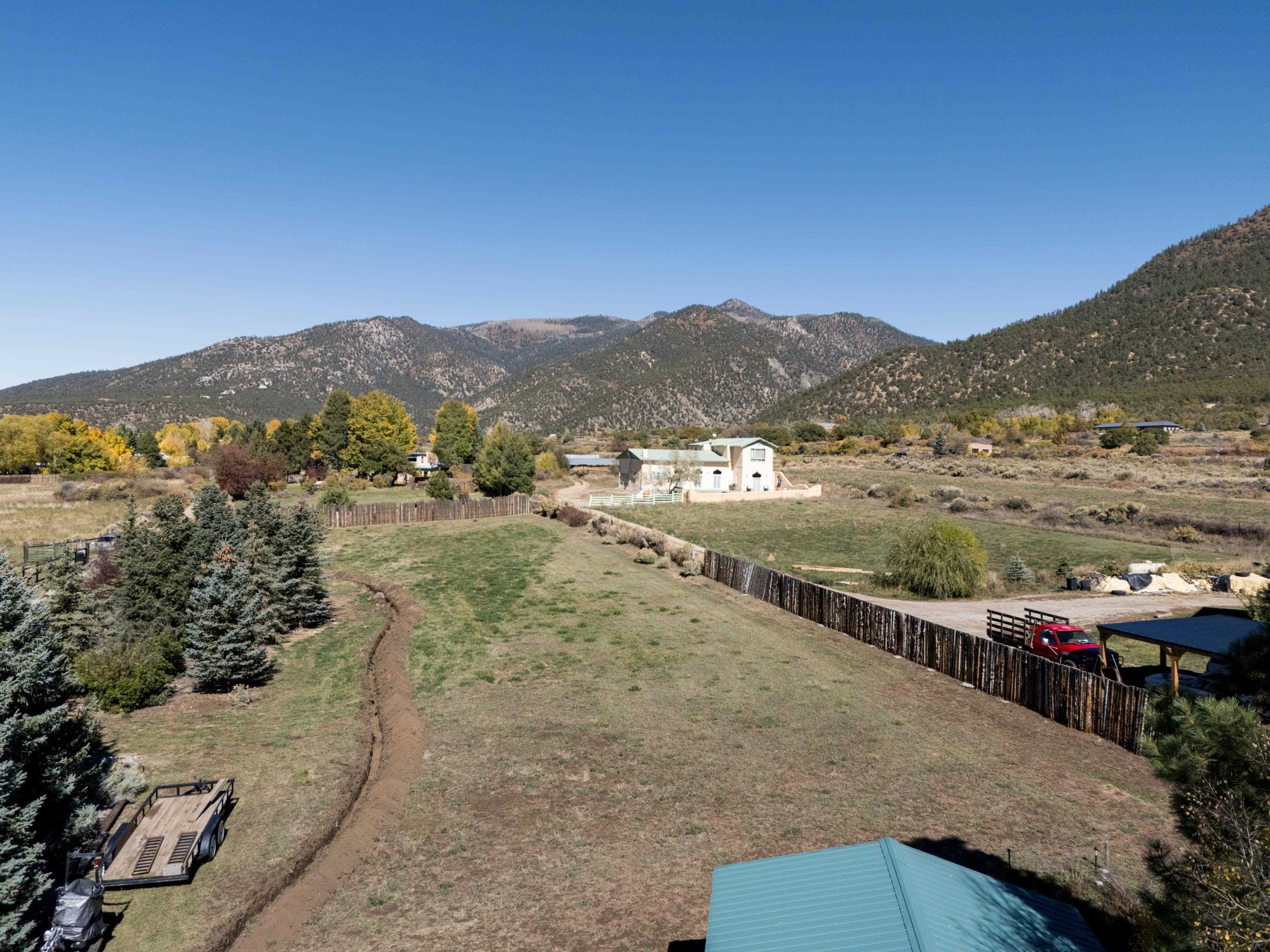Location and privacy, beautiful land and live water, end of the road paradise with big trees and an irrigated pasture This home has large mountain views with a covered patio and a large upstairs deck The exterior doors are beautifully handcrafted and the large covered porch is an inviting entry into this El Salto abode. This sweet home has a spacious open floorplan and lots of windows in the living and dining areas. A large downstairs primary suite includes a small attached office/media area which could also be used as a sleeping nook. The big downstairs bathroom may also be accessed through the entry hallway. The very unique and beautifully crafted mahogany spiral staircase leads to another entry area upstairs which could be used for an office, library or media area. The two l bedrooms upstairs have amazing views of El Salto Mountain. A very large bathroom is shared by both bedrooms and includes a large tub perfect for after ski adventures. There is a walk in closet between the two rooms. The upstairs deck is a wonderful place to gather and enjoy the big westerly views and the gorgeous acreage which includes many aspen and cottonwood as well as fir, spruce, and pine trees. There are lovely flagstone paths on the property and the acreage has lots of frontage on the Acequia Madre. The property includes a very nice shed and a two car wooden carport. The land has split rail, wire and latilla fencing. This is a must see home in a private and spectacular setting.