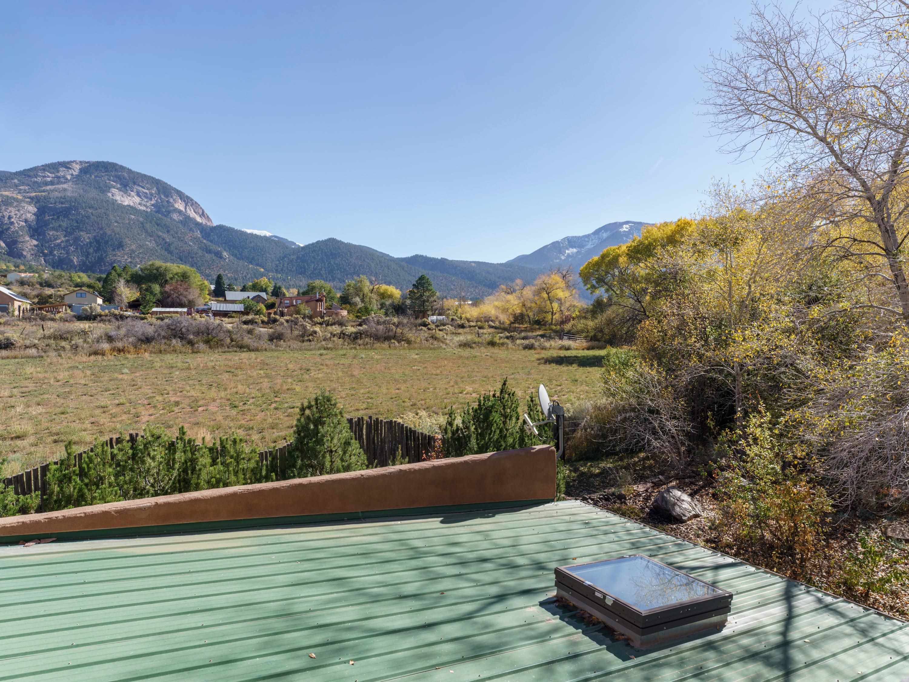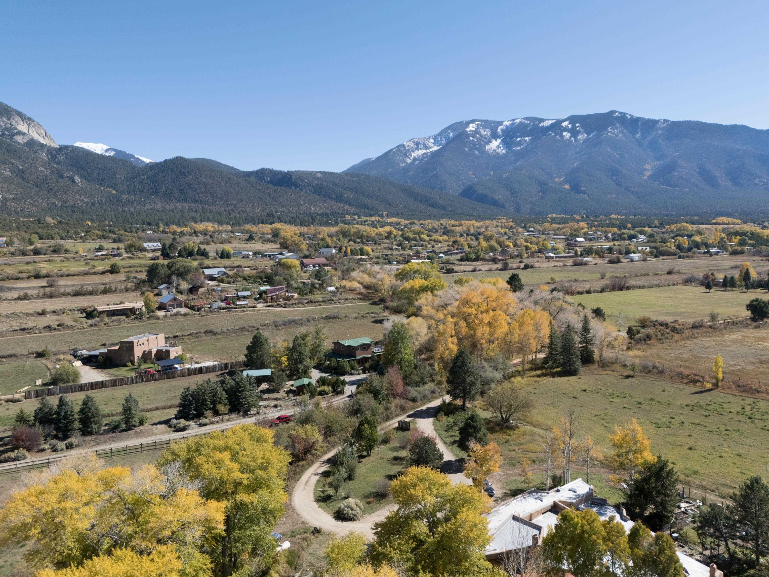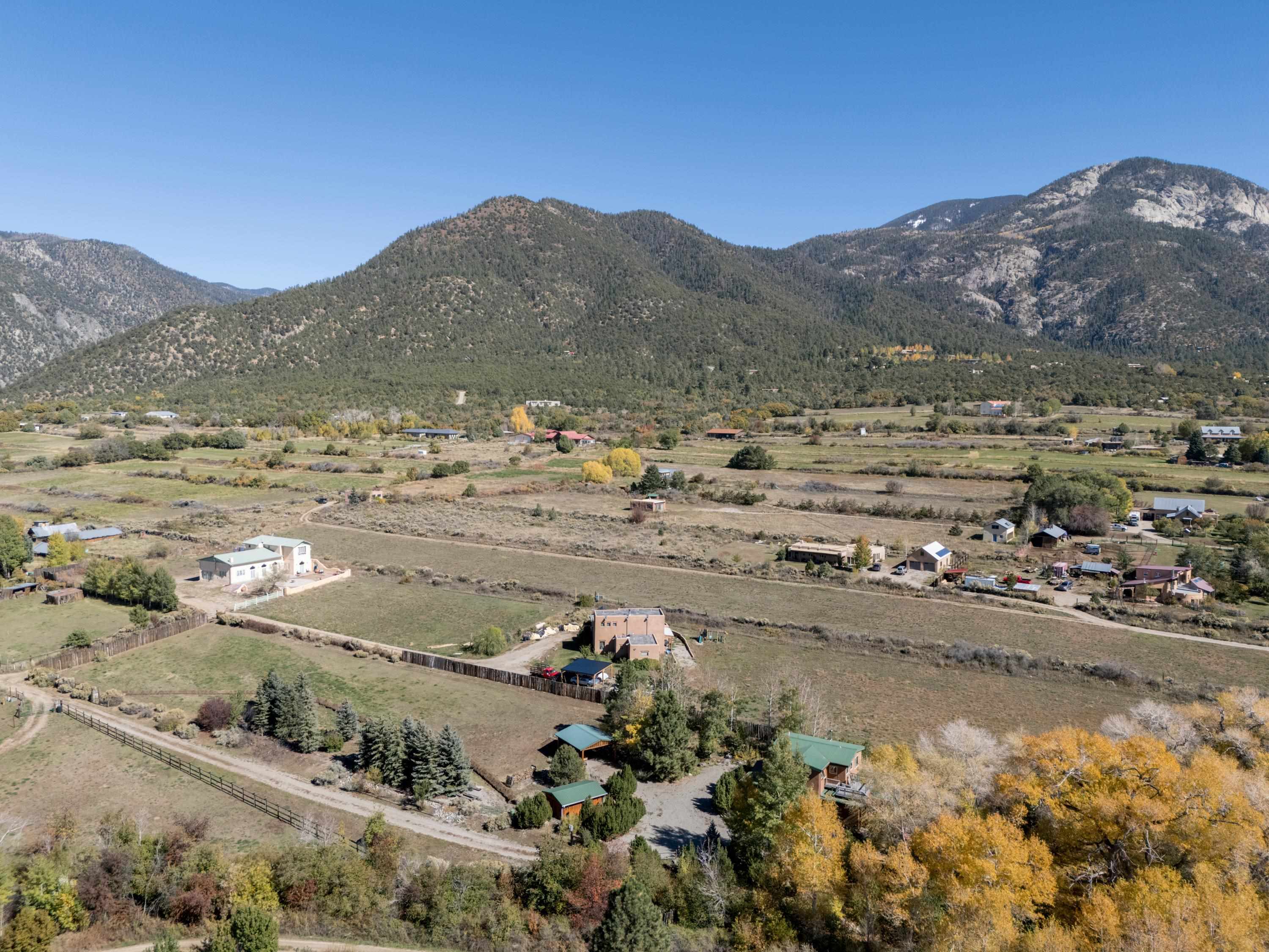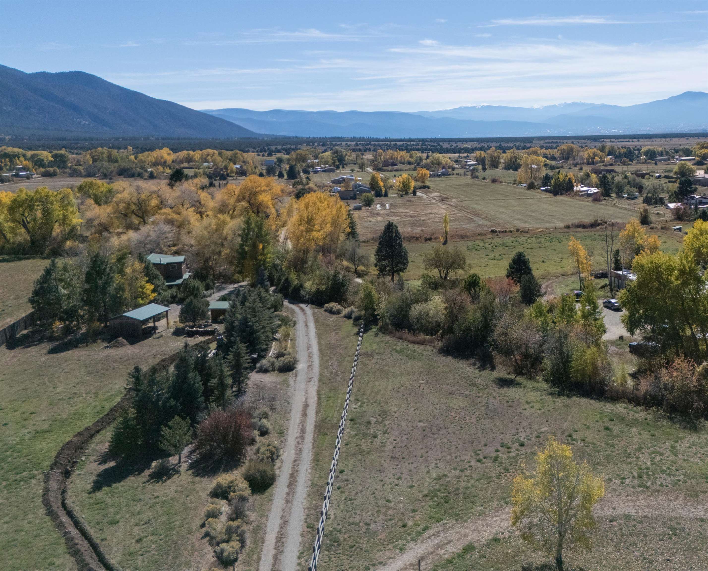 Location and privacy, beautiful land and live water, end of the road paradise with big trees and an irrigated pasture This home has large mountain views with a covered patio and a large upstairs deck The exterior doors are beautifully handcrafted and the large covered porch is an inviting entry into this El Salto abode. This sweet home has a spacious open floorplan and lots of windows in the living and dining areas. A large downstairs primary suite includes a small attached office/media area which could also be used as a sleeping nook. The big downstairs bathroom may also be accessed through the entry hallway. The very unique and beautifully crafted mahogany spiral staircase leads to another entry area upstairs which could be used for an office, library or media area. The two l bedrooms upstairs have amazing views of El Salto Mountain. A very large bathroom is shared by both bedrooms and includes a large tub perfect for after ski adventures. There is a walk in closet between the two rooms. The upstairs deck is a wonderful place to gather and enjoy the big westerly views and the gorgeous acreage which includes many aspen and cottonwood as well as fir, spruce, and pine trees. There are lovely flagstone paths on the property and the acreage has lots of frontage on the Acequia Madre. The property includes a very nice shed and a two car wooden carport. The land has split rail, wire and latilla fencing. This is a must see home in a private and spectacular setting.