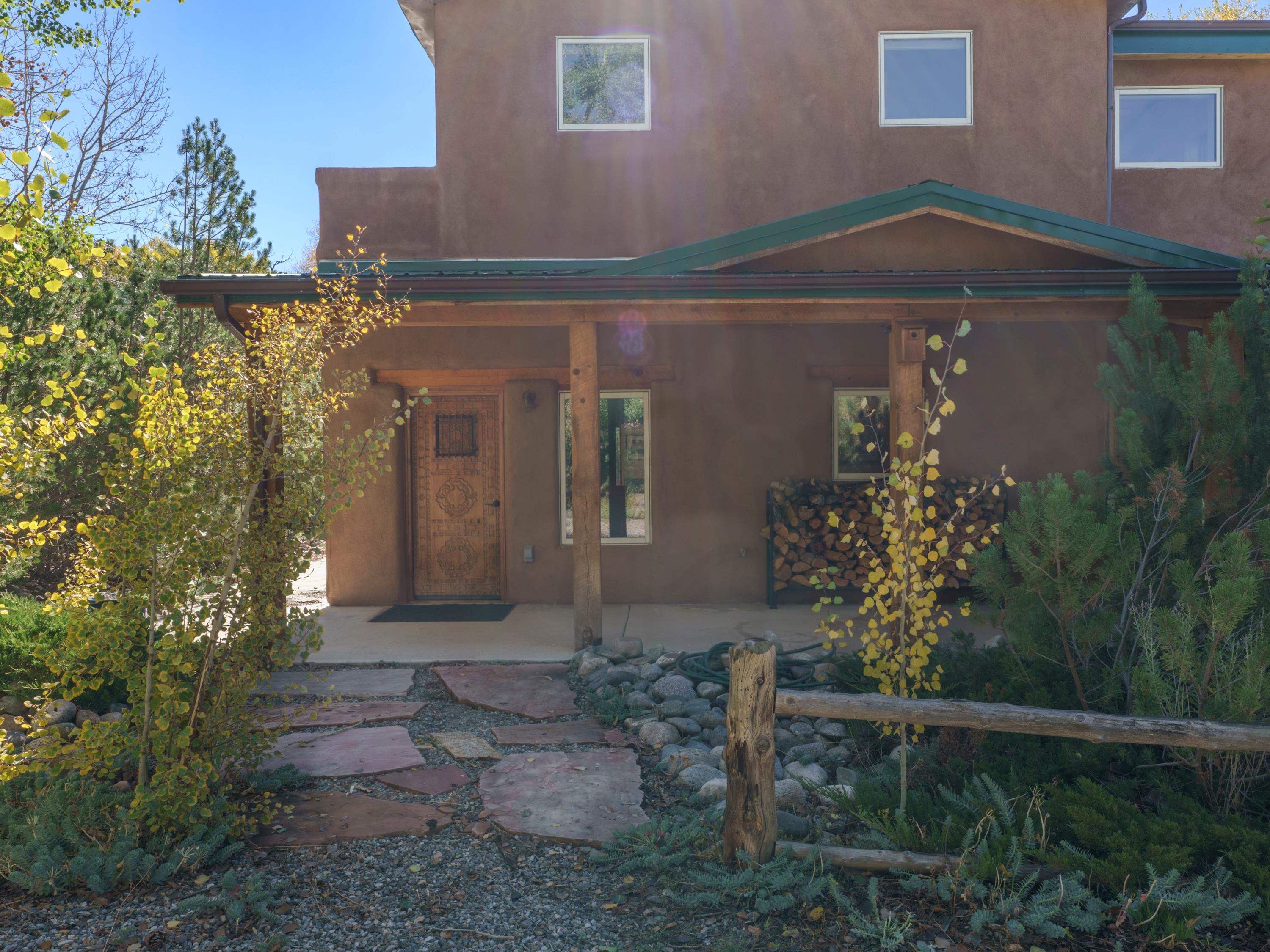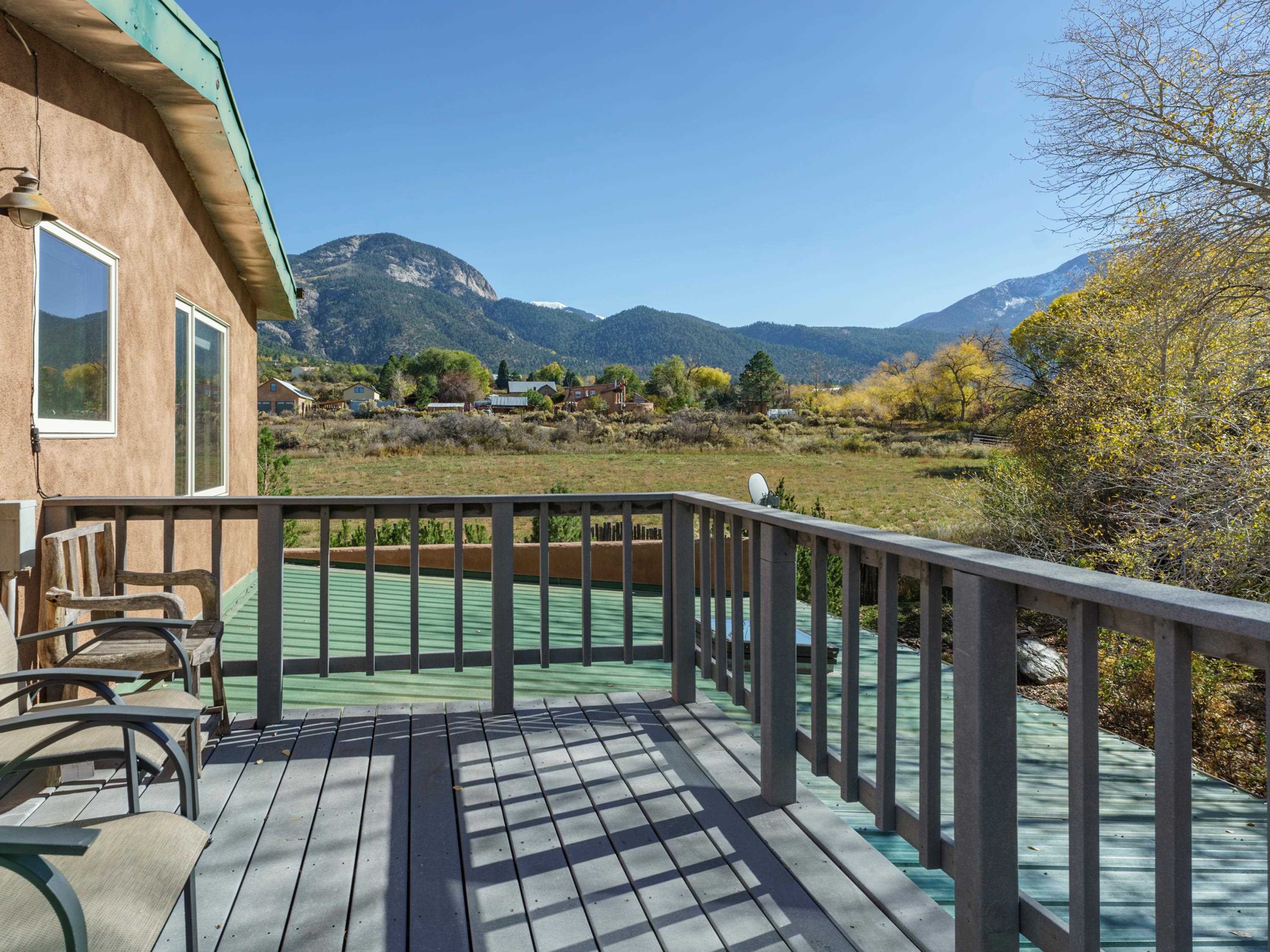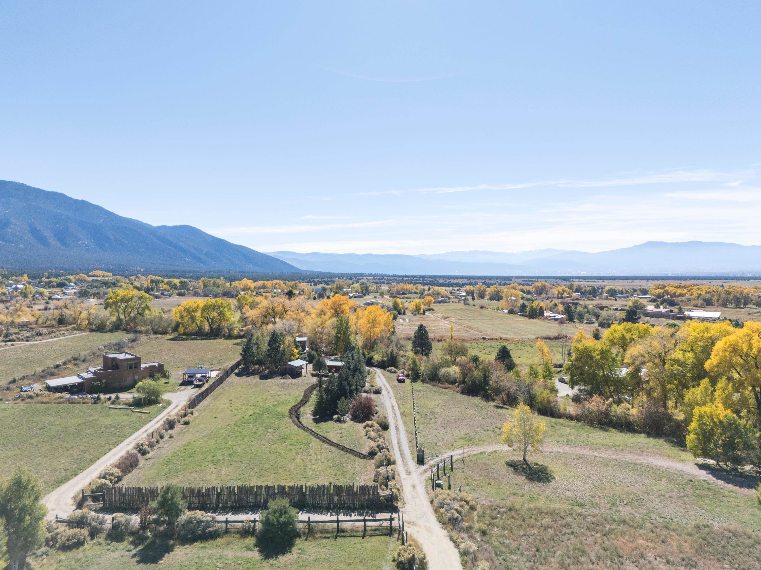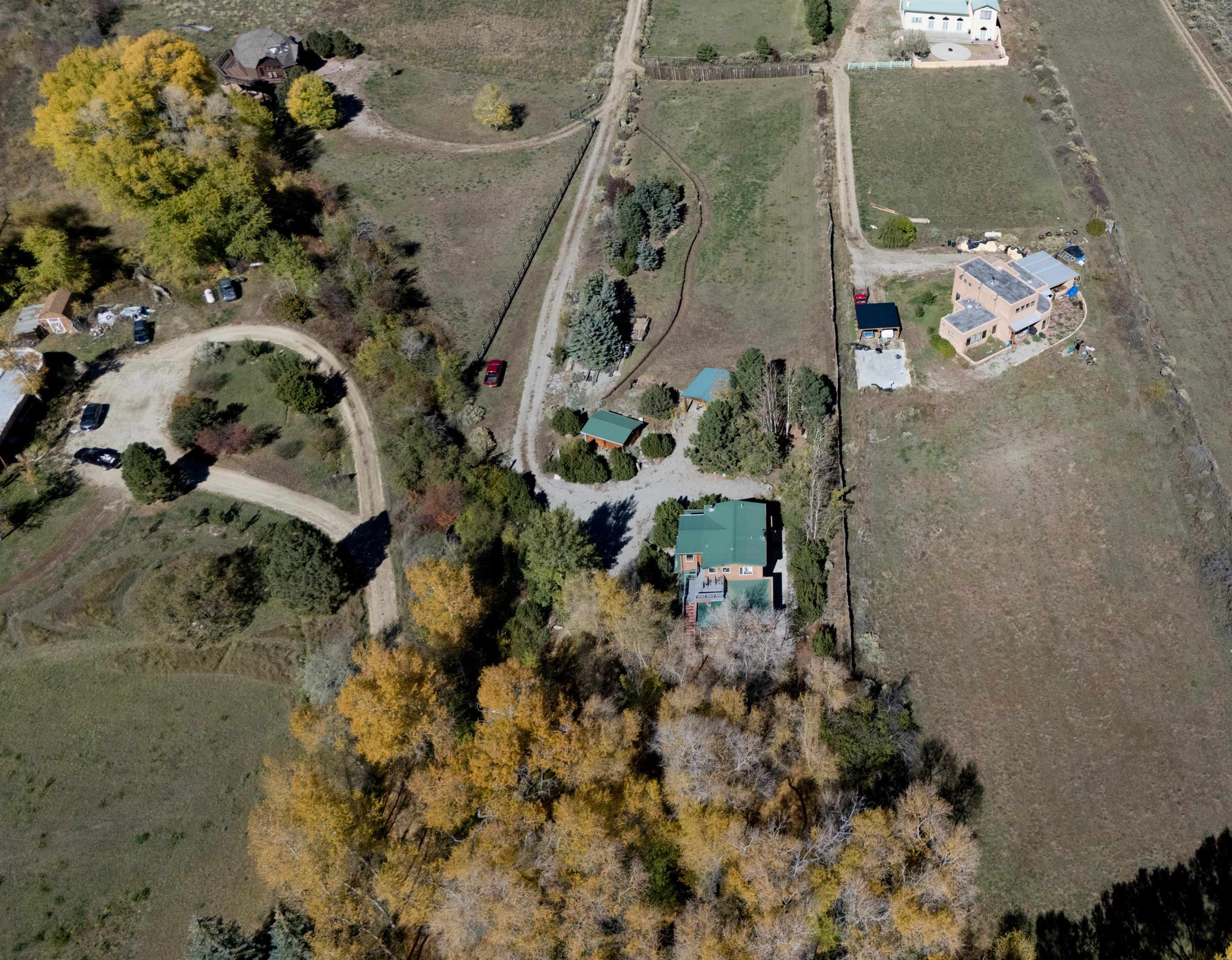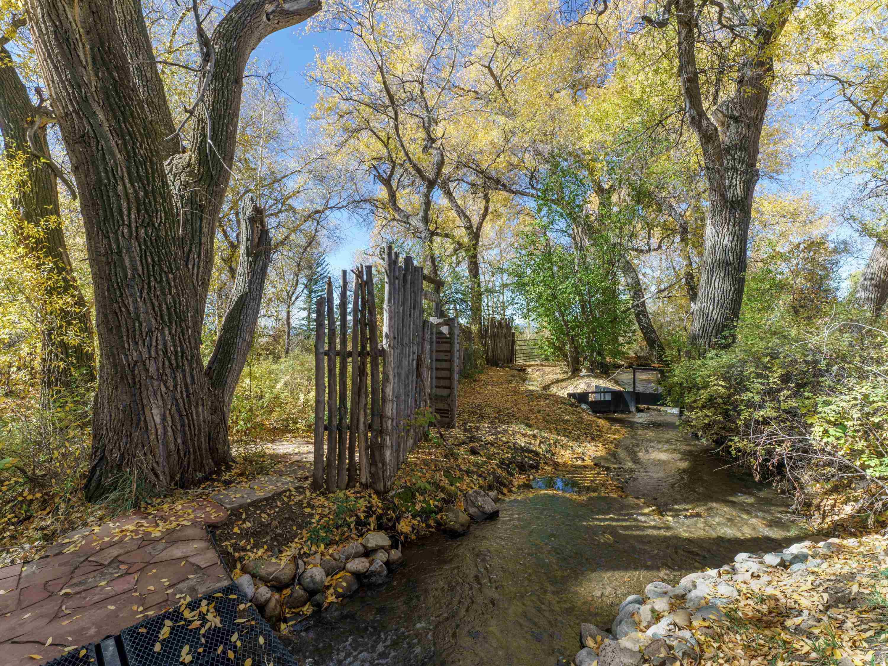Location and privacy, beautiful land and live water, end of the road paradise with big trees and an irrigated pasture This home has large mountain views with a covered patio and a large upstairs deck The exterior doors are beautifully handcrafted and the large covered porch is an inviting entry into this El Salto abode. This sweet home has a spacious open floorplan and lots of windows in the living and dining areas. A large downstairs primary suite includes a small attached office/media area which could also be used as a sleeping nook. The big downstairs bathroom may also be accessed through the entry hallway. The very unique and beautifully crafted mahogany spiral staircase leads to another entry area upstairs which could be used for an office, library or media area. The two l bedrooms upstairs have amazing views of El Salto Mountain. A very large bathroom is shared by both bedrooms and includes a large tub perfect for after ski adventures. There is a walk in closet between the two rooms. The upstairs deck is a wonderful place to gather and enjoy the big westerly views and the gorgeous acreage which includes many aspen and cottonwood as well as fir, spruce, and pine trees. There are lovely flagstone paths on the property and the acreage has lots of frontage on the Acequia Madre. The property includes a very nice shed and a two car wooden carport. The land has split rail, wire and latilla fencing. This is a must see home in a private and spectacular setting.