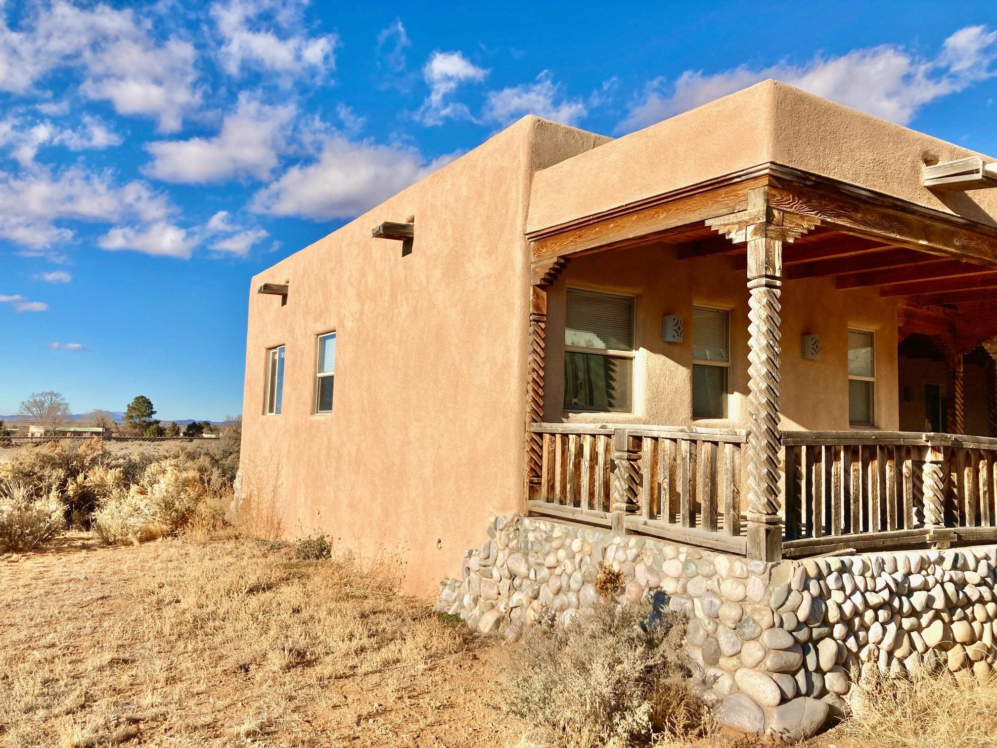 Beautiful 3 bedroom & 3 bathroom home, appx 1,490 sf, offering privacy & serenity at the end of a quiet cul-de-sac in convenient South Taos. Open, airy design features rough-sawn, corbelled pine beams, T&G ceilings, hardwood & Saltillo tile floors, and tiled baths. New roof installed 2025. Quiet hydronic boiler heating. Three sets of double doors connect to a spacious wrap-around covered porch with views. Light-filled kitchen and Living Room have views of the northern mountains & western mesa. The warm living room opens to the porch. Two bedrooms with private double door deck access, the third has southern views.. Close to shopping, dining, entertainment & medical care. Your perfect Taos escape—schedule a tour today! Seller will consider Seller Financing.