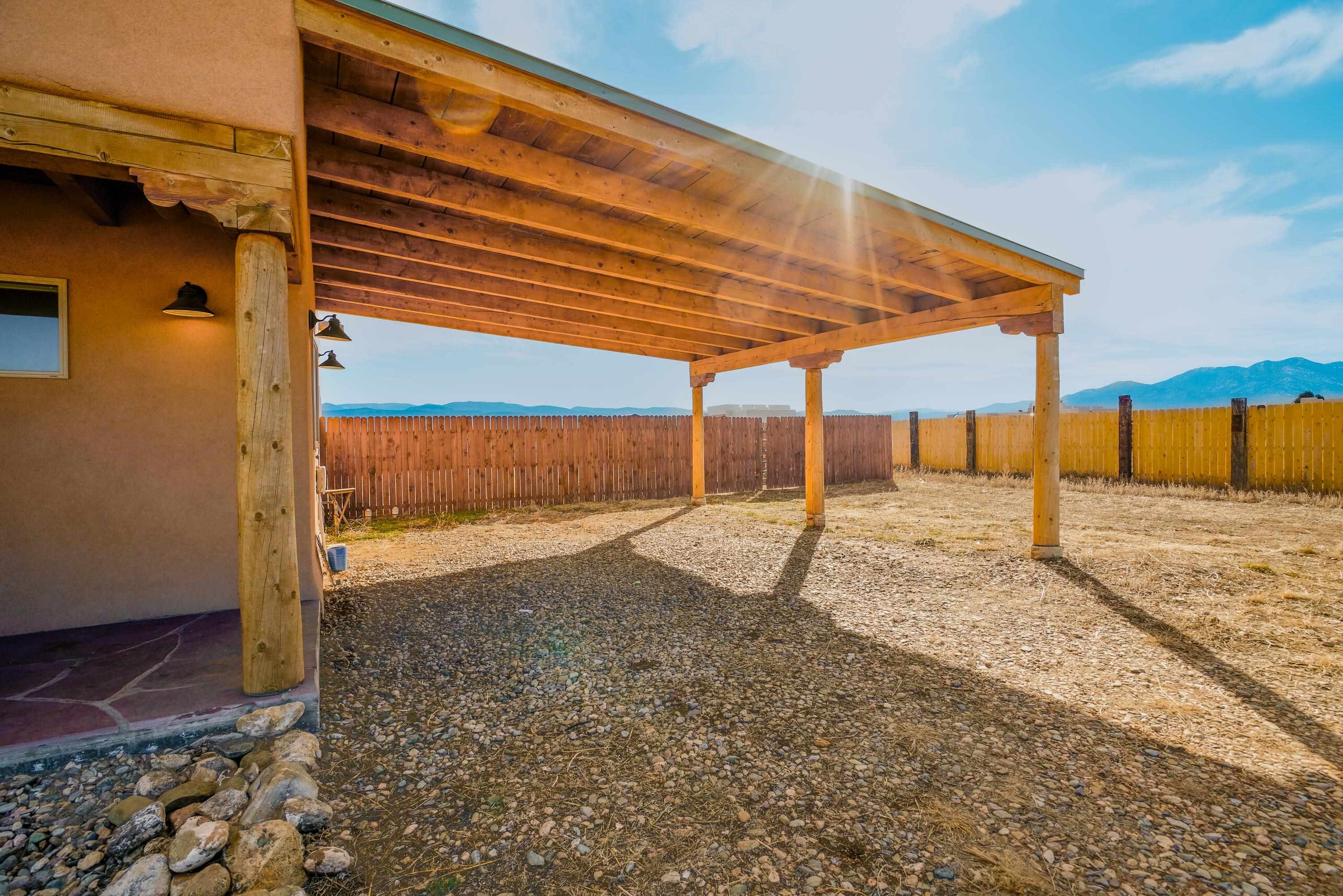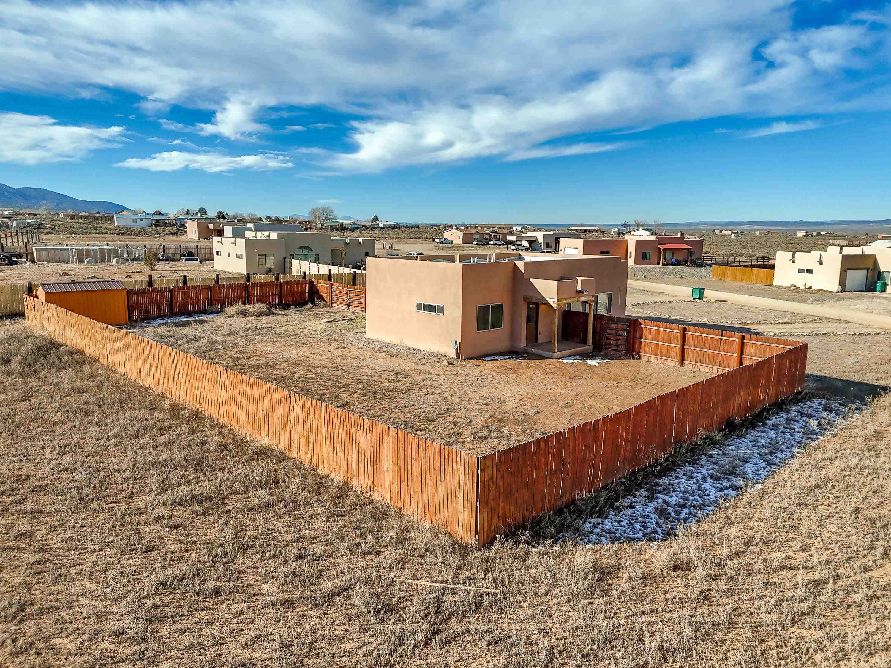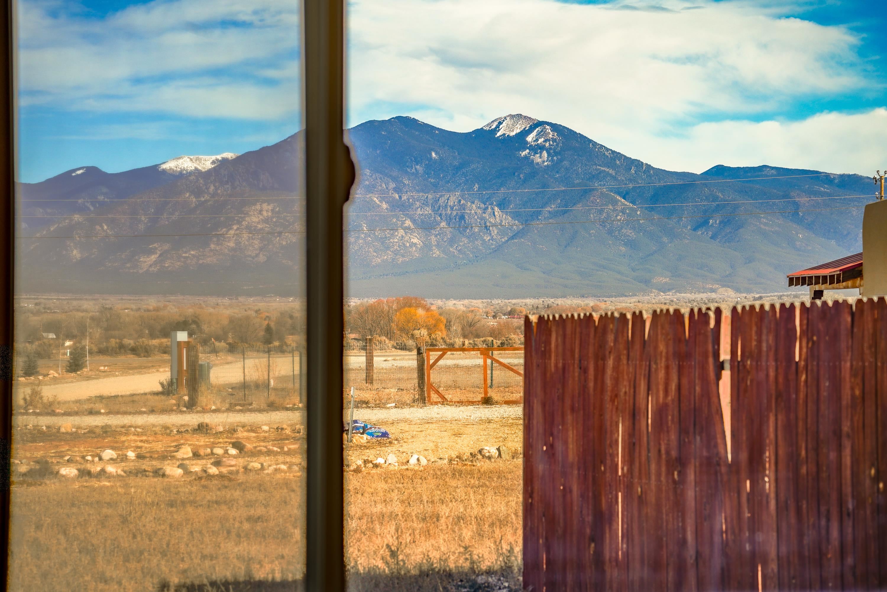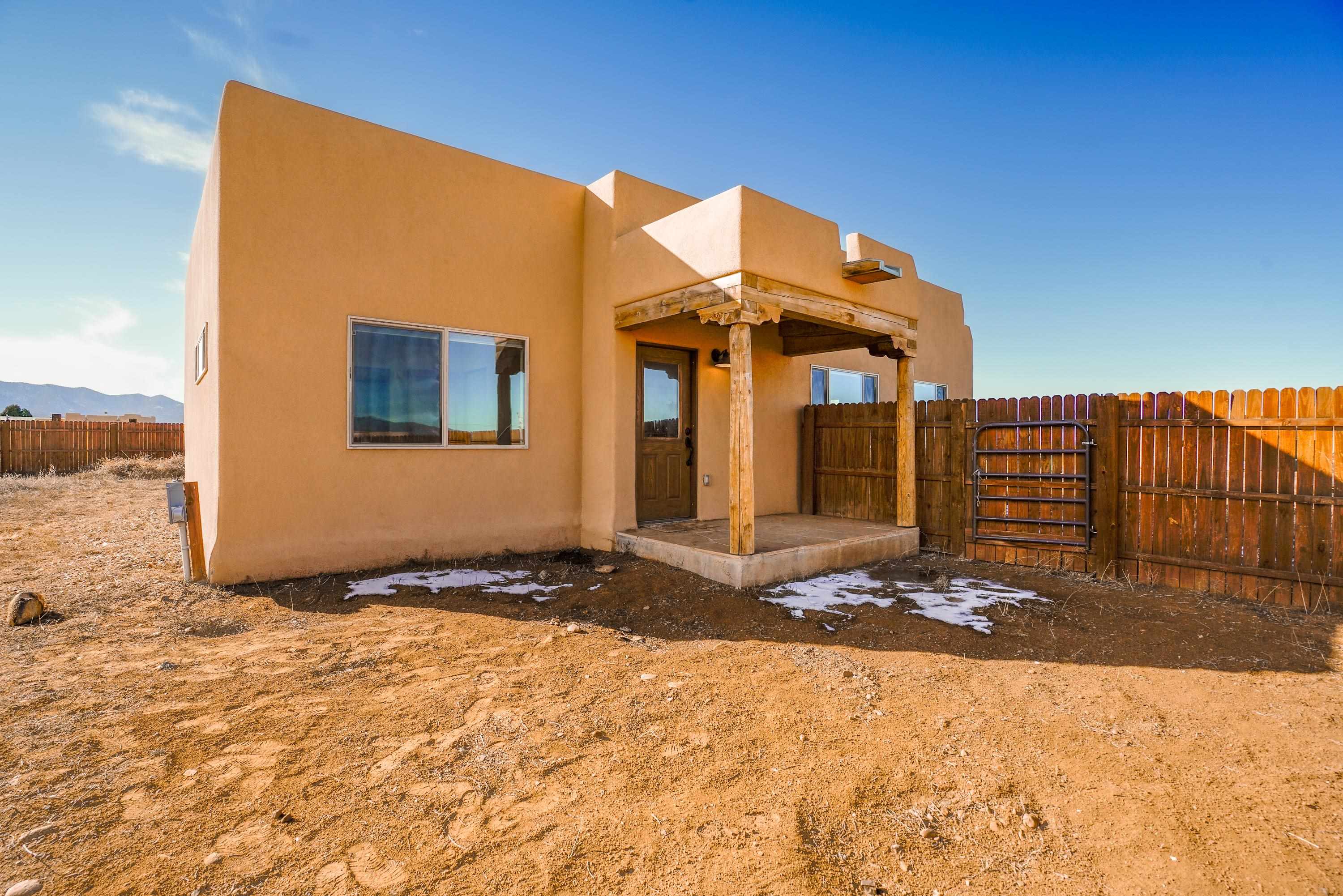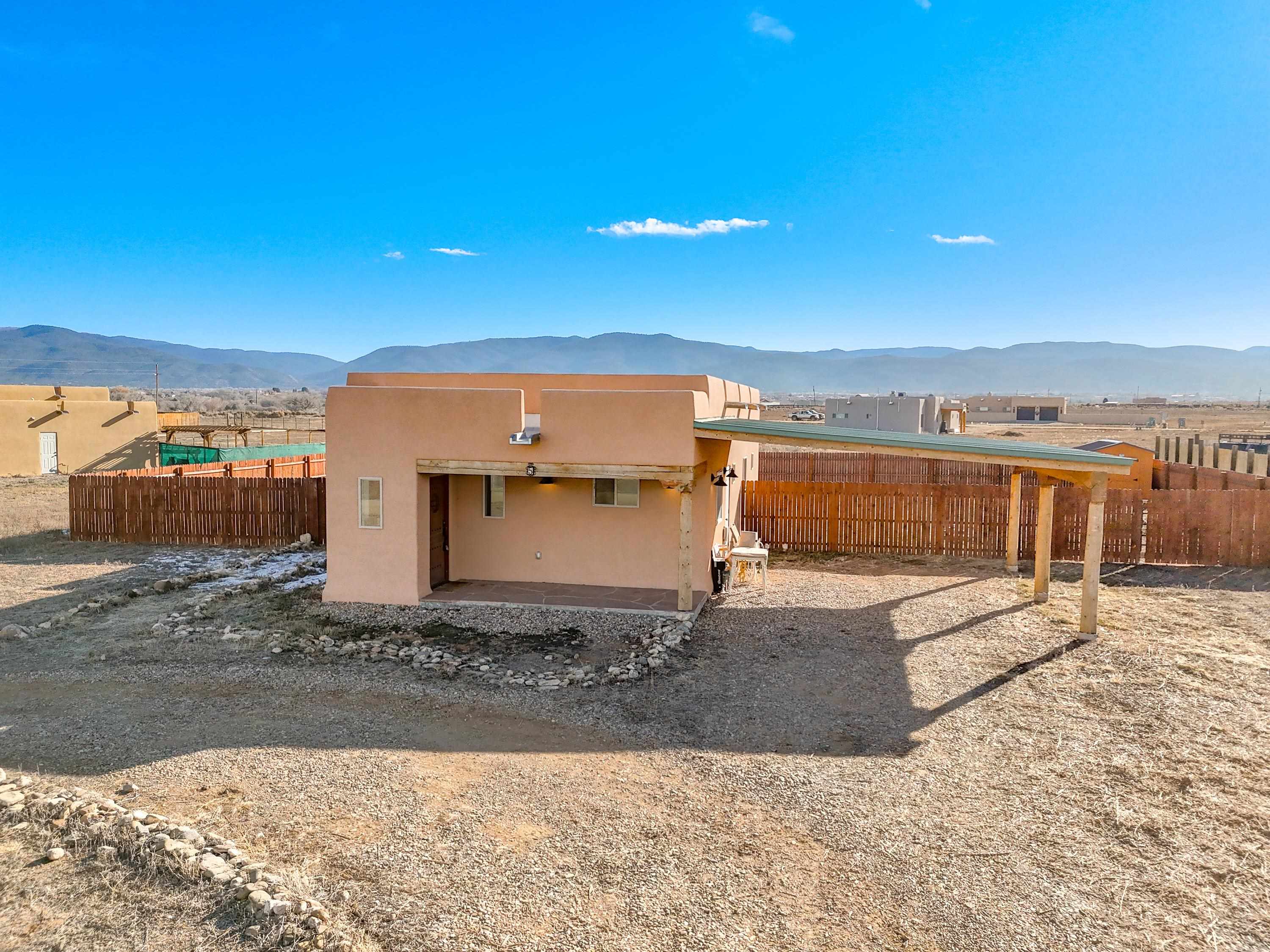 Discover classic Northern New Mexico charm in this beautiful 1,000-square-foot Pueblo-style home. This 2-bedroom, 2-bath residence blends authentic character with modern comfort. The home, built in 2022 offers hot water radiant heat, stained cement floors, and custom blinds on all windows, creating a warm and inviting interior year-round. Enjoy indoor-outdoor living with a covered porch and a fenced backyard—ideal for relaxing, entertaining, or pets. A two-car attached carport provides convenient covered parking. The property is well-equipped with fiber-optic internet, town water, Navien on-demand water heater and natural gas for easy, efficient living. The beautifully appointed kitchen has stainless steel appliances and gas oven/range. Take in breathtaking views of the Sangre de Cristo Mountains right from home, while being just minutes from hiking trails and only five minutes from local restaurants and shops. Located 15 minutes from Taos Plaza, you’ll have quick access to renowned art galleries, dining, shopping, and nightlife. Taos Ski Valley is just 35 minutes away. This charming Pueblo-style home offers the perfect balance of scenic beauty, comfort, and proximity to everything Taos has to offer.