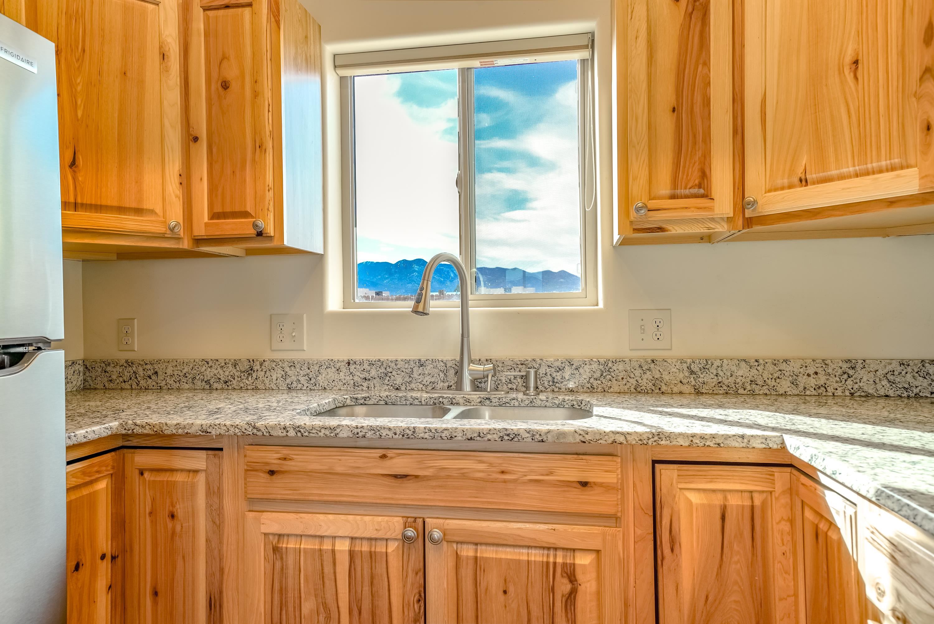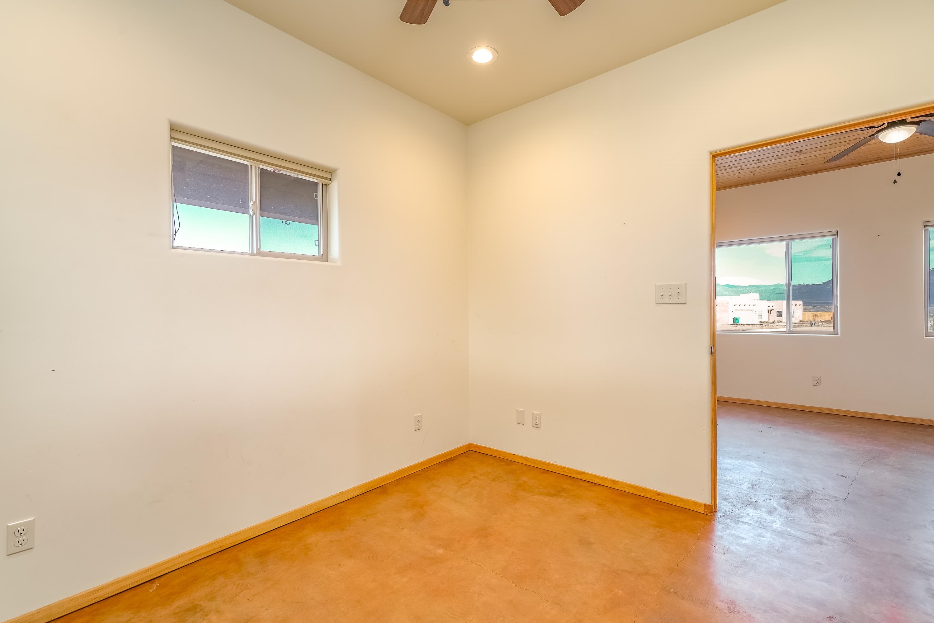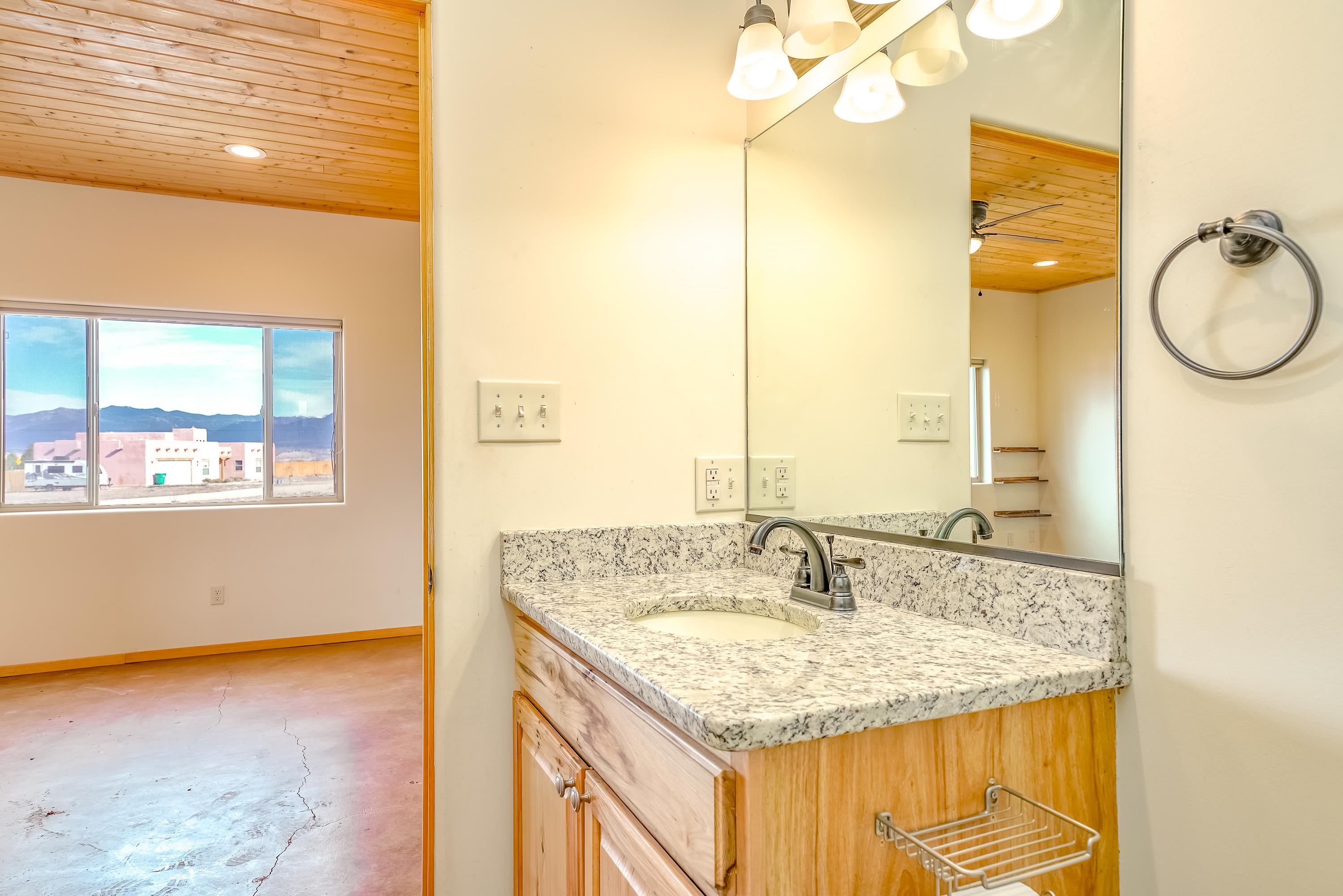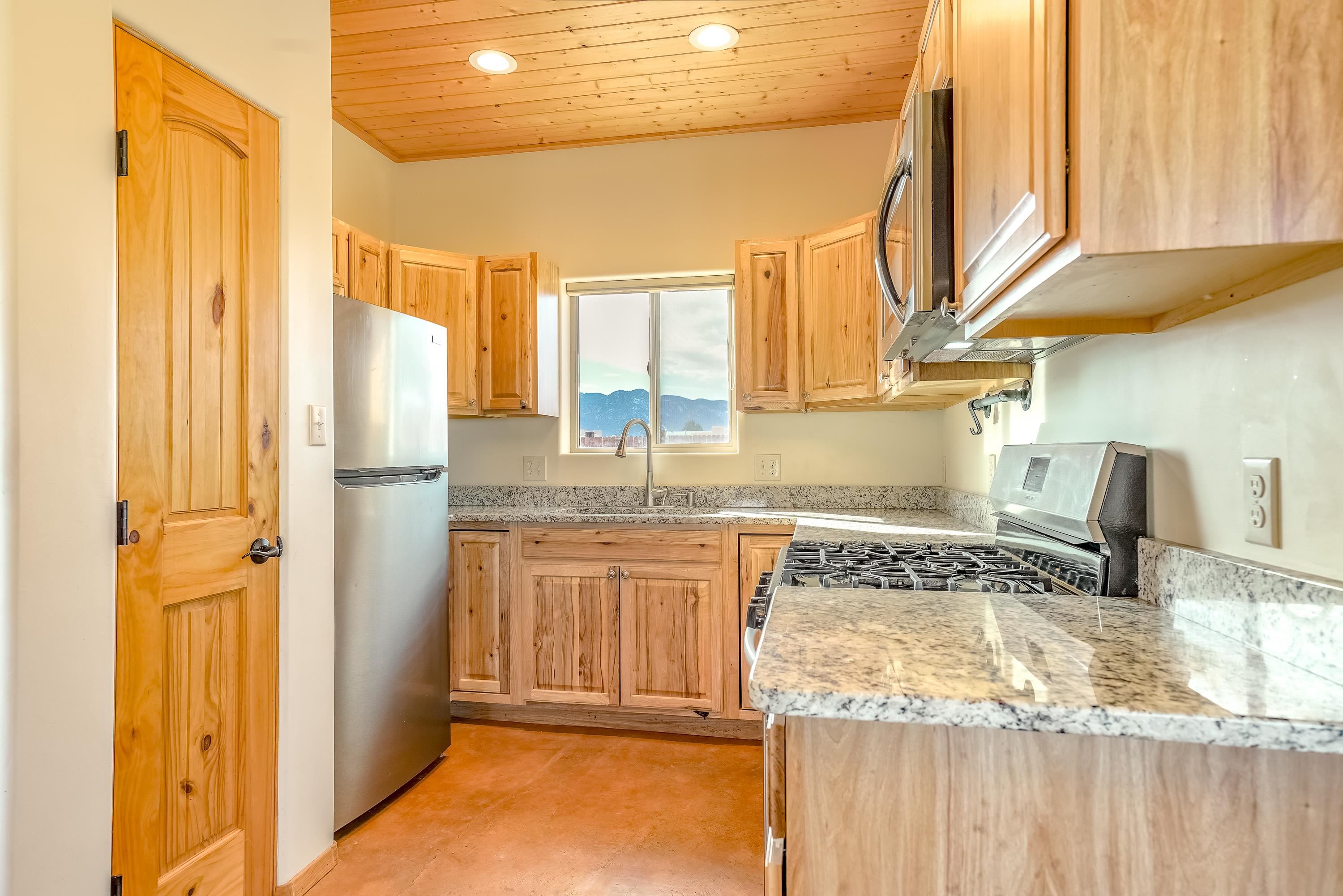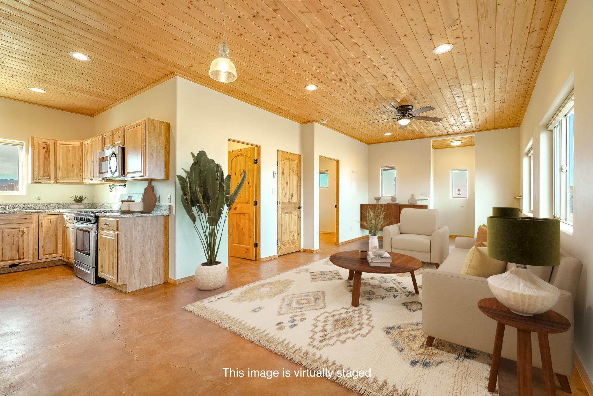 Discover classic Northern New Mexico charm in this beautiful 1,000-square-foot Pueblo-style home. This 2-bedroom, 2-bath residence blends authentic character with modern comfort. The home, built in 2022 offers hot water radiant heat, stained cement floors, and custom blinds on all windows, creating a warm and inviting interior year-round. Enjoy indoor-outdoor living with a covered porch and a fenced backyard—ideal for relaxing, entertaining, or pets. A two-car attached carport provides convenient covered parking. The property is well-equipped with fiber-optic internet, town water, Navien on-demand water heater and natural gas for easy, efficient living. The beautifully appointed kitchen has stainless steel appliances and gas oven/range. Take in breathtaking views of the Sangre de Cristo Mountains right from home, while being just minutes from hiking trails and only five minutes from local restaurants and shops. Located 15 minutes from Taos Plaza, you’ll have quick access to renowned art galleries, dining, shopping, and nightlife. Taos Ski Valley is just 35 minutes away. This charming Pueblo-style home offers the perfect balance of scenic beauty, comfort, and proximity to everything Taos has to offer.
