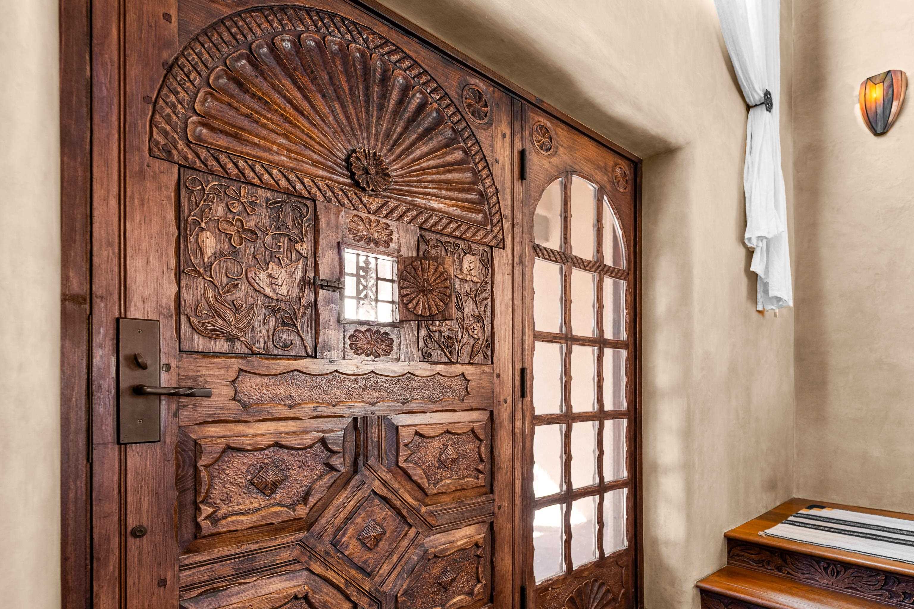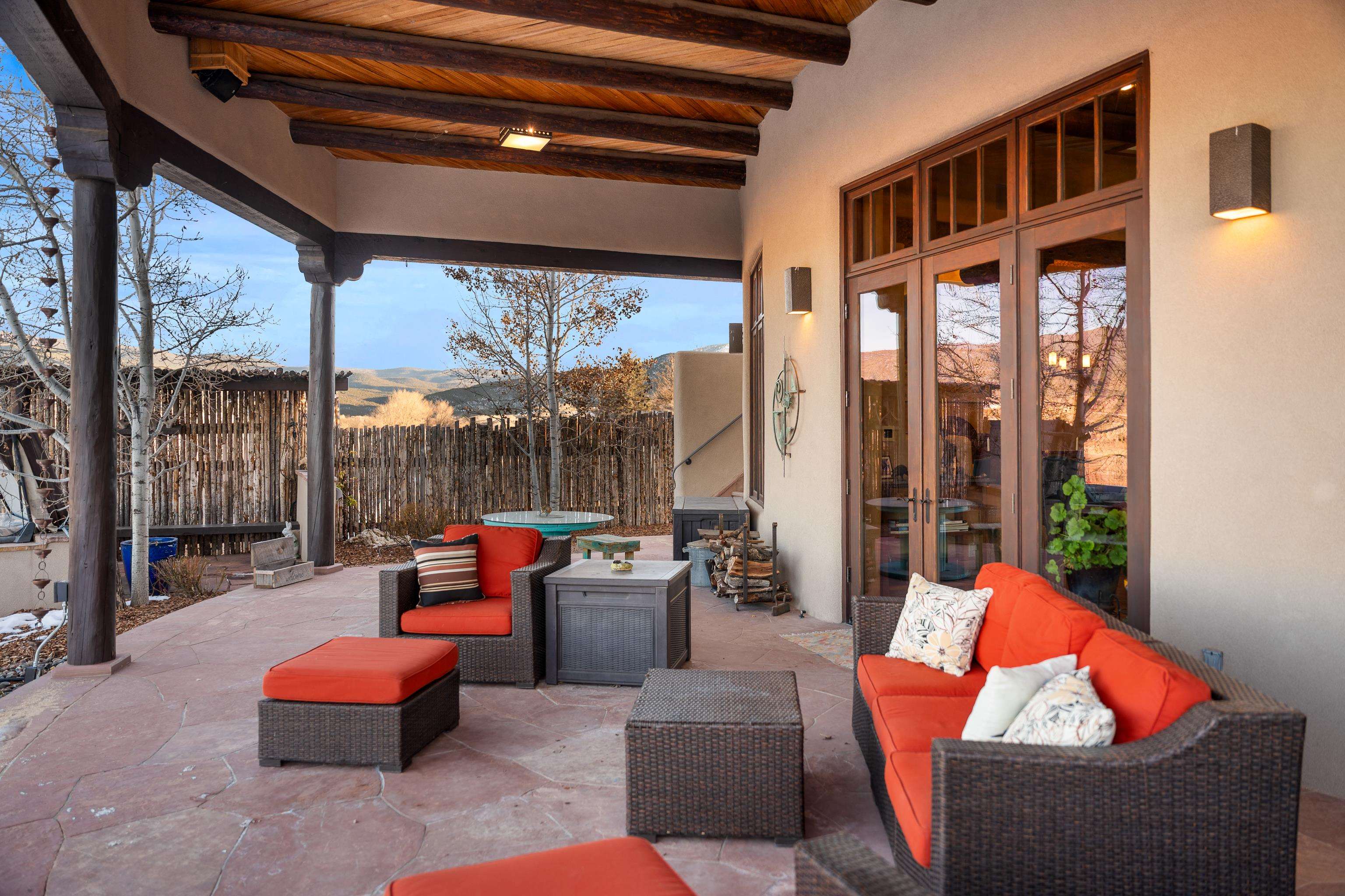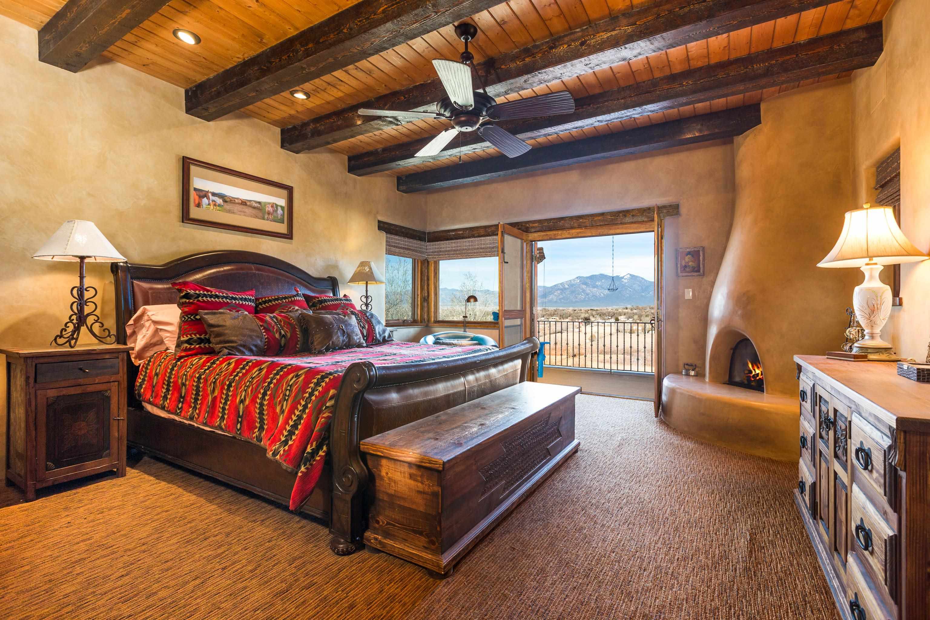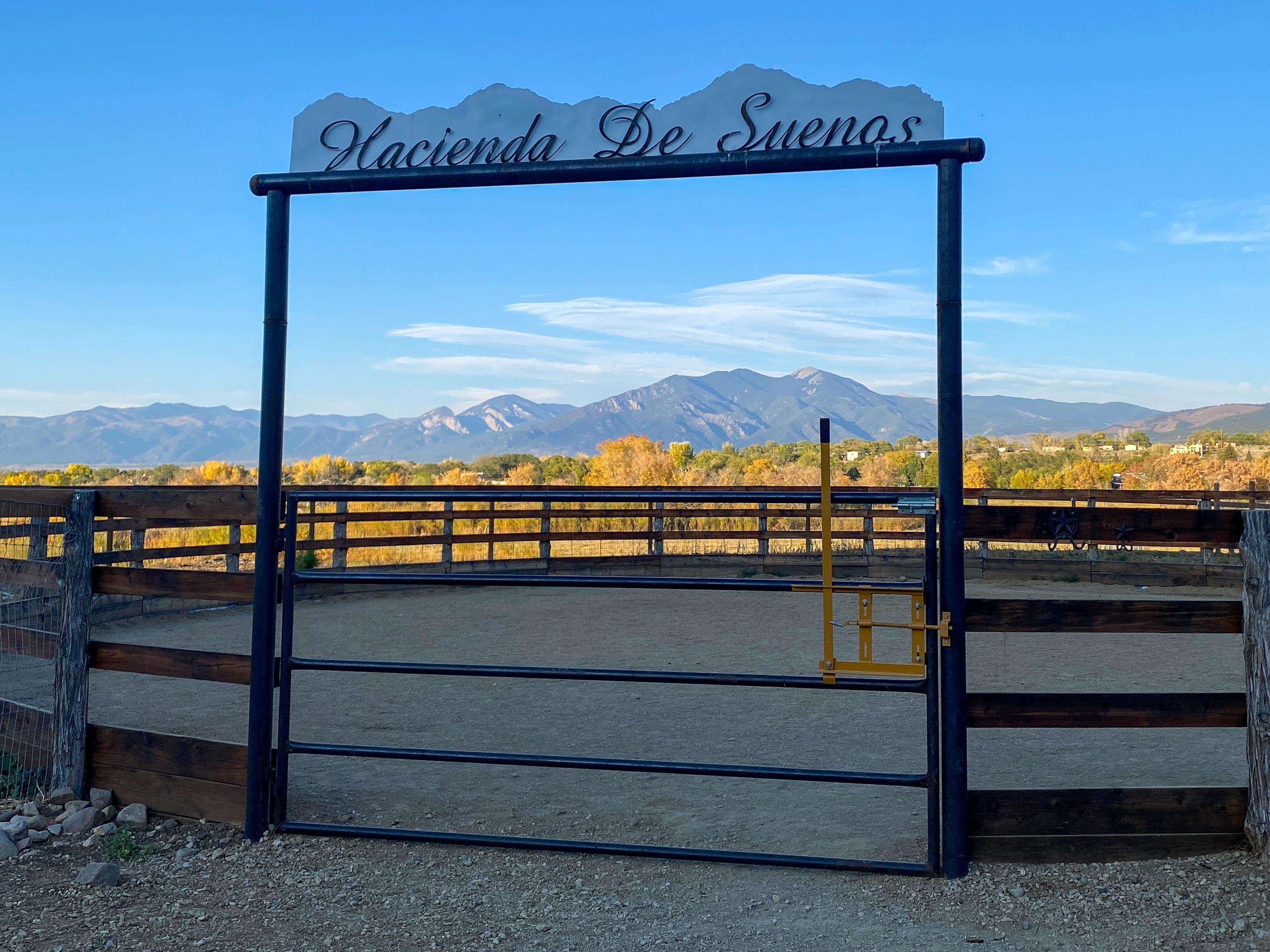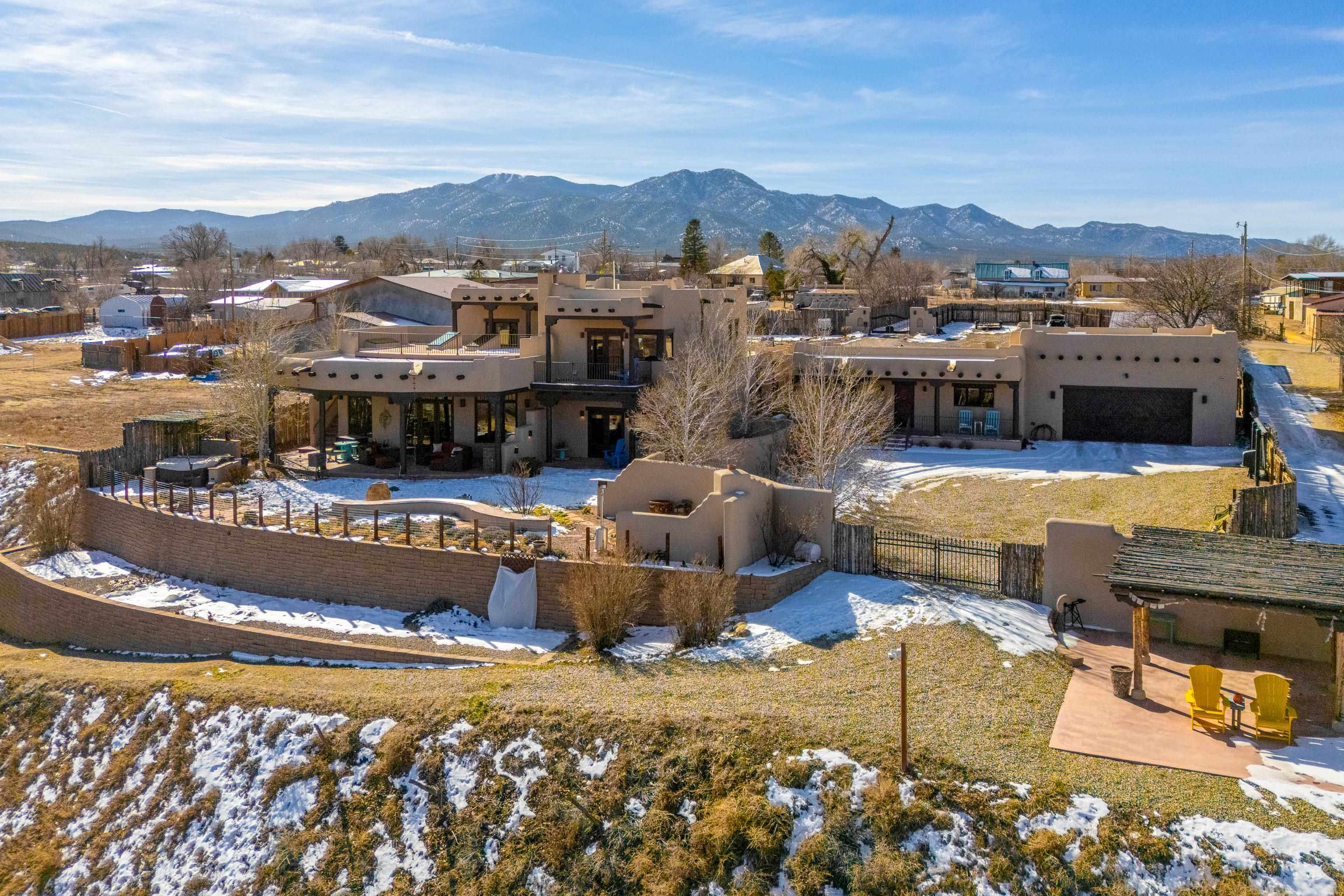 Hacienda de Suenos is a luxury Taos estate and custom adobe-style residence showcasing classic Southwestern architecture, 5 bedrooms, 3 full baths, and 2 half baths, offering approximately 5,995 square feet of living space on 2.05 fully fenced acres in Ranchos de Taos overlooking the Talpa Valley. The property captures expansive views of Taos Mountain, El Salto, and the lush Talpa Valley while maintaining privacy, security, and convenient access to town amenities. A hand-carved front door opens to a grand entry with soaring ceilings, vigas, abundant natural light, and interiors designed to honor traditional New Mexican craftsmanship. The home includes five well positioned bedrooms, including two primary suites with private outdoor seating areas and mountain views. A spacious private office provides a refined and quiet setting for work, study, or creative pursuits. Bathrooms feature hand-painted cabinetry and colorful tile reflecting artisan detail and regional character. The kitchen and pantry are designed for both daily living and entertaining, featuring premium appliances, generous workspace, and easy flow to adjacent living areas. An elegant dining room with banco seating and hand-carved wood details provides a distinctive setting for intimate dinners and larger gatherings. Three fireplaces, two wood-burning and one gas, provide warmth, architectural interest, and year-round comfort. Designed for the Taos lifestyle, the property emphasizes seamless indoor-outdoor living. Exterior features include an outdoor kitchen, multiple covered and open seating areas, and a hot tub positioned to enjoy open skies, valley views, and evening sunsets. Established perennial and vegetable gardens, mature fruit trees, and thoughtfully landscaped grounds enhance the sense of a private valley retreat. Infrastructure reflects long-term planning and energy efficiency. The home incorporates passive and active solar design, radiant floor heating for consistent comfort throughout the colder months, and an extensive solar hot water heating system that maximizes efficiency and energy savings. A natural gas–powered generator provides dependable electrical backup during outages. Two garages, along with a heated tack room and storage shed, provide practical comfort and year-round functionality. A comprehensive security system with integrated cameras and private gated entrances further supports privacy and peace of mind. The 2.05-acre parcel provides open space, panoramic views, and access to the road below for quiet walks. Water rights to the Acequia del Finado Francisco Martinez convey with the property, an increasingly valuable asset in Northern New Mexico. Additional acreage is available separately and includes approximately 4.35 acres of pasture, a round pen, and barns with water and electricity, along with water rights to two additional acequias. This offering supports equestrian use and provides expanded flexibility for buyers seeking a Taos equestrian property or extended estate configuration. Hacienda de Suenos combines authentic Southwestern architectural detail, custom craftsmanship, solar infrastructure, water rights, privacy, security, and optional equestrian expansion in a desirable Ranchos de Taos setting overlooking the lush Talpa Valley, minutes from Taos Plaza, the Taos Country Club Golf Course, and Taos Ski Valley.