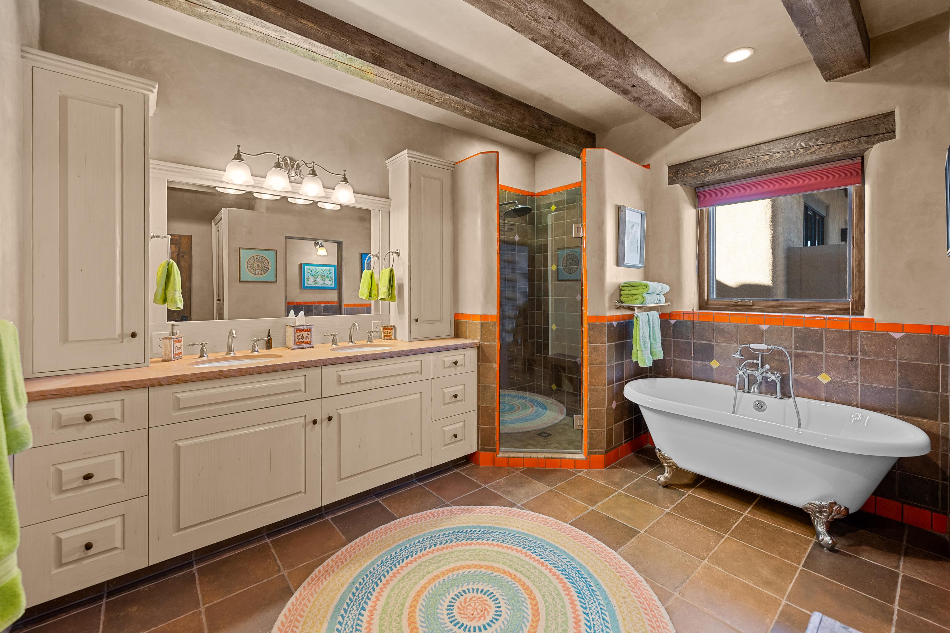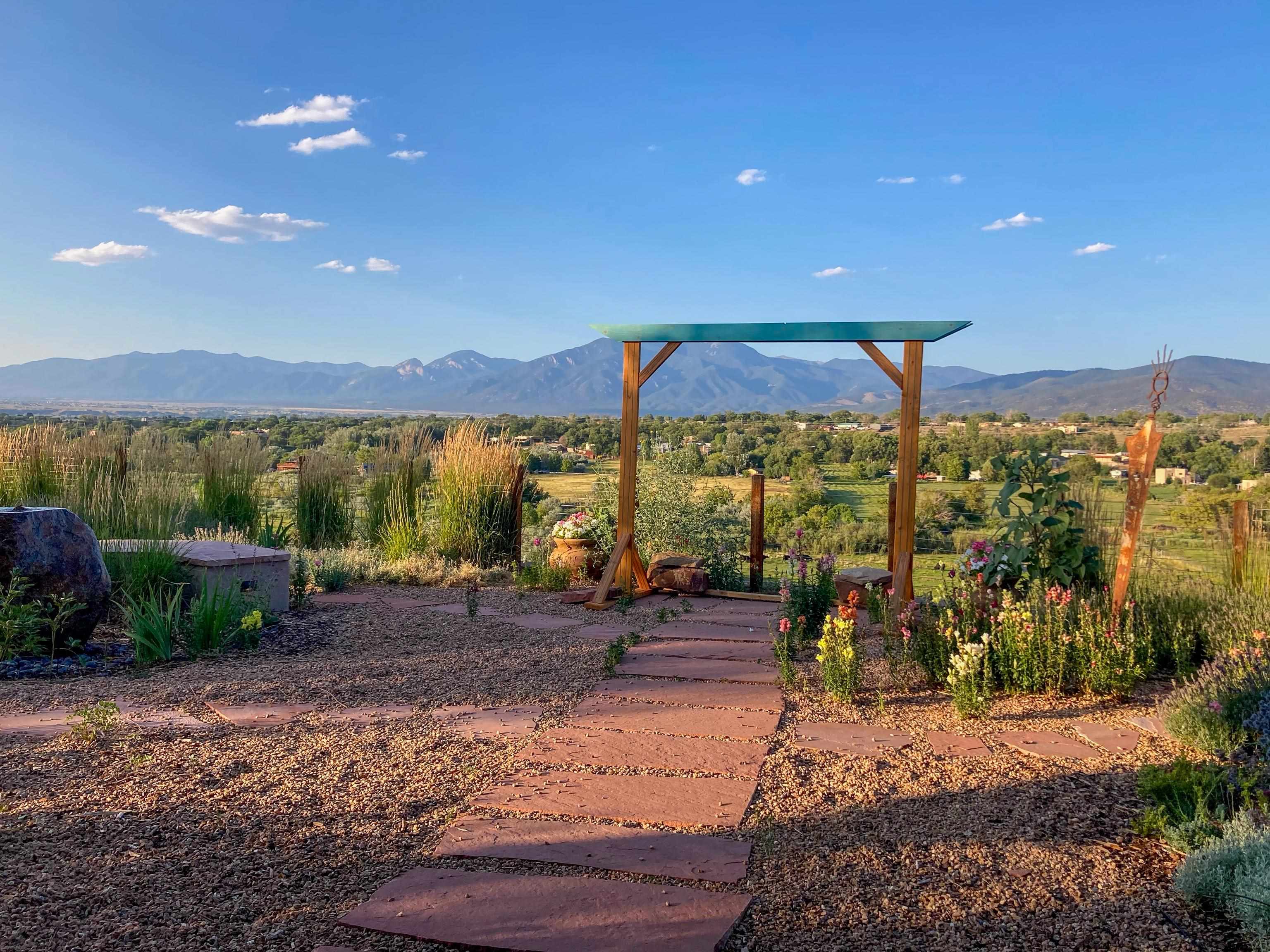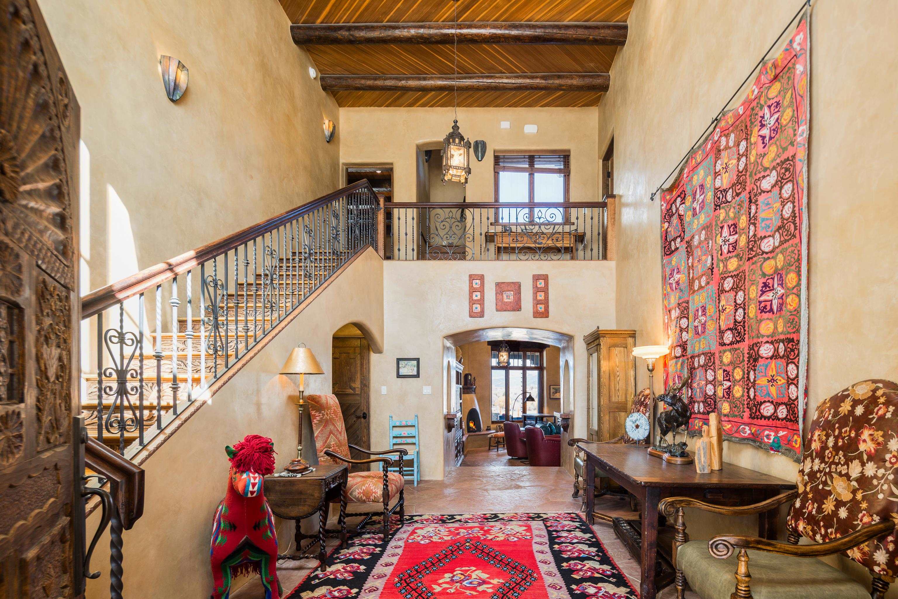 Hacienda de Suenos is a luxury Taos estate and custom adobe-style residence showcasing classic Southwestern architecture, 4 bedrooms, 3 full baths, and 2 half baths, offering approximately 5,995 square feet of living space on 2.05 fully fenced acres in Ranchos de Taos overlooking the Talpa Valley. The property captures expansive views of Taos Mountain, El Salto, and the lush Talpa Valley while maintaining privacy, security, and convenient access to town amenities. A hand-carved front door opens to a grand entry with soaring ceilings, vigas, abundant natural light, and interiors designed to honor traditional New Mexican craftsmanship. The home includes four well positioned bedrooms, including two primary suites with private outdoor seating areas and mountain views. Bathrooms feature hand-painted cabinetry and colorful tile reflecting artisan detail and regional character. The kitchen and pantry are designed for both daily living and entertaining, featuring premium appliances, generous workspace, and easy flow to adjacent living areas. An elegant dining room with banco seating and hand-carved wood details provides a distinctive setting for intimate dinners and larger gatherings. A comfortable family room with a daybed connects seamlessly to the main living areas. Three fireplaces, two wood-burning and one gas, provide warmth, architectural interest, and year-round comfort. Designed for the Taos lifestyle, the property emphasizes seamless indoor-outdoor living. Exterior features include an outdoor kitchen, multiple covered and open seating areas, and a hot tub positioned to enjoy open skies, valley views, and evening sunsets. Established perennial and vegetable gardens, mature fruit trees, and thoughtfully landscaped grounds enhance the sense of a private valley retreat. Infrastructure reflects long-term planning and energy efficiency. The home incorporates passive and active solar design, radiant floor heating for consistent comfort throughout the colder months, and an extensive solar hot water heating system that maximizes efficiency and energy savings. A whole-home generator powered by natural gas provides uninterrupted electrical service during outages. A security system and private gated entrances further support privacy and peace of mind. The 2.05-acre parcel provides open space, panoramic views, and access to the road below for quiet walks. Water rights to the Acequia del Finado Francisco Martinez convey with the property, an increasingly valuable asset in Northern New Mexico. Additional acreage is available separately and includes approximately 4.35 acres of pasture, a round pen, and barns with water and electricity, along with water rights to two additional acequias. This offering supports equestrian use and provides expanded flexibility for buyers seeking a Taos equestrian property or extended estate configuration. Hacienda de Suenos combines authentic Southwestern architectural detail, custom craftsmanship, solar infrastructure, water rights, privacy, security, and optional equestrian expansion in a desirable Ranchos de Taos setting overlooking the lush Talpa Valley, minutes from Taos Plaza, the Taos Country Club Golf Course, and Taos Ski Valley.
