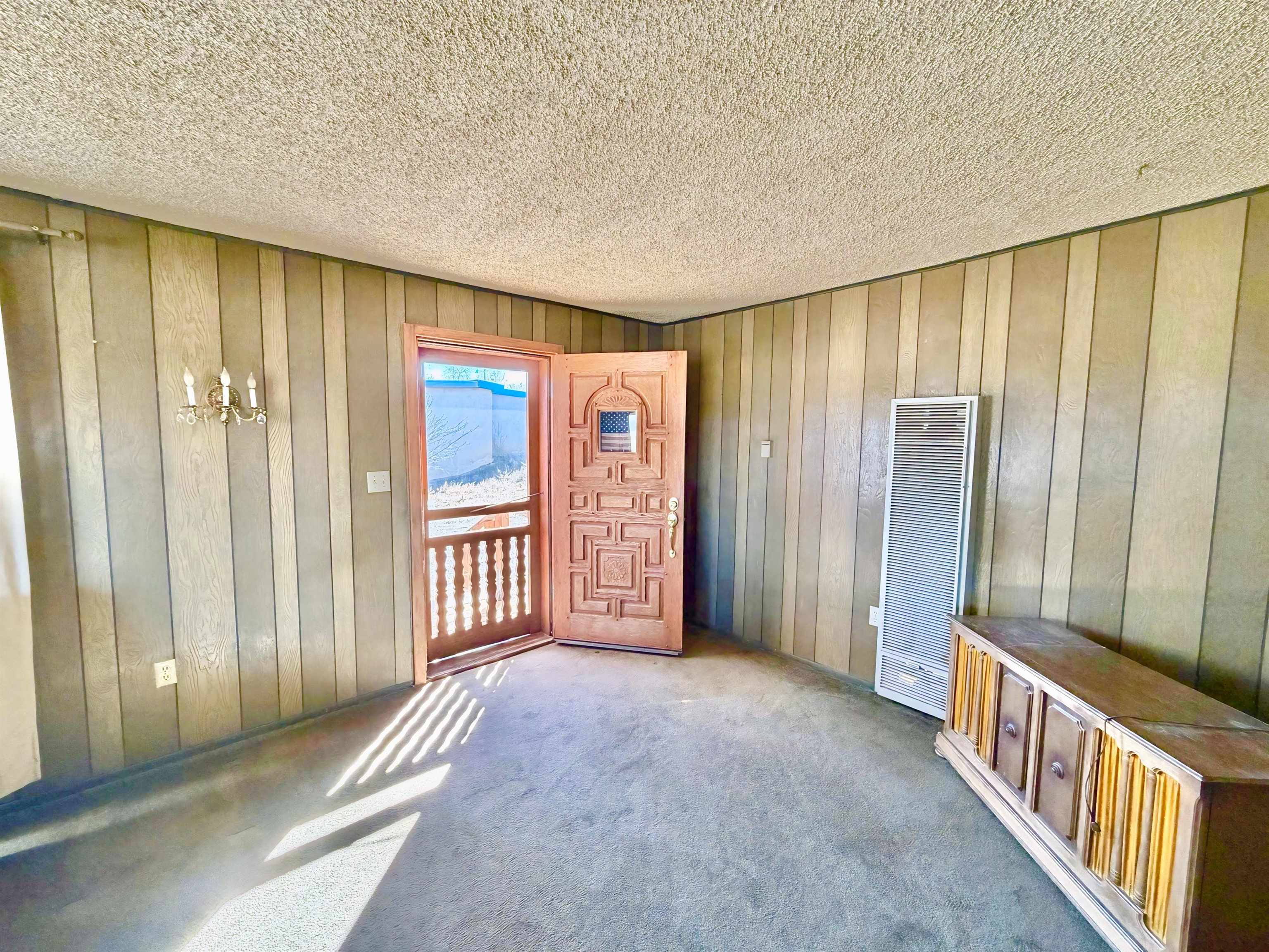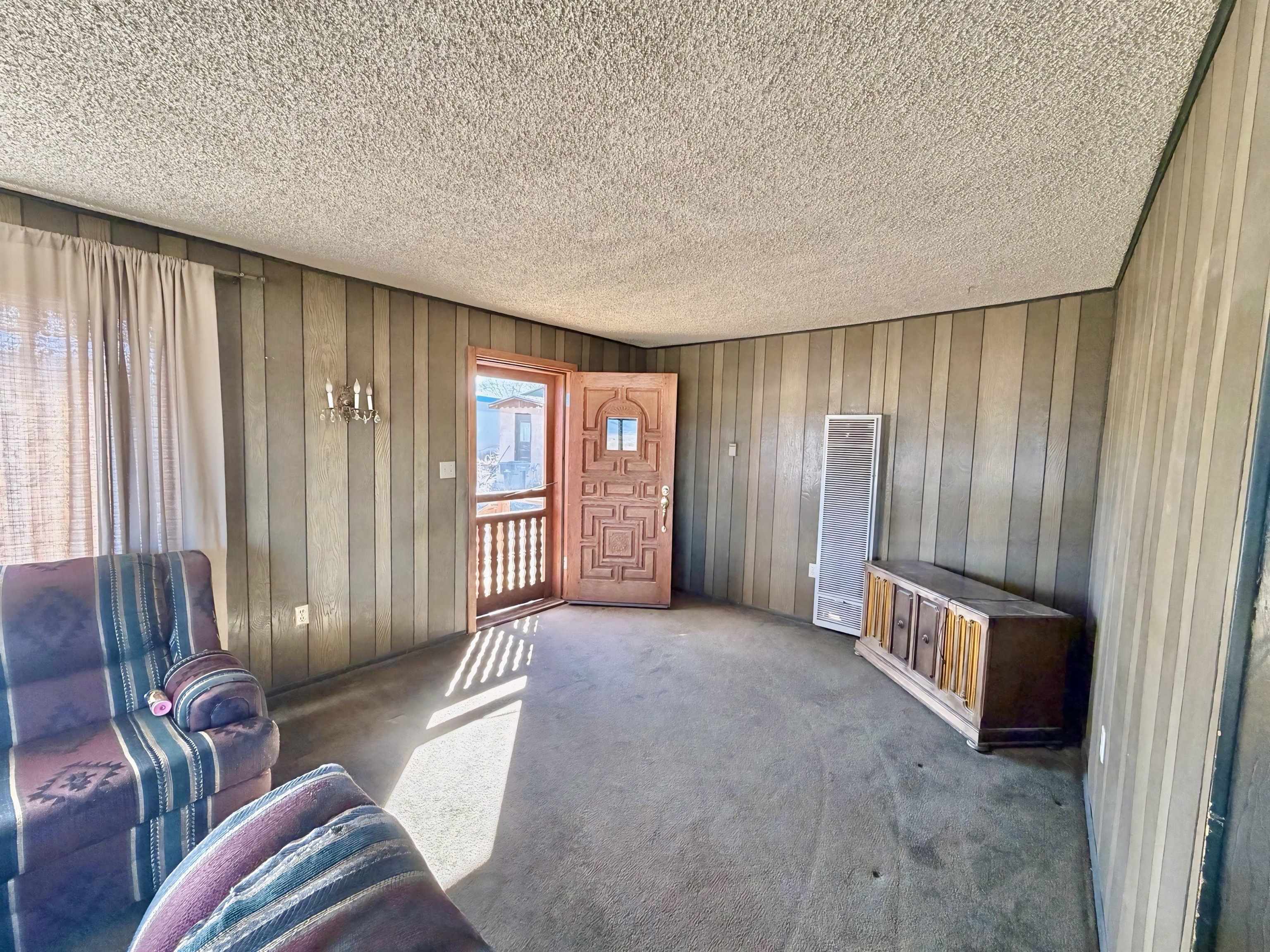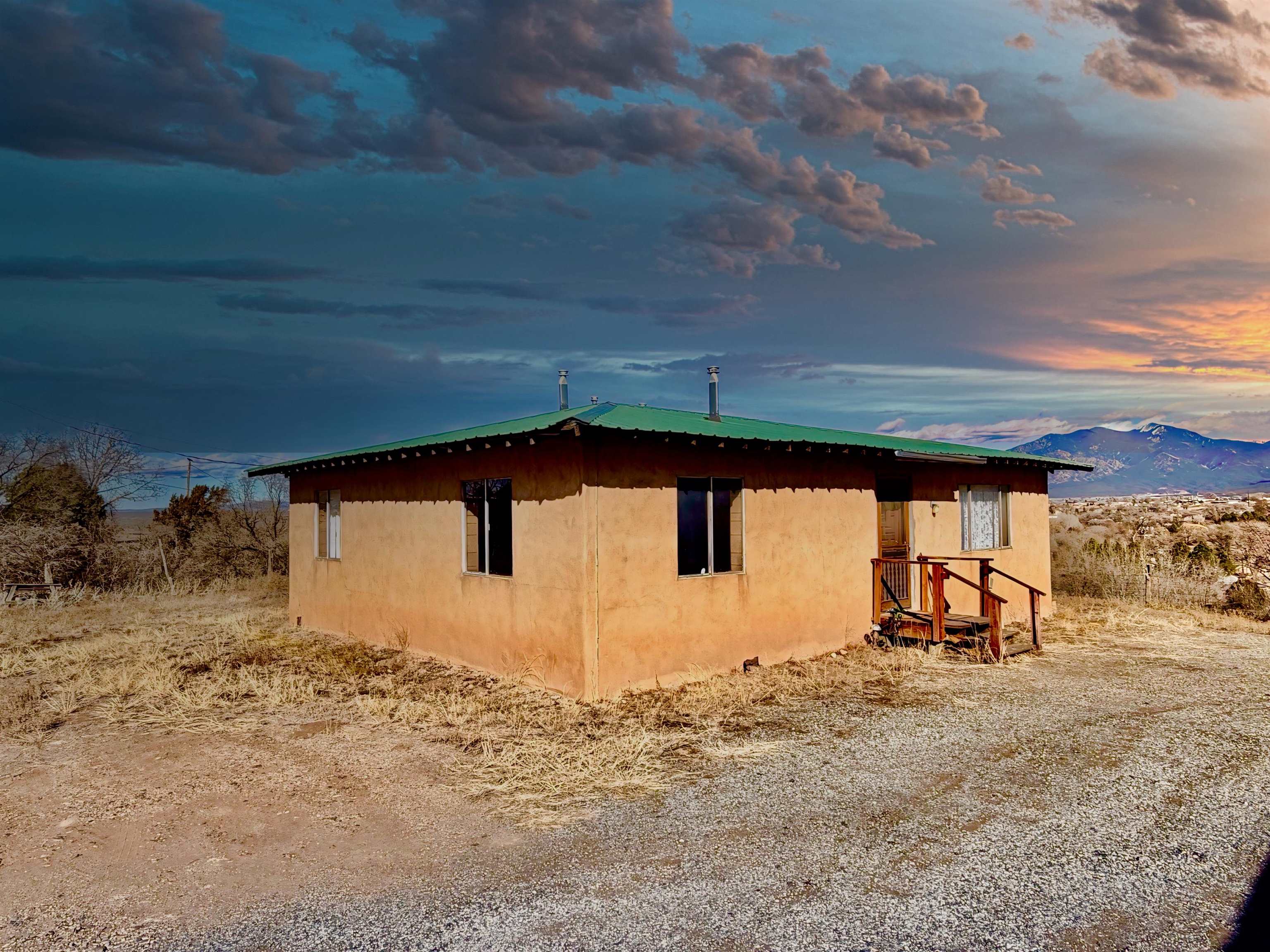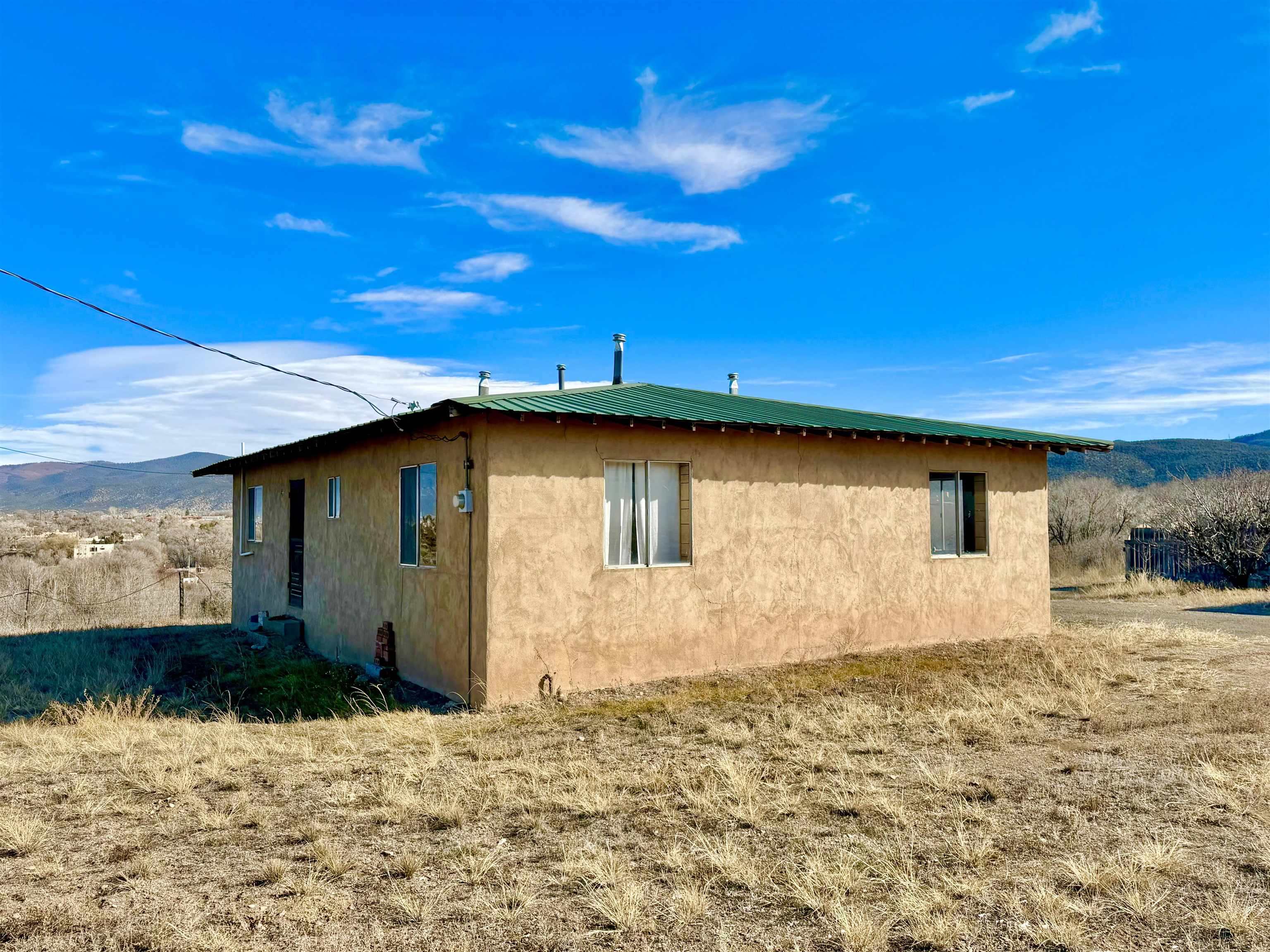 This residence offers unparalleled and exquisite views of the Ranchos de Taos Valley, with a panoramic overlook of the historic San Francisco de Asis Catholic Church, commonly referred to as the Ranchos Church. Its prime location provides effortless access to US Highway 68, facilitating northward travel to Taos or southward journeys to Santa Fe. As you step outside, embrace the invigorating Taos breeze while savoring the magnificent, unobstructed northerly vistas. This approximately 1200 square foot, two-bedroom, and one-bathroom home, constructed around 1973, exudes a cozy ambiance upon entry. The spacious north-east facing sliding glass door windows offer an exterior view of these awe-inspiring vistas, which can be enjoyed from the kitchen, dining, and living areas at any time. To enhance a more modern aesthetic, updates are feasible. Additionally, the property’s expansive size, encompassing a combined .568 acres with Lot B at .258 acres and Lot A at .310 acres, provides ample room for expansion. The main house is constructed using frame construction, featuring a pitched Pro-panel roof and stucco exterior walls. The interior boasts wood panel walls, carpeted and laminate flooring, plaster ceilings, and functional wood cabinetry in the kitchen, complemented by well kept appliances. Furthermore, the property includes an old adobe home situated in the eastern section of Lot A. This old time structure can be salvaged by skilled hands, as it retains substantial structural integrity, but will require substantial renovation. We invite you to explore this exceptional property and its amenities, ensuring that they align with your requirements at this prime location.