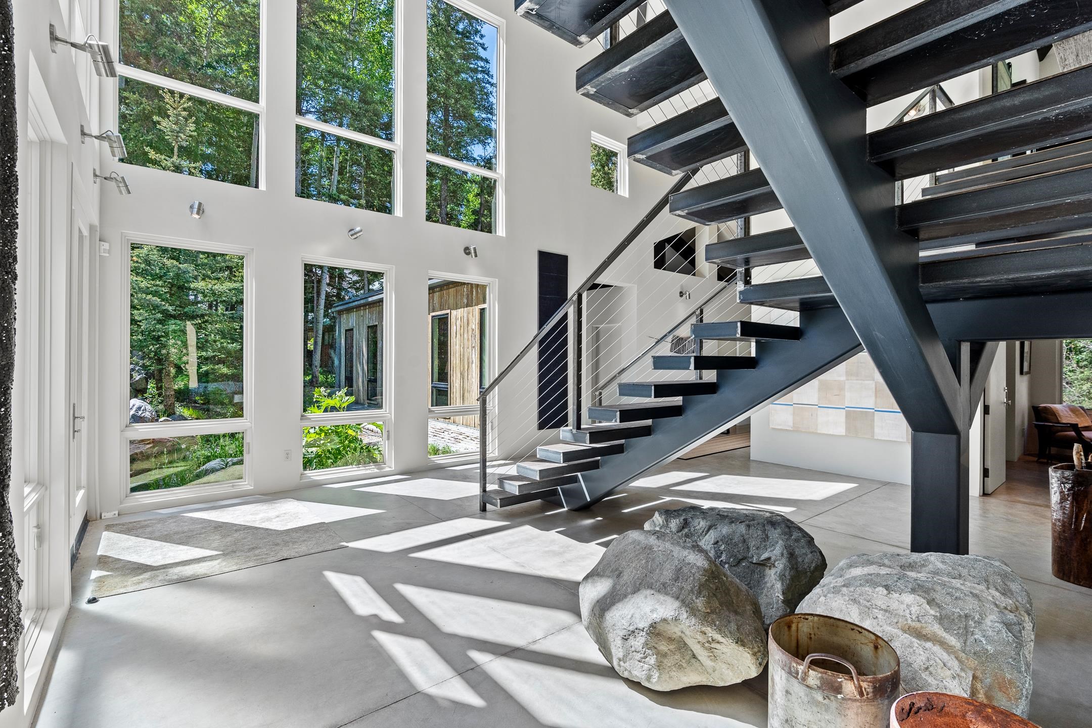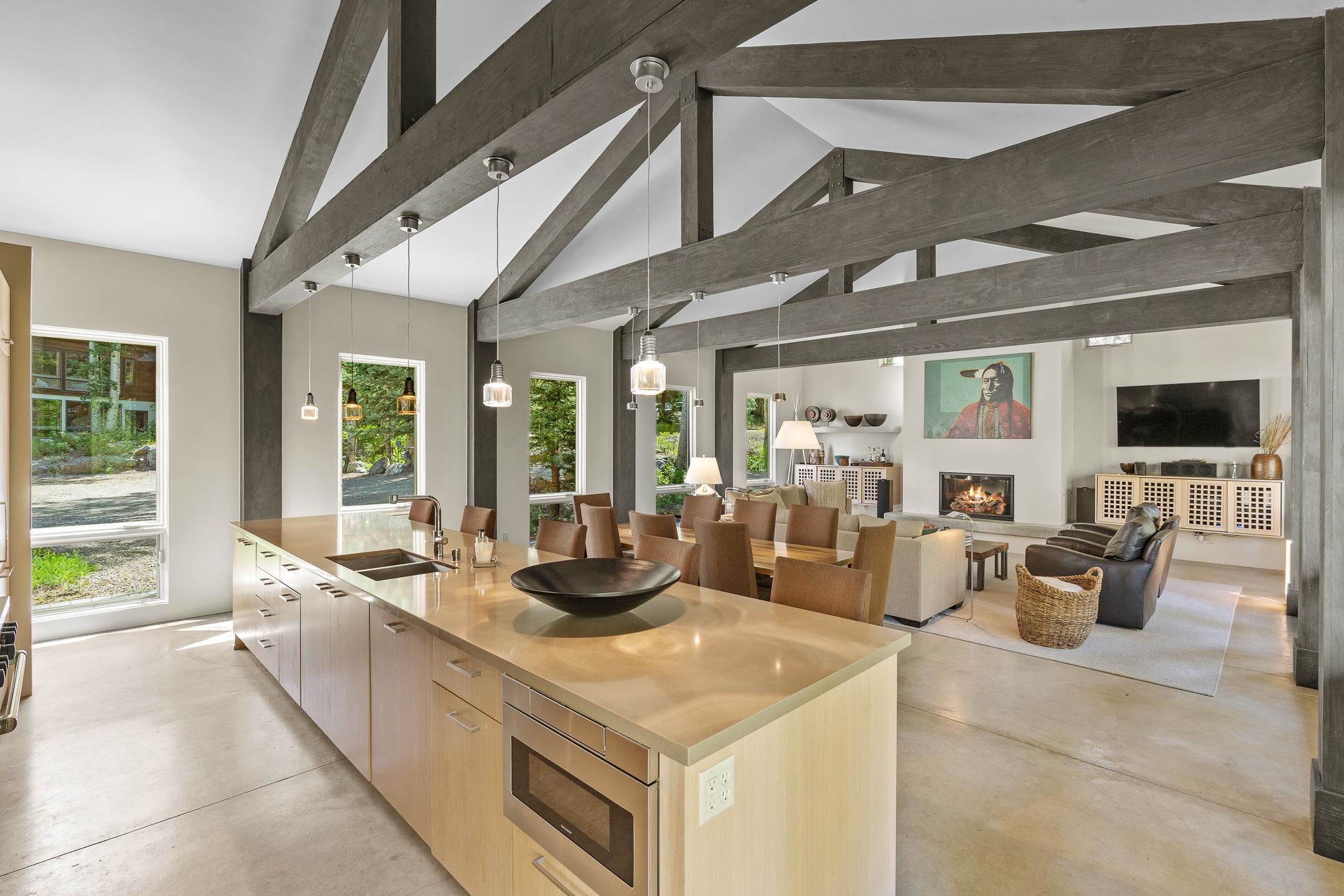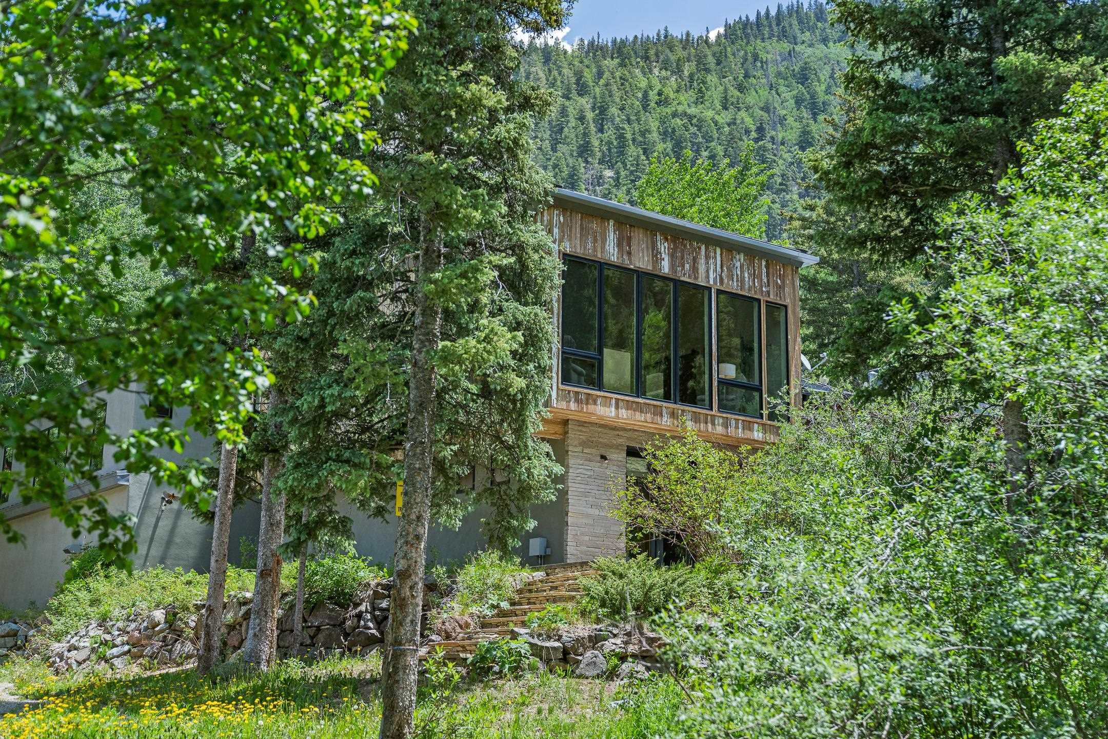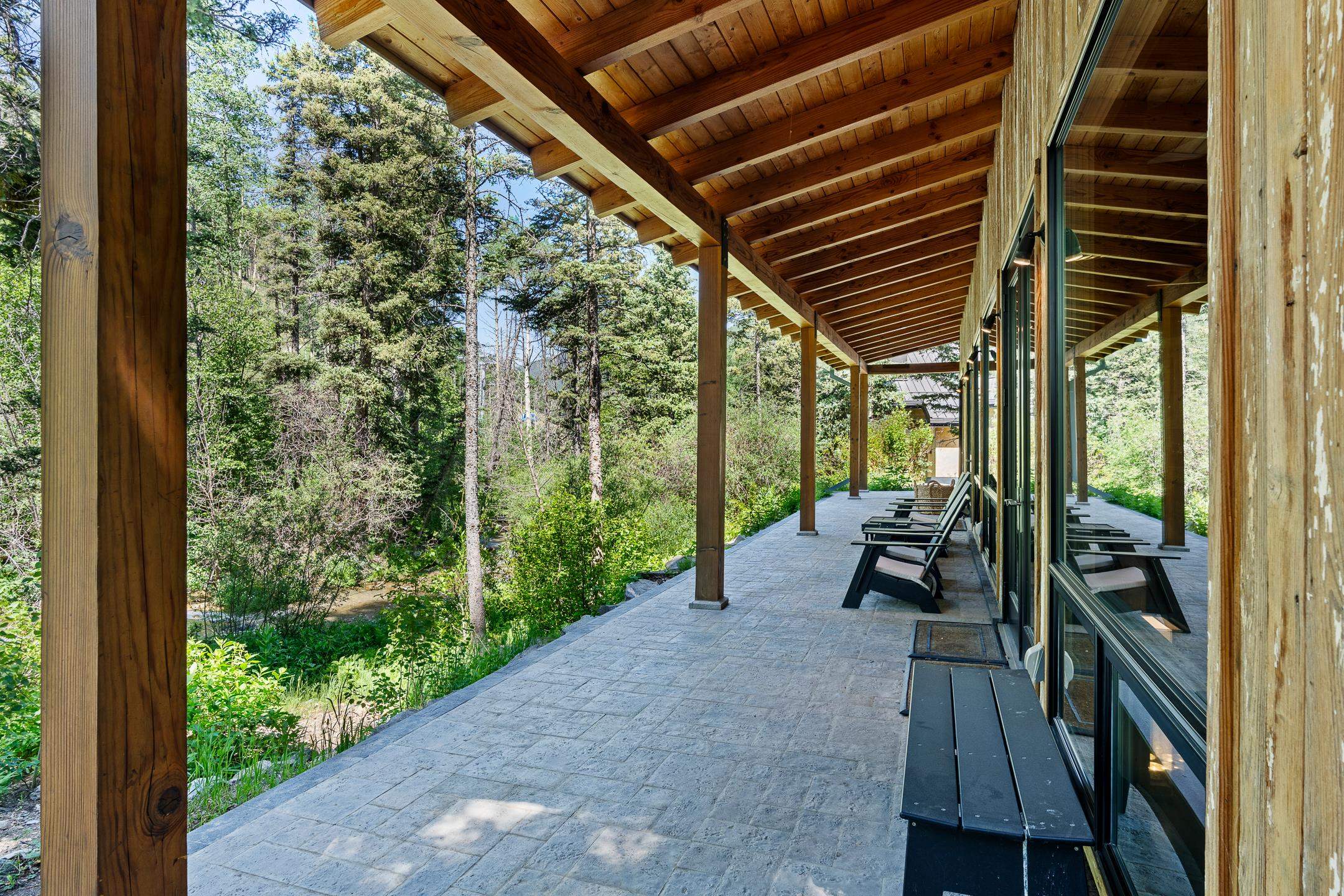 Situated in the heart of Taos Ski Valley, this one-of-a-kind Contemporary Modern Mountain Home redefines alpine luxury. Set on a rare corner lot spanning over one-third of an acre, the property is graced with more than 150 feet of the Rio Hondo River, flowing beneath two custom-built bridges that provide direct ski-in/ski-out access. Just a short walk to the base area's two main lifts, the location is simply unmatched. Every detail of this stunning home exudes sophistication and modern elegance. Designed for both comfort and performance, it features high-end finishes throughout, including automated sun shades, radiant in-floor heating, a chef’s kitchen with premium appliances, and a luxurious steam shower in the primary suite. A dramatic zinc standing seam roof—engineered to last 80 to 100 years—crowns the home, while a natural gas standby generator ensures seamless year-round living. Step outside to the elevated hot tub perched above the river and enjoy serene mountain ambiance like no other. The heated driveway and stone paver walkways offer effortless winter access, while the oversized 3-car garage—with one bay currently transformed into a game room—adds versatility and comfort. A dedicated ski storage room with private locker space and a separate entrance completes the alpine lifestyle experience. Equipped with a natural gas generator, the property ensures uninterrupted power during winter storms and outages. The home’s thoughtful floor plan offers exceptional privacy and flow. The primary suite features a private office, steam shower, and complete separation from the guest quarters, which are adjacent to a spacious family lounge. A guest suite on the lower level provides additional convenience and flexibility. From its unparalleled riverfront setting to its extraordinary finishes and amenities, there is simply no other home of this caliber in Taos Ski Valley. This is more than a residence—it's an elevated mountain sanctuary. Home is being sold fully furnished including most artwork.