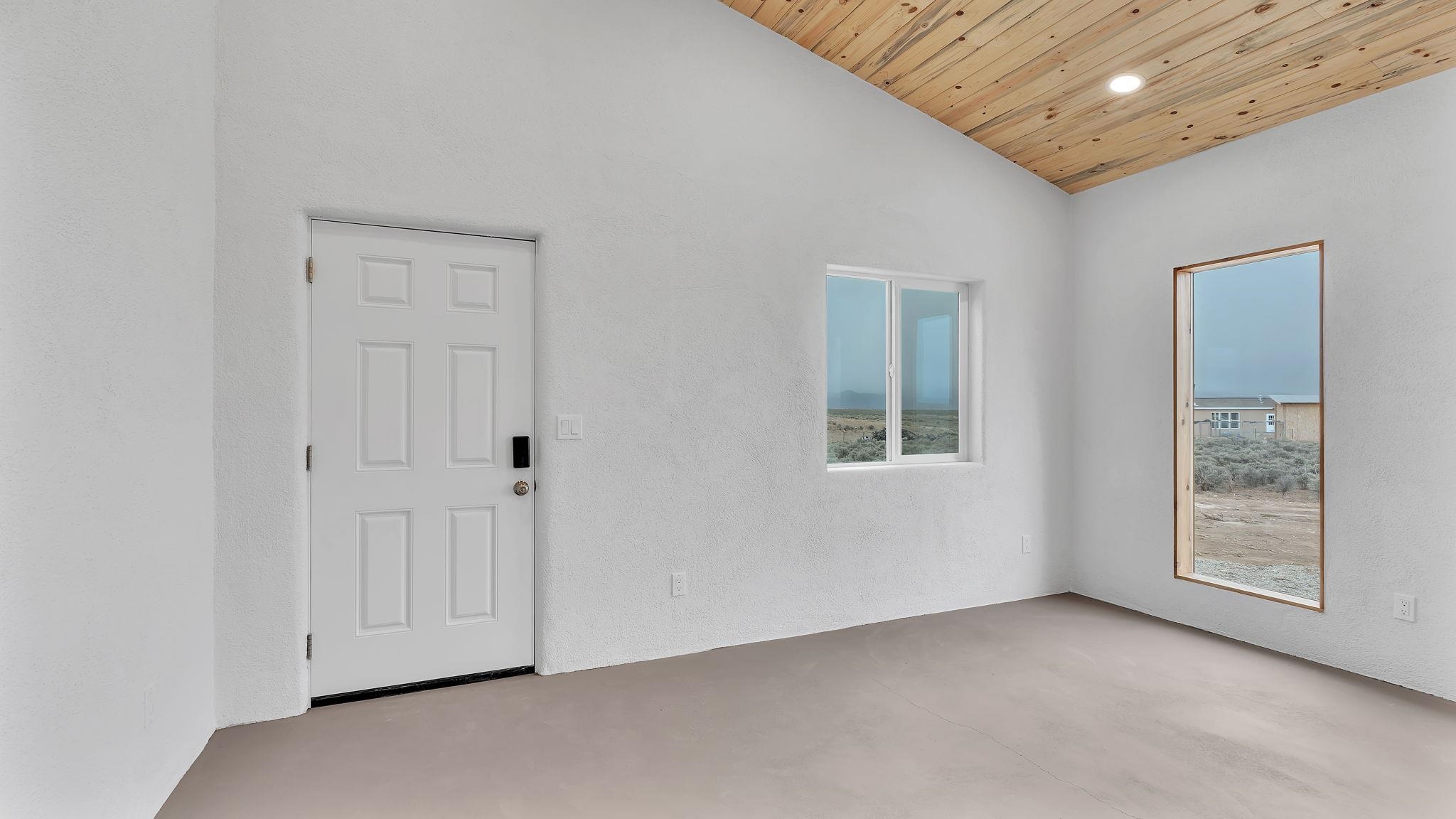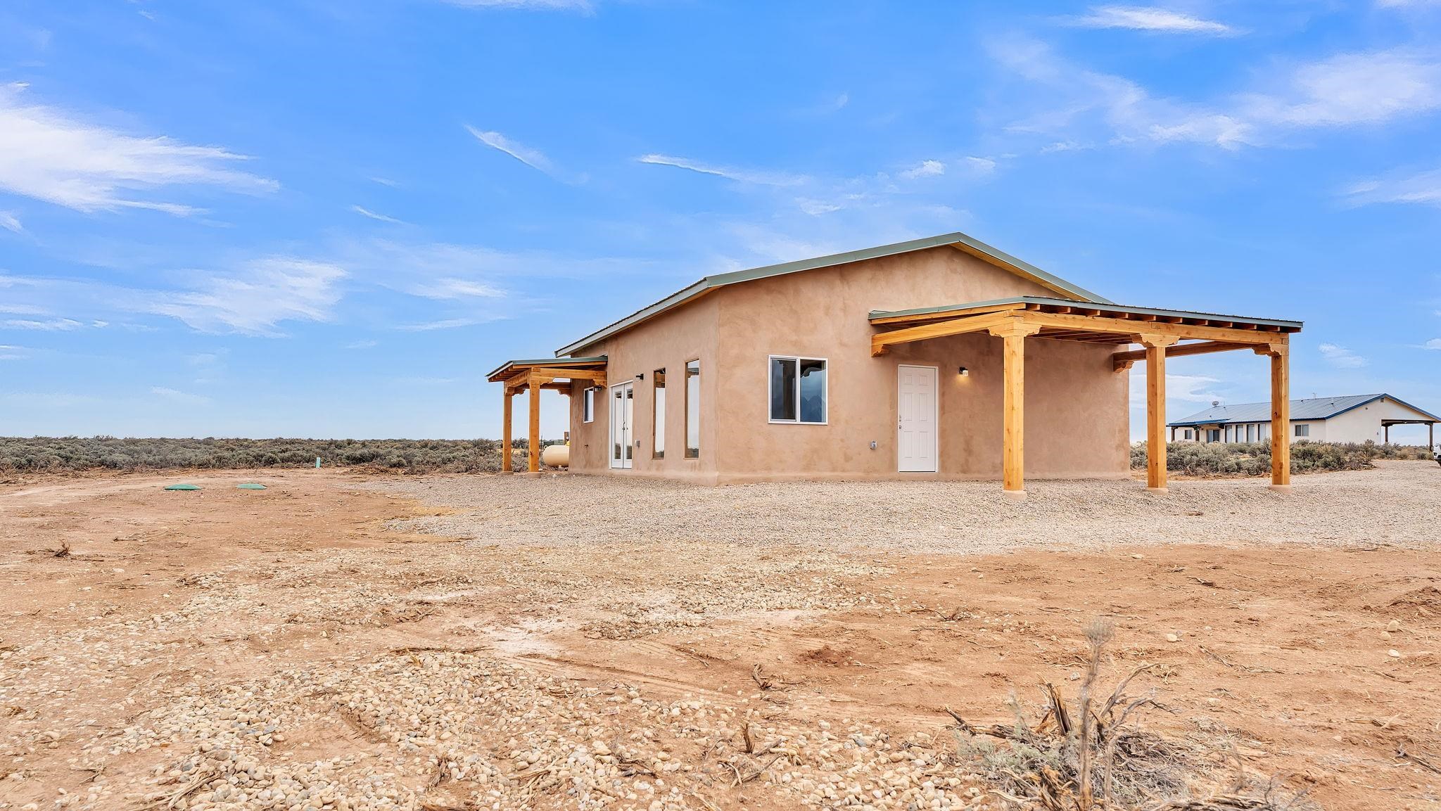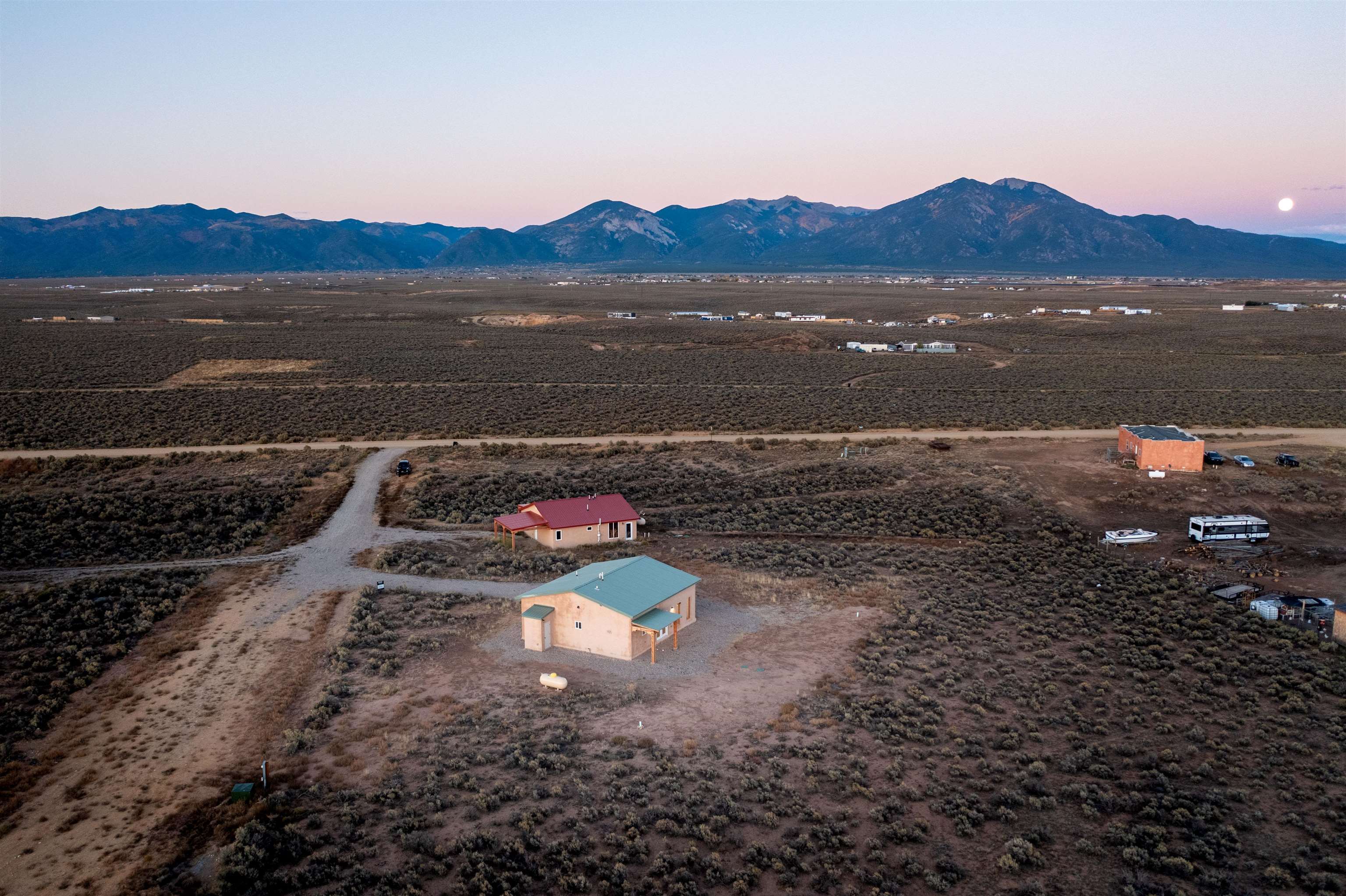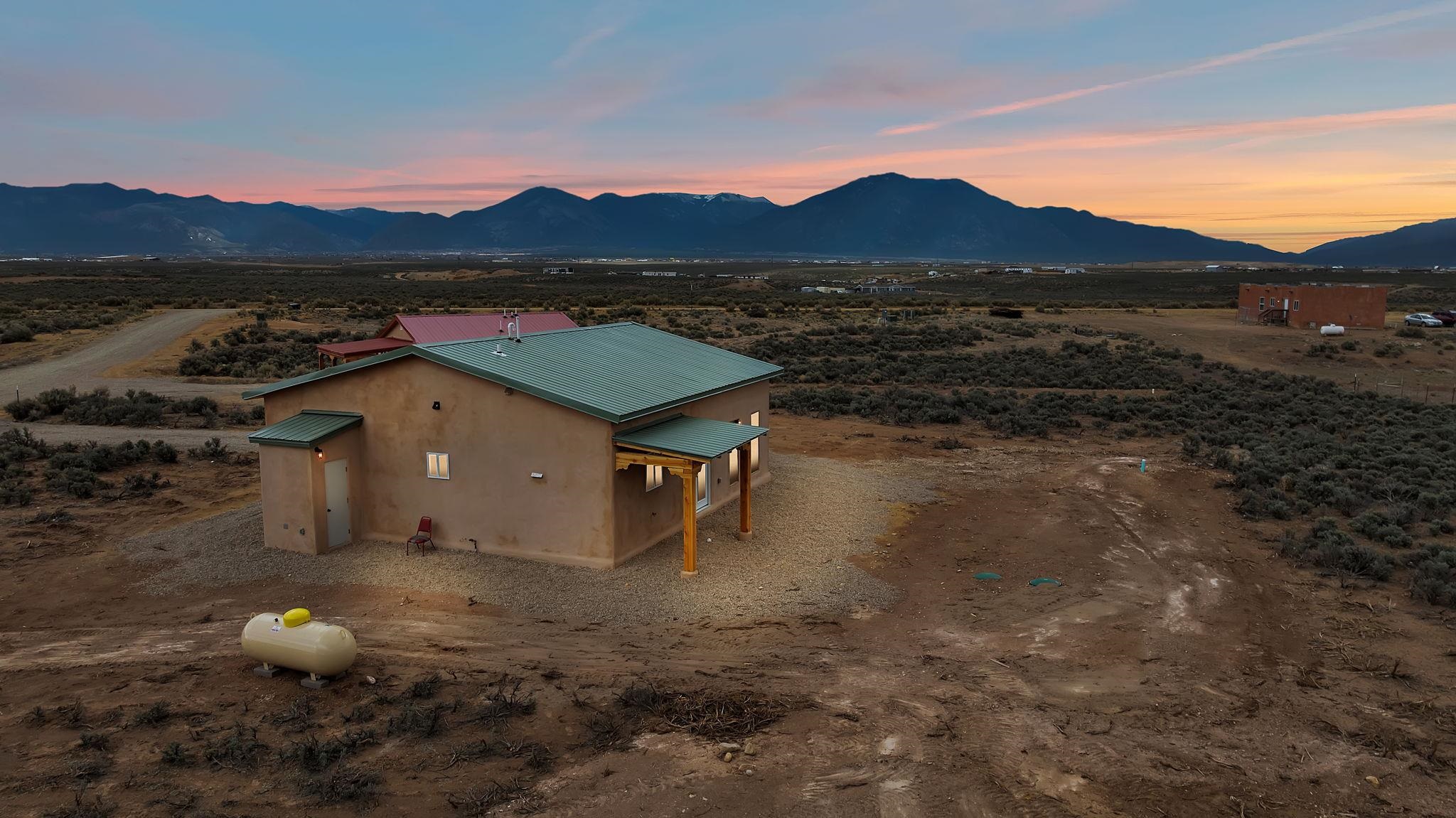 Magical Sunsets & Mountain Views Daily ~ Welcome to the third, extra special, and sustainable residence within the newly developed Taeo Loop Neighborhood of El Prado, Taos, New Mexico. This freshly finished 2 bed 2 bath 1,088 sqft home on 1 acre is a rare find in this sought after growing region of town. The construction is top-tier, and the home is ahead of the rest when it comes to the possibilities for saving on energy, and saving the planet being that infrastructure is in place for converting to solar if one desires. In the meantime, the solar room could be used as extra storage. The open floor plan is highly functional, and it's as if the home is double the size with the high vaulted ceiling in the living area and spacious shiny kitchen equipped with upgraded stainless steel kitchen appliances. Each of the bedrooms are large enough for big beds, the bathrooms are comfortable and sleek, and the laundry room with a full-size washer & dryer and extra storage ideal for keeping things organized. Some of the home's special features include tongue & groove ceilings, South facing floor-to-ceiling windows bring in solar passive energy throughout the day, keep the home well lit, and will be a popular place for growing tomatoes inside. The stained concrete floors make the on-demand hot water radiant heated floors extra efficient, and a steady breeze enhanced by the overhead ceiling fans promotes even greater climate control. The attached carport will make for a short trip indoors during the snowy season, and the pitched metal roof will require very little maintenance over time..As for the views, these simply cannot be beat, especially at sunset, sunrise, or a lunar/solar eclipse in the High Desert. Close proximity and outlet to Taos Ski Valley, the Rio Grande River, and all the trails for outdoor fun. Some photos have been virtually staged. Don't wait, and get in early on this newly built home, in the lovely Taeo Loop Neighborhood!