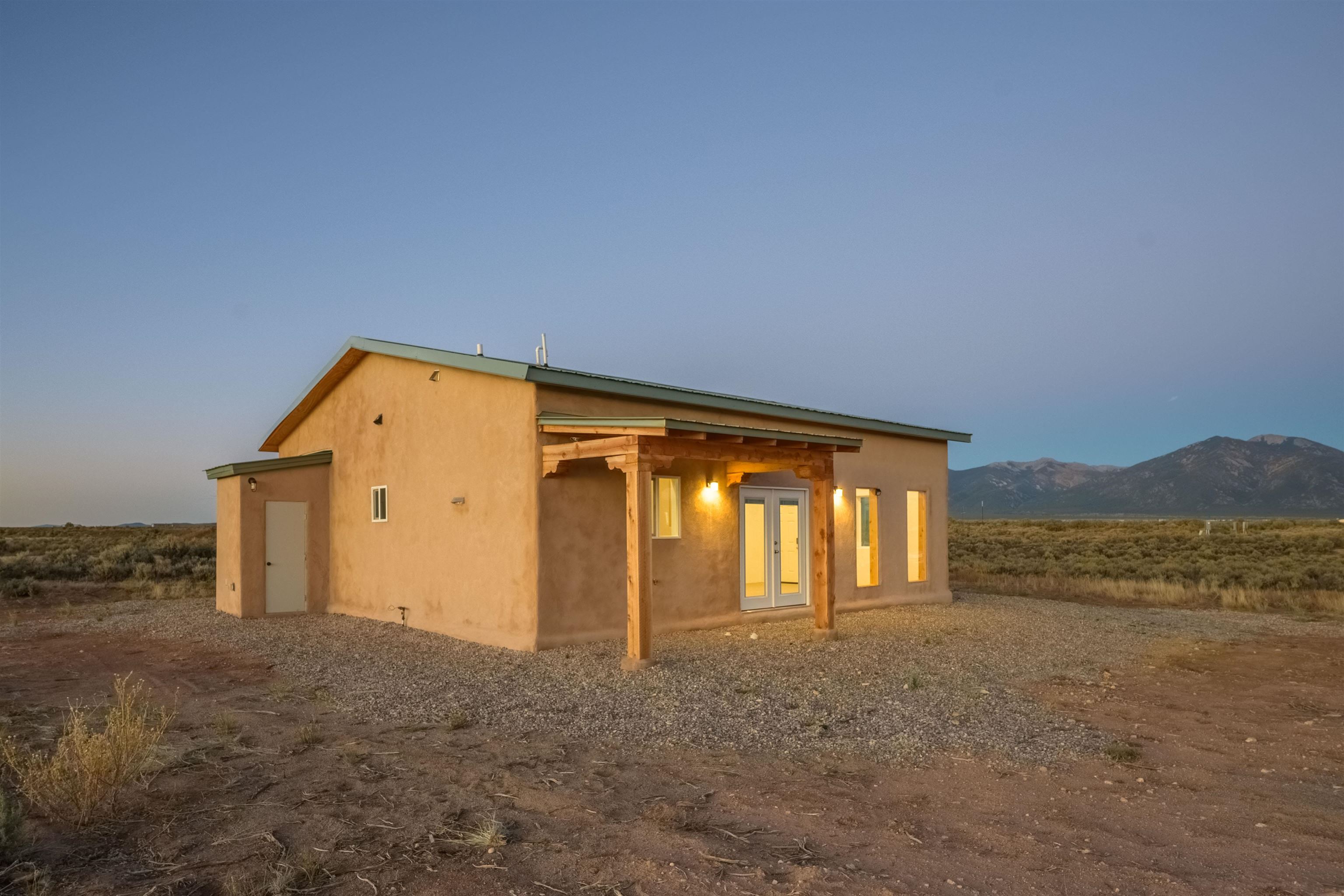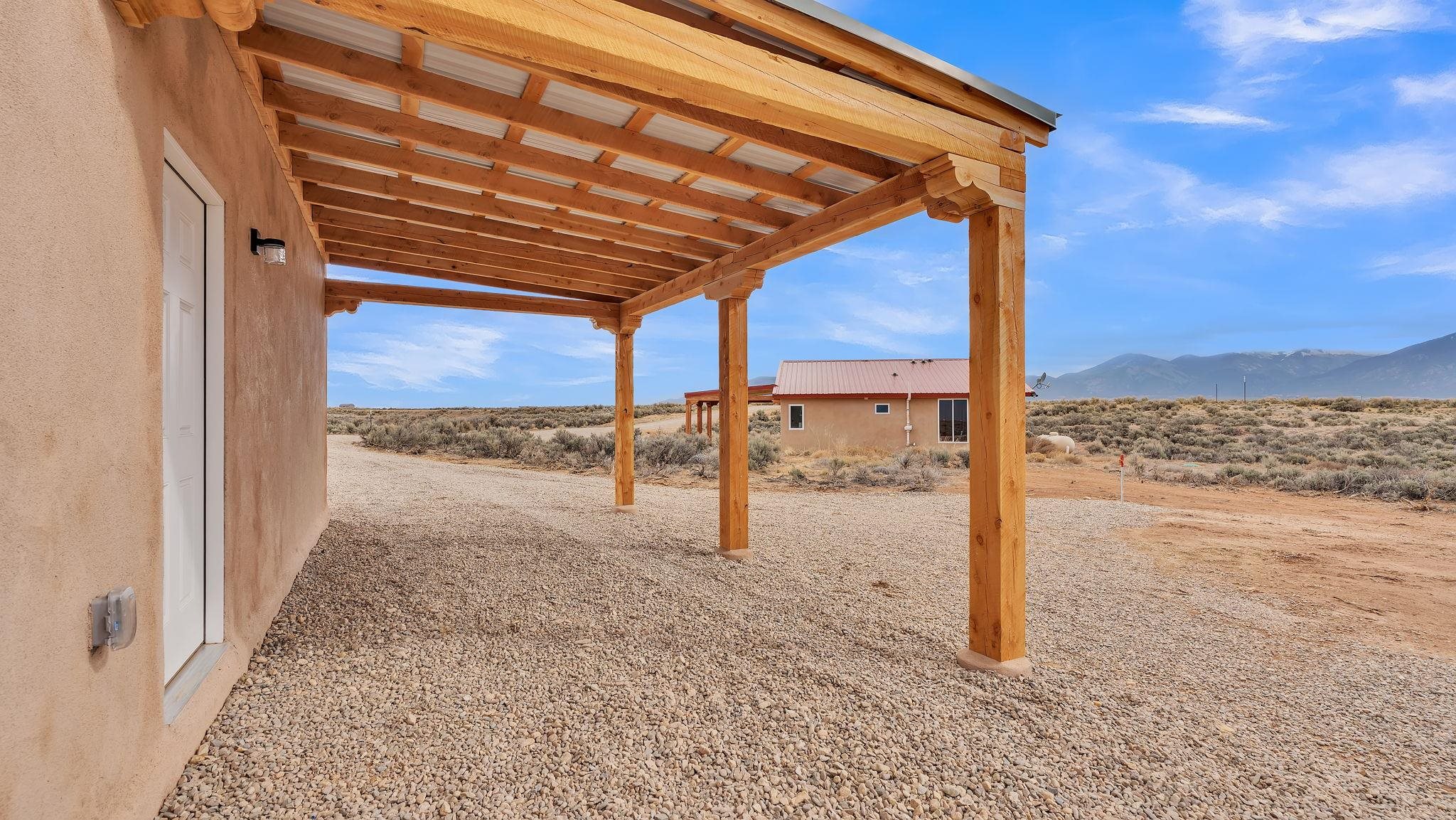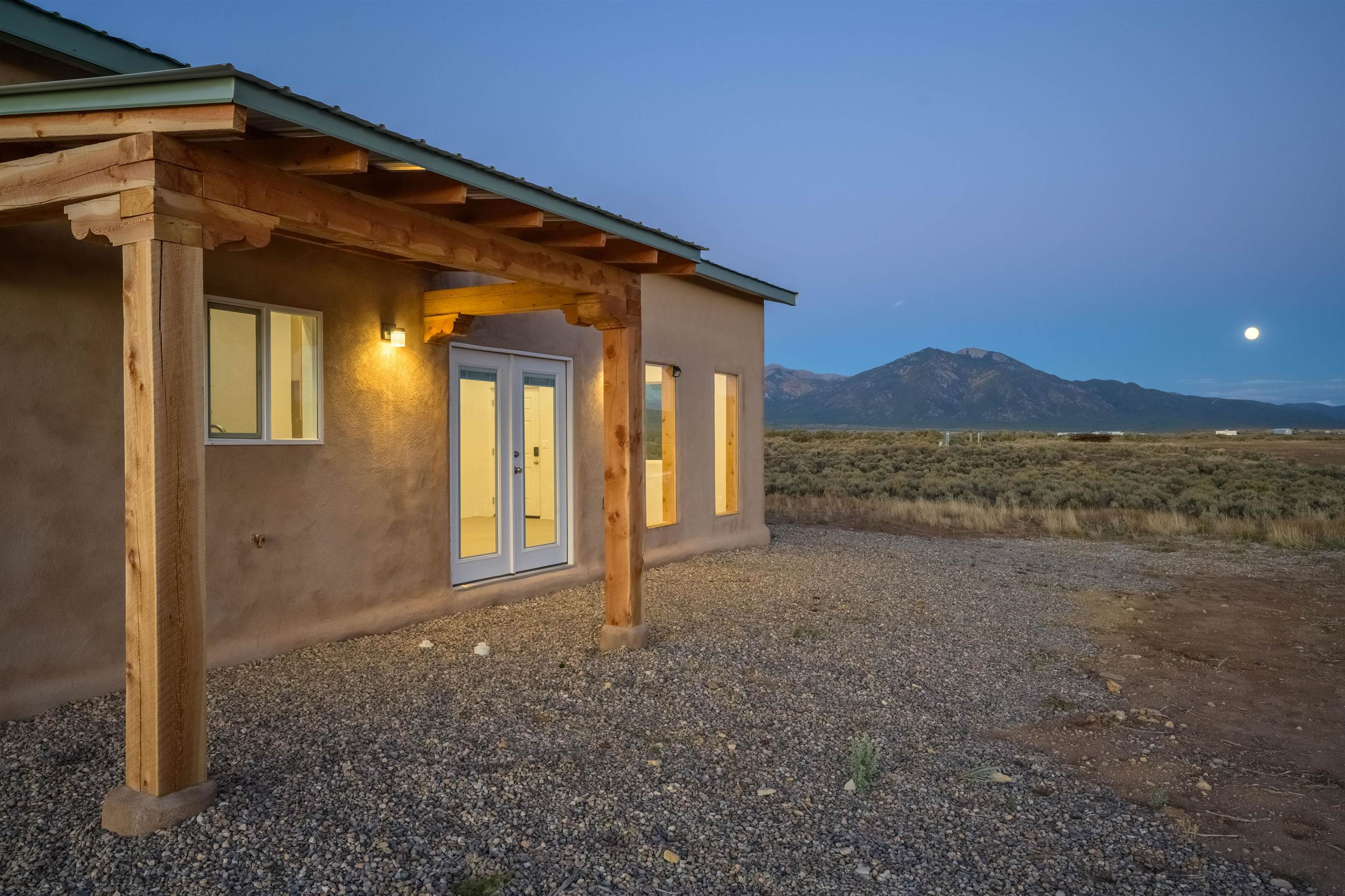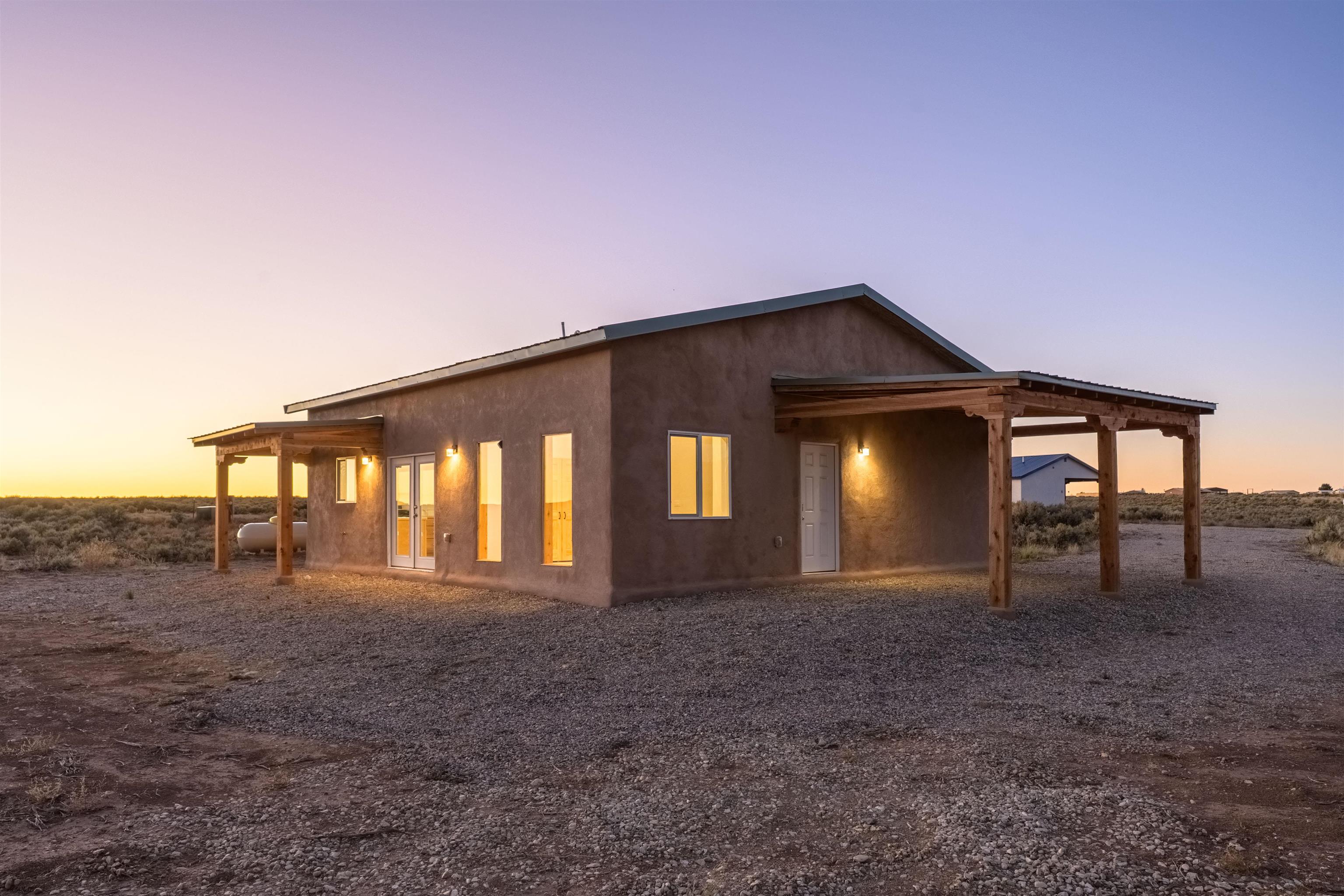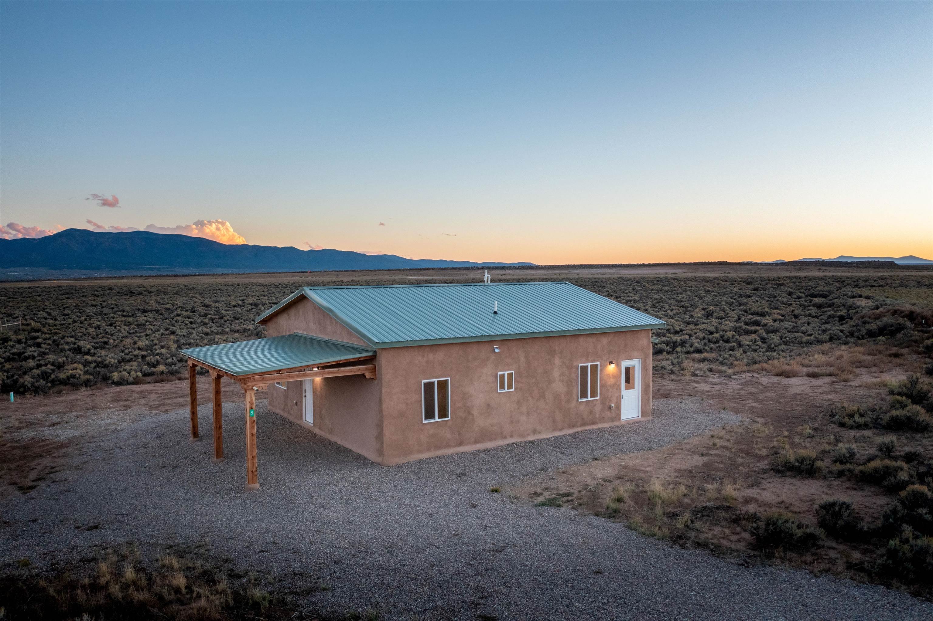 BRAND NEW CUSTOM HOME in Lower Colonias ~ Welcome to the third, extra special, and sustainable residence within the newly developed Taeo Loop Neighborhood of El Prado, Taos, New Mexico. This freshly finished 2 bed 2 bath 1,088 sqft home on 1 acre is a rare find in this sought after growing region of town. The construction is top-tier, and the home is ahead of the rest when it comes to the possibilities for saving on energy, and saving the planet being that infrastructure is in place for converting to solar if one desires. In the meantime, the solar room could be used as extra storage. The open floor plan is highly functional, and it's as if the home is double the size with the high vaulted ceiling in the living area and spacious shiny kitchen equipped with upgraded stainless steel kitchen appliances. Each of the bedrooms are large enough for big beds, the bathrooms are comfortable and sleek, and the laundry room with a full-size washer & dryer and extra storage ideal for keeping things organized. Some of the home's special features include tongue & groove ceilings, South facing floor-to-ceiling windows bring in solar passive energy throughout the day, keep the home well lit, and will be a popular place for growing tomatoes inside. The stained concrete floors make the on-demand hot water radiant heated floors extra efficient, and a steady breeze enhanced by the overhead ceiling fans promotes even greater climate control. The attached carport will make for a short trip indoors during the snowy season, and the pitched metal roof will require very little maintenance over time..As for the views, these simply cannot be beat, especially at sunset, sunrise, or a lunar/solar eclipse in the High Desert. Close proximity and outlet to Taos Ski Valley, the Rio Grande River, and all the trails for outdoor fun. Some photos have been virtually staged. Don't wait, and get in early on this newly built home, in the lovely Taeo Loop Neighborhood!