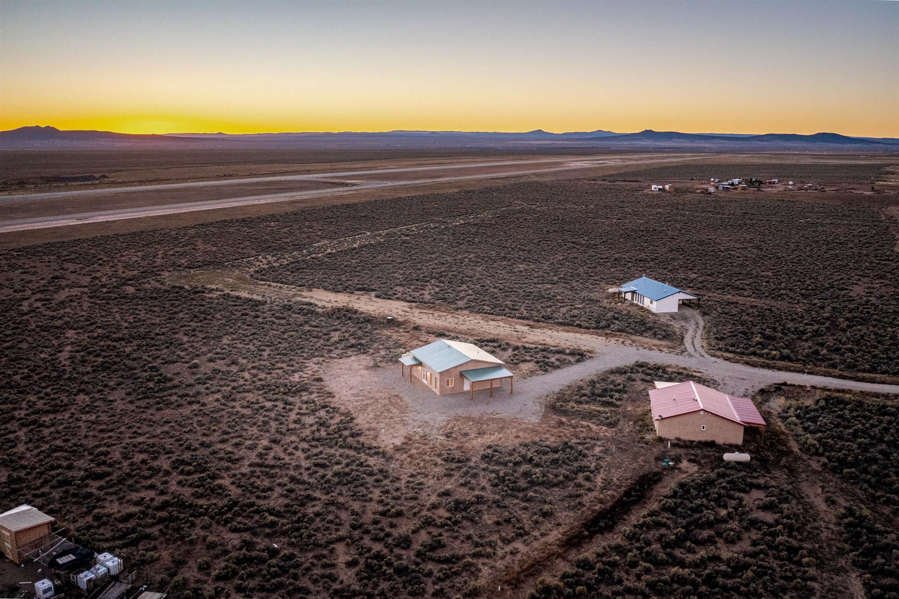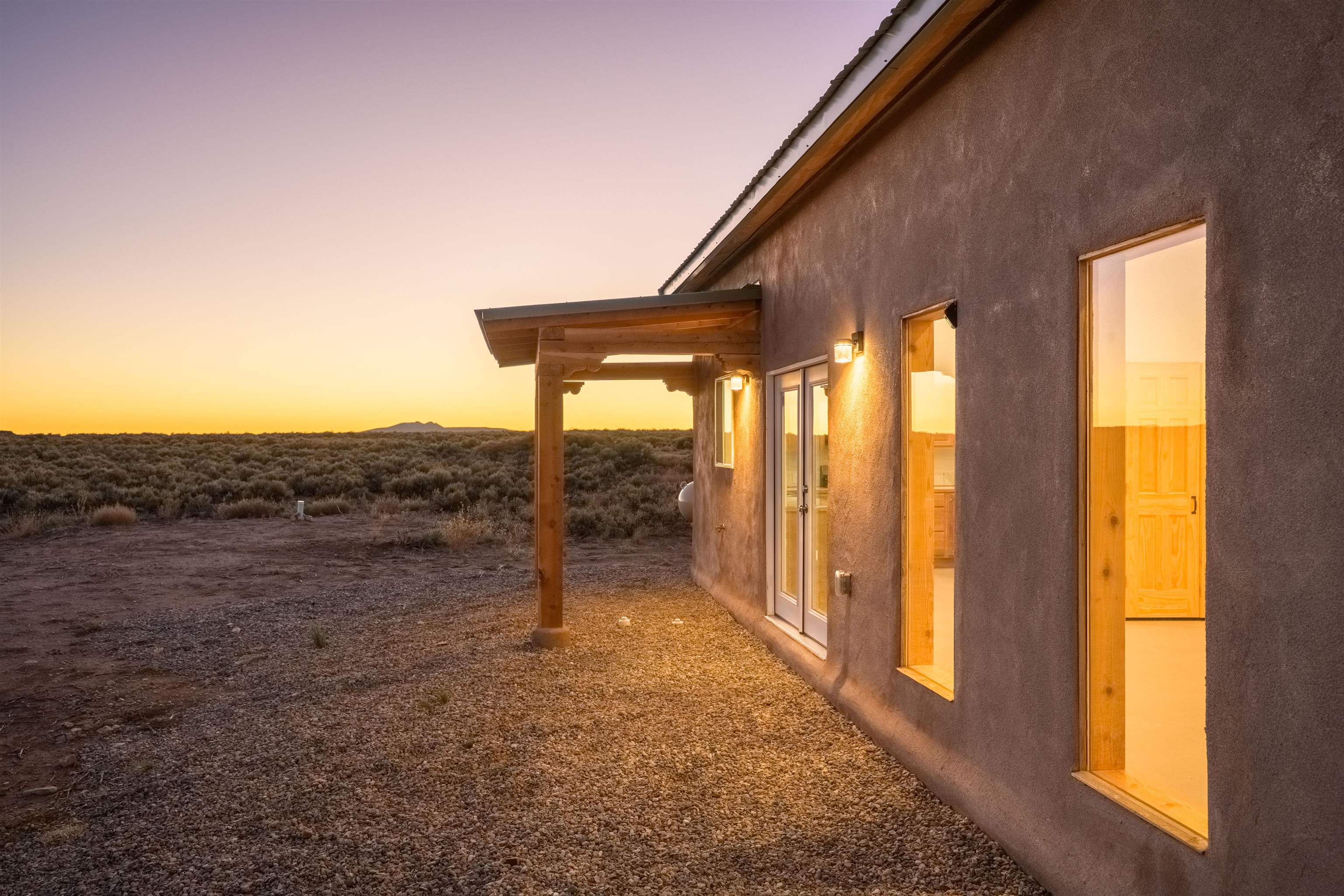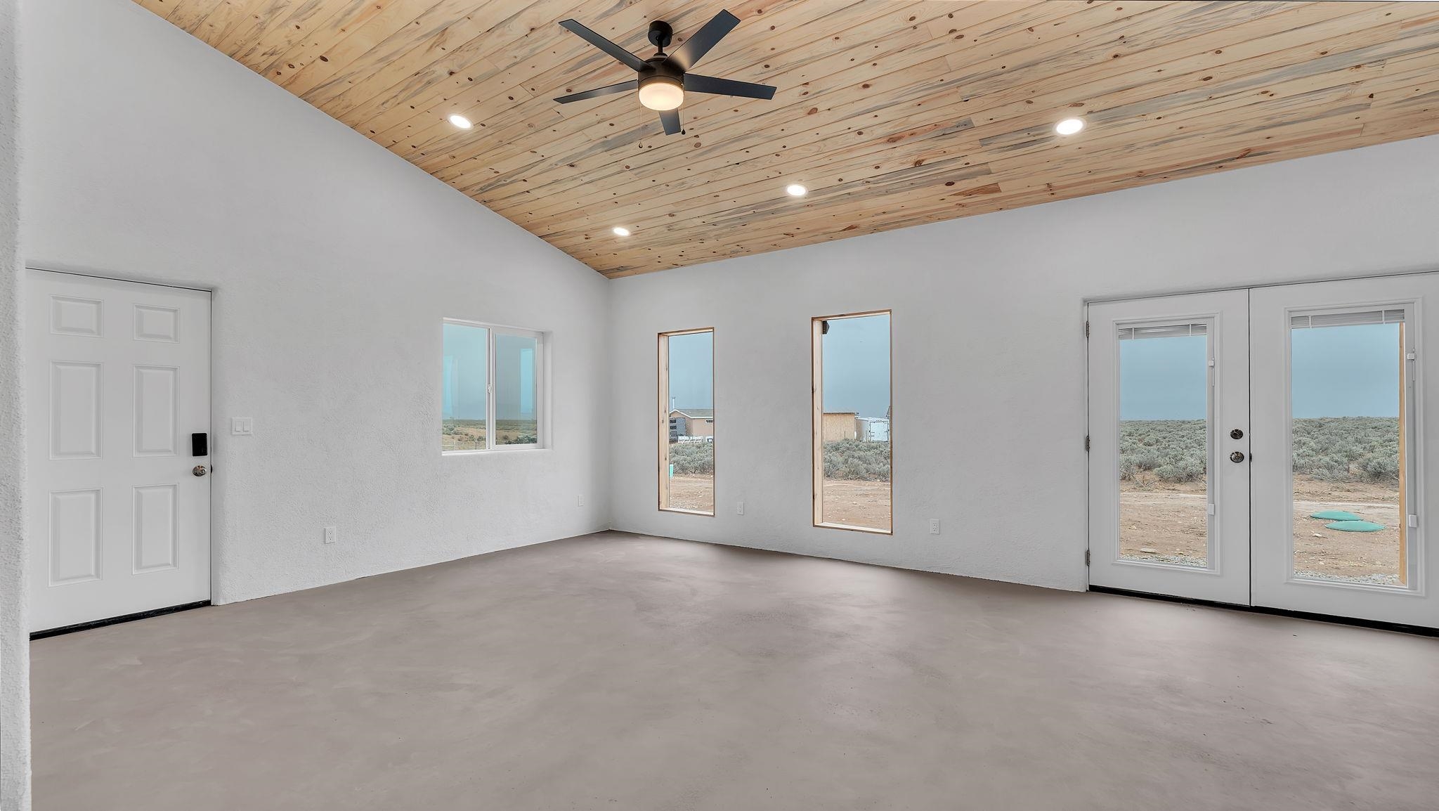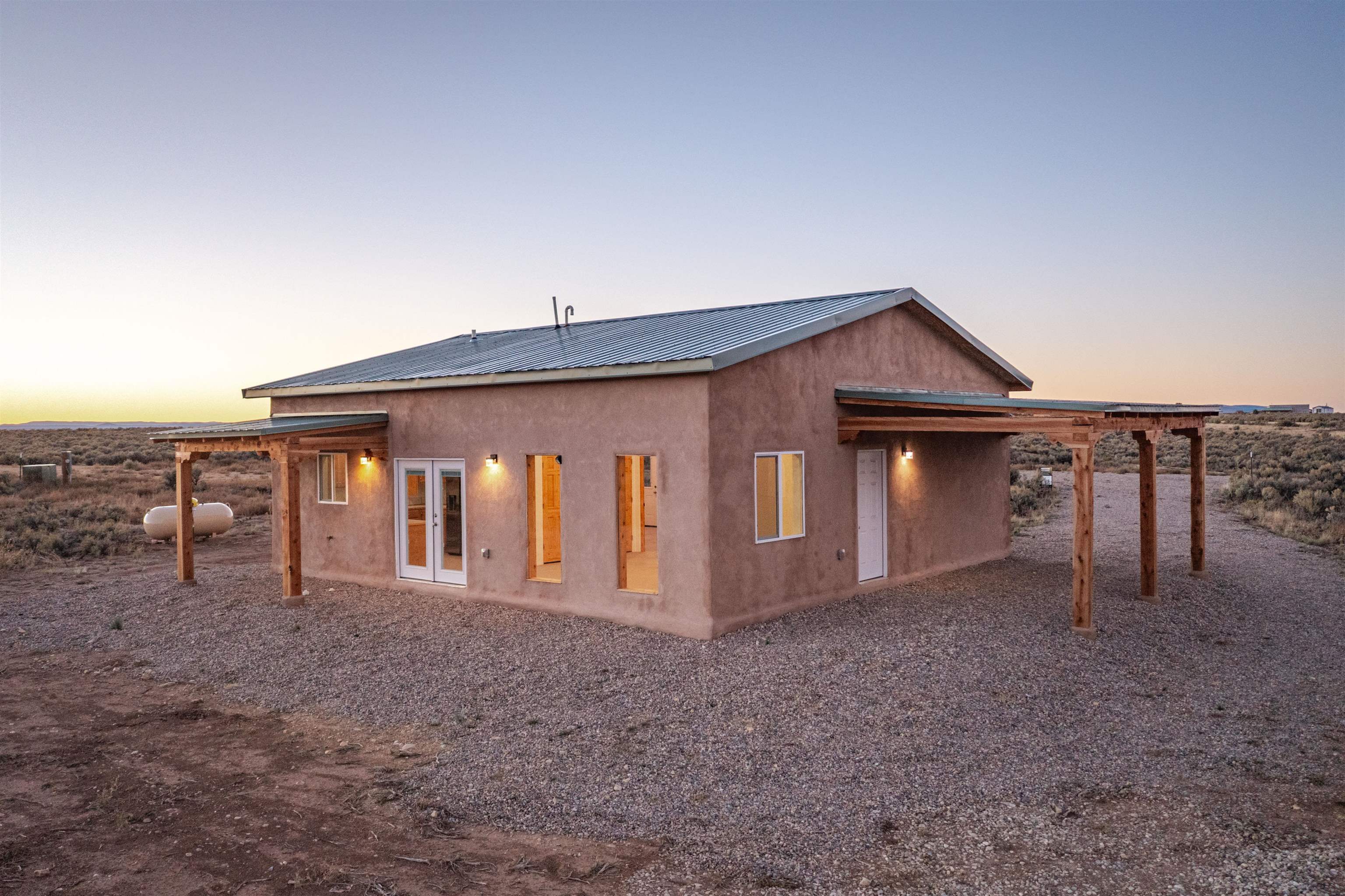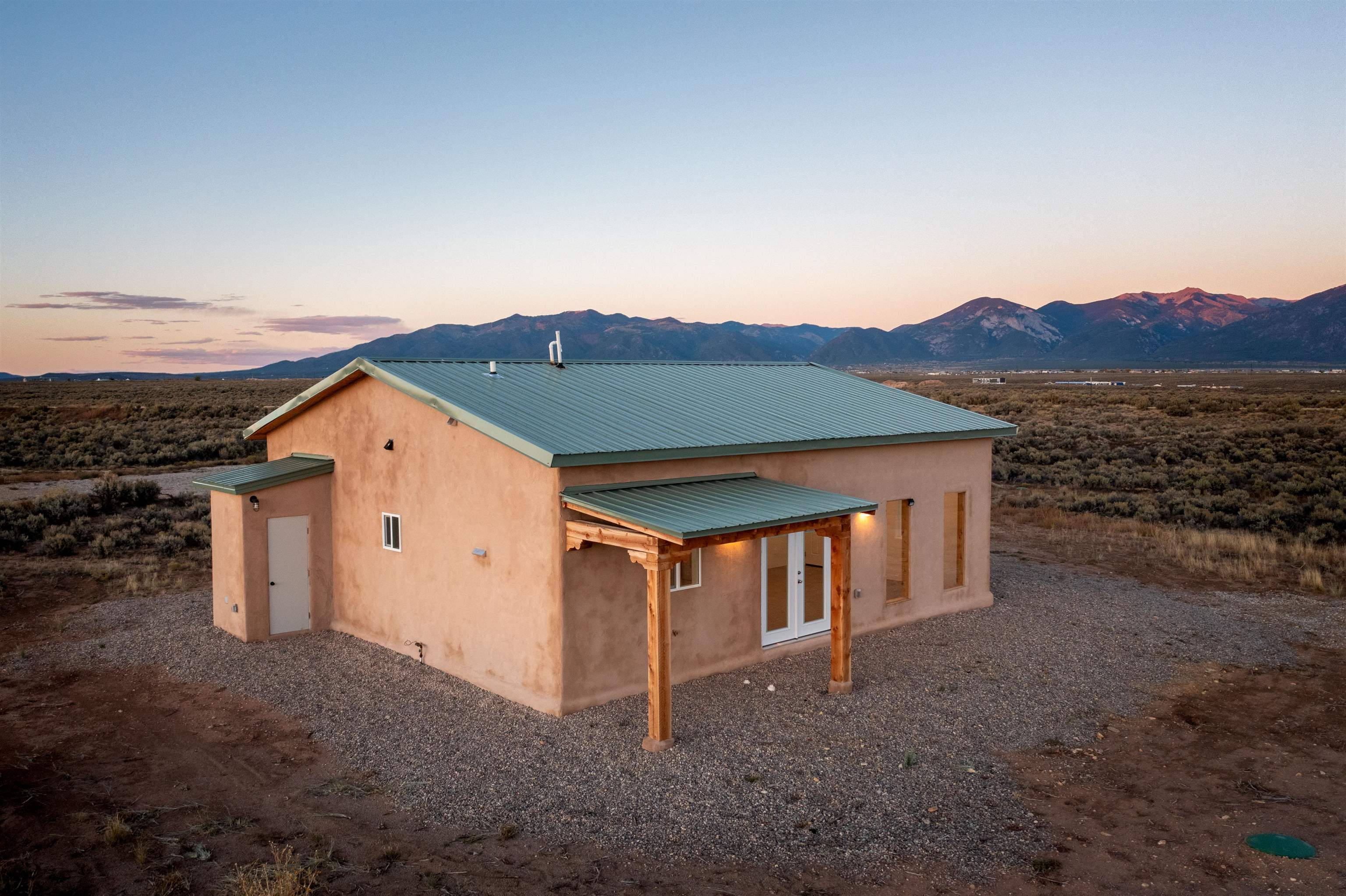 BRAND NEW CUSTOM HOME in Lower Colonias ~ Welcome to the third, extra special, and sustainable residence within the newly developed Taeo Loop Neighborhood of El Prado, Taos, New Mexico. This freshly finished 2 bed 2 bath 1,088 sqft home on 1 acre is a rare find in this sought after growing region of town. The construction is top-tier, and the home is ahead of the rest when it comes to the possibilities for saving on energy, and saving the planet being that infrastructure is in place for converting to solar if one desires. In the meantime, the solar room could be used as extra storage. The open floor plan is highly functional, and it's as if the home is double the size with the high vaulted ceiling in the living area and spacious shiny kitchen equipped with upgraded stainless steel kitchen appliances. Each of the bedrooms are large enough for big beds, the bathrooms are comfortable and sleek, and the laundry room with a full-size washer & dryer and extra storage ideal for keeping things organized. Some of the home's special features include tongue & groove ceilings, South facing floor-to-ceiling windows bring in solar passive energy throughout the day, keep the home well lit, and will be a popular place for growing tomatoes inside. The stained concrete floors make the on-demand hot water radiant heated floors extra efficient, and a steady breeze enhanced by the overhead ceiling fans promotes even greater climate control. The attached carport will make for a short trip indoors during the snowy season, and the pitched metal roof will require very little maintenance over time..As for the views, these simply cannot be beat, especially at sunset, sunrise, or a lunar/solar eclipse in the High Desert. Close proximity and outlet to Taos Ski Valley, the Rio Grande River, and all the trails for outdoor fun. Some photos have been virtually staged. Don't wait, and get in early on this newly built home, in the lovely Taeo Loop Neighborhood!