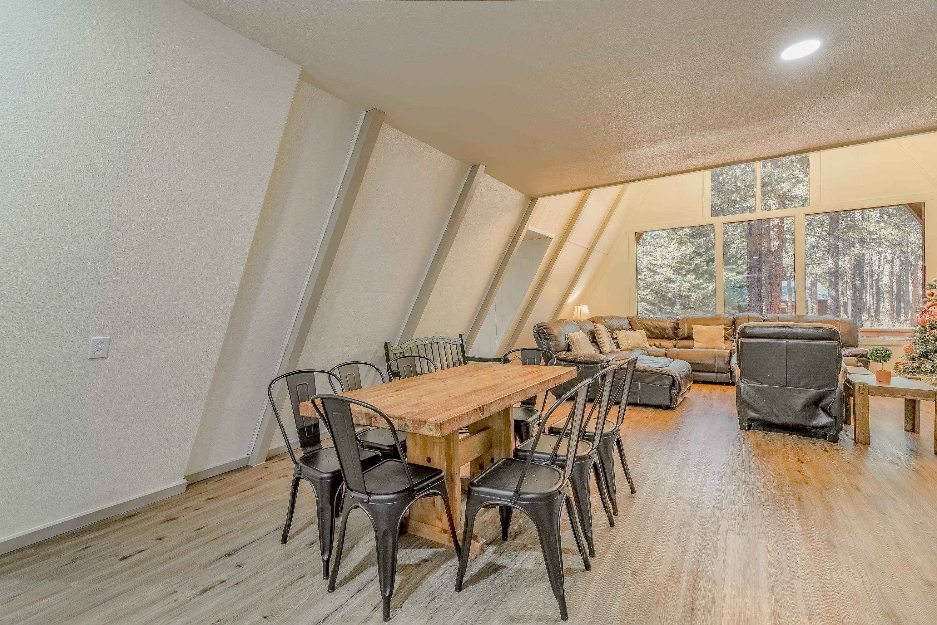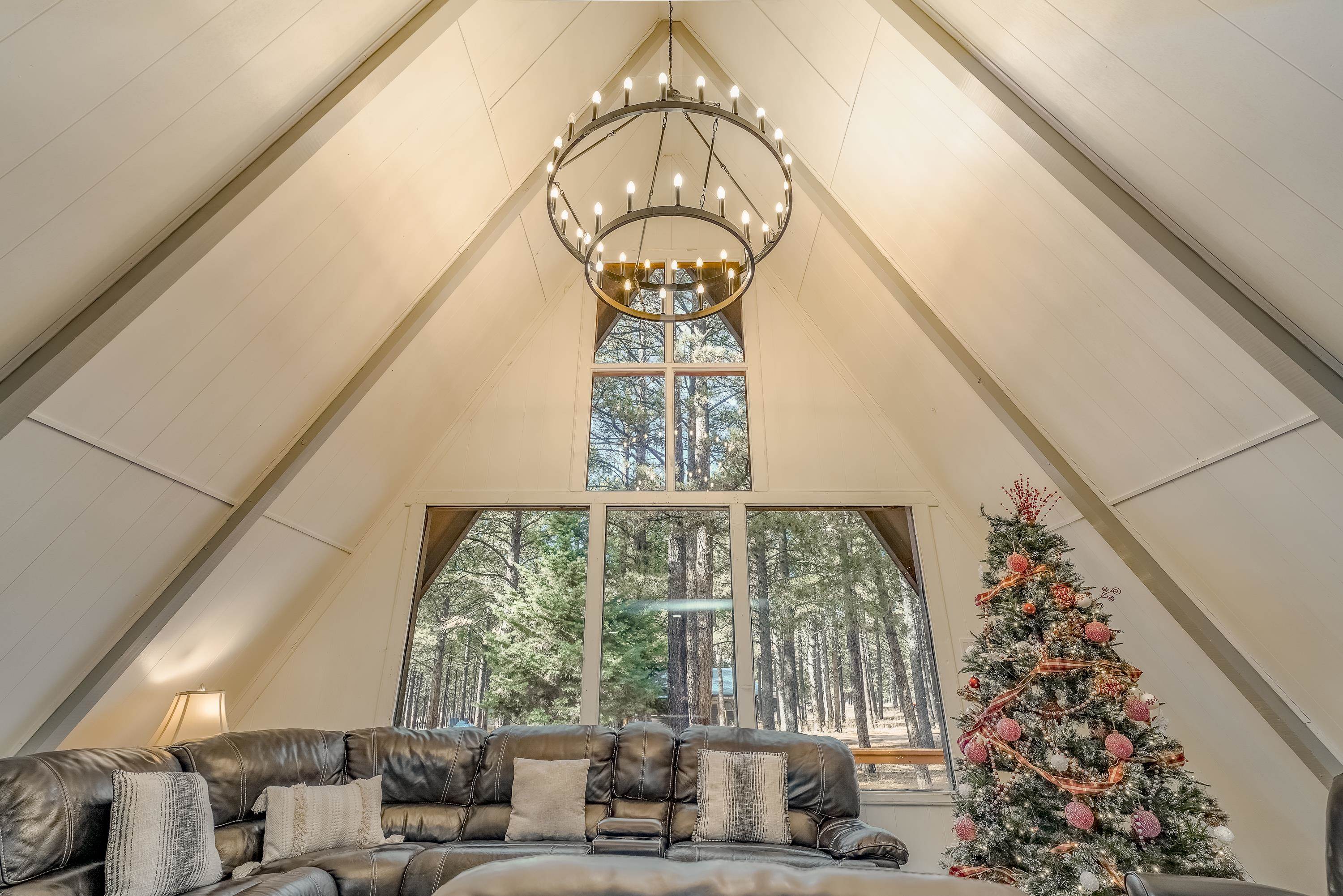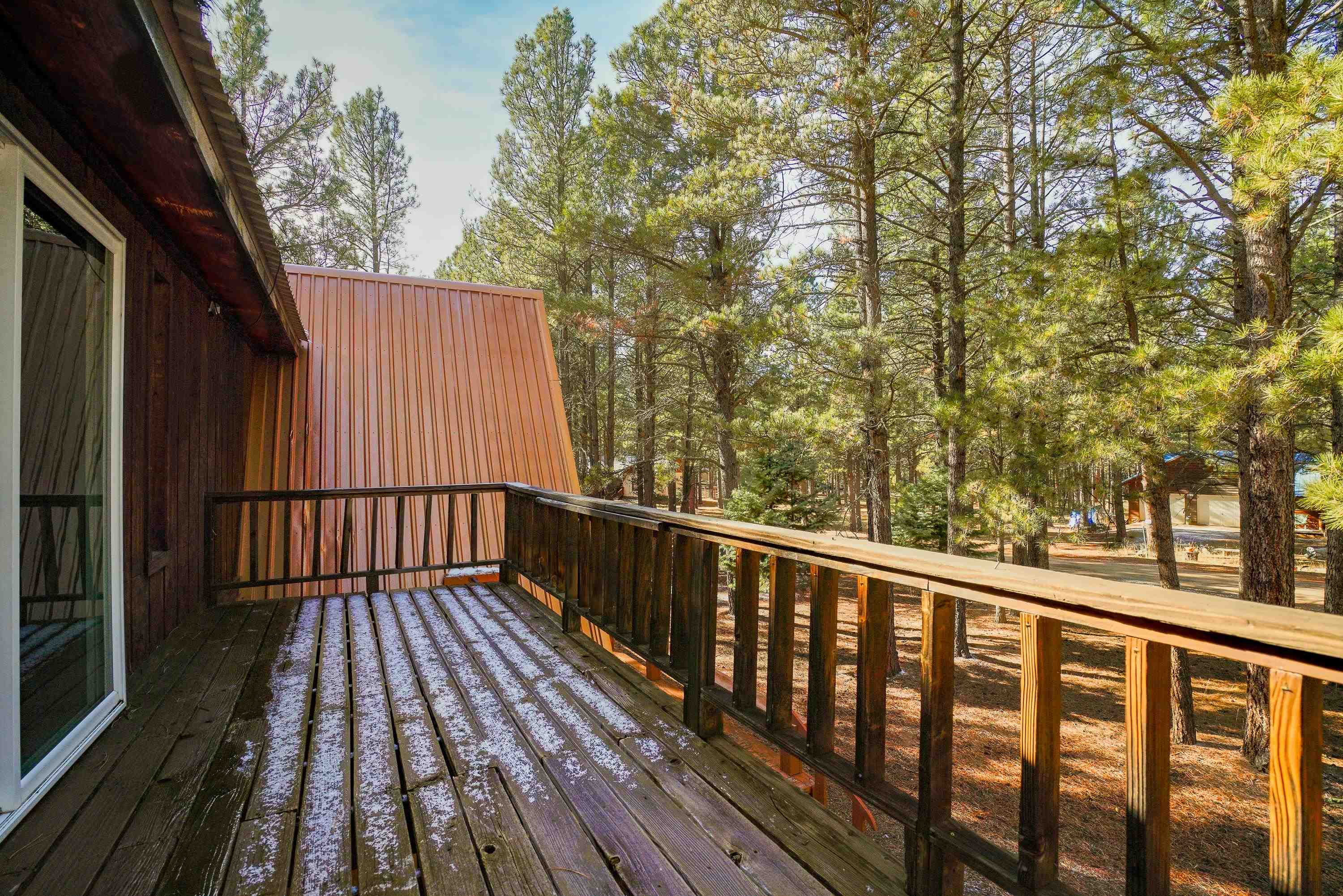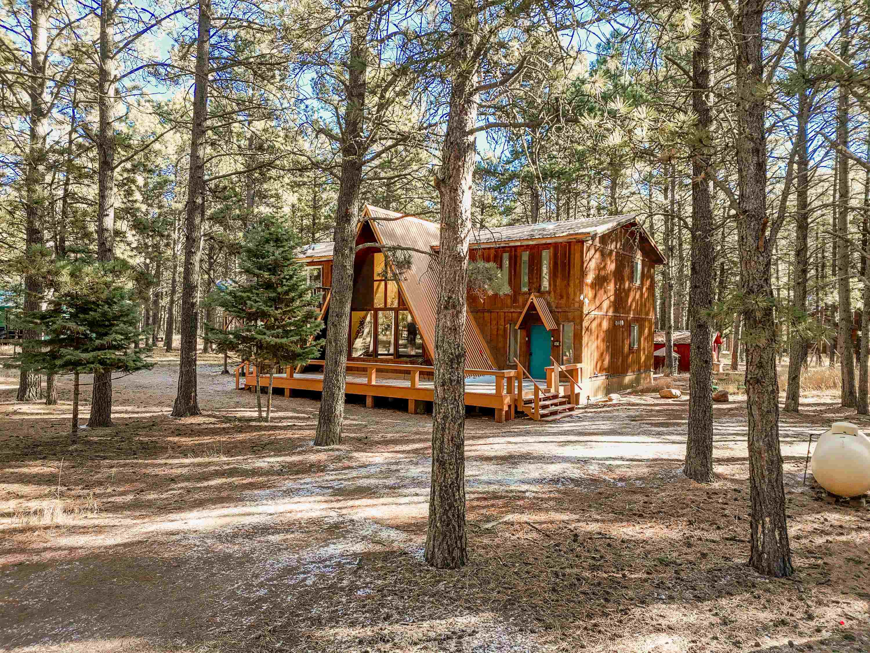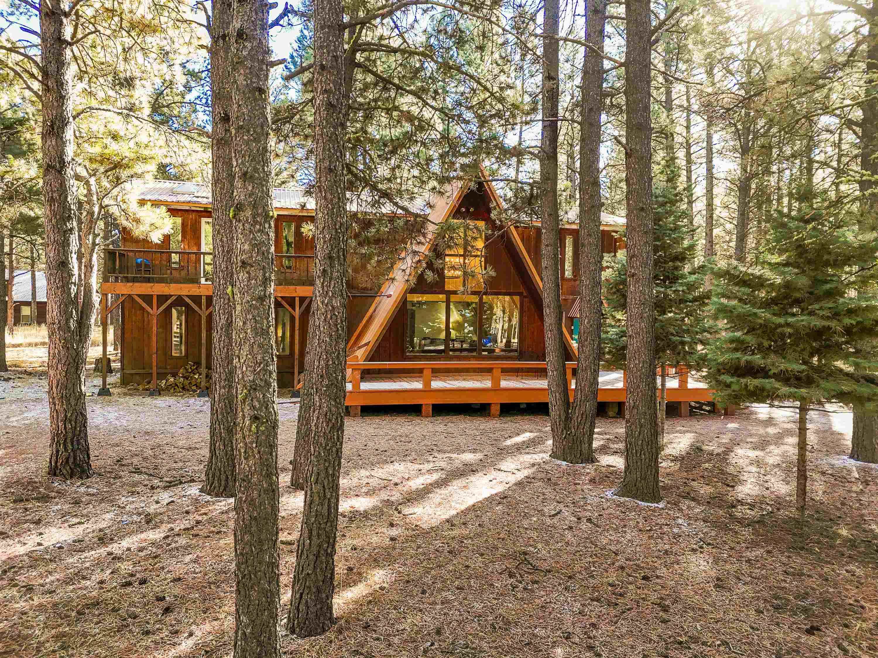 Welcome to 50 Knollwood Way, a quintessential A-frame chalet tucked into the trees with easy year-round access. Set on a peaceful, wooded half-acre, this refreshed mountain home blends timeless alpine character with thoughtful modern updates—ideal as a family retreat or rental opportunity. Inside, soaring vaulted ceilings and a dramatic window wall flood the main living area with natural light. The open living space is anchored by a freestanding wood stove, creating a cozy gathering space for après-ski evenings and mountain getaways. With five bedrooms and four full baths across nearly 3,000 square feet, there is ample room for large groups, multi-generational living, or flexible sleeping arrangements. Recent 2024 updates include refreshed flooring and paint, kitchen and bathroom improvements, a new wood stove, and a new advanced septic system designed to support the full bedroom count. Multiple decks extend the living space outdoors, perfect for relaxing among the pines and enjoying the crisp mountain air. Located just minutes from skiing, golf, hiking, and all that Angel Fire has to offer, this classic A-frame offers a rare combination of charm, space, and accessibility.