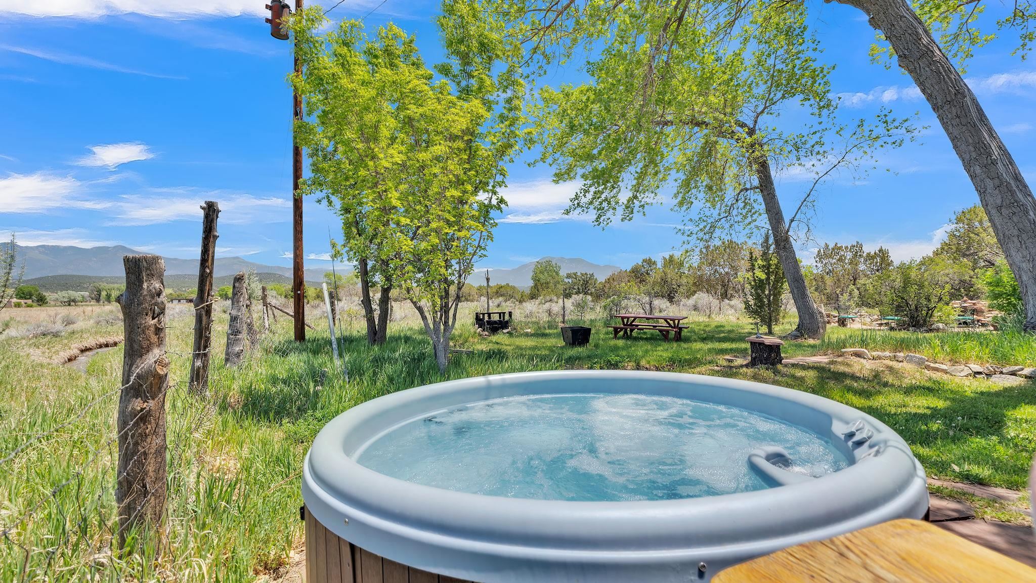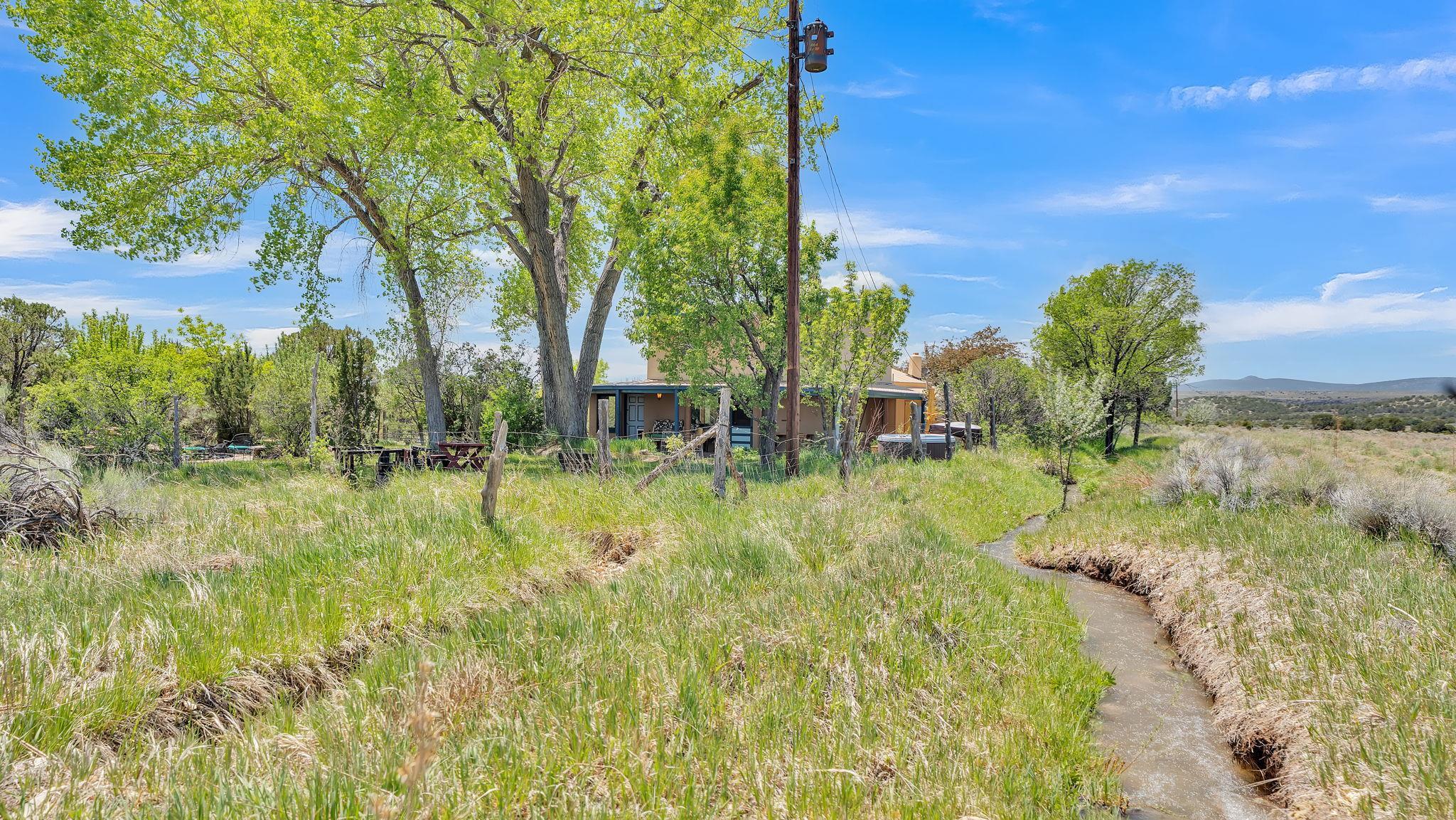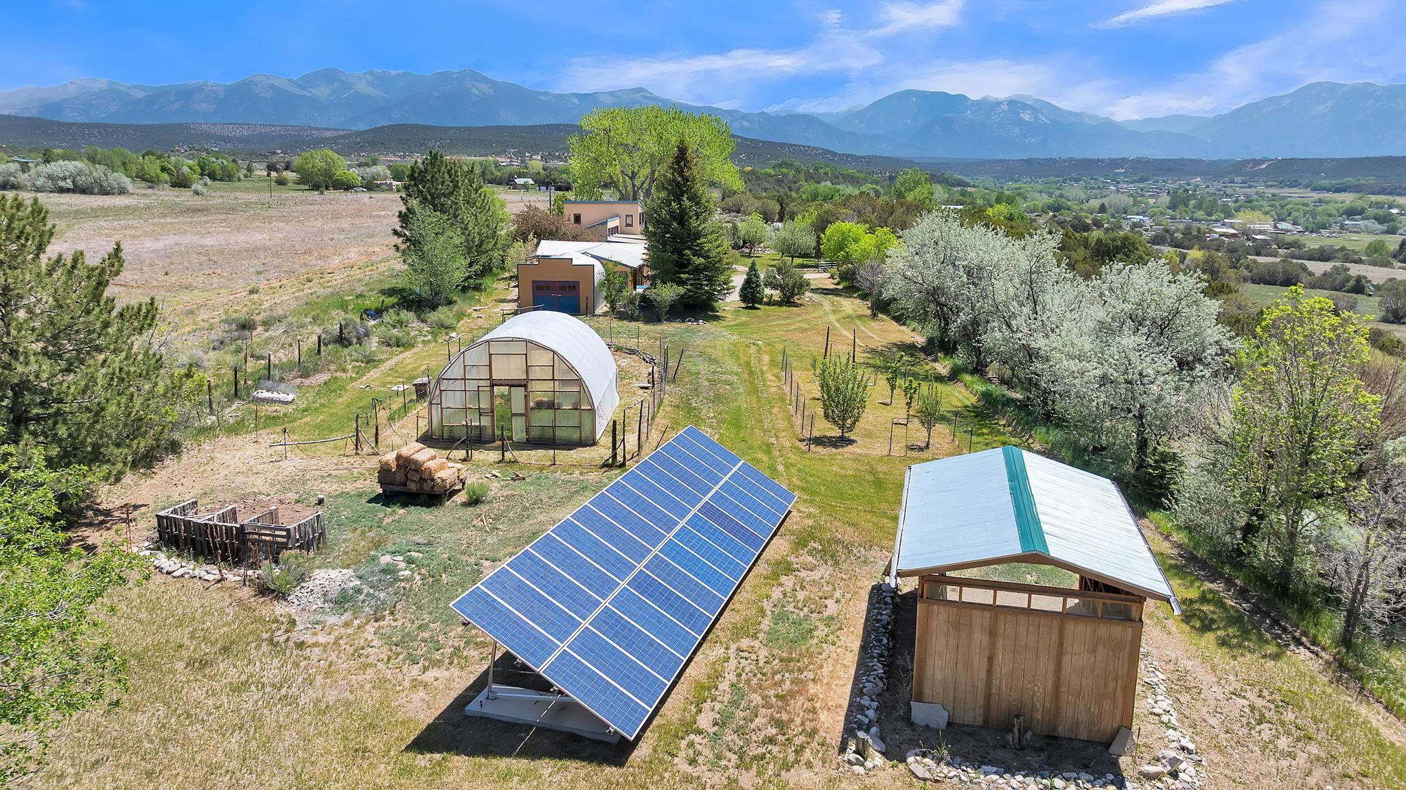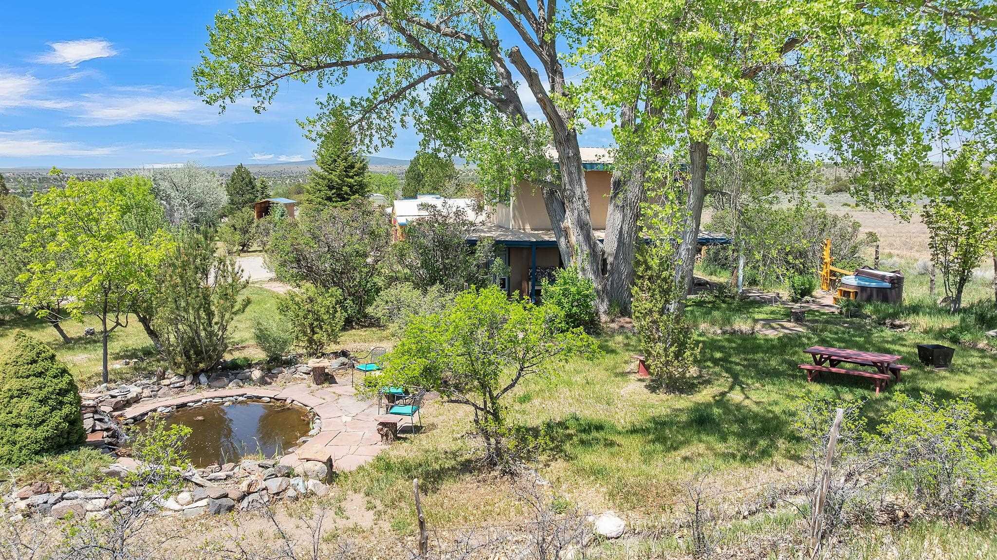 Heaven on the Arroyo Hondo North Plateau ~ It's rare to encounter a home with a soul as rich as the Atalaya House just North of town overlooking the coveted Arroyo Hondo & Taos Valley. Imagine owning a piece of history, where pottery shards from the 1800s whisper tales of ancient inhabitants in your own lush and irrigated garden. This isn't just a house; it's a living archive with the most magical 1 acre of land you will find surrounding it. Originally built in Lama from local mill scraps, the remarkable adobe home was meticulously disassembled and moved to Arroyo Hondo in the early 1950s—a testament to ingenuity and resilience. Every beam and adobe brick holds a story of its journey. Over the last 47 years, the Atalaya House has been lovingly transformed. Sunlight now pours through passive solar windows that warm flagstone floors quarried from local sites, which compliment the net-metered solar system that keep utility bills almost non-existent. Upon entering the home, you're greeted by one of several historic furniture pieces available to the next owner, followed by a stainless steel chef's kitchen with vaulted plank ceilings and adorned by a traditional wood burning fireplace, custom colorful clay plastered walls, and Las Cruces hand-made tiles that inspire true culinary adventure. The primary bedroom of the home possess special straw and mud floor. There are other unique Southwestern features, like nichos, bancos, arched windows and doorways, and even recycled chandelier lamps from the era of early electric power in Taos. The hand carved wood features throughout the residence are simply jaw dropping and considered treasure of their own. Ascend the stairs crafted with hand-carved posts from a historic hacienda to discover two bedrooms with expansive valley views, and yet another artist inspired bathroom constructed with river rock, willow branches, and fossils. Back down the stairway you pass a spacious laundry center with a dedicated egress, and out into a tranquil and majestic oasis with acequia water flowing beside a japanese inspired pond and the freestanding hot tub that offer direct views of the Sangre de Cristo mountains under colorful and vibrant cottonwood trees in the fall. The land here was made for growing, therefore the organic garden and greenhouse were built to yield bountiful harvests, which they have done so for years, and will for future generations. There is even a root cellar to store all the fruits of your labor year-round. For the creative type, the various outbuildings will make for the perfect artists studio, workshop, boat or RV storage, or possibly a second living space. The Atalaya House isn't merely another property; it’s an invitation to live within a legacy, where every corner holds a secret, and every sunrise promises new inspiration. Are you ready to be its next chapter?