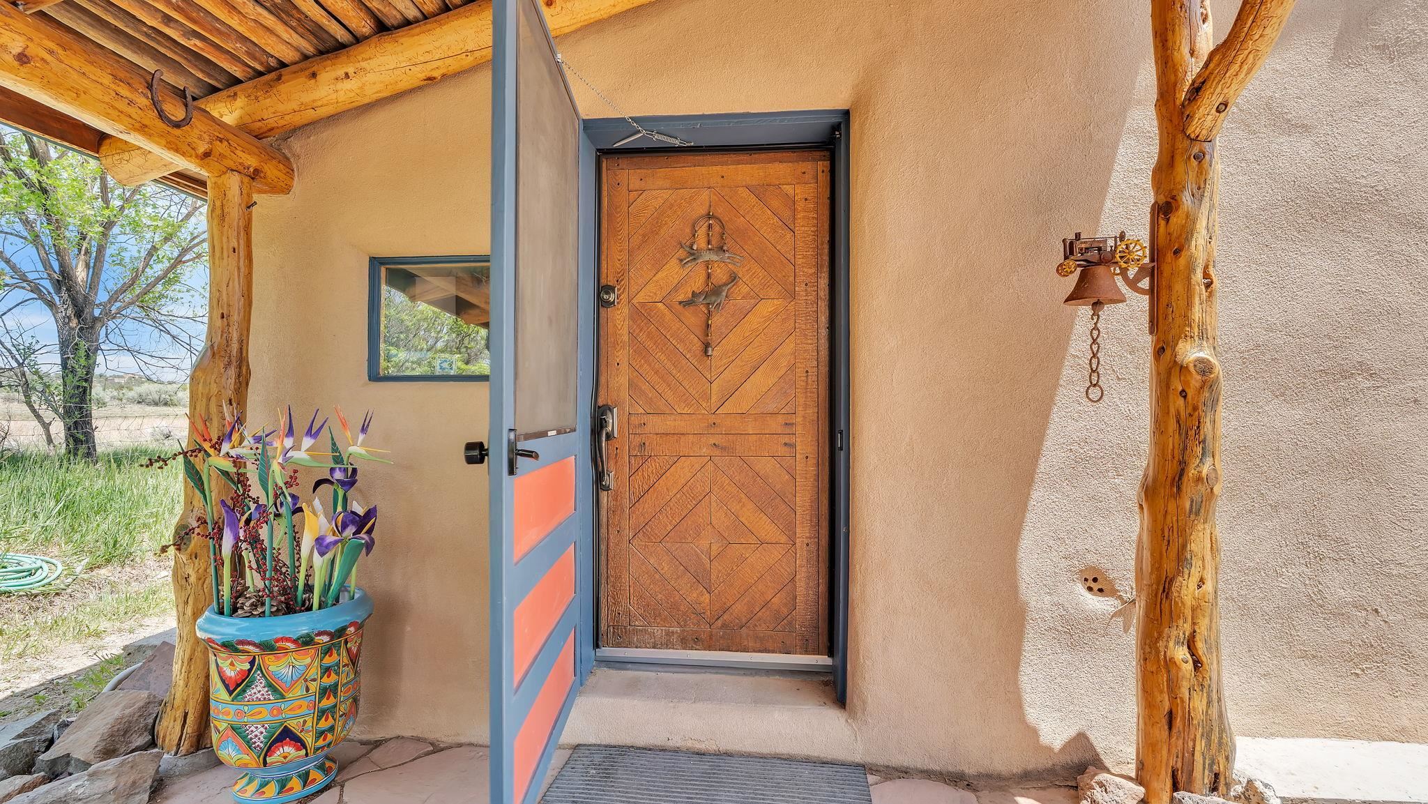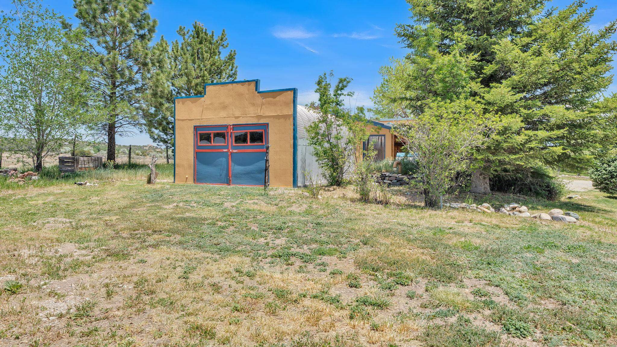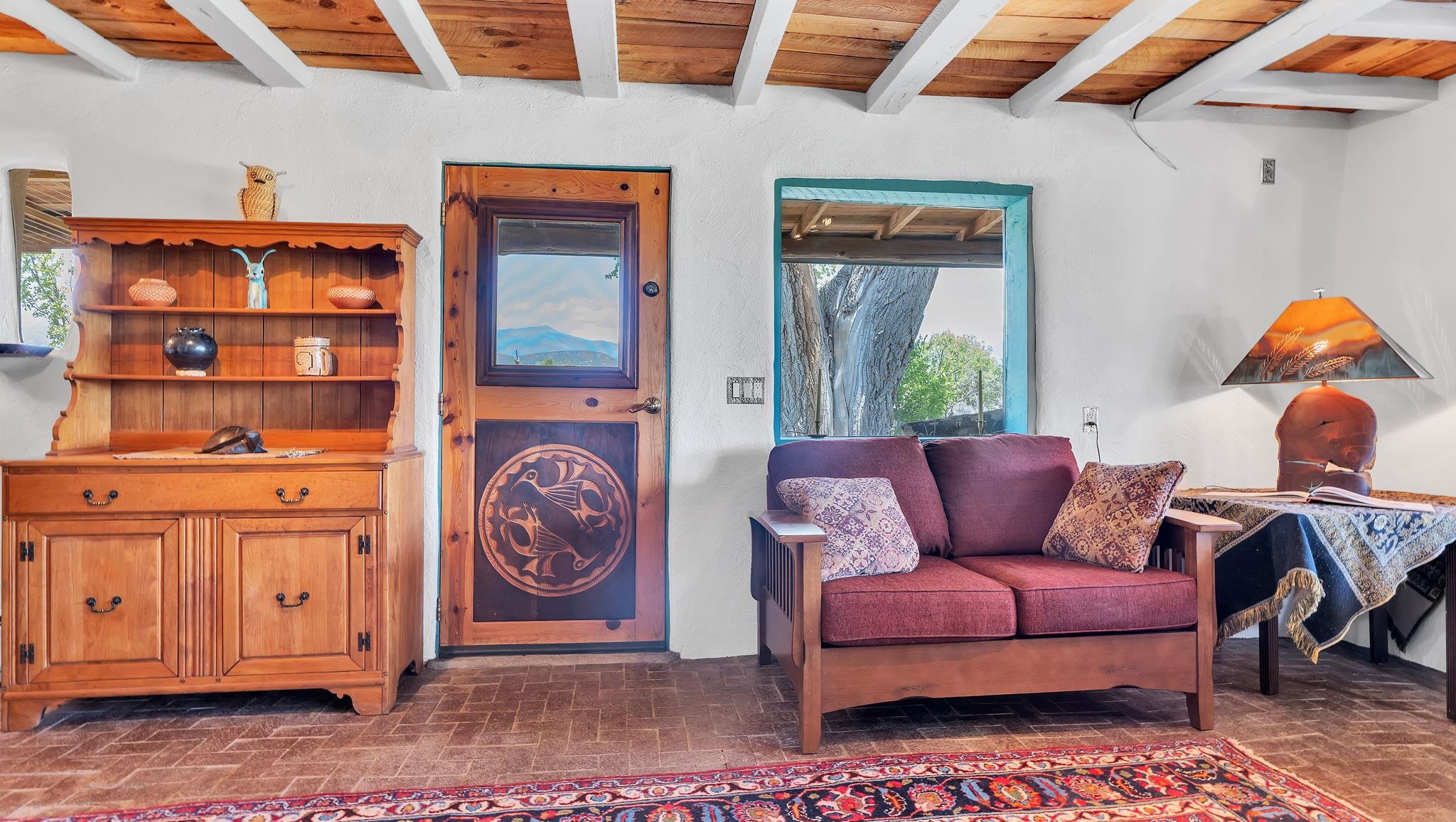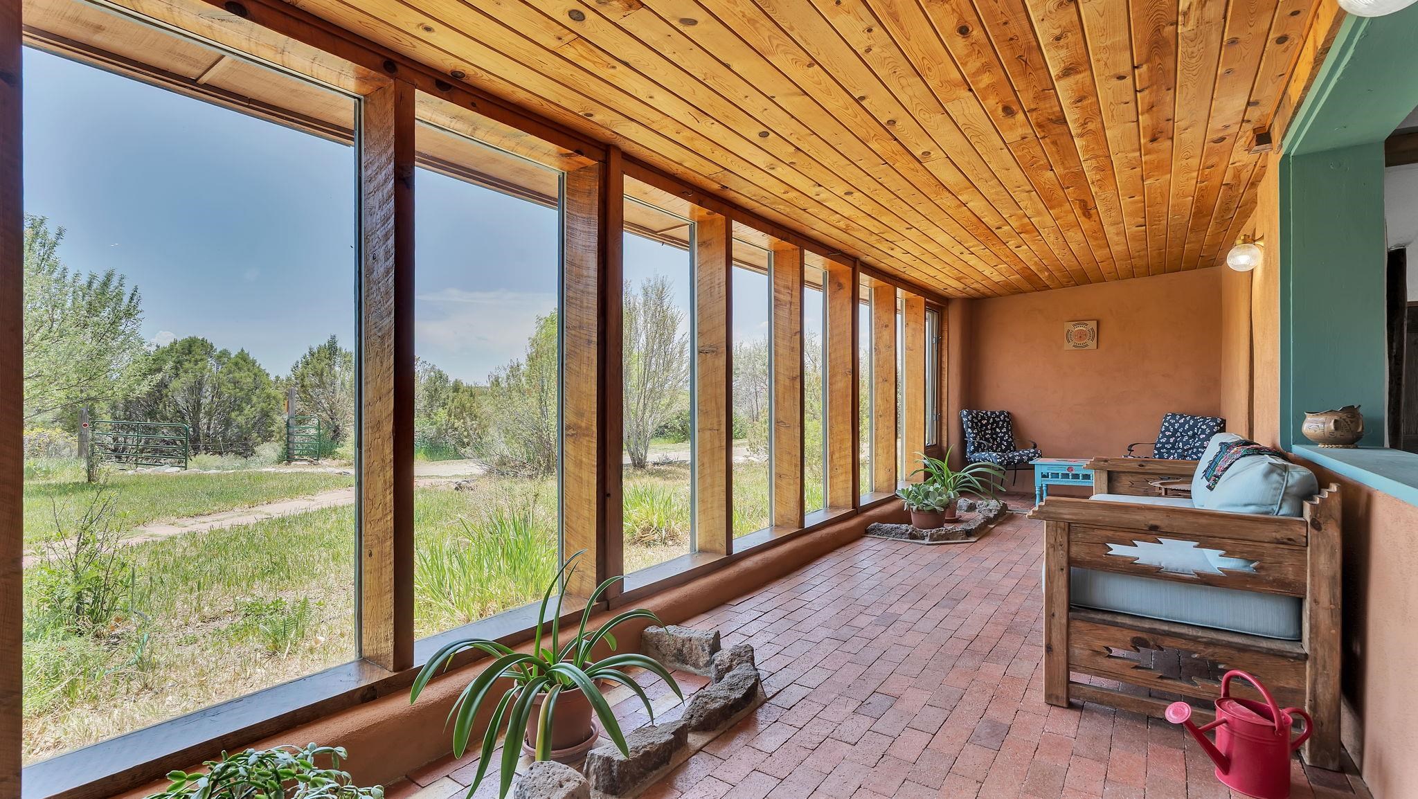 Heaven on the Arroyo Hondo North Plateau ~ It's rare to encounter a home with a soul as rich as the Atalaya House just North of town overlooking the coveted Arroyo Hondo & Taos Valley. Imagine owning a piece of history, where pottery shards from the 1800s whisper tales of ancient inhabitants in your own lush and irrigated garden. This isn't just a house; it's a living archive with the most magical 1 acre of land you will find surrounding it. Originally built in Lama from local mill scraps, the remarkable adobe home was meticulously disassembled and moved to Arroyo Hondo in the early 1950s—a testament to ingenuity and resilience. Every beam and adobe brick holds a story of its journey. Over the last 47 years, the Atalaya House has been lovingly transformed. Sunlight now pours through passive solar windows that warm flagstone floors quarried from local sites, which compliment the net-metered solar system that keep utility bills almost non-existent. Upon entering the home, you're greeted by one of several historic furniture pieces available to the next owner, followed by a stainless steel chef's kitchen with vaulted plank ceilings and adorned by a traditional wood burning fireplace, custom colorful clay plastered walls, and Las Cruces hand-made tiles that inspire true culinary adventure. The primary bedroom of the home possess special straw and mud floor. There are other unique Southwestern features, like nichos, bancos, arched windows and doorways, and even recycled chandelier lamps from the era of early electric power in Taos. The hand carved wood features throughout the residence are simply jaw dropping and considered treasure of their own. Ascend the stairs crafted with hand-carved posts from a historic hacienda to discover two bedrooms with expansive valley views, and yet another artist inspired bathroom constructed with river rock, willow branches, and fossils. Back down the stairway you pass a spacious laundry center with a dedicated egress, and out into a tranquil and majestic oasis with acequia water flowing beside a japanese inspired pond and the freestanding hot tub that offer direct views of the Sangre de Cristo mountains under colorful and vibrant cottonwood trees in the fall. The land here was made for growing, therefore the organic garden and greenhouse were built to yield bountiful harvests, which they have done so for years, and will for future generations. There is even a root cellar to store all the fruits of your labor year-round. For the creative type, the various outbuildings will make for the perfect artists studio, workshop, boat or RV storage, or possibly a second living space. The Atalaya House isn't merely another property; it’s an invitation to live within a legacy, where every corner holds a secret, and every sunrise promises new inspiration. Are you ready to be its next chapter?