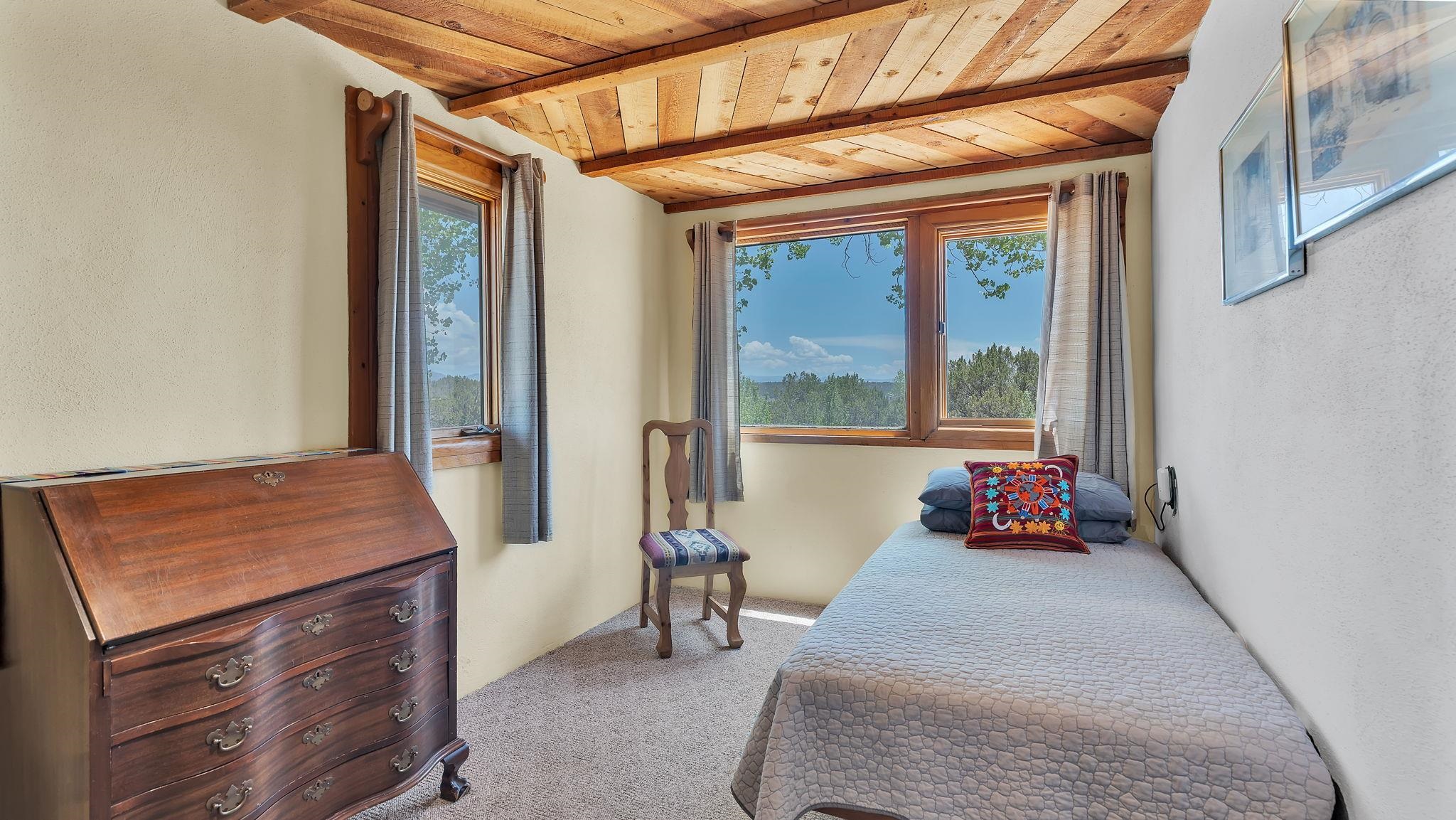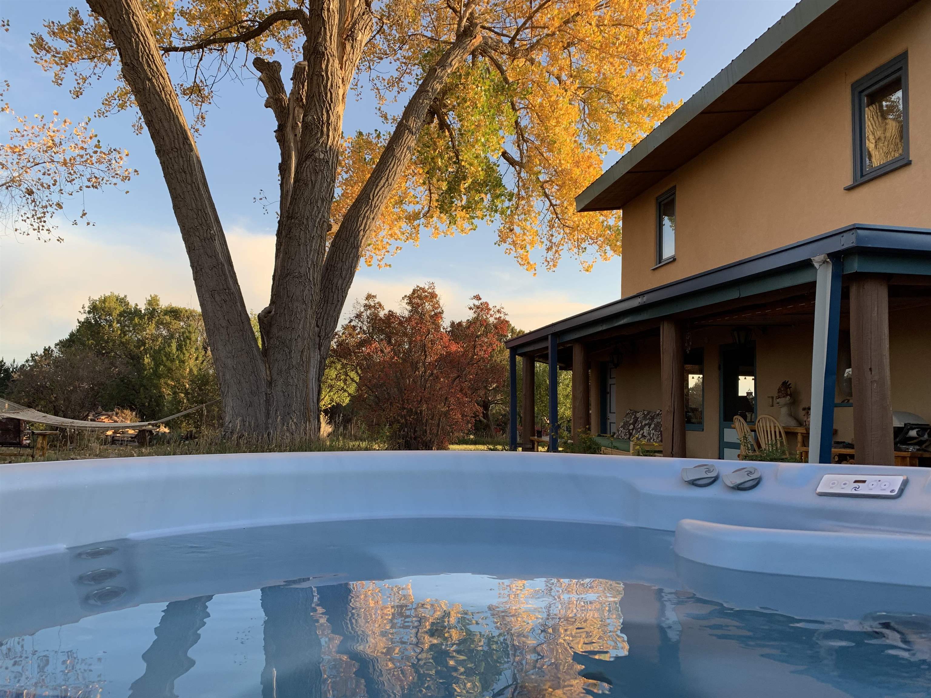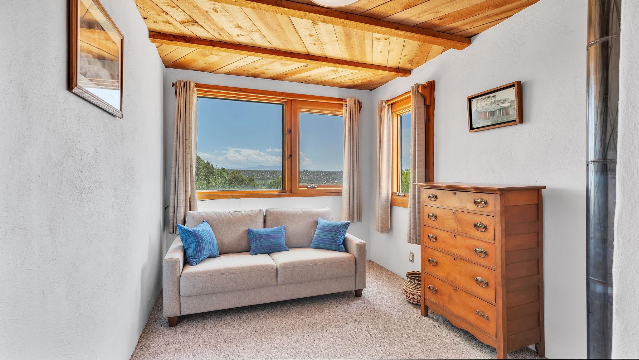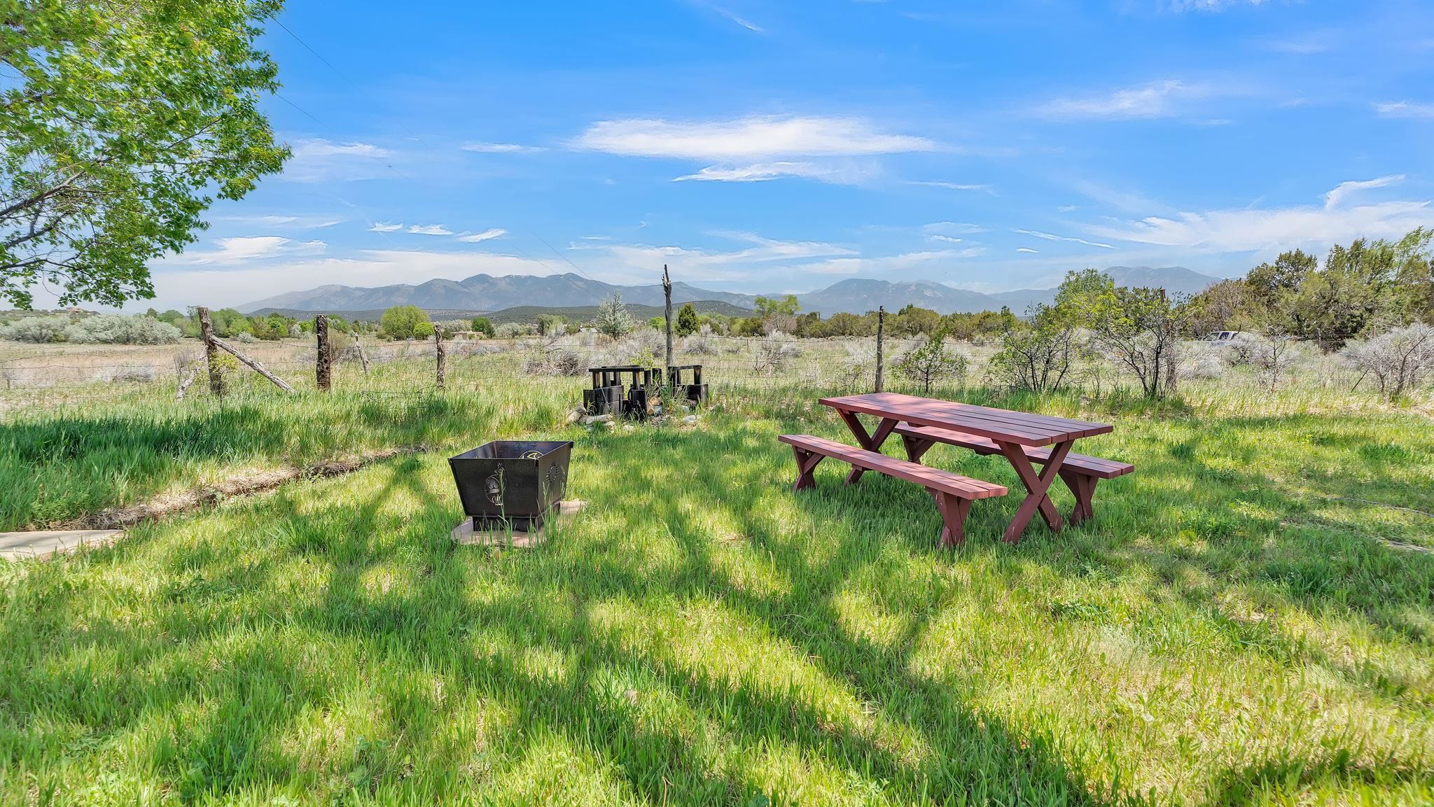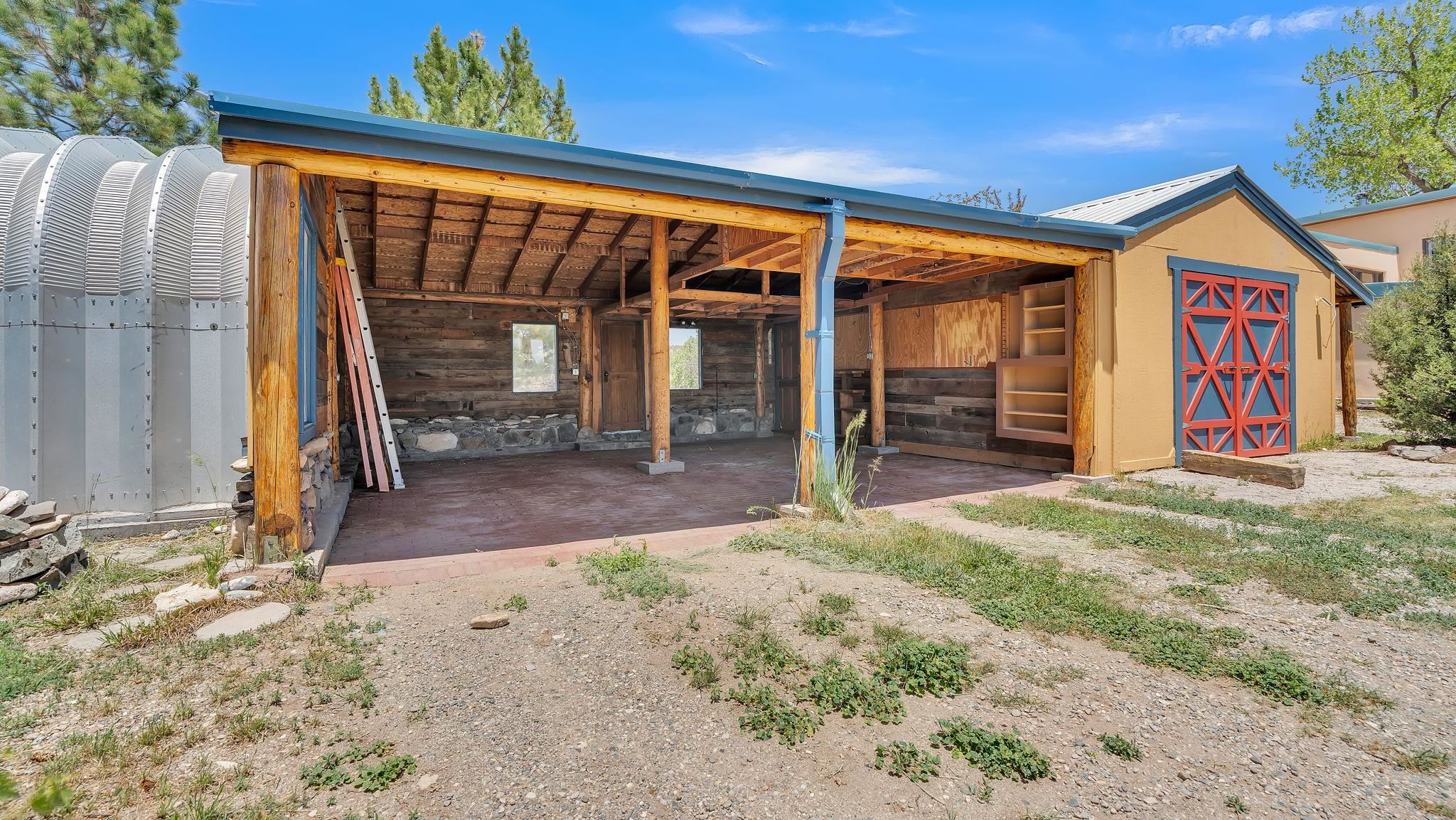 Heaven on the Arroyo Hondo North Plateau ~ It's rare to encounter a home with a soul as rich as the Atalaya House just North of town overlooking the coveted Arroyo Hondo & Taos Valley. Imagine owning a piece of history, where pottery shards from the 1800s whisper tales of ancient inhabitants in your own lush and irrigated garden. This isn't just a house; it's a living archive with the most magical 1 acre of land you will find surrounding it. Originally built in Lama from local mill scraps, the remarkable adobe home was meticulously disassembled and moved to Arroyo Hondo in the early 1950s—a testament to ingenuity and resilience. Every beam and adobe brick holds a story of its journey. Over the last 47 years, the Atalaya House has been lovingly transformed. Sunlight now pours through passive solar windows that warm flagstone floors quarried from local sites, which compliment the net-metered solar system that keep utility bills almost non-existent. Upon entering the home, you're greeted by one of several historic furniture pieces available to the next owner, followed by a stainless steel chef's kitchen with vaulted plank ceilings and adorned by a traditional wood burning fireplace, custom colorful clay plastered walls, and Las Cruces hand-made tiles that inspire true culinary adventure. The primary bedroom of the home possess special straw and mud floor. There are other unique Southwestern features, like nichos, bancos, arched windows and doorways, and even recycled chandelier lamps from the era of early electric power in Taos. The hand carved wood features throughout the residence are simply jaw dropping and considered treasure of their own. Ascend the stairs crafted with hand-carved posts from a historic hacienda to discover two bedrooms with expansive valley views, and yet another artist inspired bathroom constructed with river rock, willow branches, and fossils. Back down the stairway you pass a spacious laundry center with a dedicated egress, and out into a tranquil and majestic oasis with acequia water flowing beside a japanese inspired pond and the freestanding hot tub that offer direct views of the Sangre de Cristo mountains under colorful and vibrant cottonwood trees in the fall. The land here was made for growing, therefore the organic garden and greenhouse were built to yield bountiful harvests, which they have done so for years, and will for future generations. There is even a root cellar to store all the fruits of your labor year-round. For the creative type, the various outbuildings will make for the perfect artists studio, workshop, boat or RV storage, or possibly a second living space. The Atalaya House isn't merely another property; it’s an invitation to live within a legacy, where every corner holds a secret, and every sunrise promises new inspiration. Are you ready to be its next chapter?