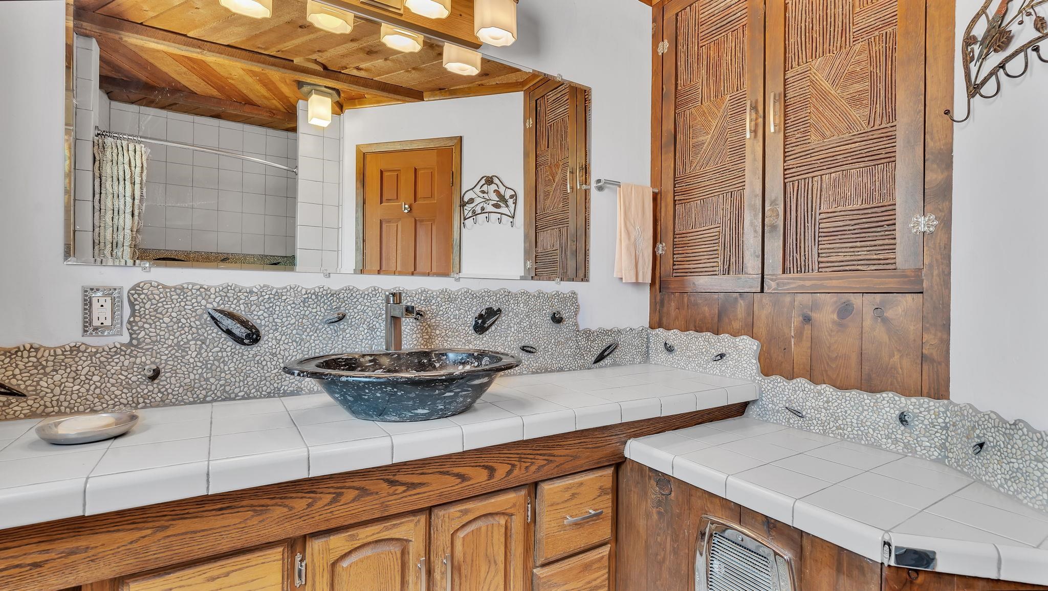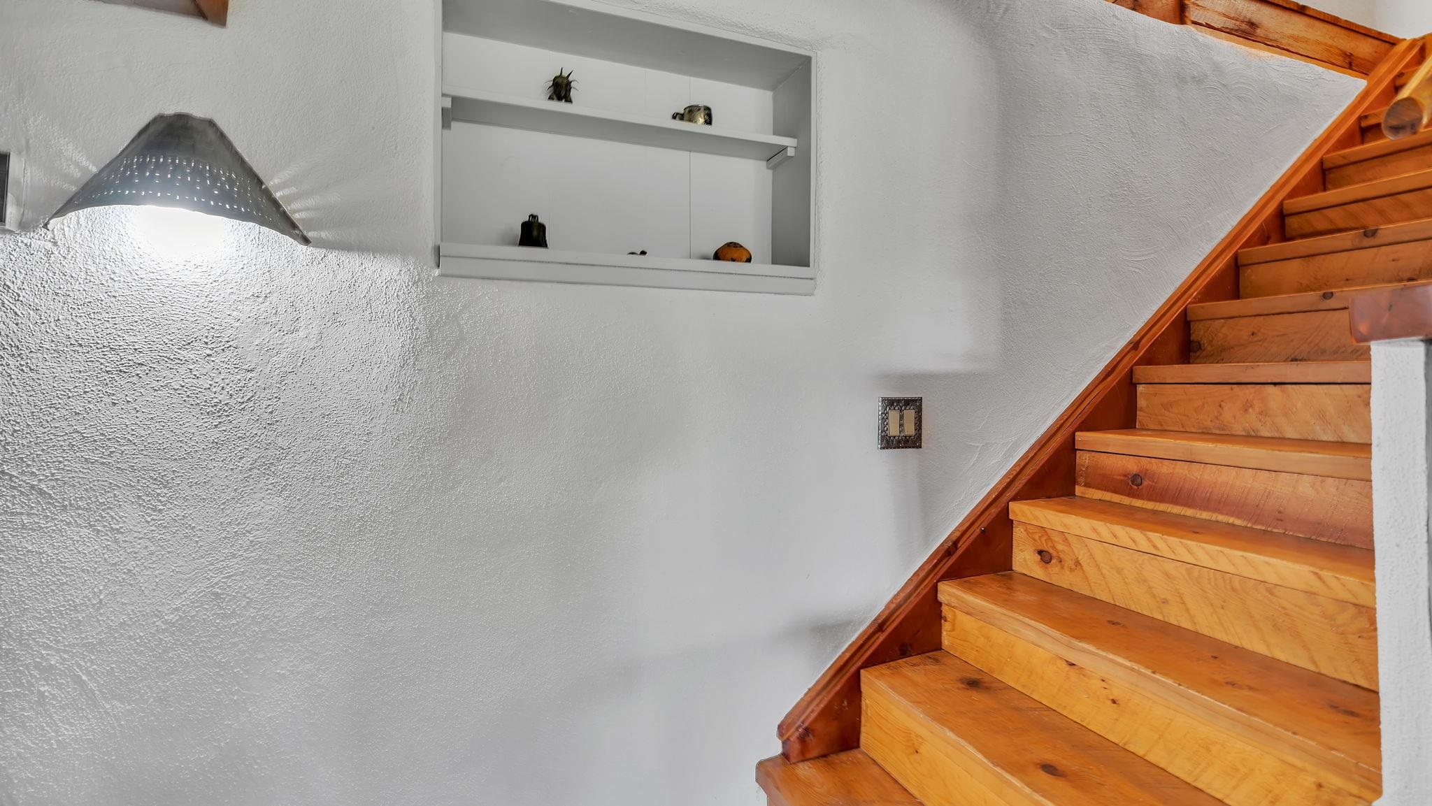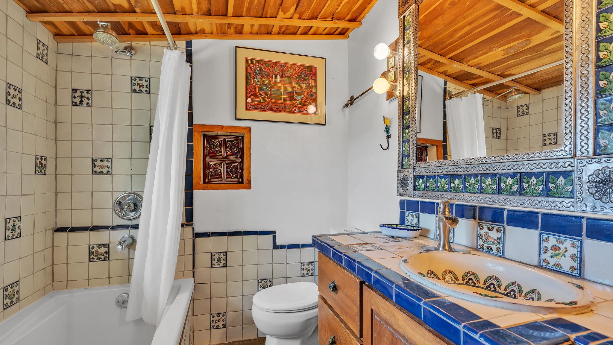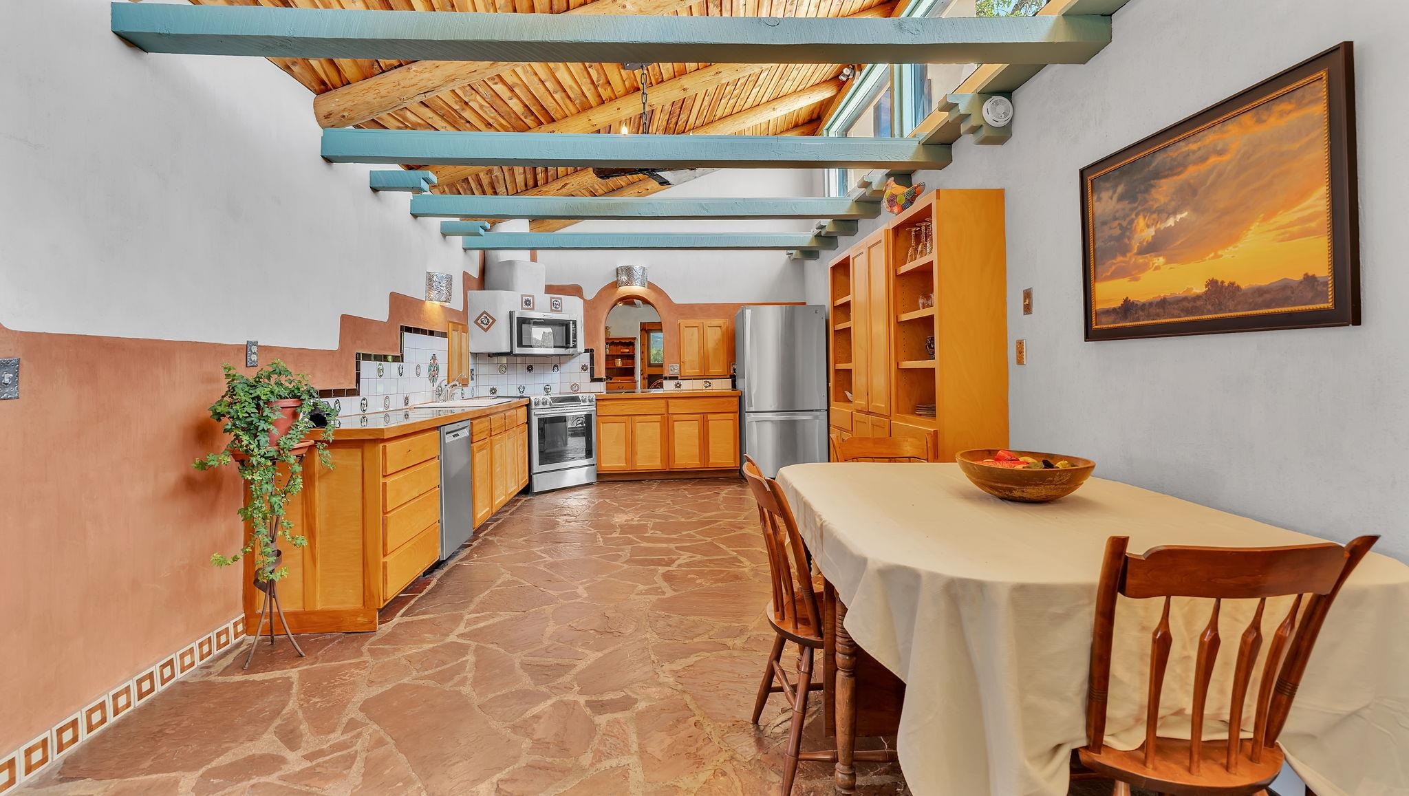 Heaven on the Arroyo Hondo North Plateau ~ It's rare to encounter a home with a soul as rich as the Atalaya House just North of town overlooking the coveted Arroyo Hondo & Taos Valley. Imagine owning a piece of history, where pottery shards from the 1800s whisper tales of ancient inhabitants in your own lush and irrigated garden. This isn't just a house; it's a living archive with the most magical 1 acre of land you will find surrounding it. Originally built in Lama from local mill scraps, the remarkable adobe home was meticulously disassembled and moved to Arroyo Hondo in the early 1950s—a testament to ingenuity and resilience. Every beam and adobe brick holds a story of its journey. Over the last 47 years, the Atalaya House has been lovingly transformed. Sunlight now pours through passive solar windows that warm flagstone floors quarried from local sites, which compliment the net-metered solar system that keep utility bills almost non-existent. Upon entering the home, you're greeted by one of several historic furniture pieces available to the next owner, followed by a stainless steel chef's kitchen with vaulted plank ceilings and adorned by a traditional wood burning fireplace, custom colorful clay plastered walls, and Las Cruces hand-made tiles that inspire true culinary adventure. The primary bedroom of the home possess special straw and mud floor. There are other unique Southwestern features, like nichos, bancos, arched windows and doorways, and even recycled chandelier lamps from the era of early electric power in Taos. The hand carved wood features throughout the residence are simply jaw dropping and considered treasure of their own. Ascend the stairs crafted with hand-carved posts from a historic hacienda to discover two bedrooms with expansive valley views, and yet another artist inspired bathroom constructed with river rock, willow branches, and fossils. Back down the stairway you pass a spacious laundry center with a dedicated egress, and out into a tranquil and majestic oasis with acequia water flowing beside a japanese inspired pond and the freestanding hot tub that offer direct views of the Sangre de Cristo mountains under colorful and vibrant cottonwood trees in the fall. The land here was made for growing, therefore the organic garden and greenhouse were built to yield bountiful harvests, which they have done so for years, and will for future generations. There is even a root cellar to store all the fruits of your labor year-round. For the creative type, the various outbuildings will make for the perfect artists studio, workshop, boat or RV storage, or possibly a second living space. The Atalaya House isn't merely another property; it’s an invitation to live within a legacy, where every corner holds a secret, and every sunrise promises new inspiration. Are you ready to be its next chapter?