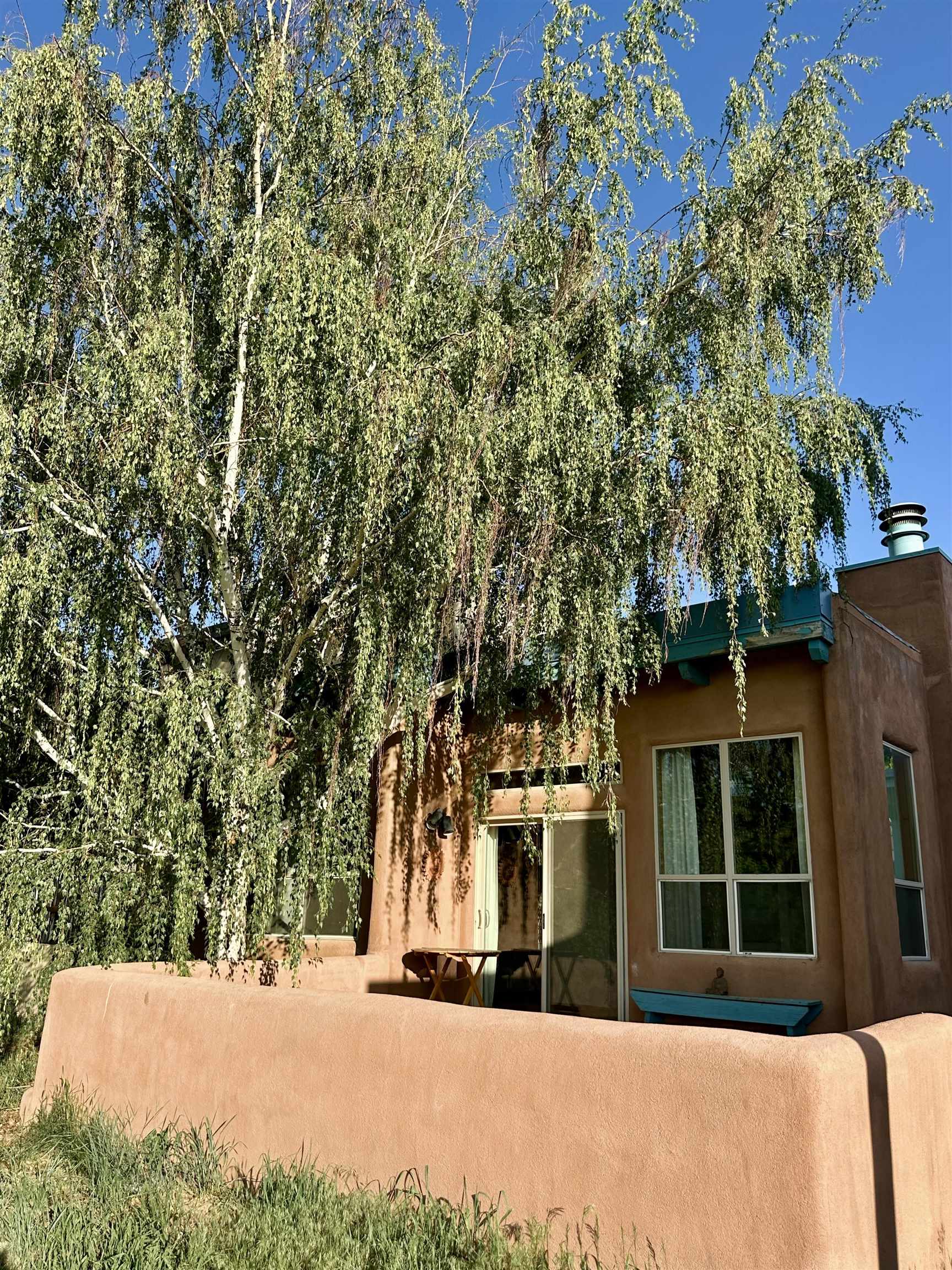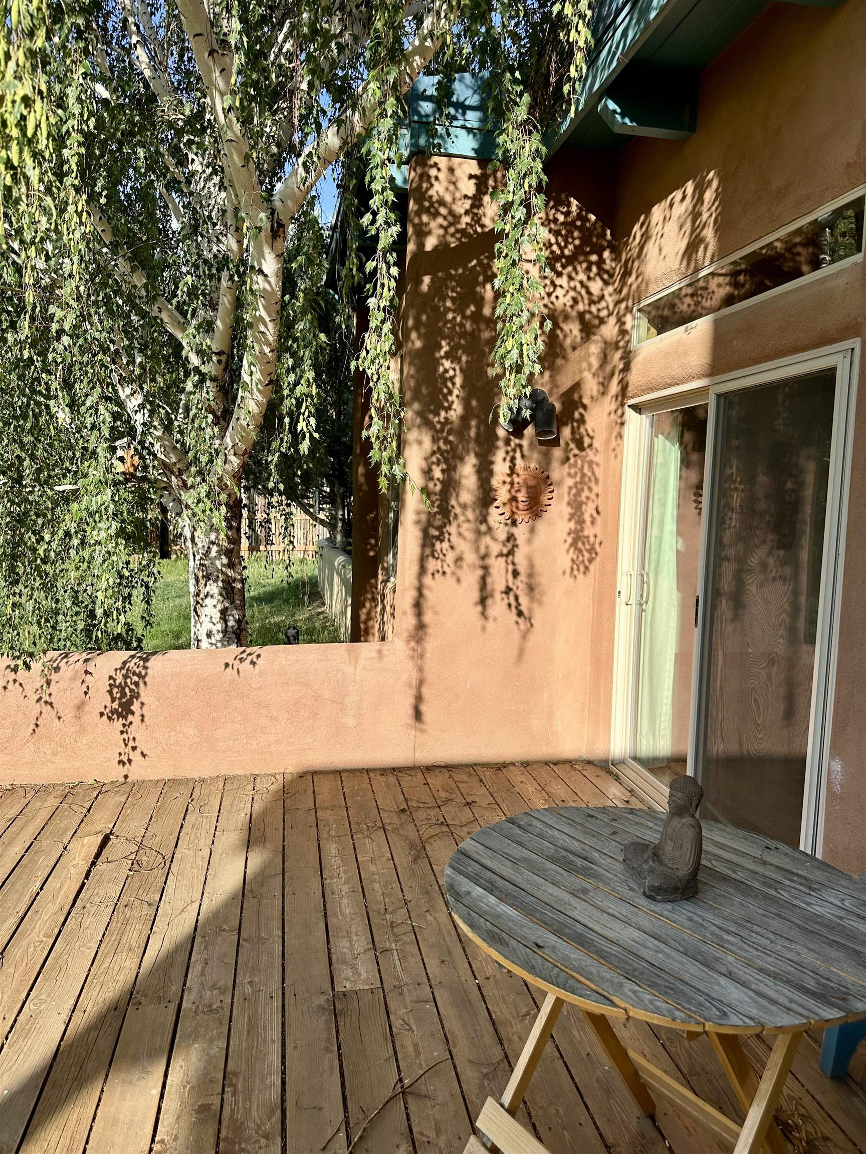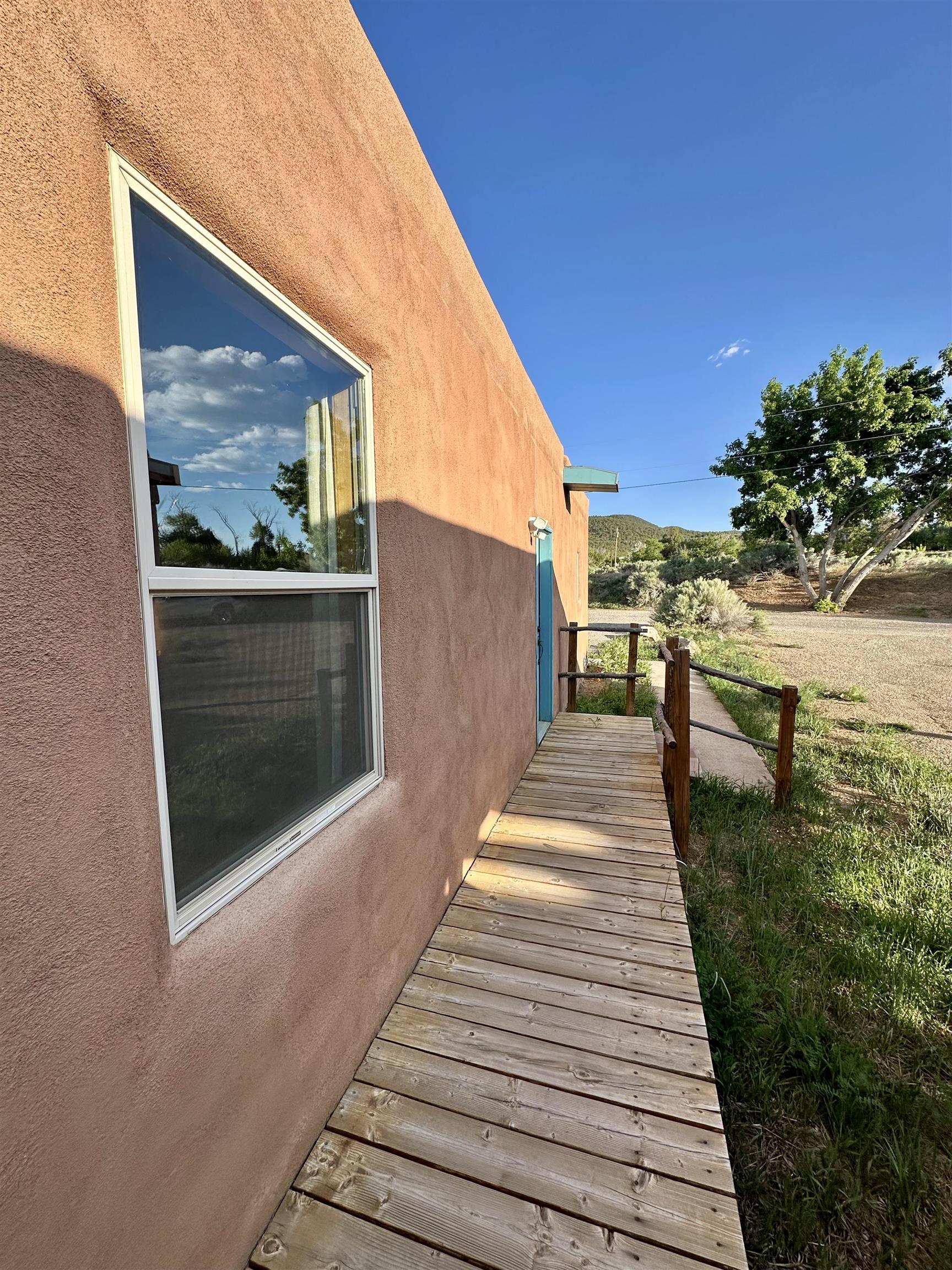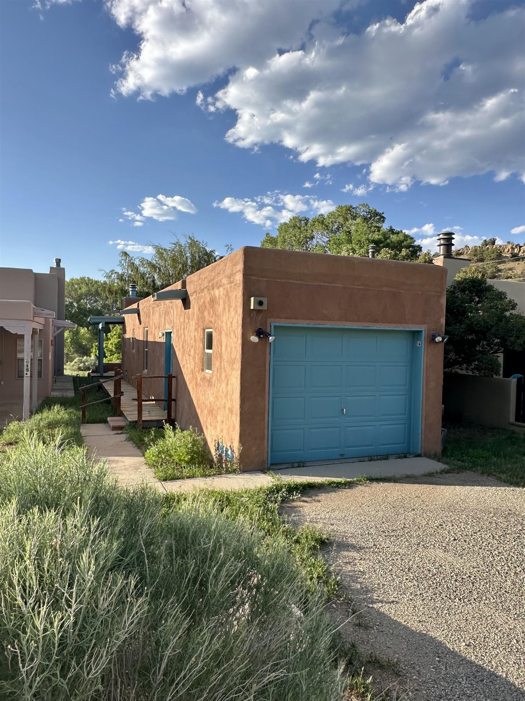 A charming bright 2 bedroom, 2 full bathrooms with lots of storage and a one car garage. 2 fireplaces, one in Primary Bedroom and living area. There are 2 decks/patios, one in Primary bedroom and one off of living area. Laundry room is located in the hallway and has more storage cabinets. There is a wet bar right outside the kitchen which wraps around to the dining area. The Rio Fernando flows beyond the back yard with great views of mountains and cottonwoods. The condo heats with forced hot air. Condo is 2nd to last on cul de sac. Garage has a blue door.