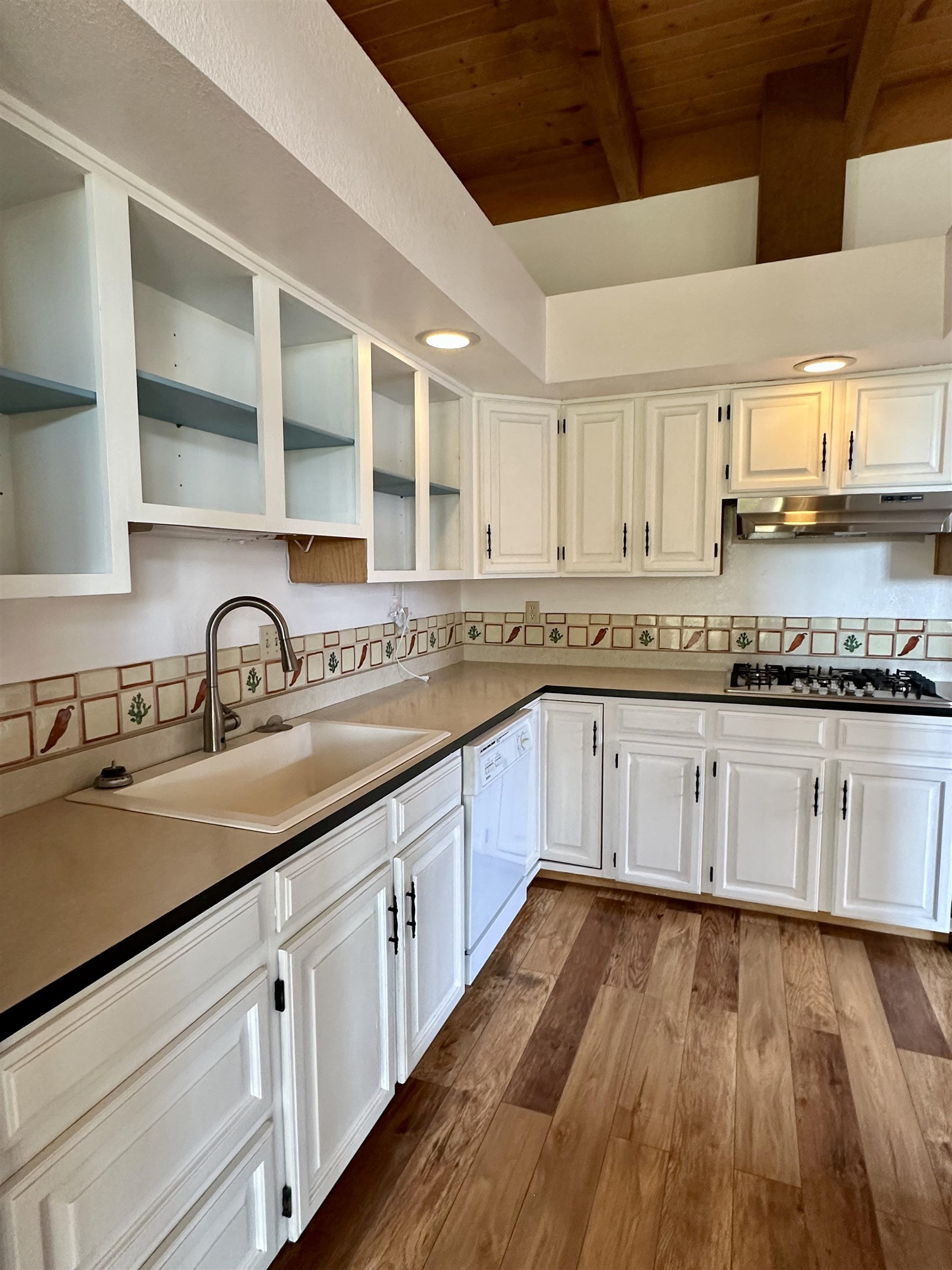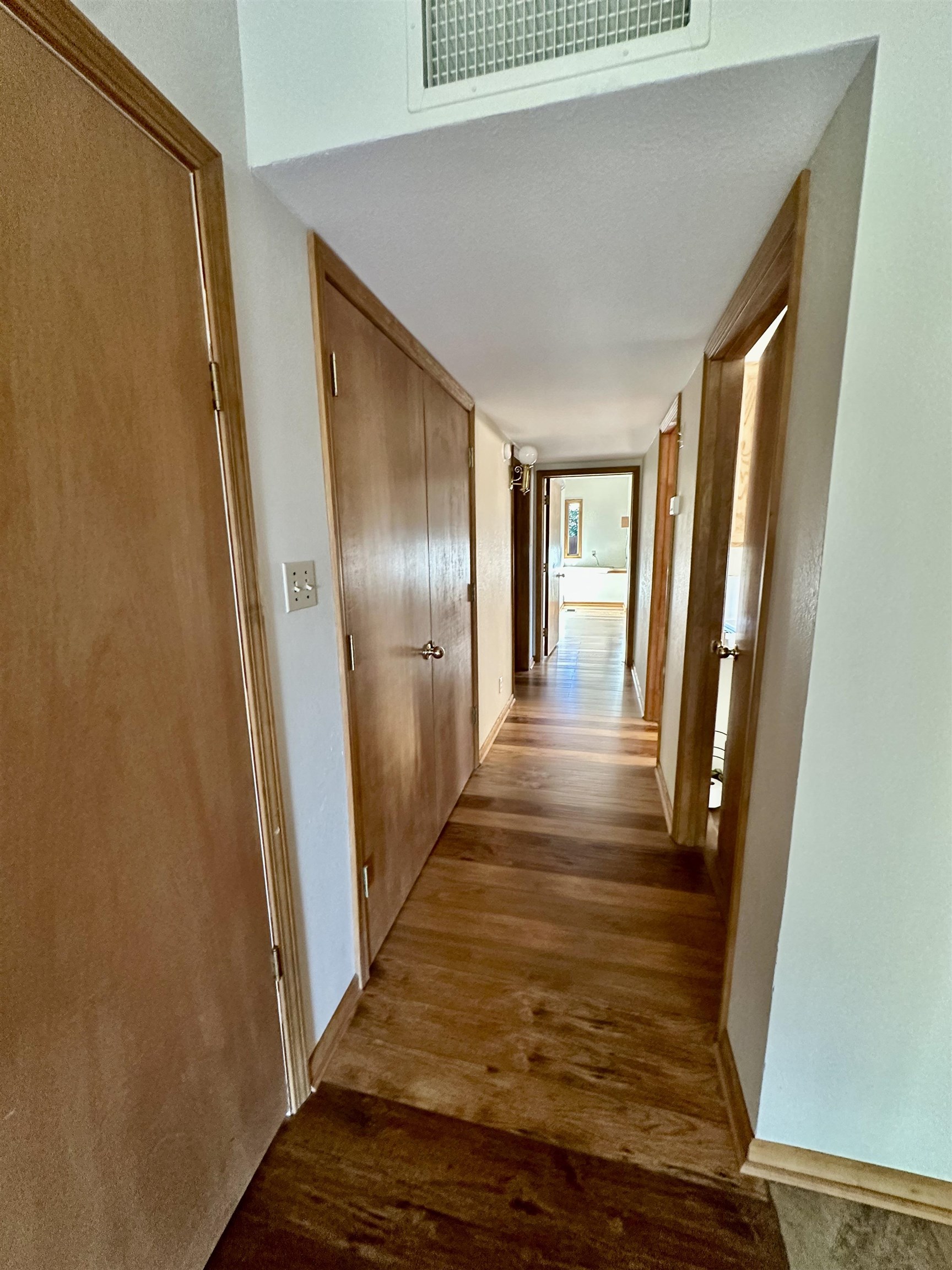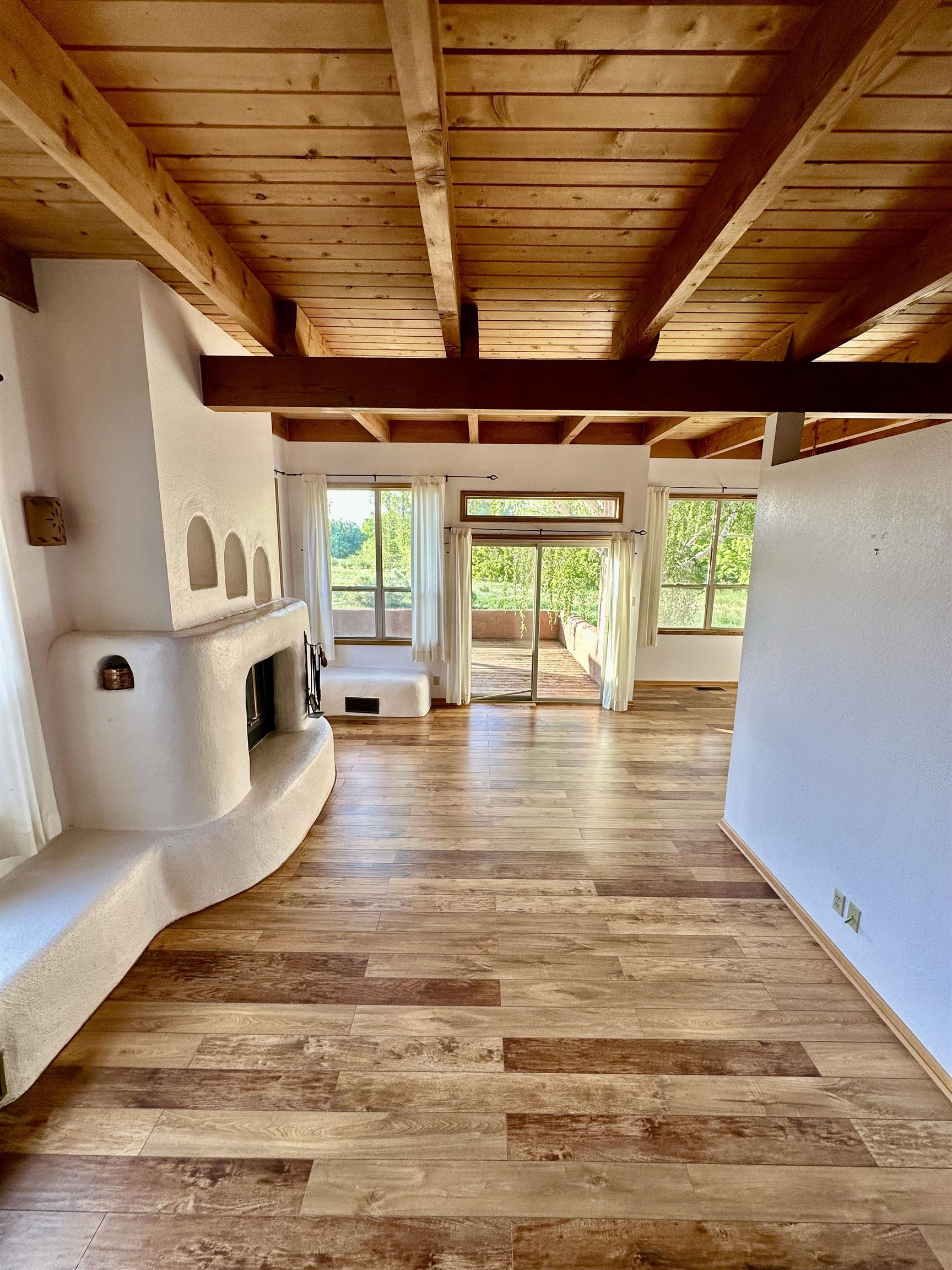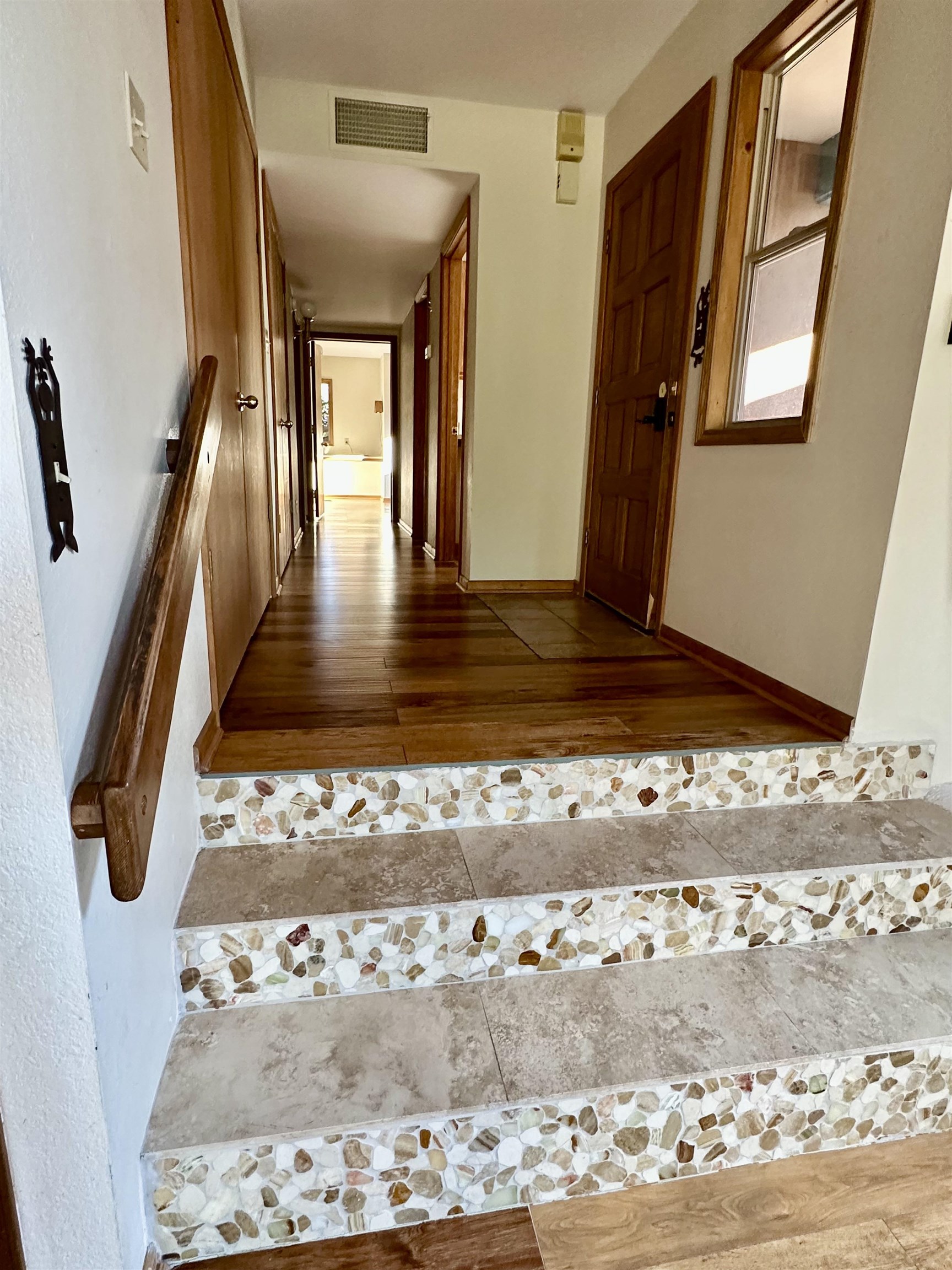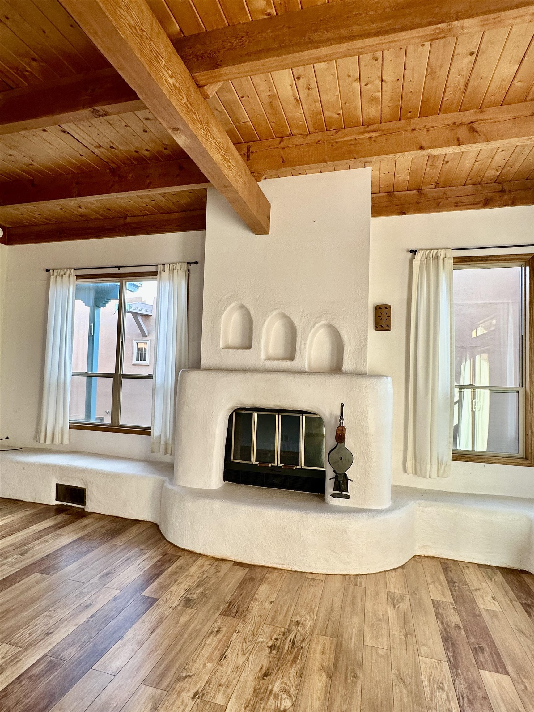 A charming bright 2 bedroom, 2 full bathrooms with lots of storage and a one car garage. 2 fireplaces, one in Primary Bedroom and living area. There are 2 decks/patios, one in Primary bedroom and one off of living area. Laundry room is located in the hallway and has more storage cabinets. There is a wet bar right outside the kitchen which wraps around to the dining area. The Rio Fernando flows beyond the back yard with great views of mountains and cottonwoods. The condo heats with forced hot air. Condo is 2nd to last on cul de sac. Garage has a blue door.