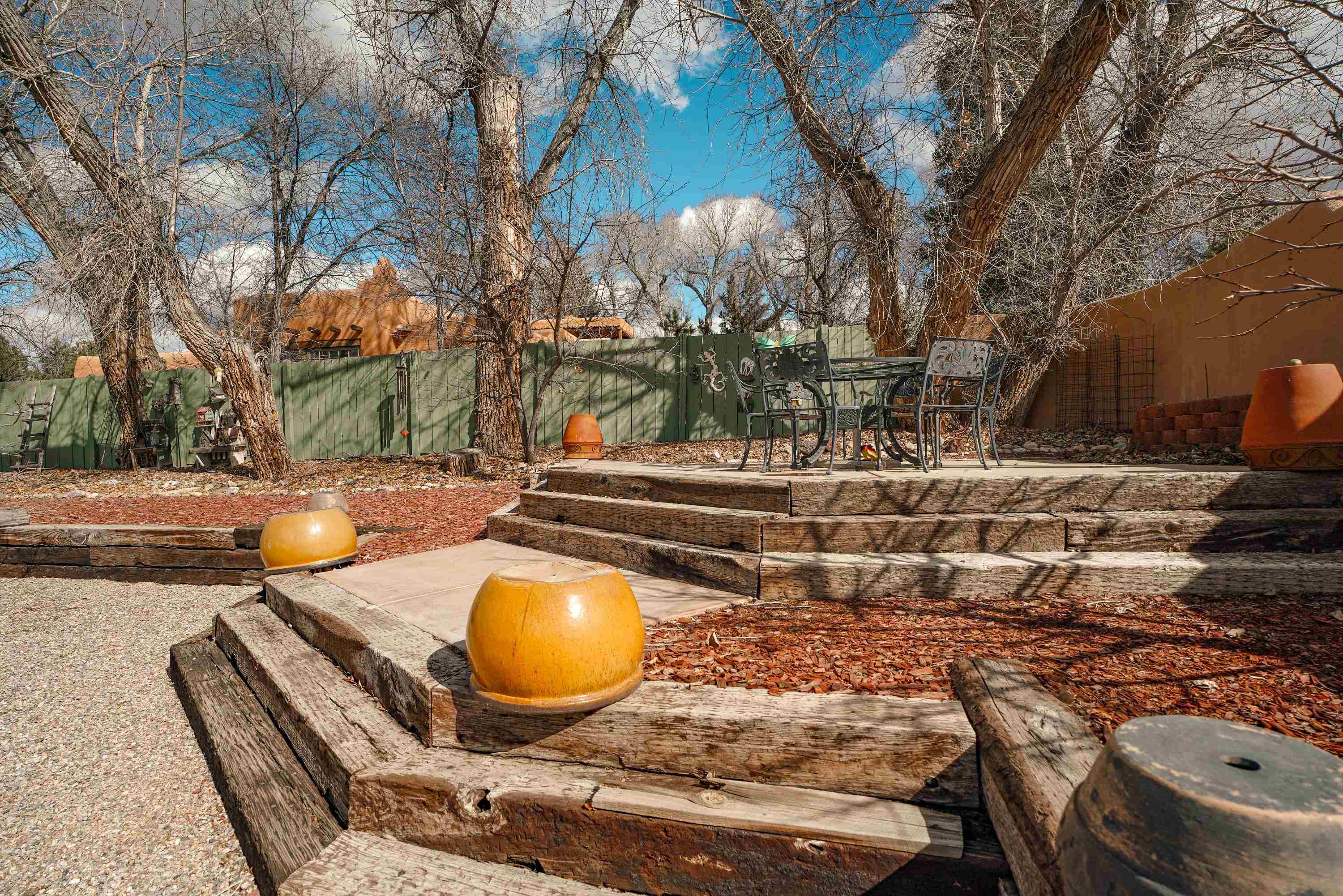 One of a kind 3BD/2BA extensively upgraded condo offering approx. 1,475 SF of light-filled living that feels more like a private patio home. This thoughtfully designed residence features soaring ceilings, abundant windows with views from every room, and a warm Southwestern aesthetic anchored by a beautiful kiva-style fireplace. The open living, dining, and kitchen areas create an inviting flow ideal for everyday living or entertaining, while a dedicated office space and utility/laundry room add functionality. Step outside to a large, professionally xeriscaped backyard, once unfinished and now transformed into a serene outdoor retreat. Enjoy a covered portal, mature fruit trees, raised garden beds, and a bocce court—perfect for relaxing or hosting guests. The outdoor space is both private and low maintenance, enhanced by natural landscaping and screened utility areas. Additional highlights include an oversized insulated garage, approximately 400 SF of non-freezing attic storage, and a spacious primary suite with a walk-in closet. Located within a well-maintained 10-unit subdivision featuring a shared common orchard over 1-acre, this home offers a rare combination of privacy, community, and outdoor enjoyment. Recent community-wide stucco repairs and repainting completed in 2025 add peace of mind. Conveniently located just minutes from town amenities and approximately 40 minutes to Taos Ski Val, this is a truly special Taos offering with extensive upgrades throughout.